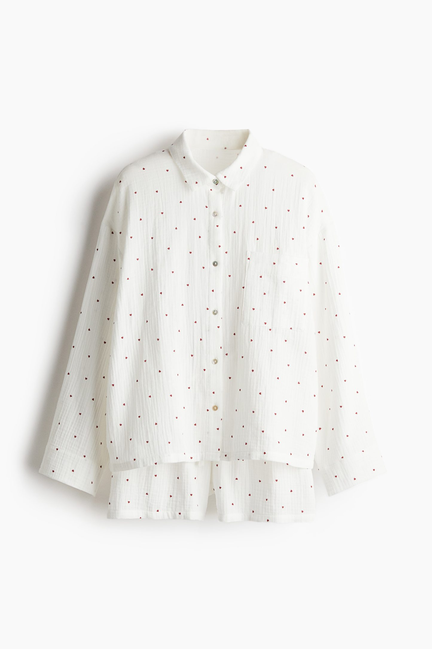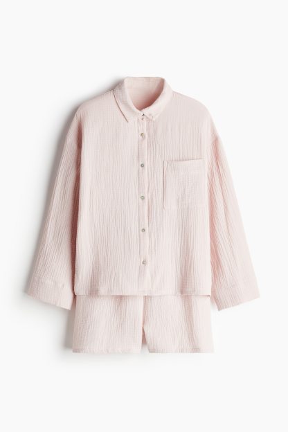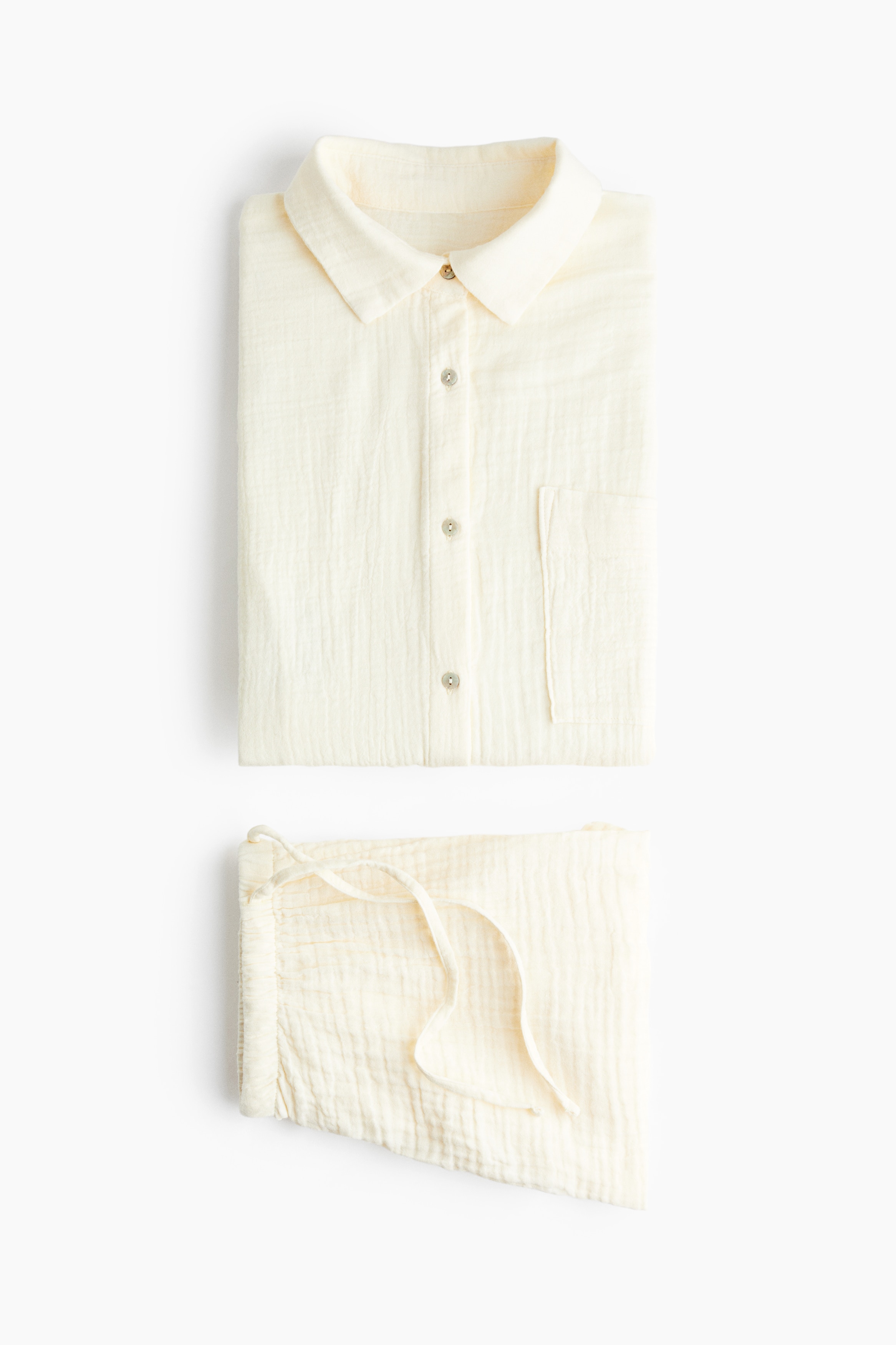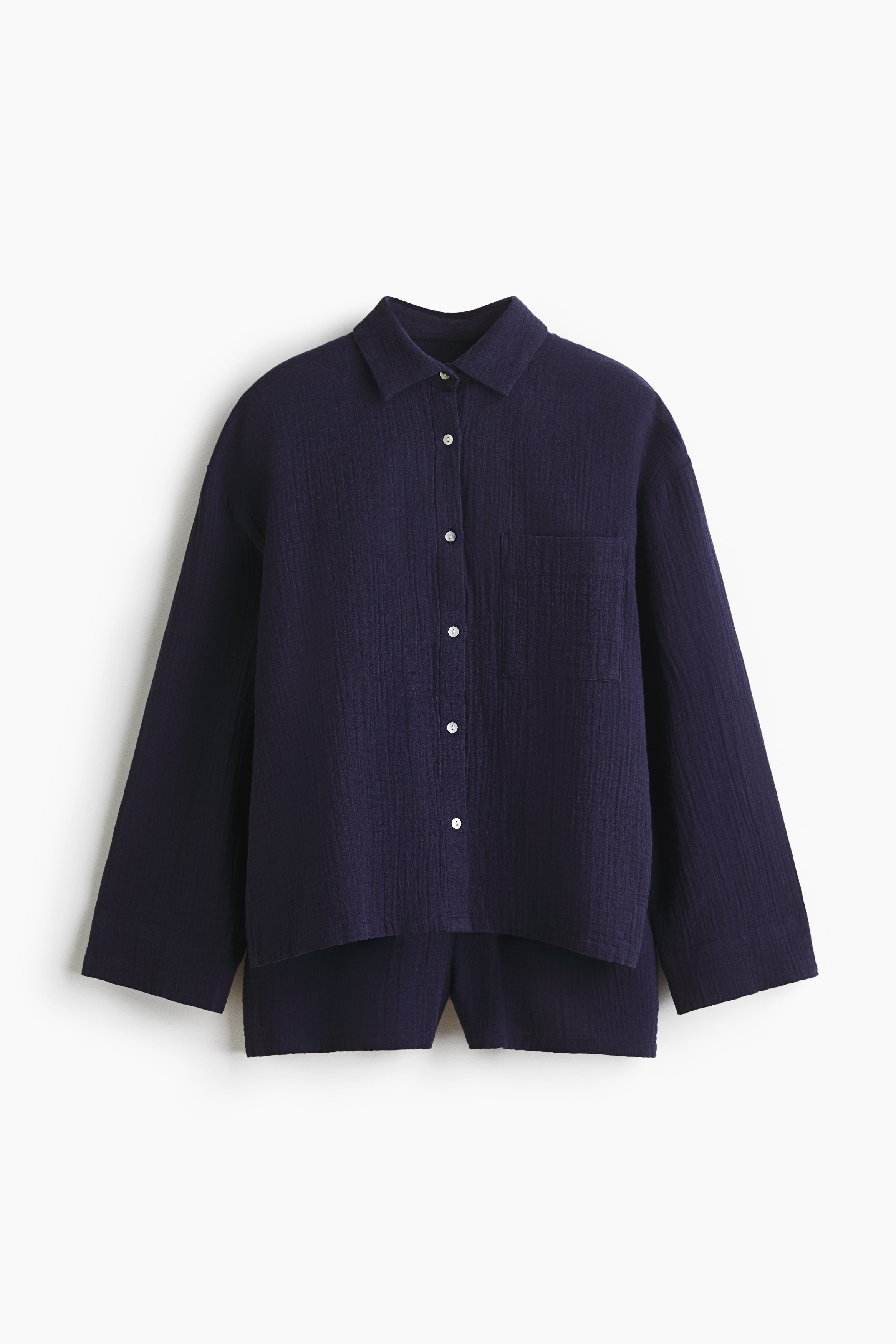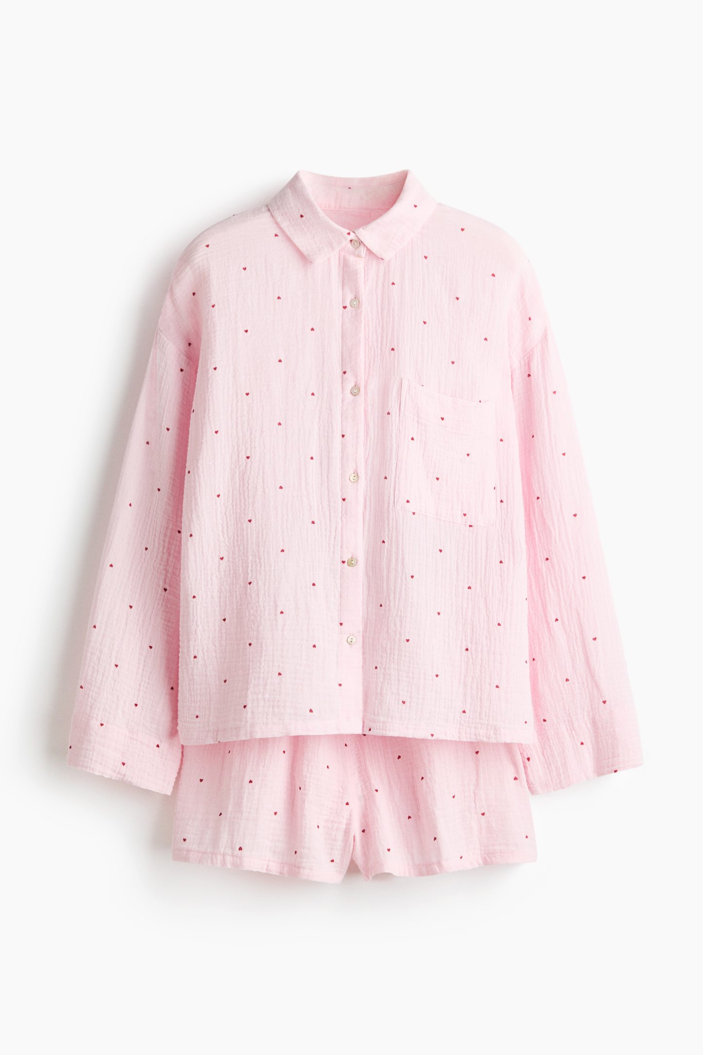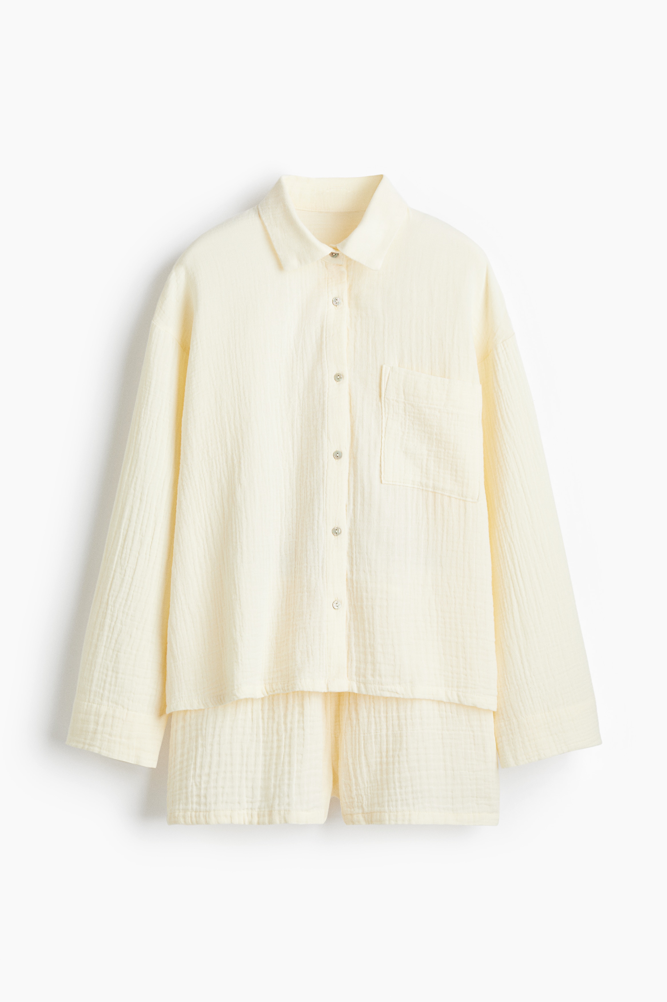 Pyjamas with a shirt and pair of shorts in soft cotton muslin. Long-sleeved shirt with a collar, divs down the front and a patch chest pocket. Shorts with an elasticated, drawstring waist.