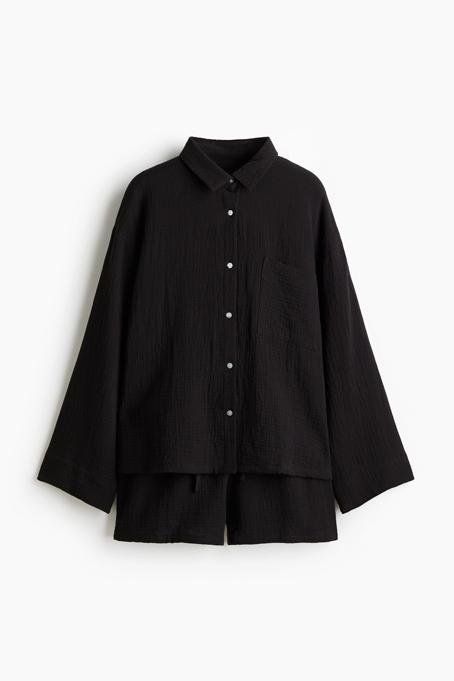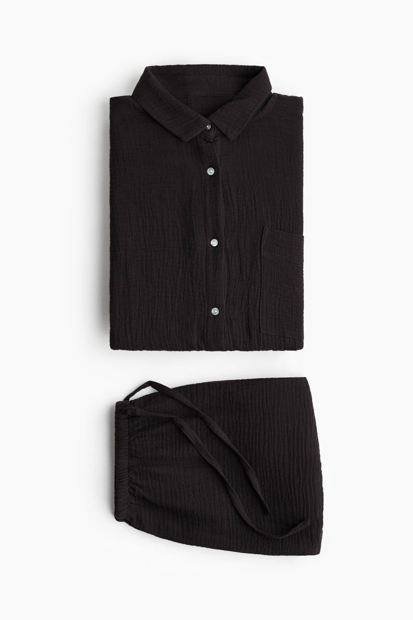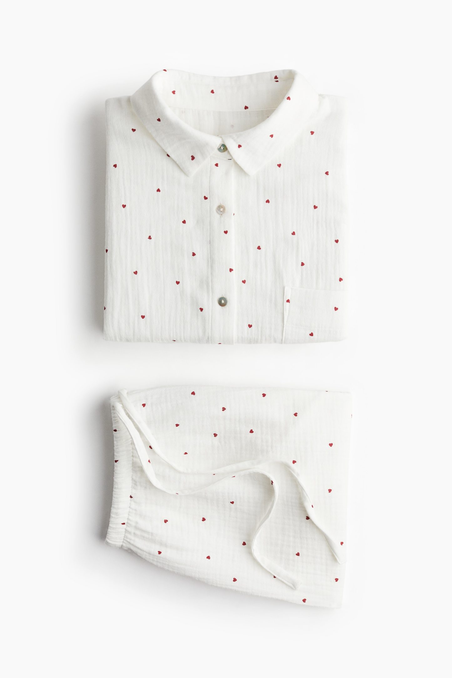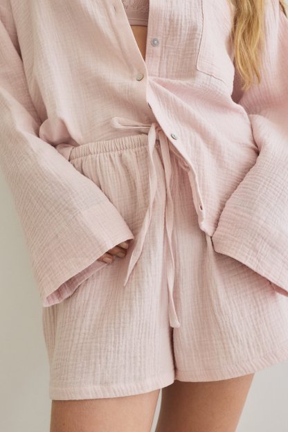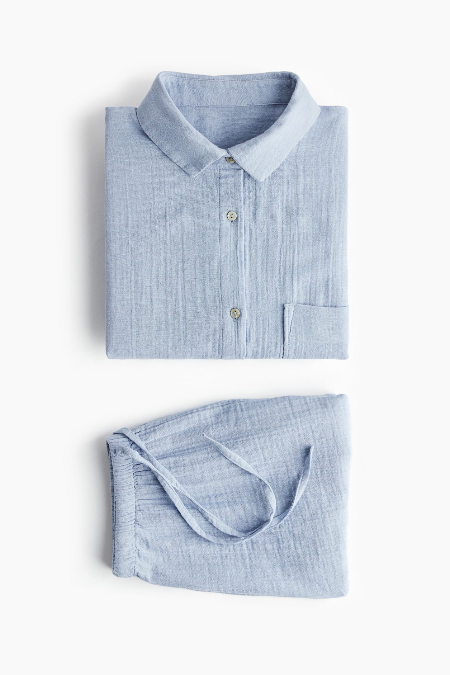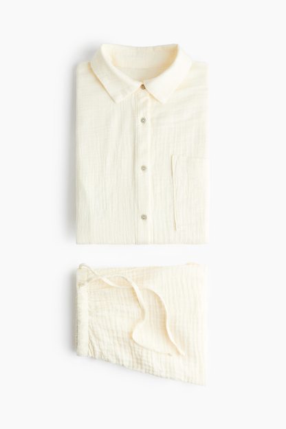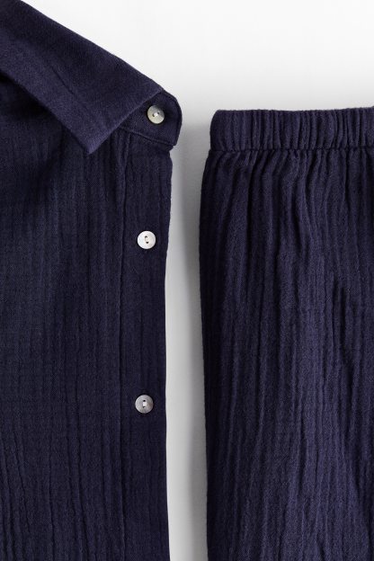 Pyjamas with a shirt and pair of shorts in soft cotton muslin. Long-sleeved shirt with a collar, divs down the front and a patch chest pocket. Shorts with an elasticated, drawstring waist.