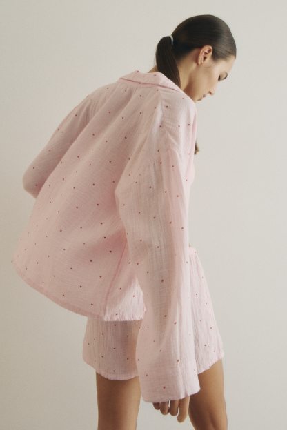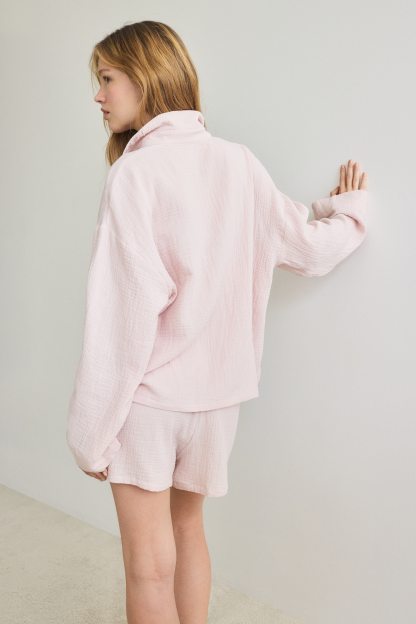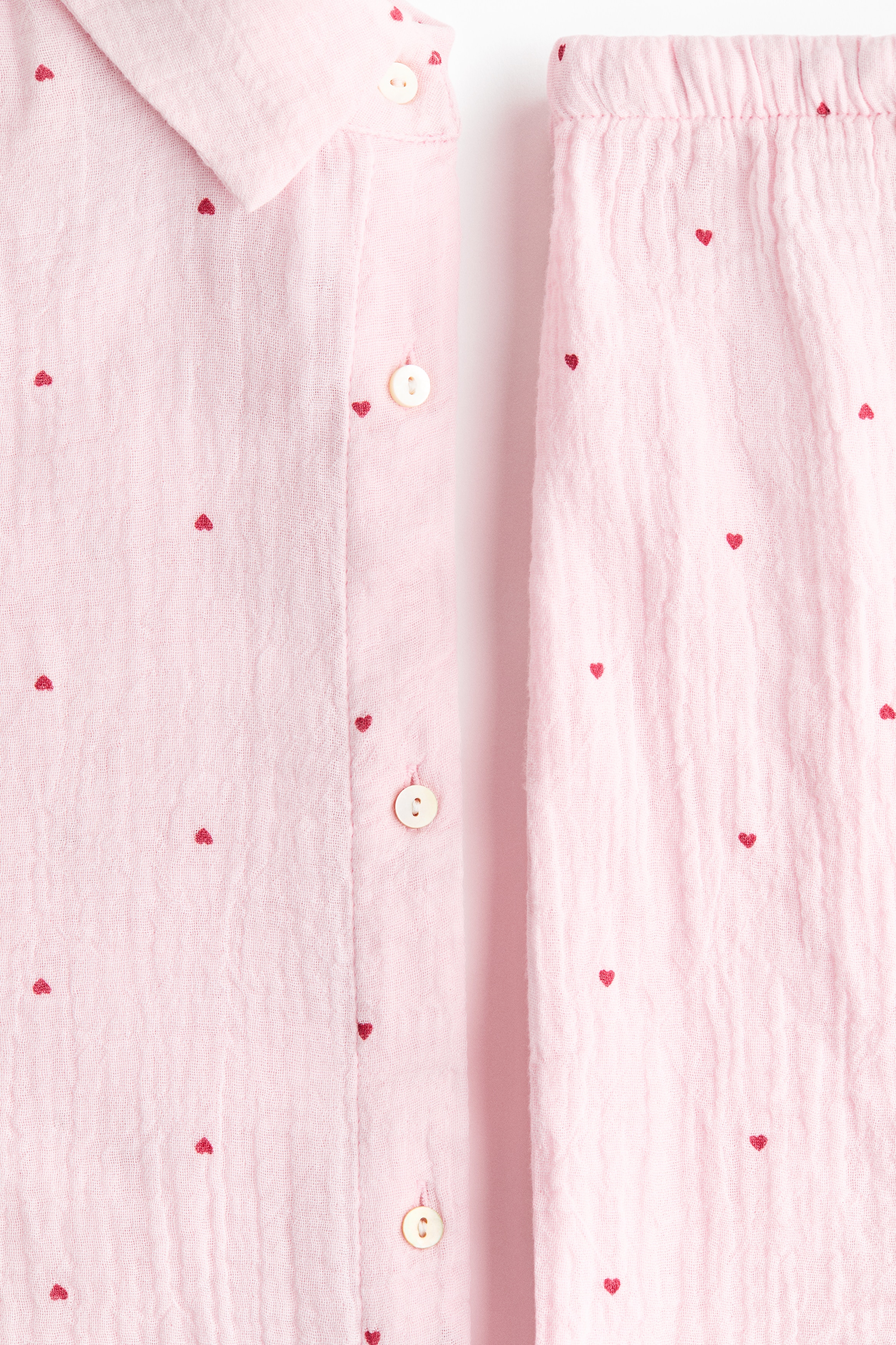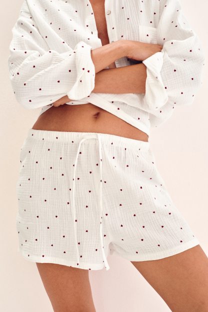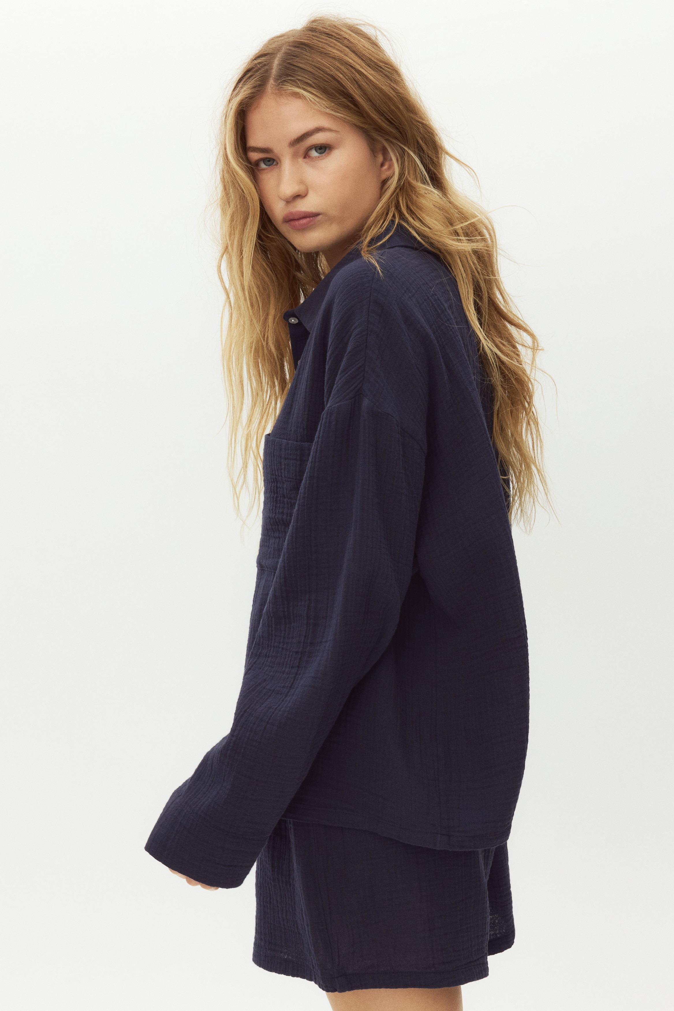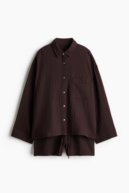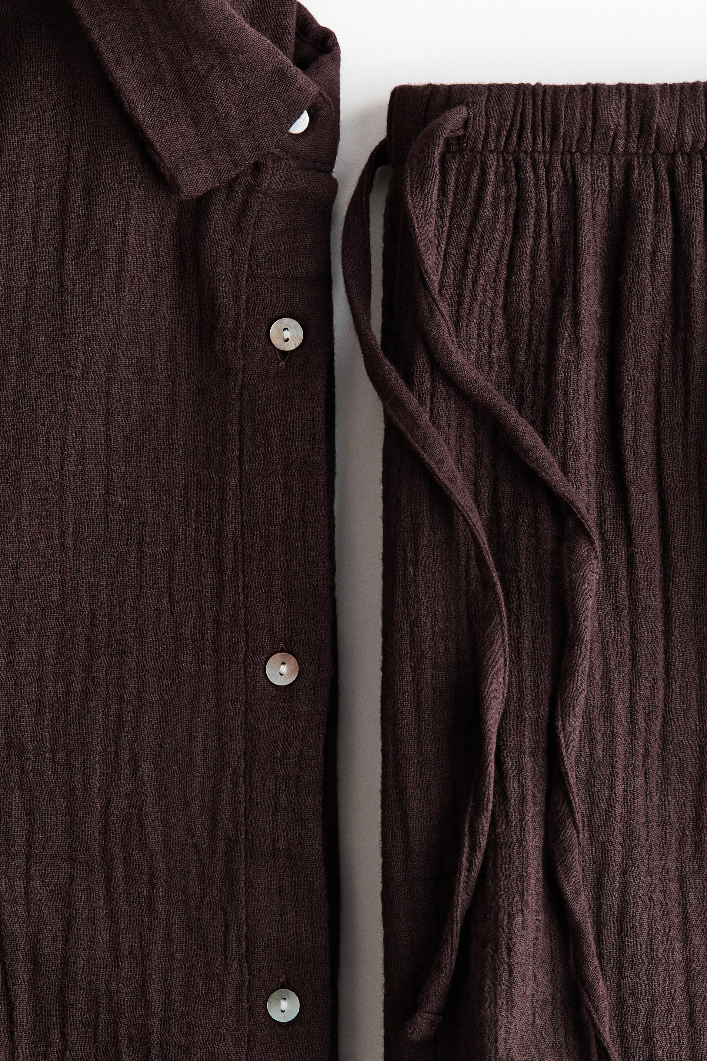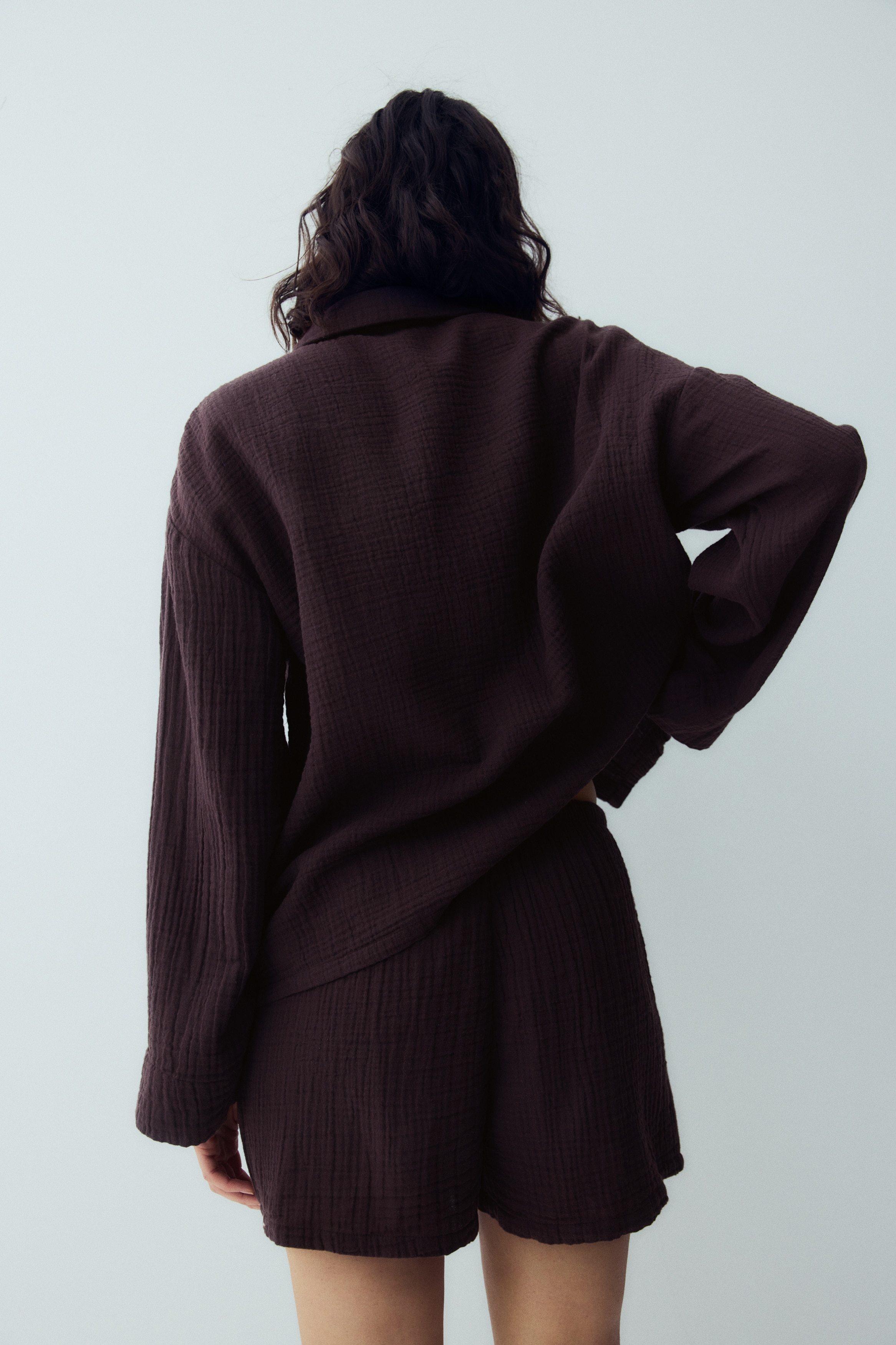 Pyjamas with a shirt and pair of shorts in soft cotton muslin. Long-sleeved shirt with a collar, divs down the front and a patch chest pocket. Shorts with an elasticated, drawstring waist.