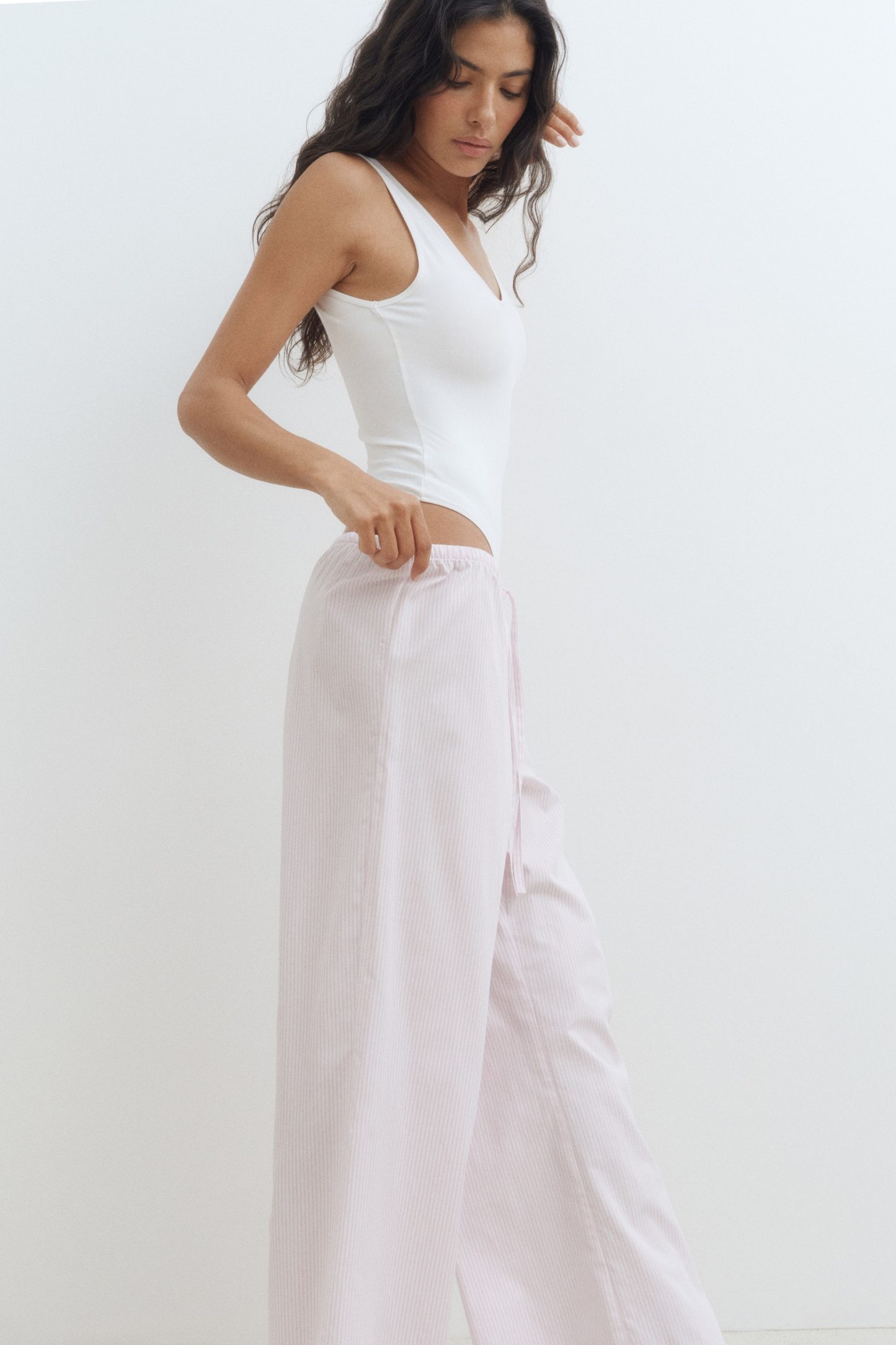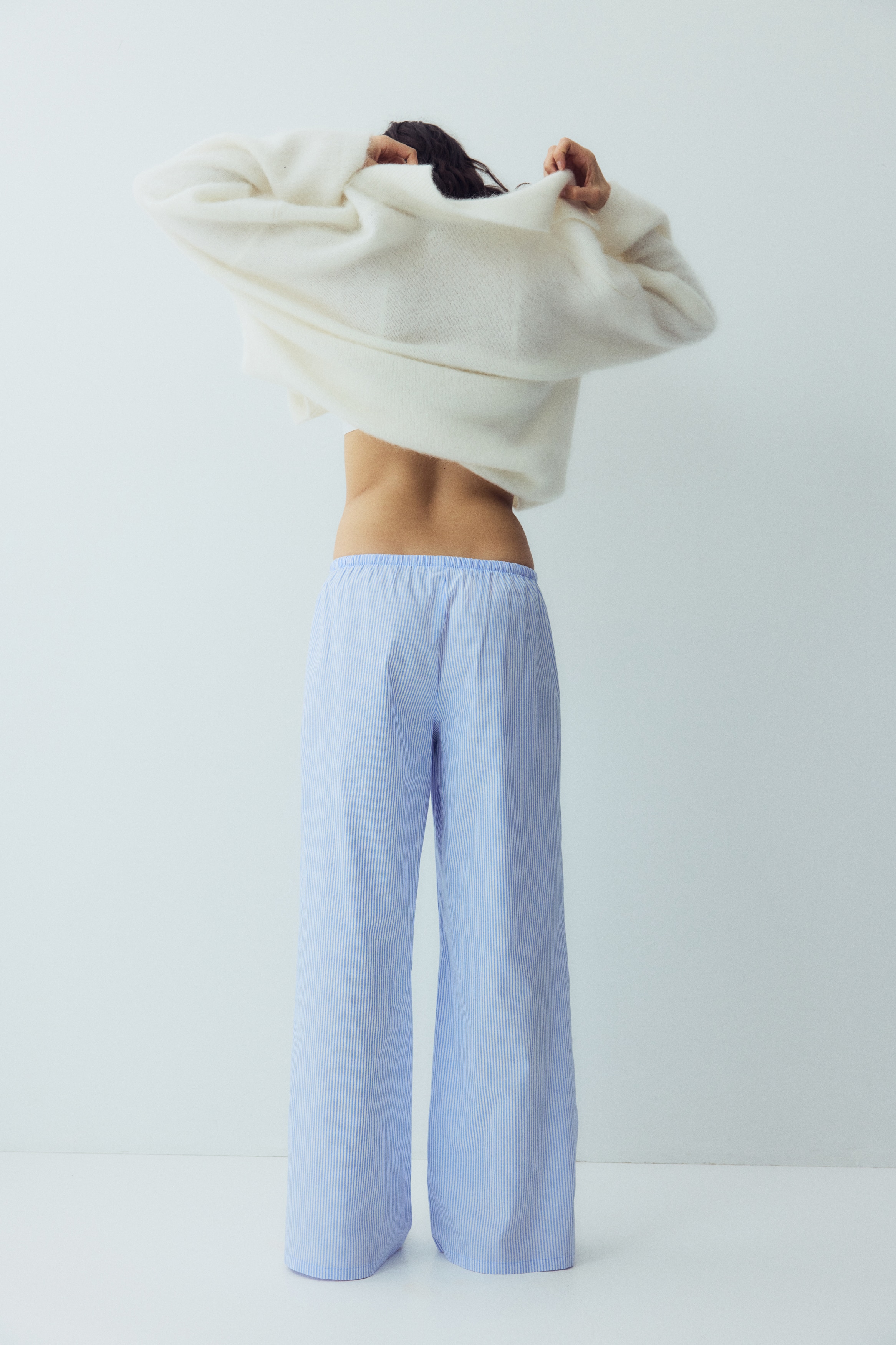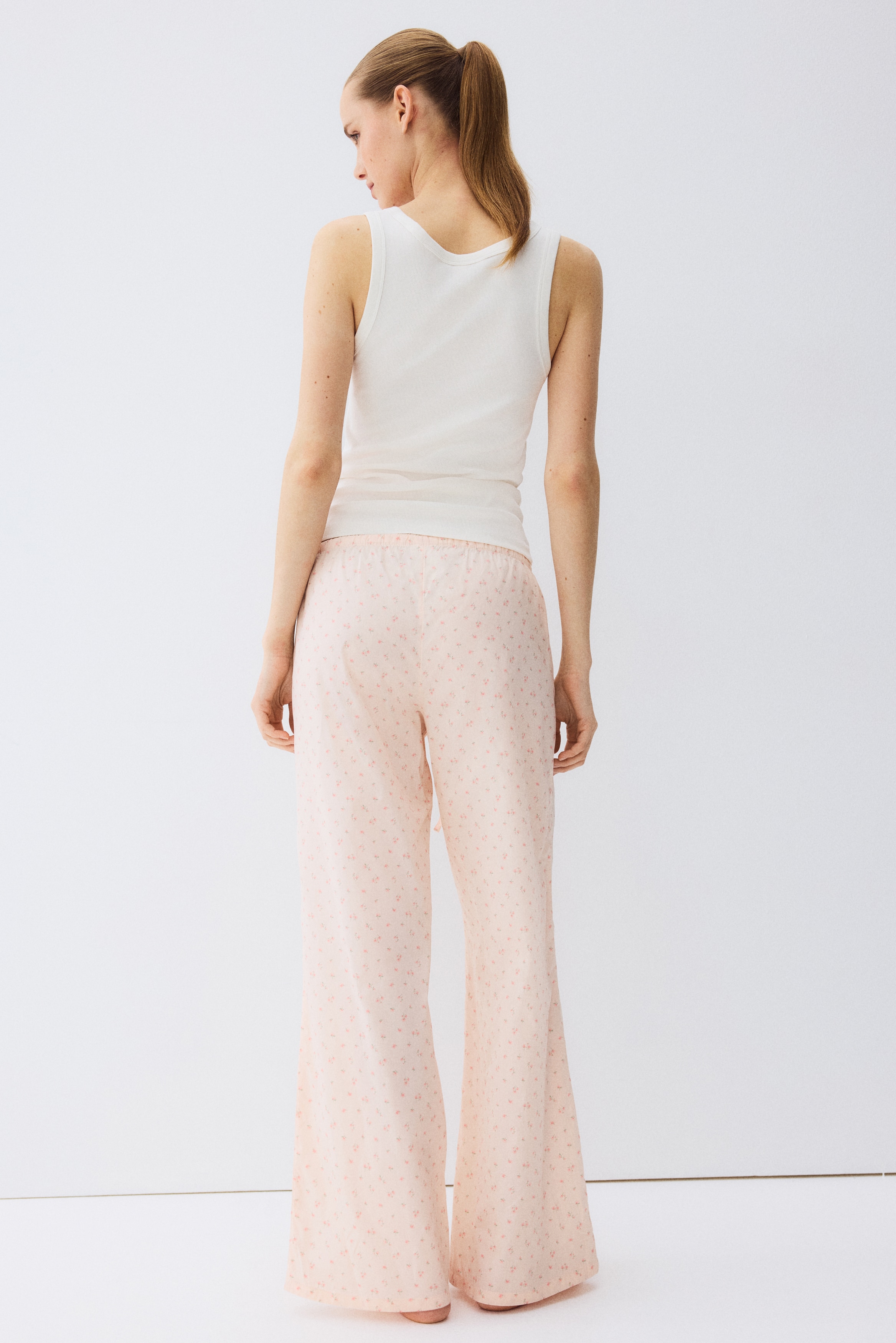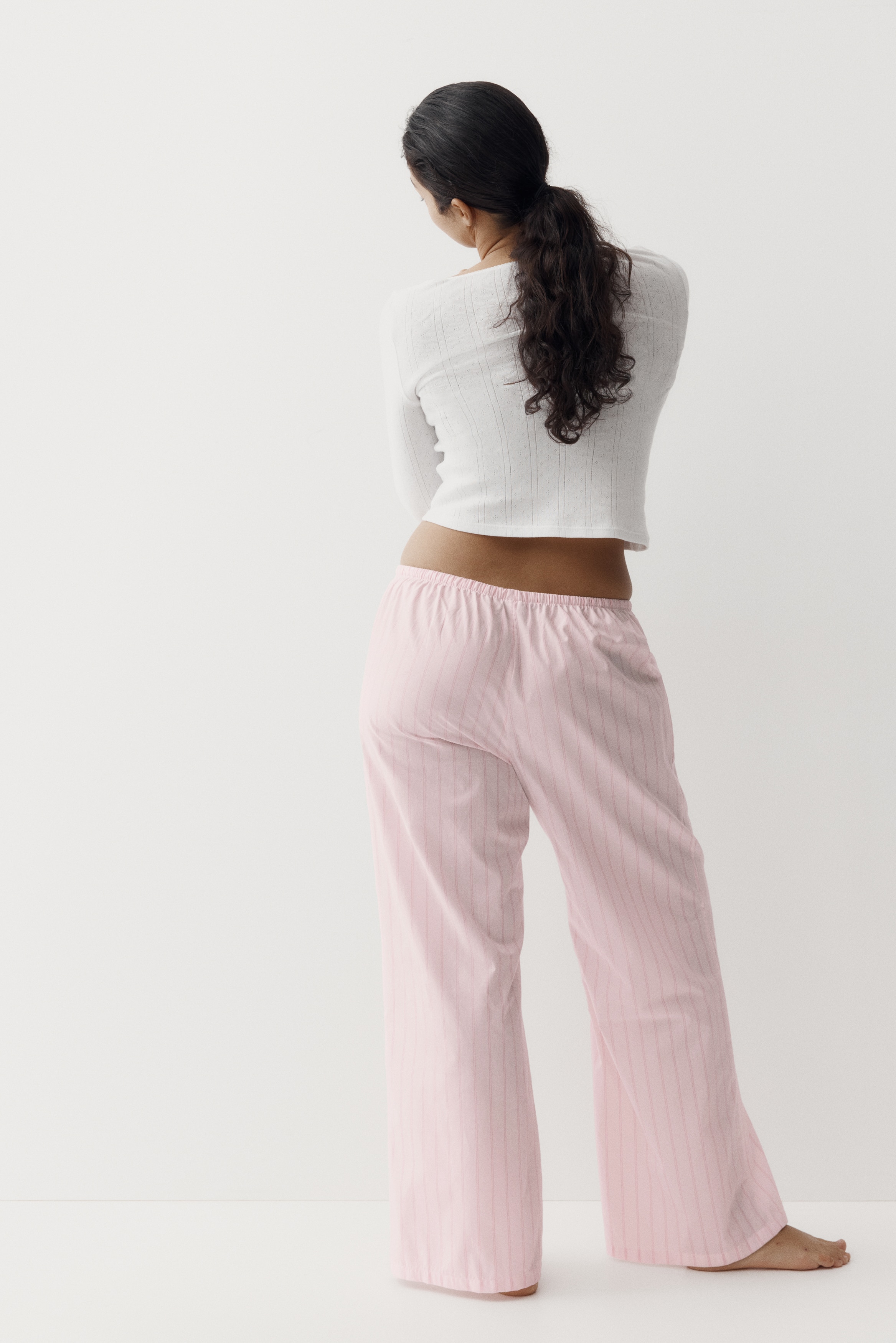 Loose-fit pyjama bottoms in a cotton weave featuring a low waist with covered elastication and a narrow drawstring. Straight, gently flared legs.