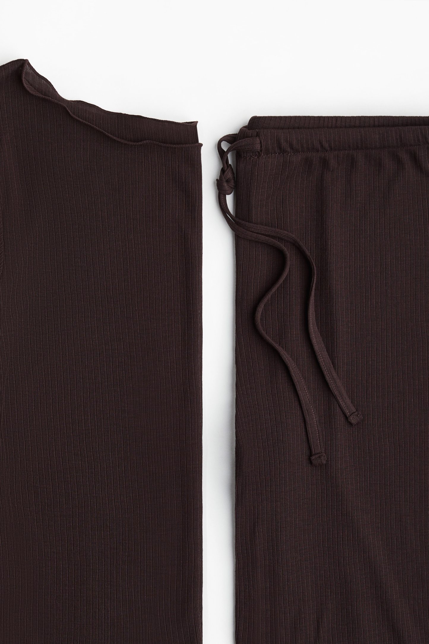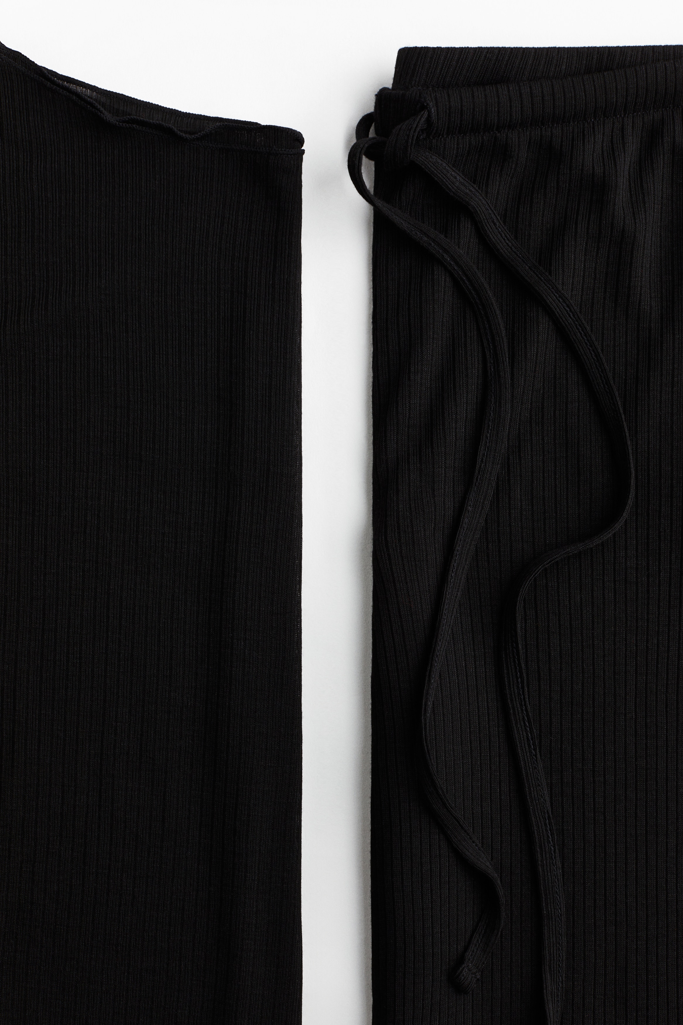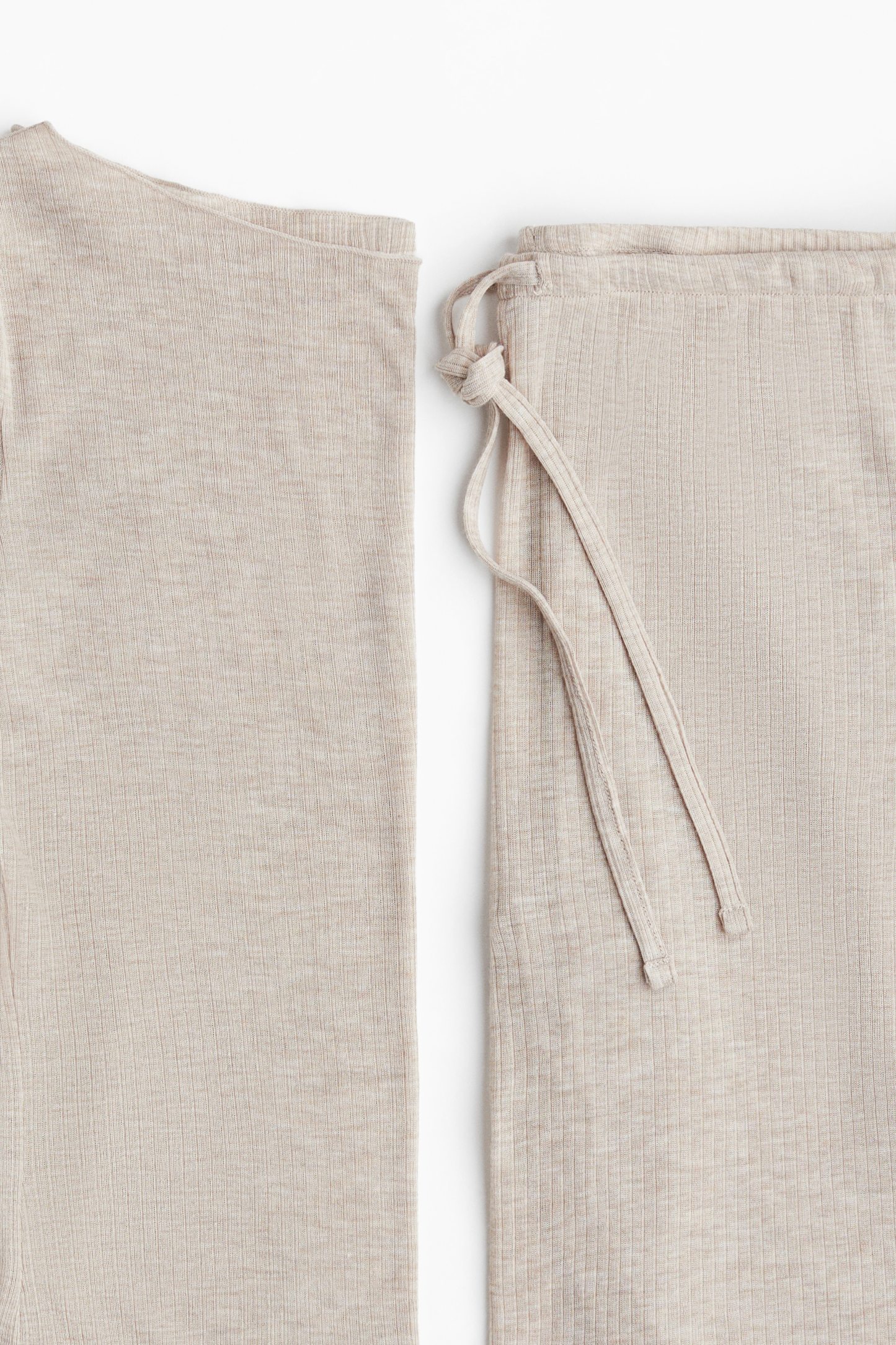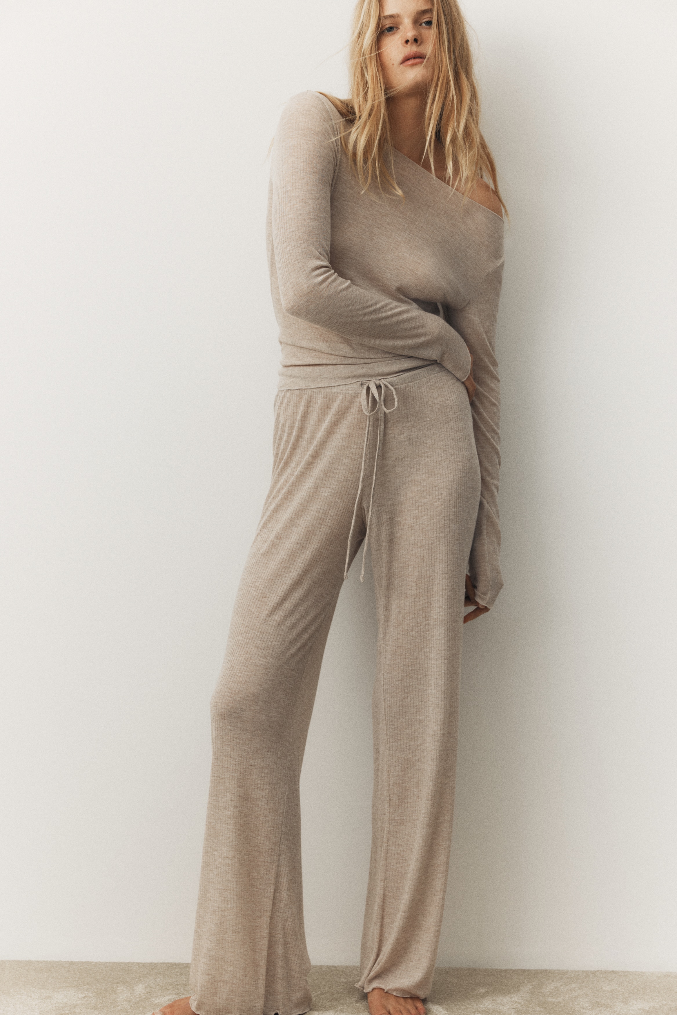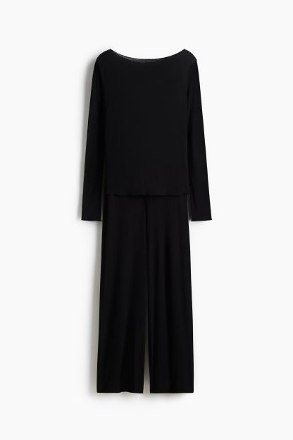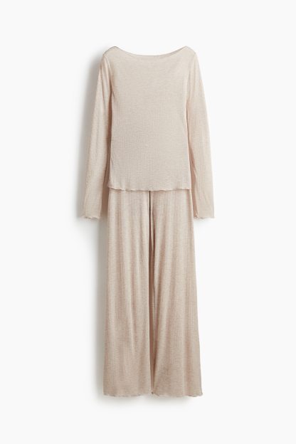 Pyjamas with a top and pair of trousers in sheer, ribbed jersey with overlocked edges. Fitted top with a boat neckline and long sleeves. Trousers with an elasticated, drawstring waist and wide legs.
