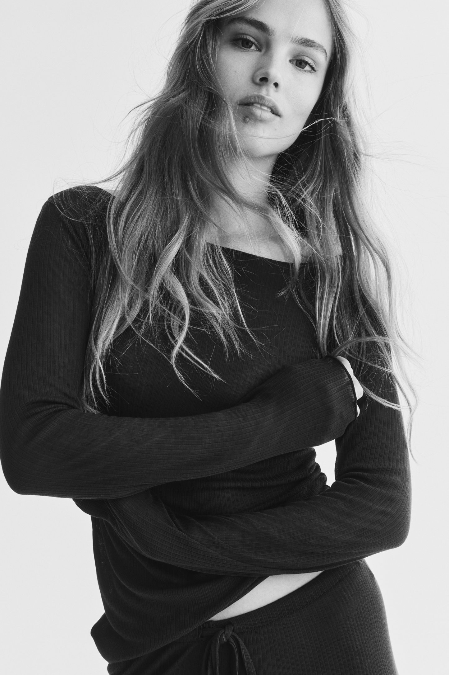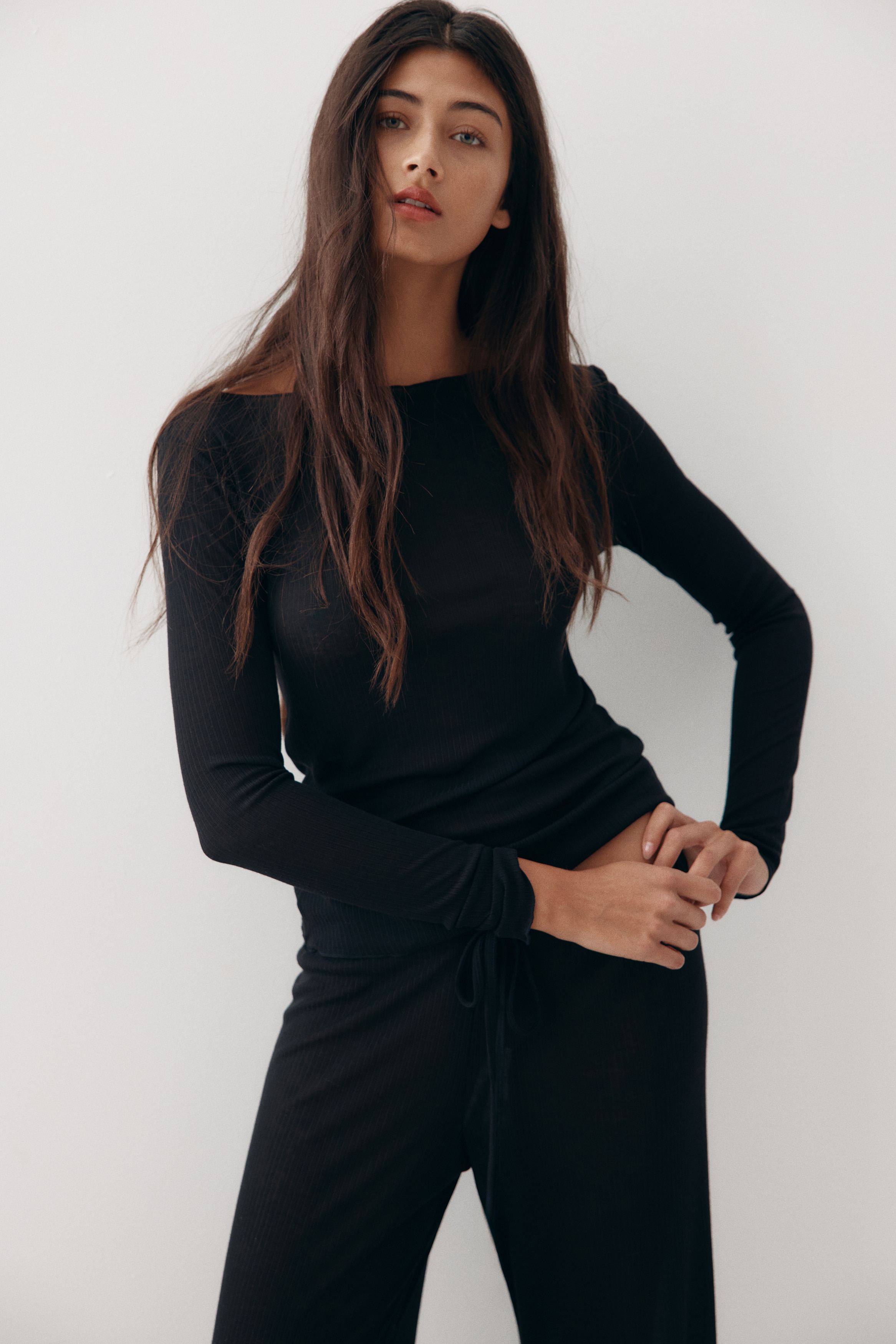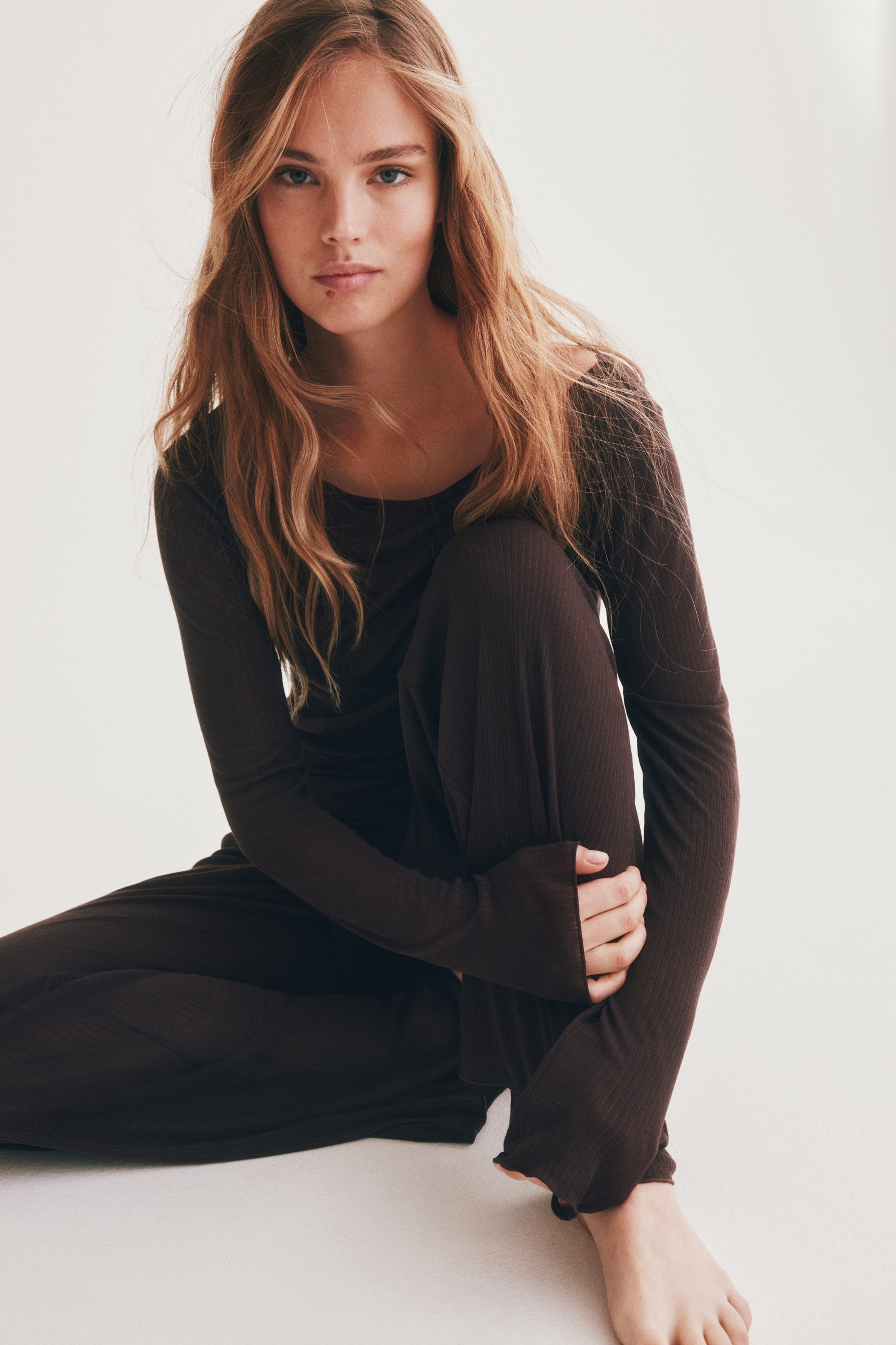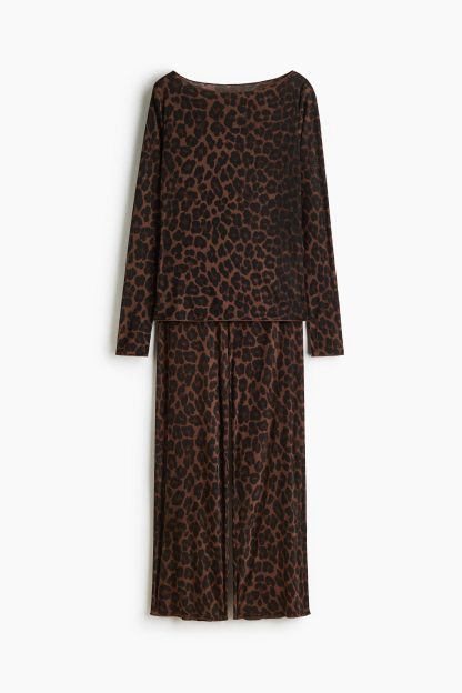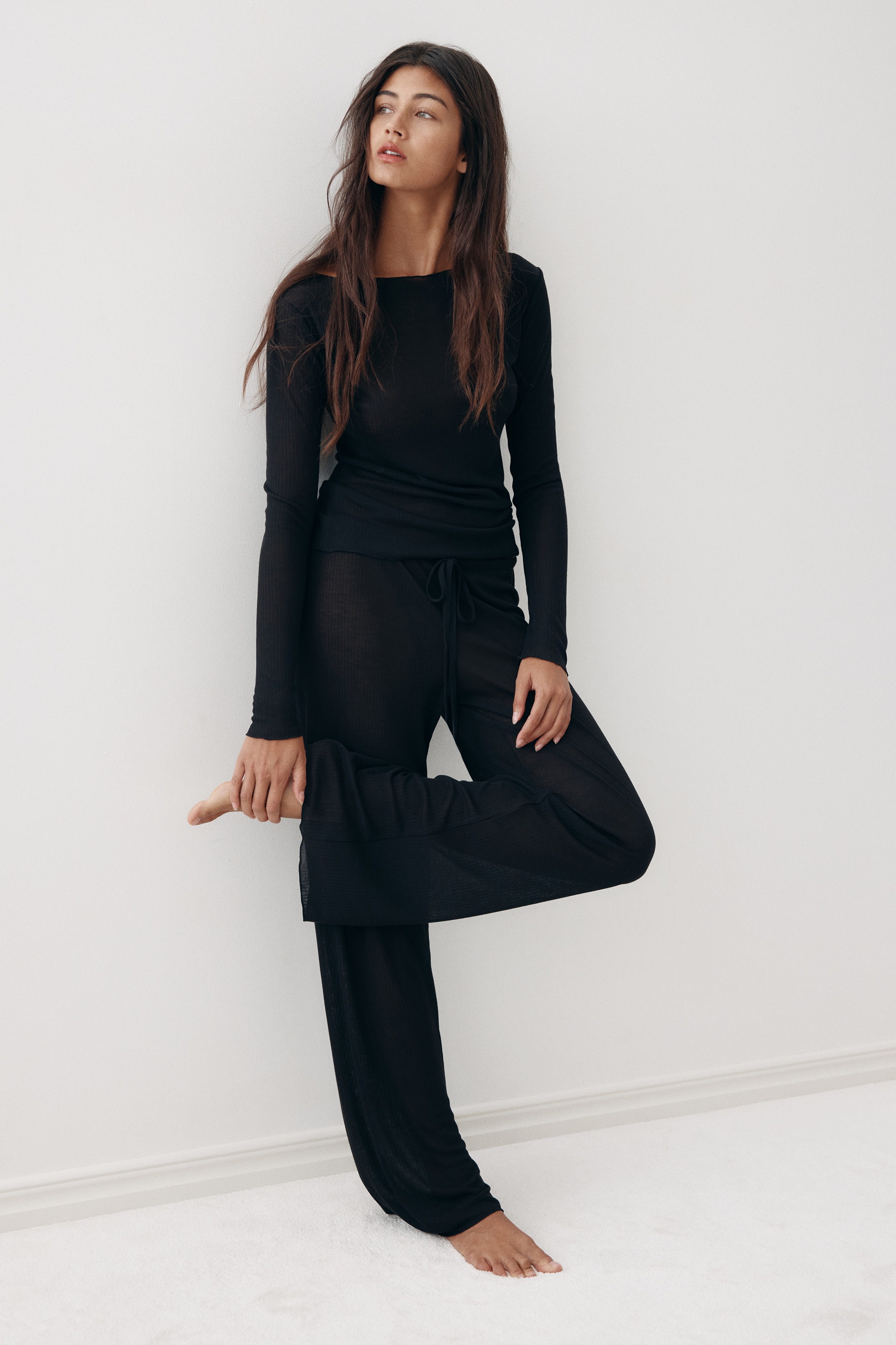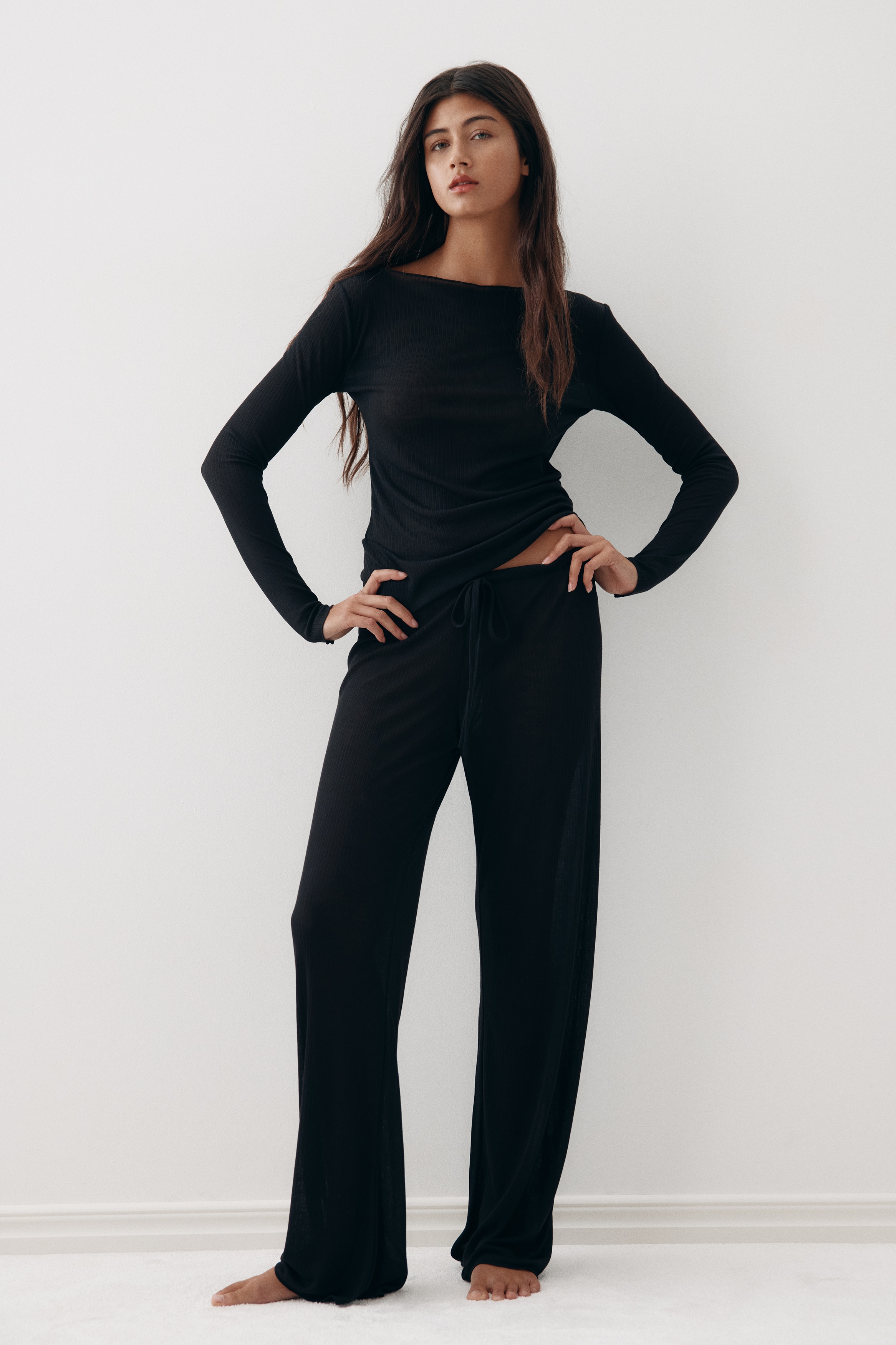 Pyjamas with a top and pair of trousers in sheer, ribbed jersey with overlocked edges. Fitted top with a boat neckline and long sleeves. Trousers with an elasticated, drawstring waist and wide legs.