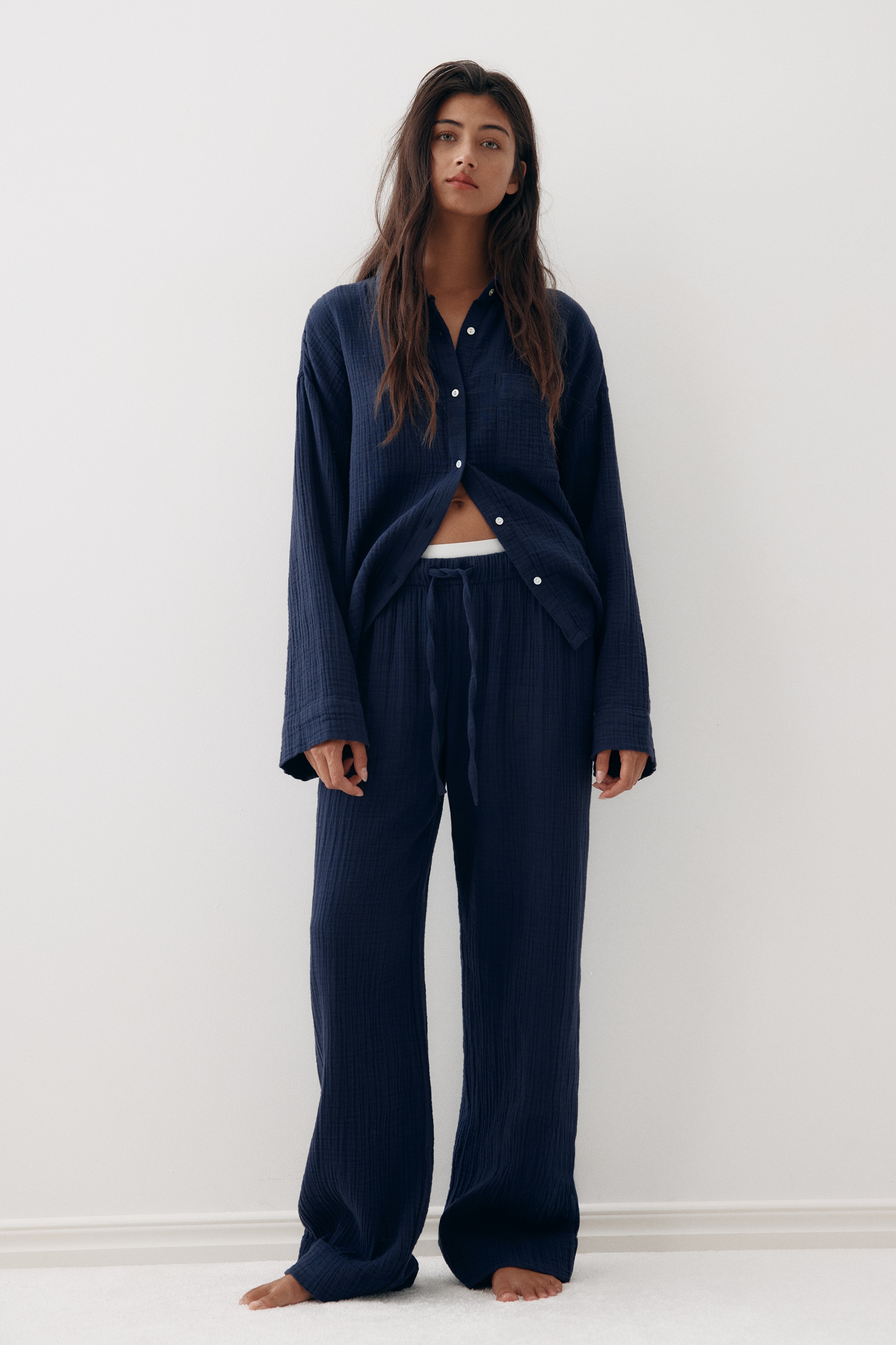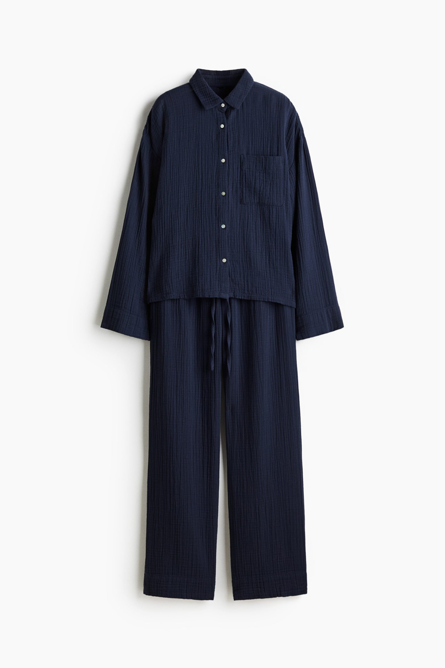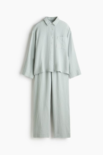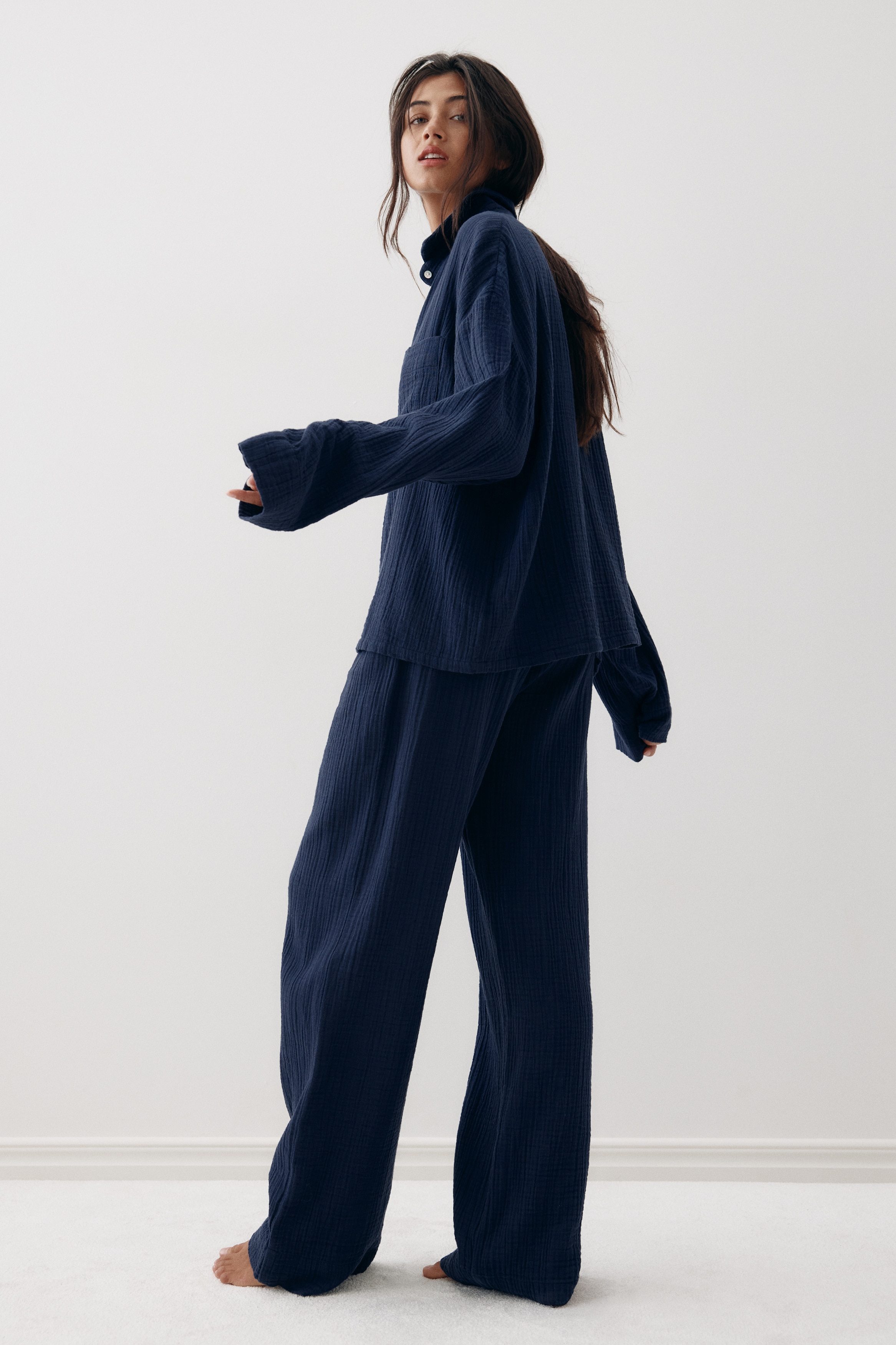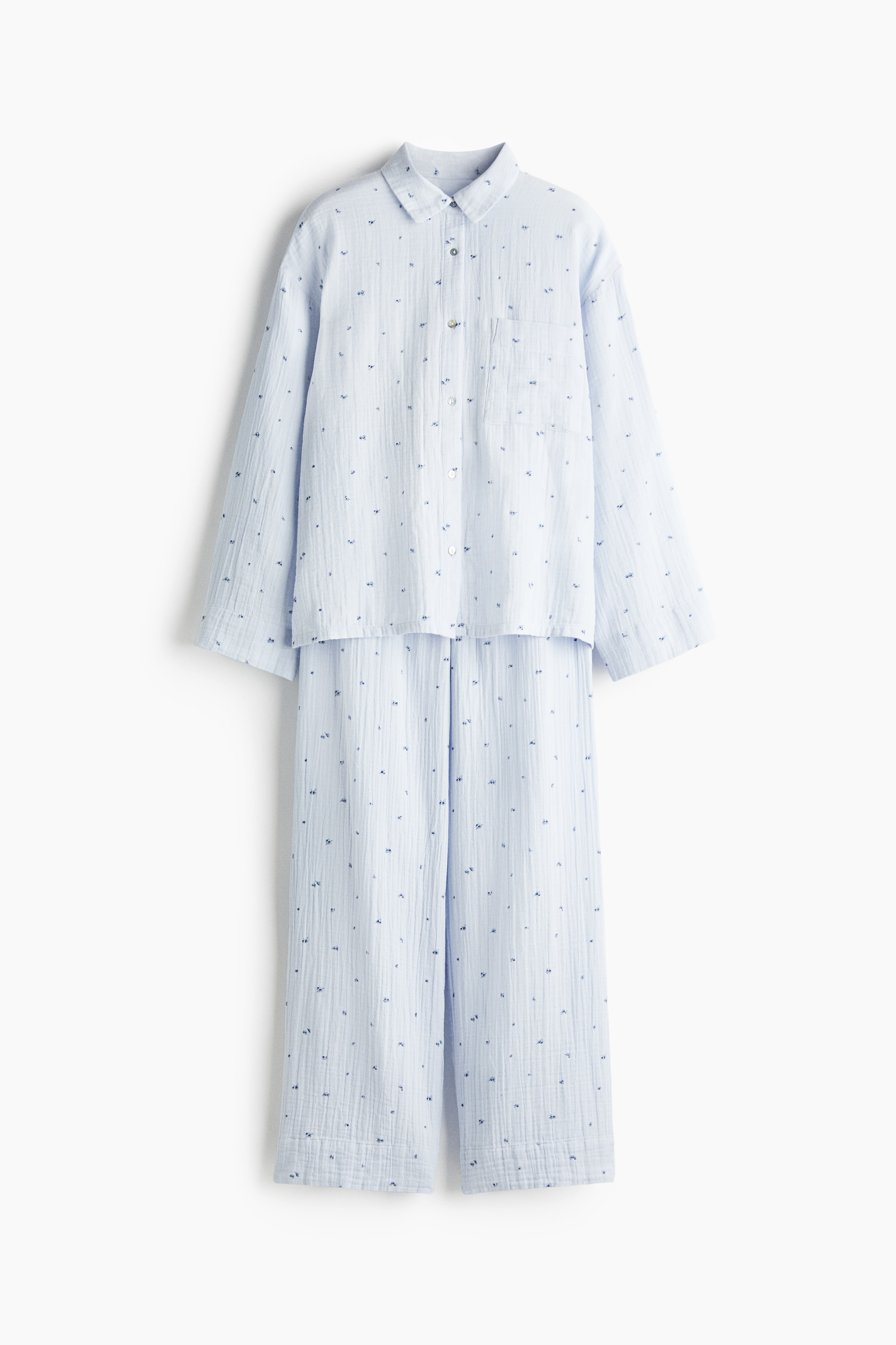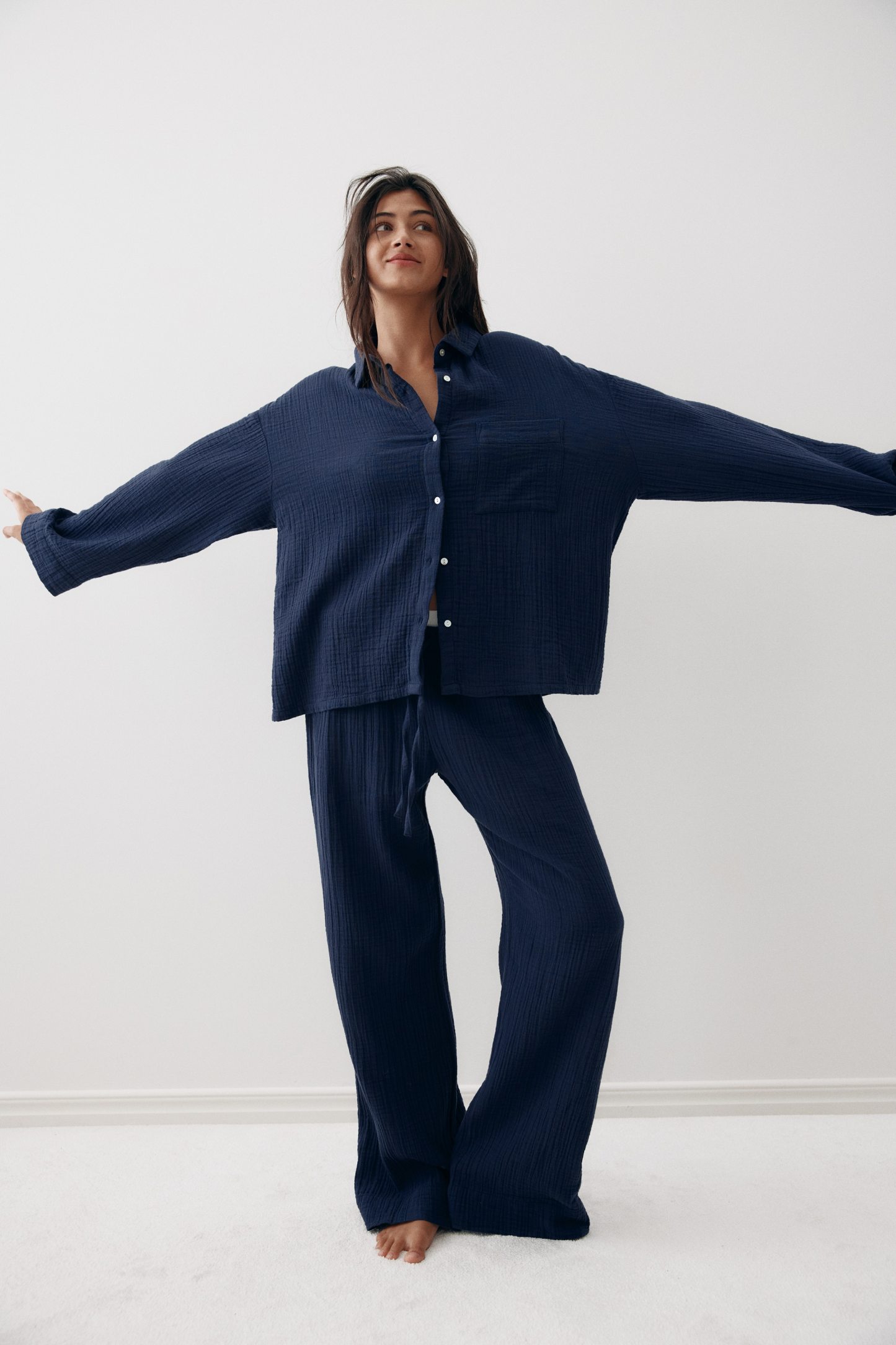 Pyjamas with a shirt and pair of bottoms in soft cotton muslin. Shirt with a collar, divs down the front, a patch chest pocket, dropped shoulders and long sleeves. Bottoms with an elasticated, drawstring waist and straight legs.