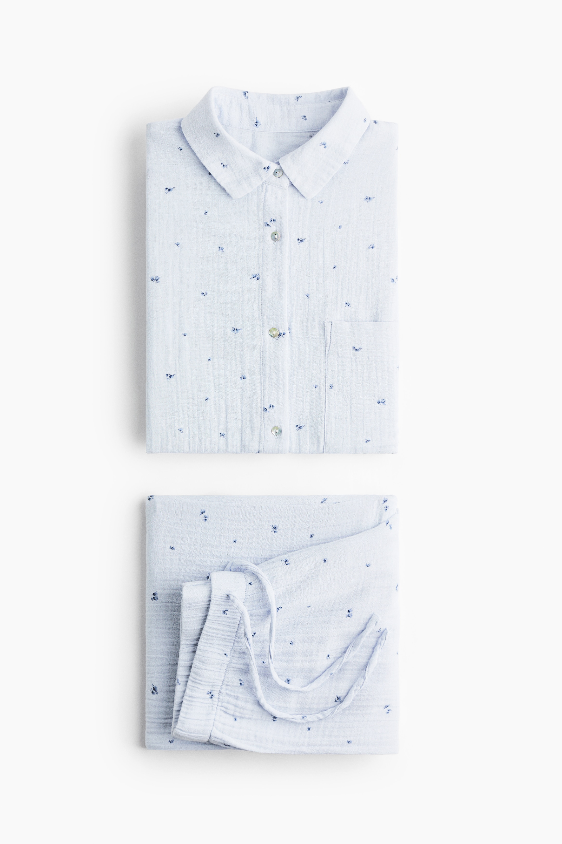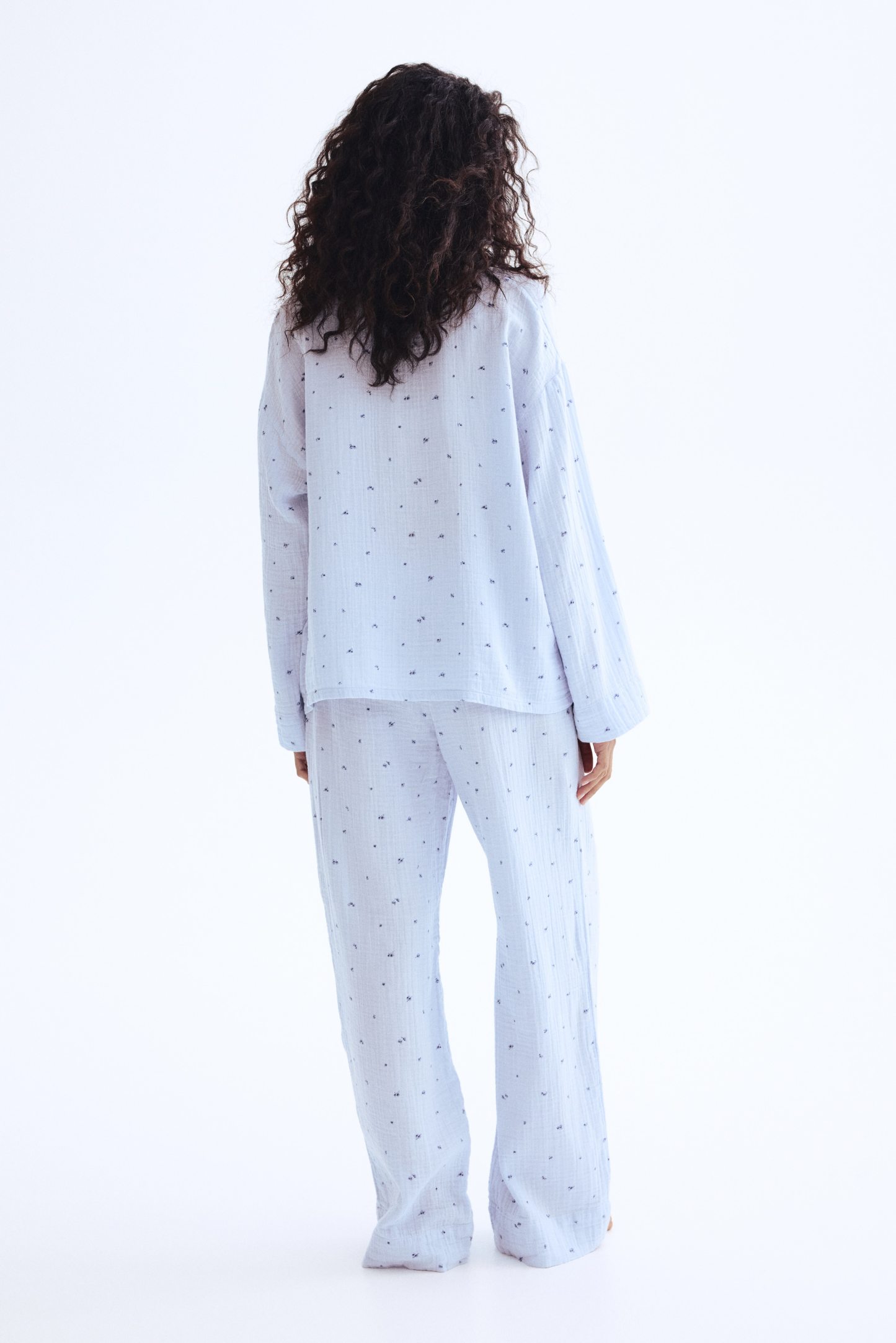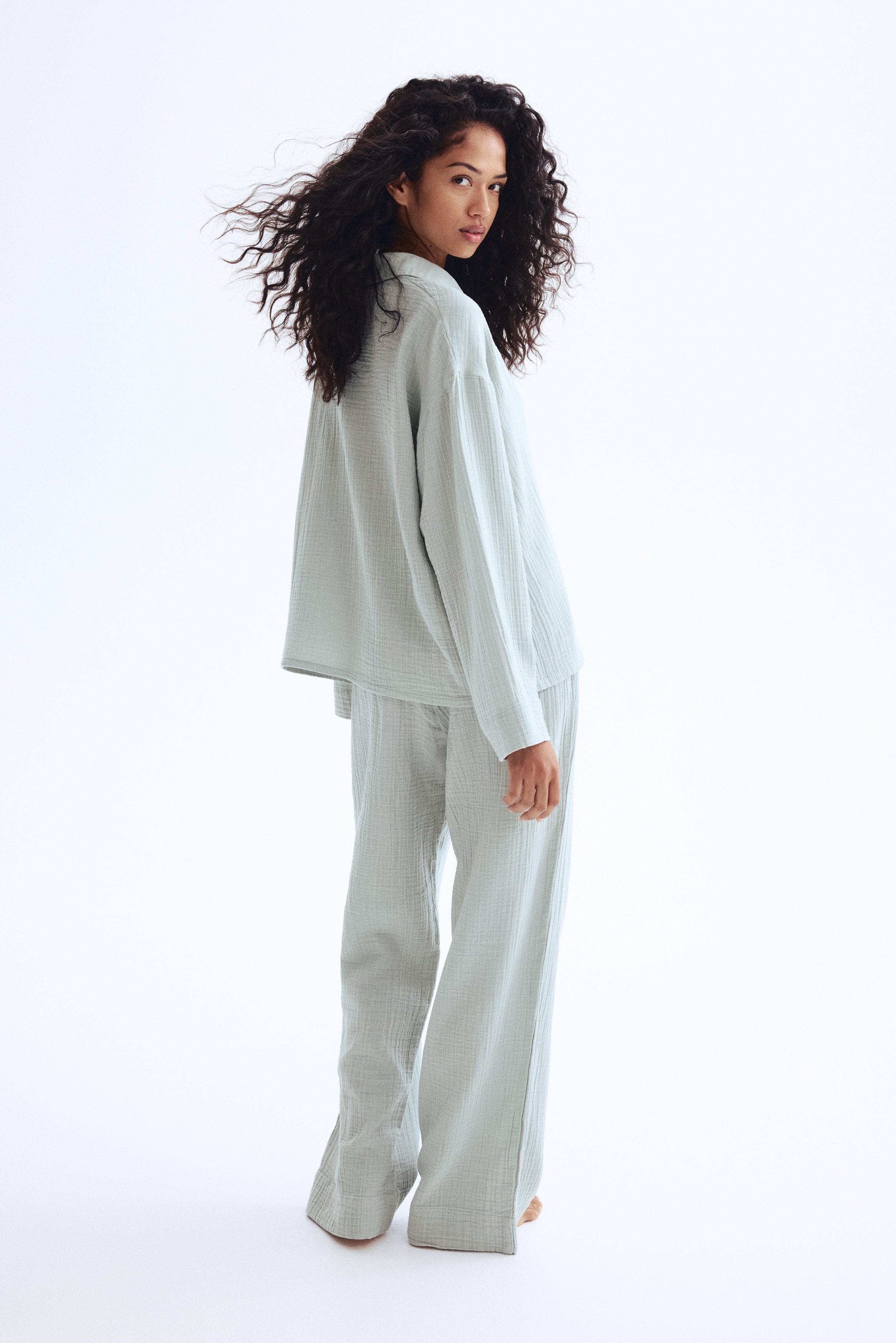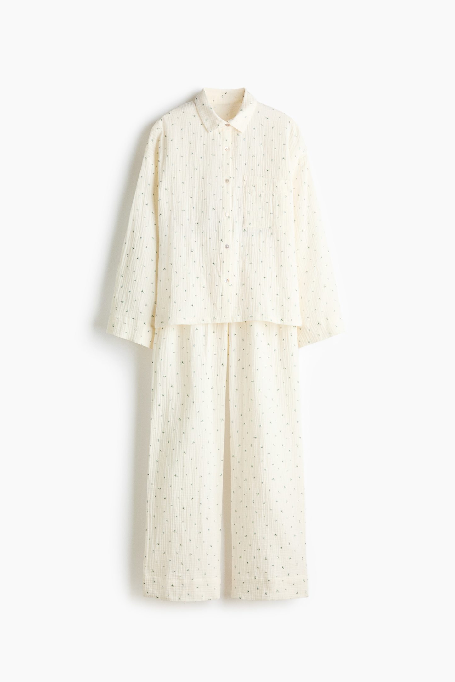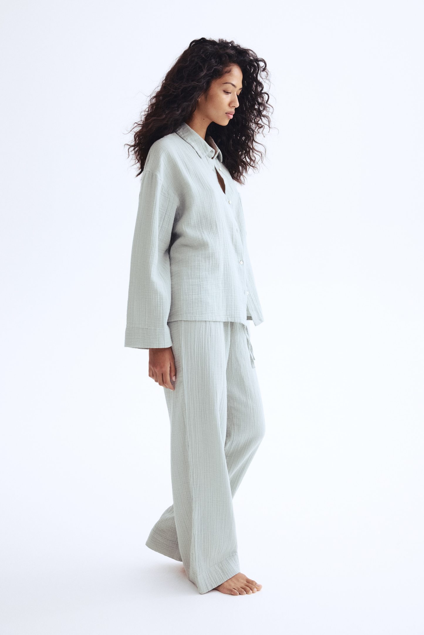 Pyjamas with a shirt and pair of bottoms in soft cotton muslin. Shirt with a collar, divs down the front, a patch chest pocket, dropped shoulders and long sleeves. Bottoms with an elasticated, drawstring waist and straight legs.