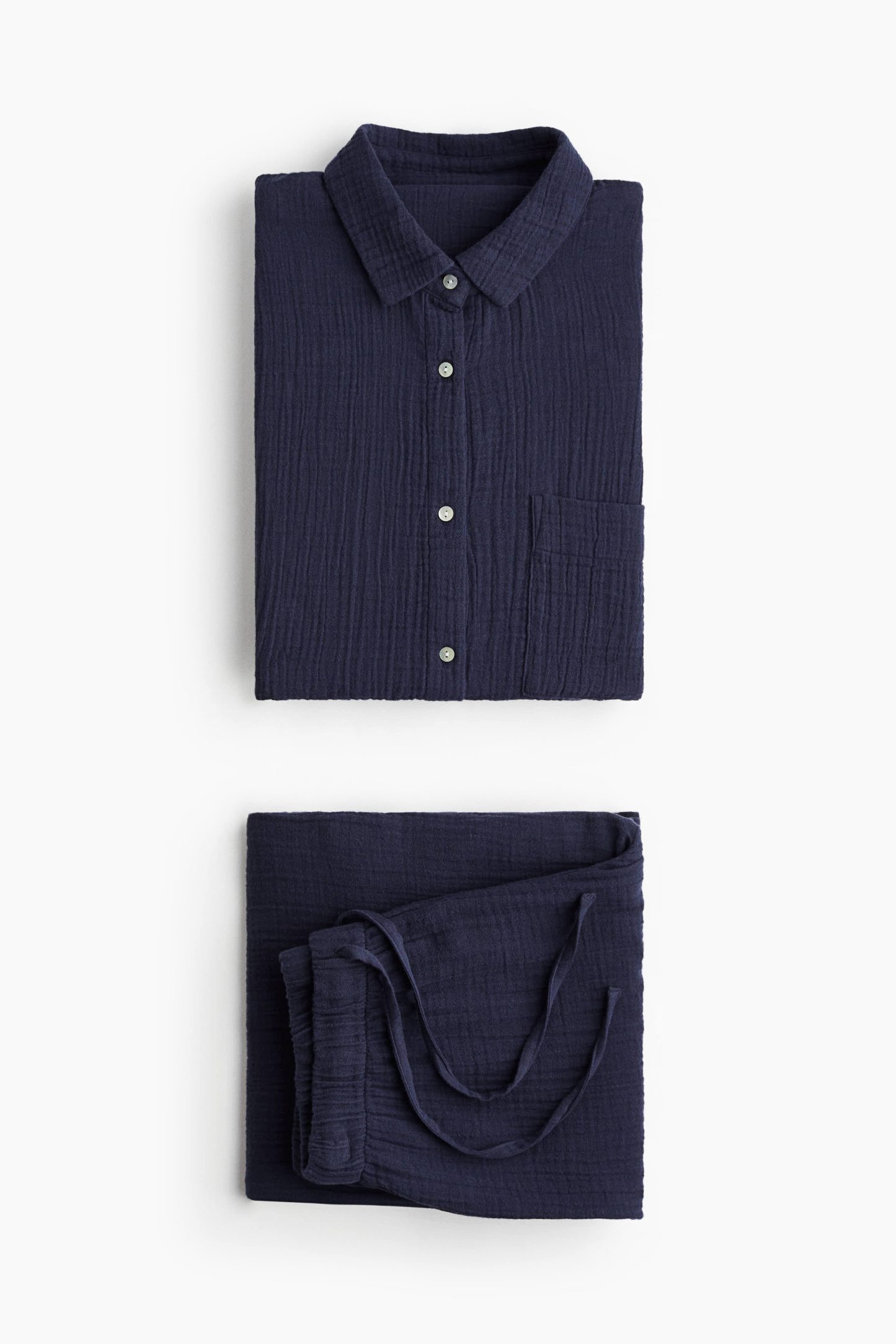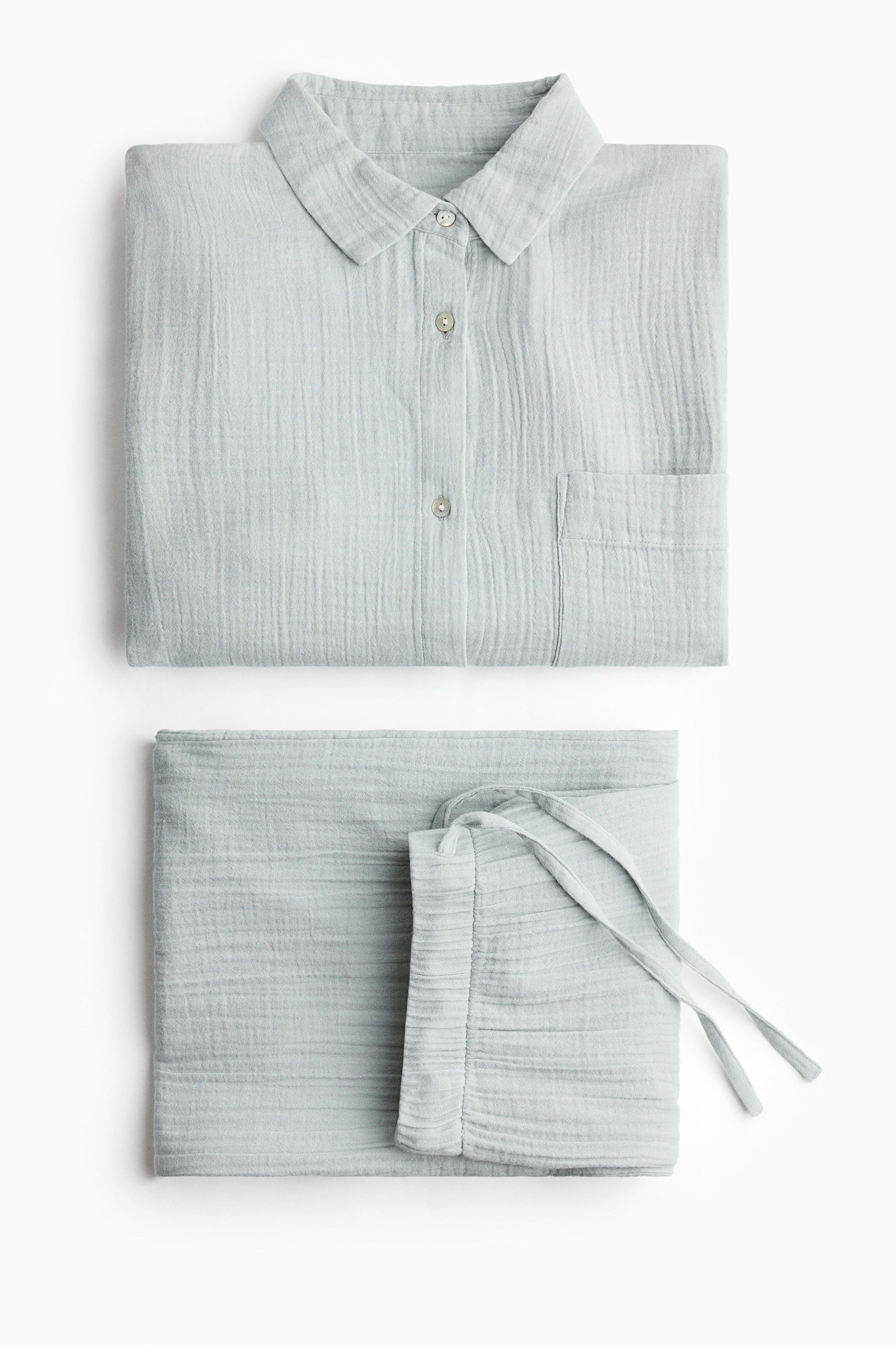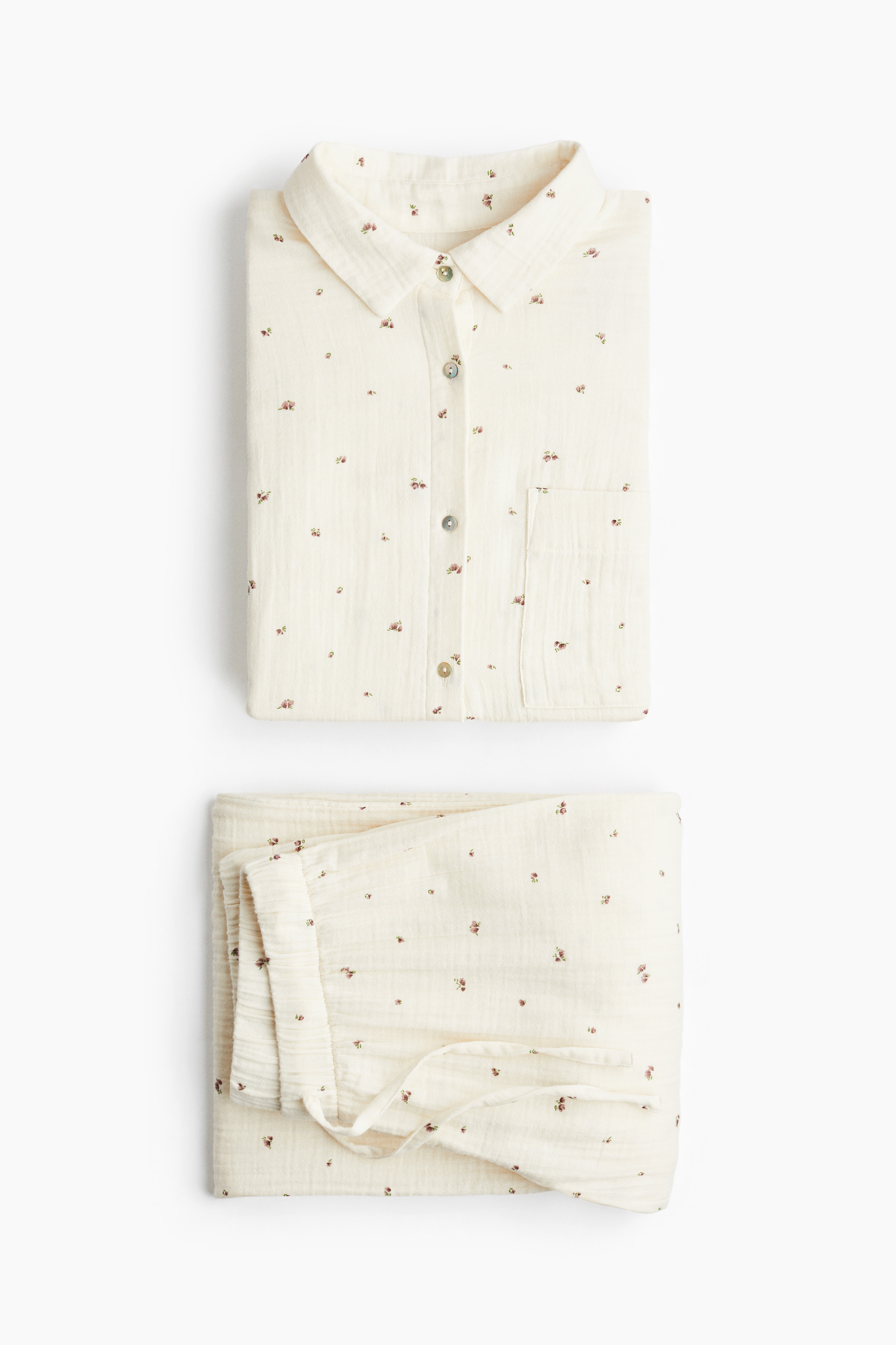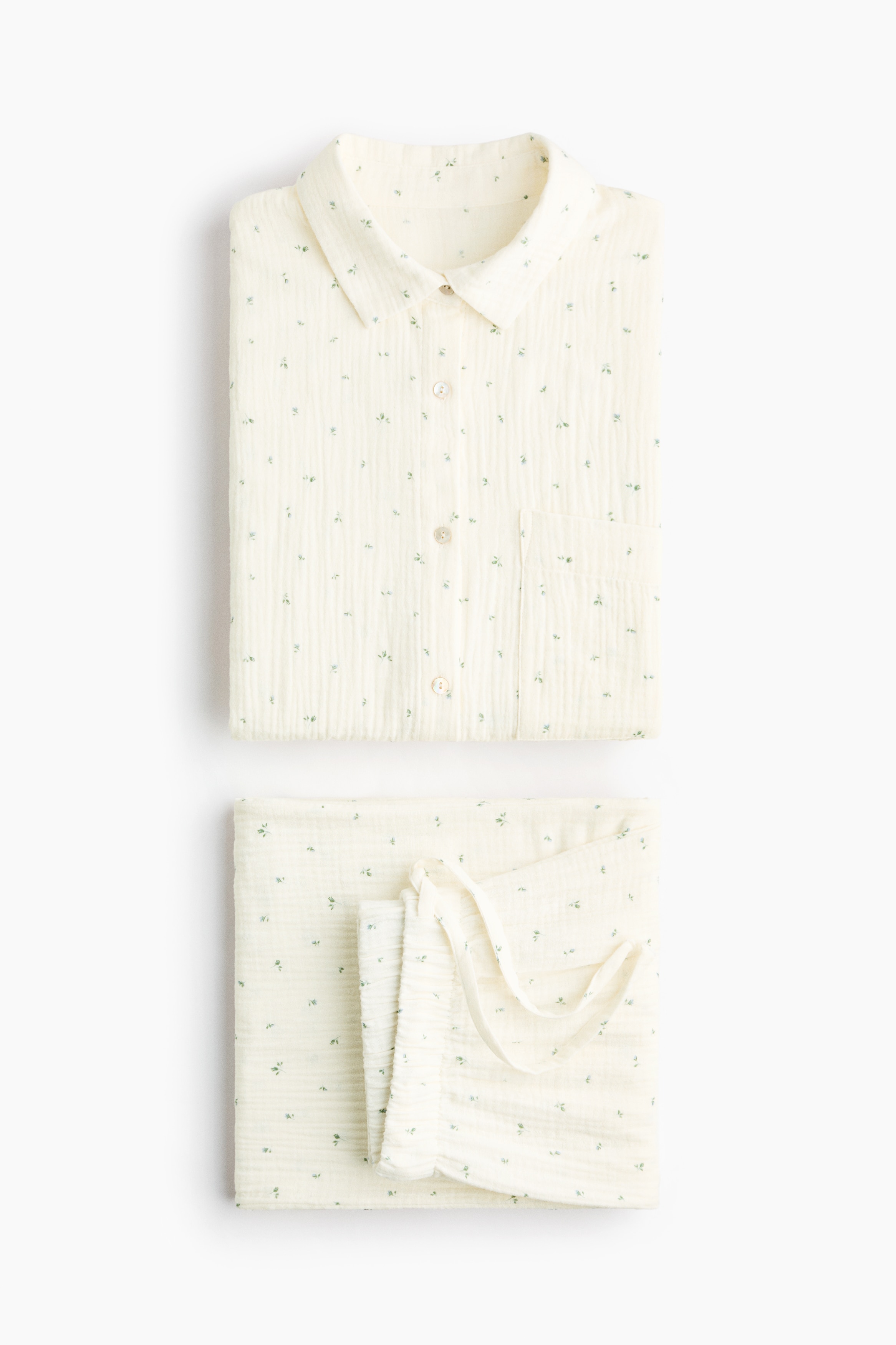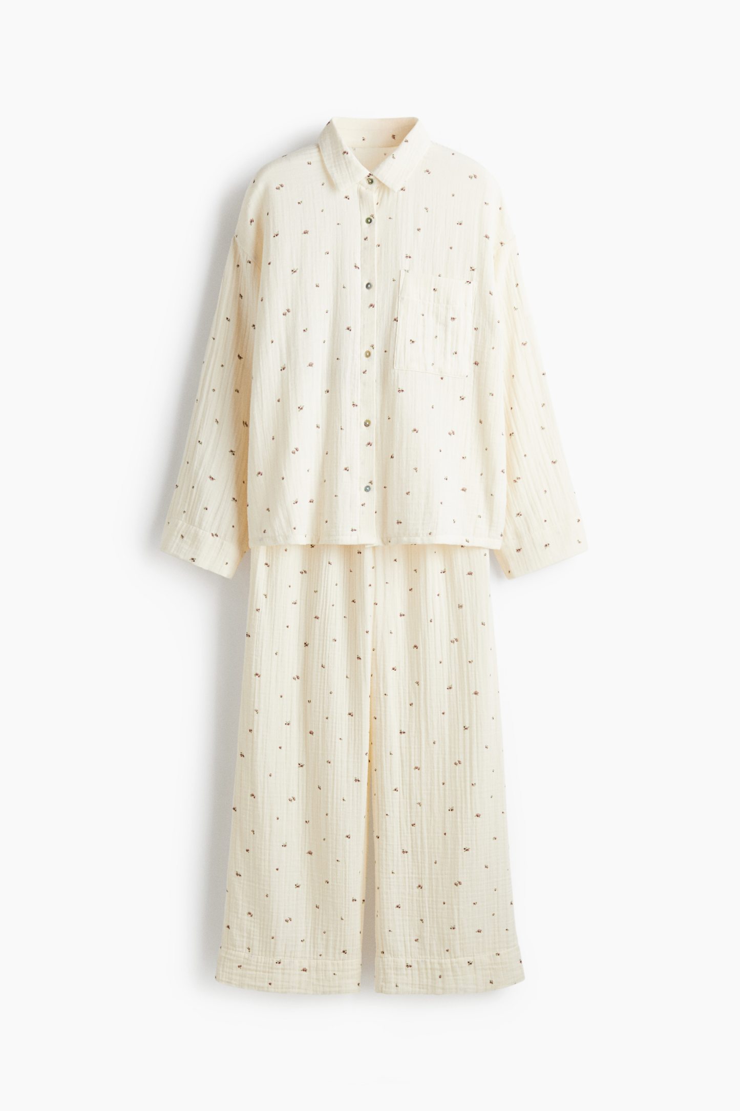 Pyjamas with a shirt and pair of bottoms in soft cotton muslin. Shirt with a collar, divs down the front, a patch chest pocket, dropped shoulders and long sleeves. Bottoms with an elasticated, drawstring waist and straight legs.