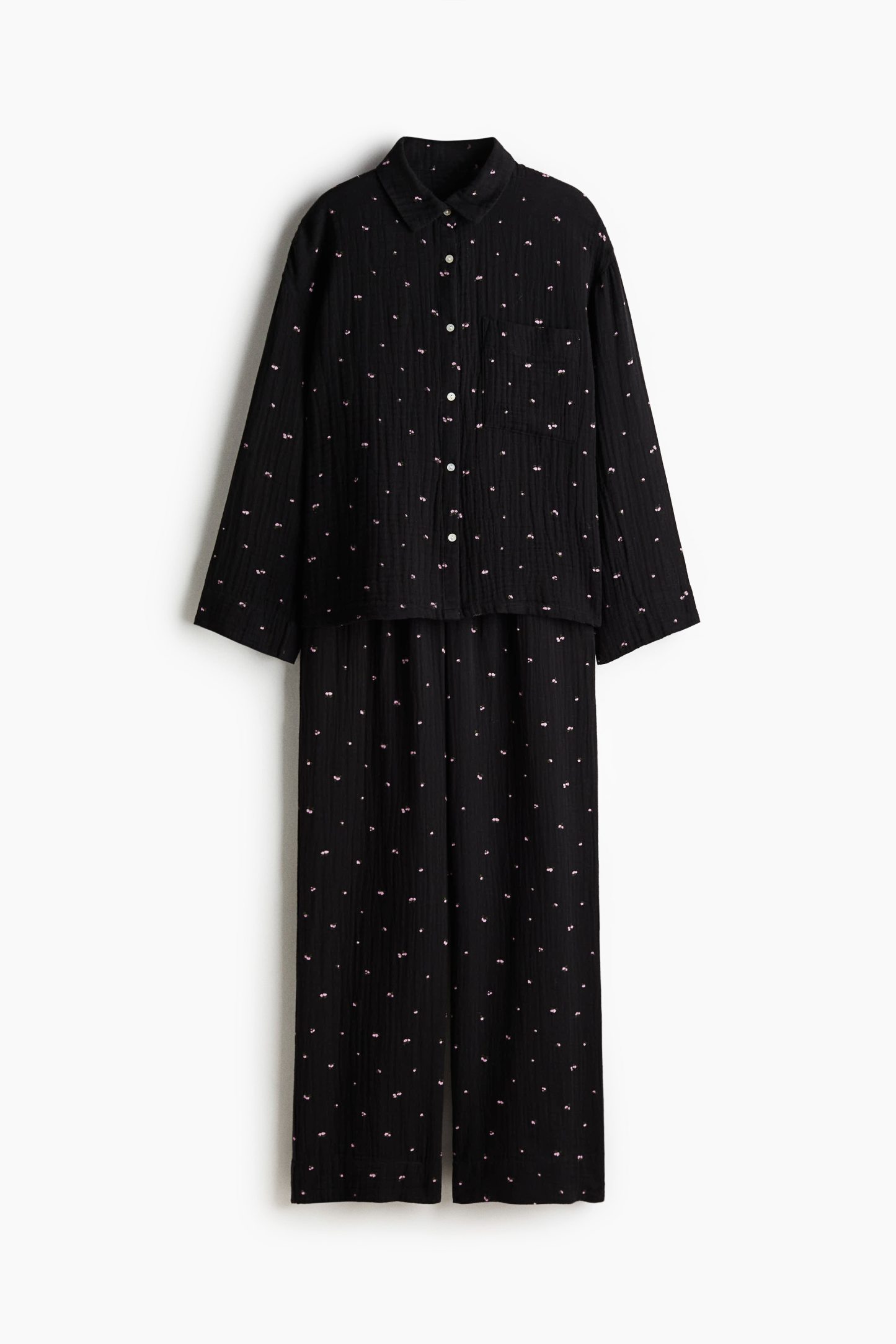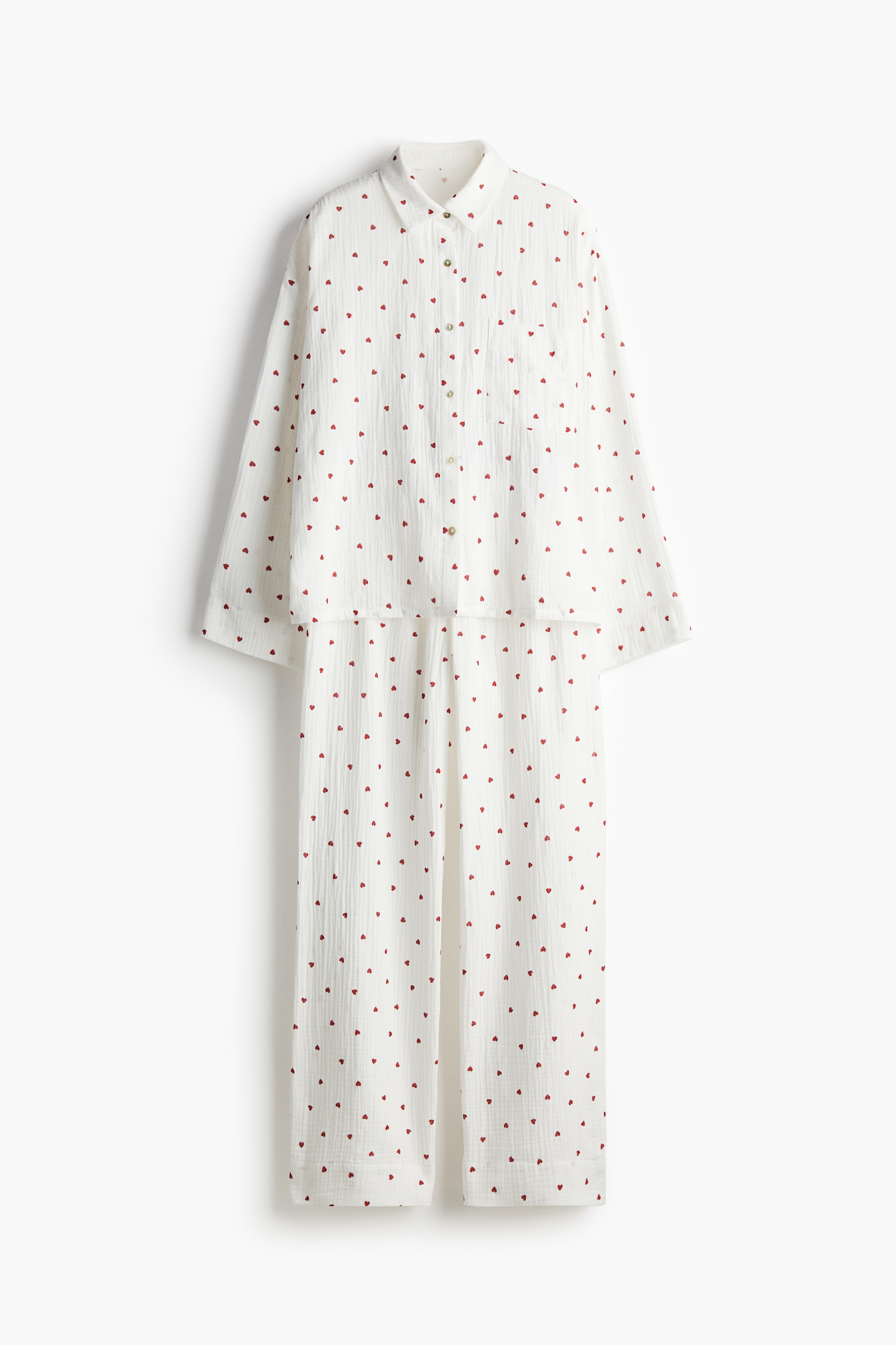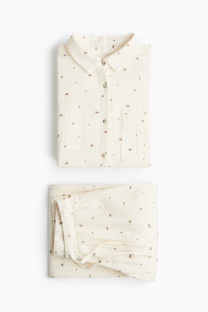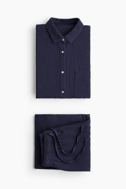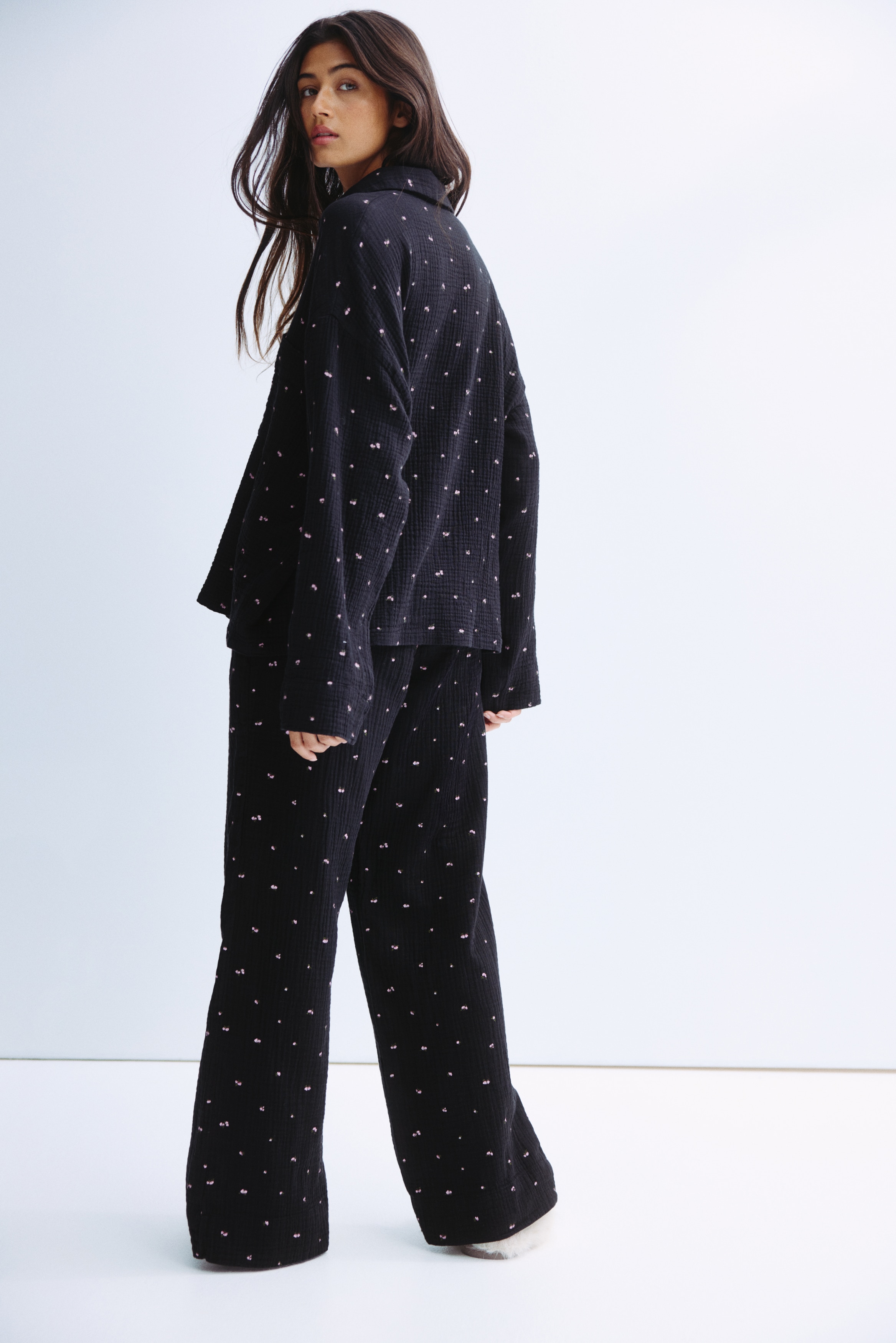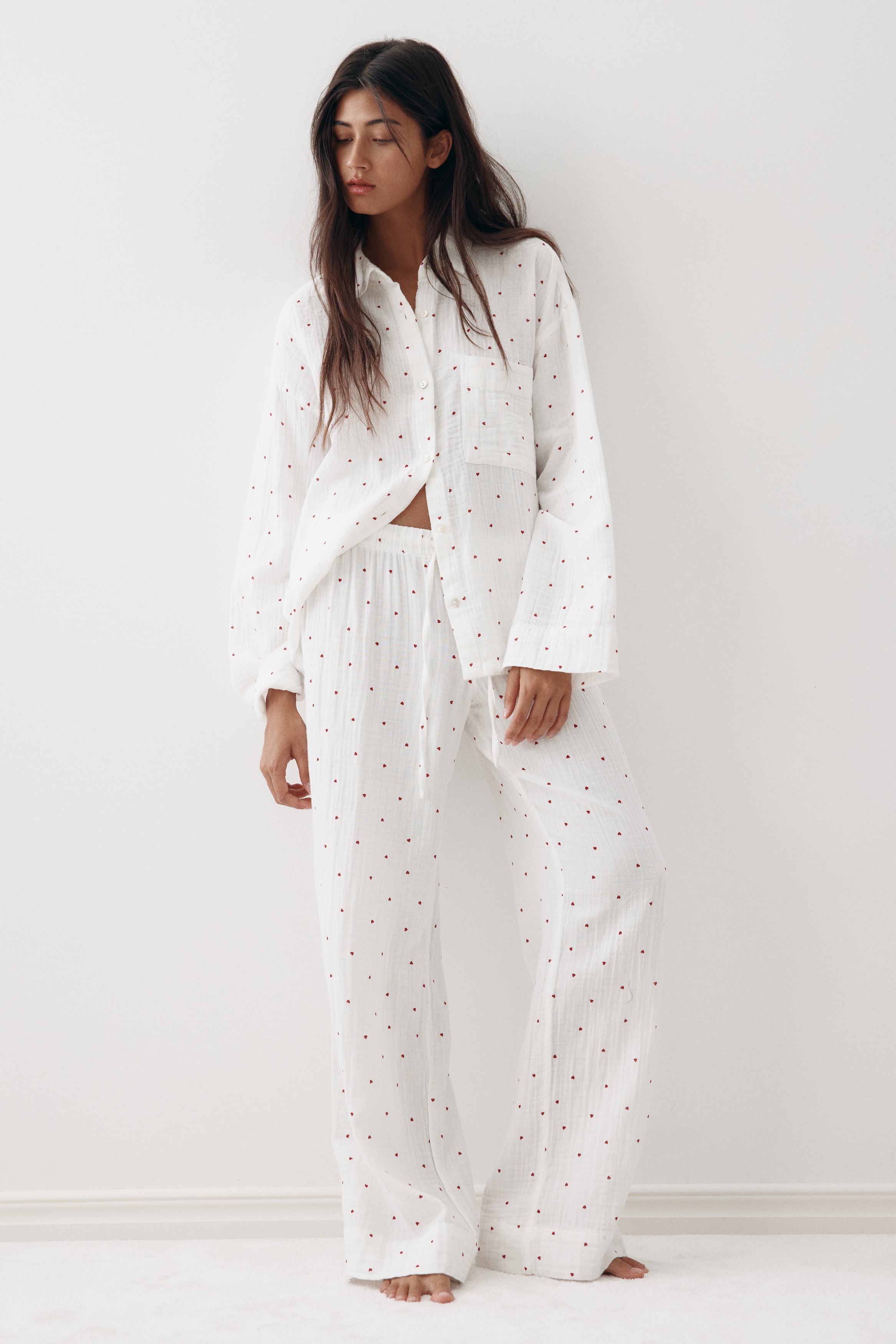 Pyjamas with a shirt and pair of bottoms in soft cotton muslin. Shirt with a collar, divs down the front, a patch chest pocket, dropped shoulders and long sleeves. Bottoms with an elasticated, drawstring waist and straight legs.