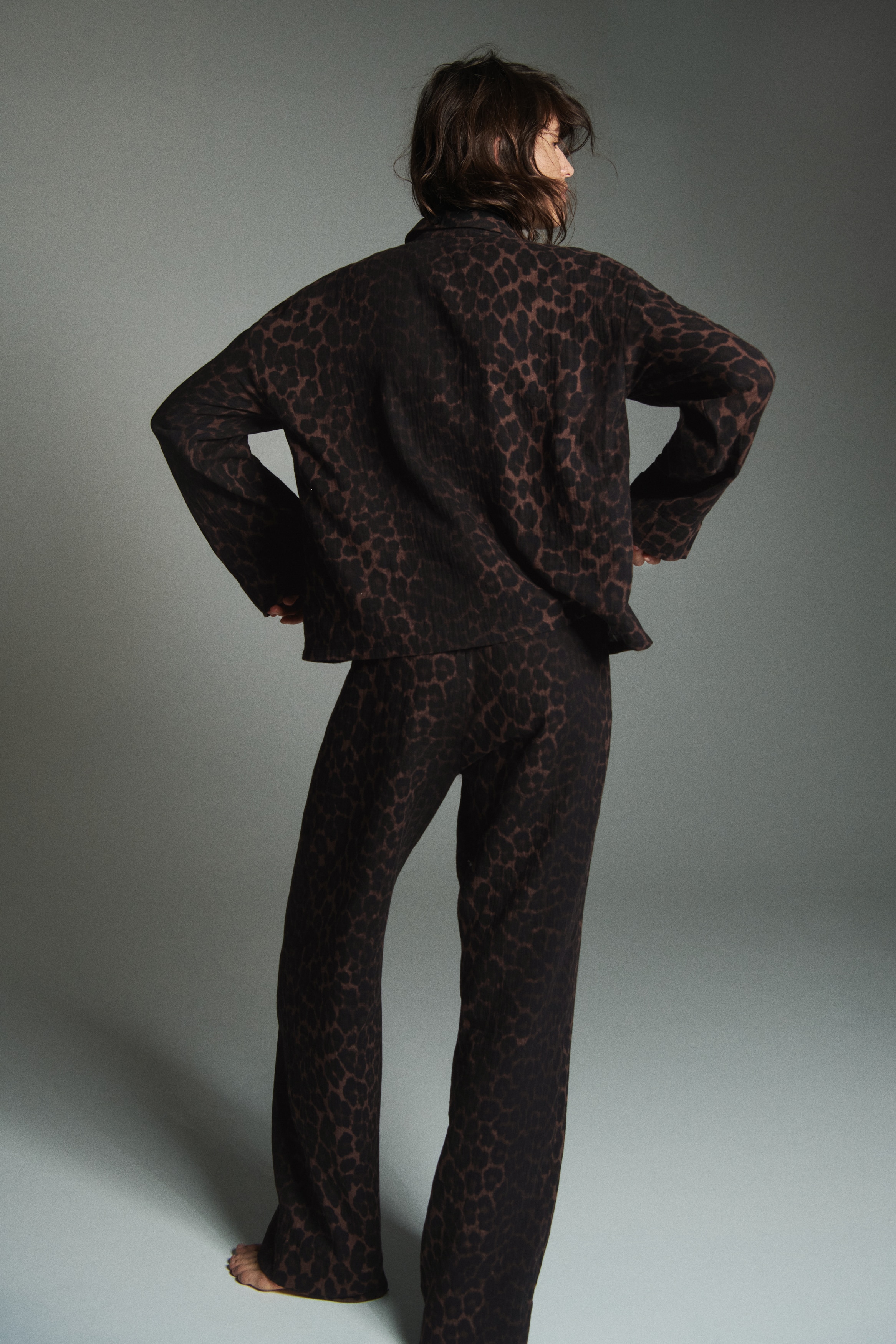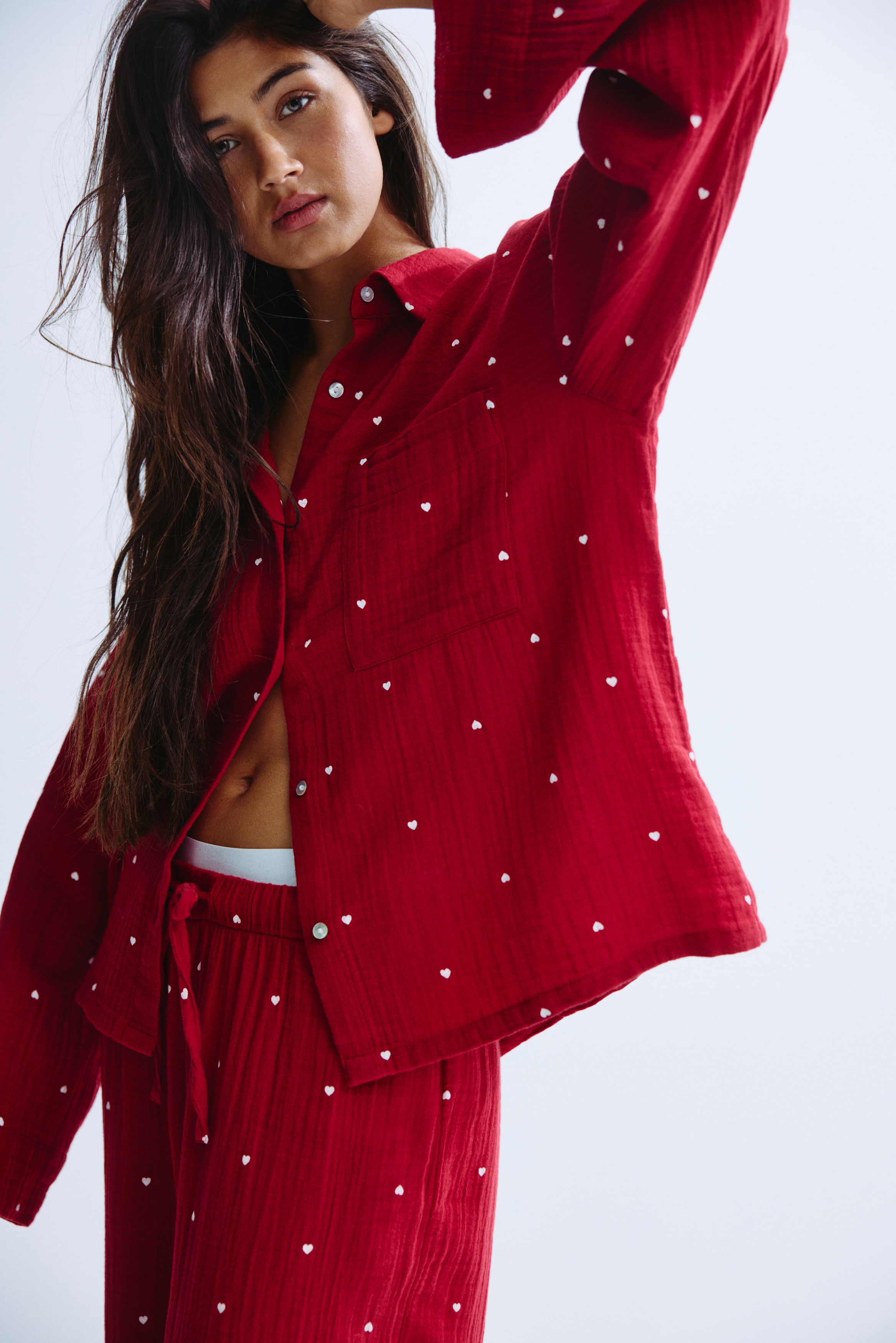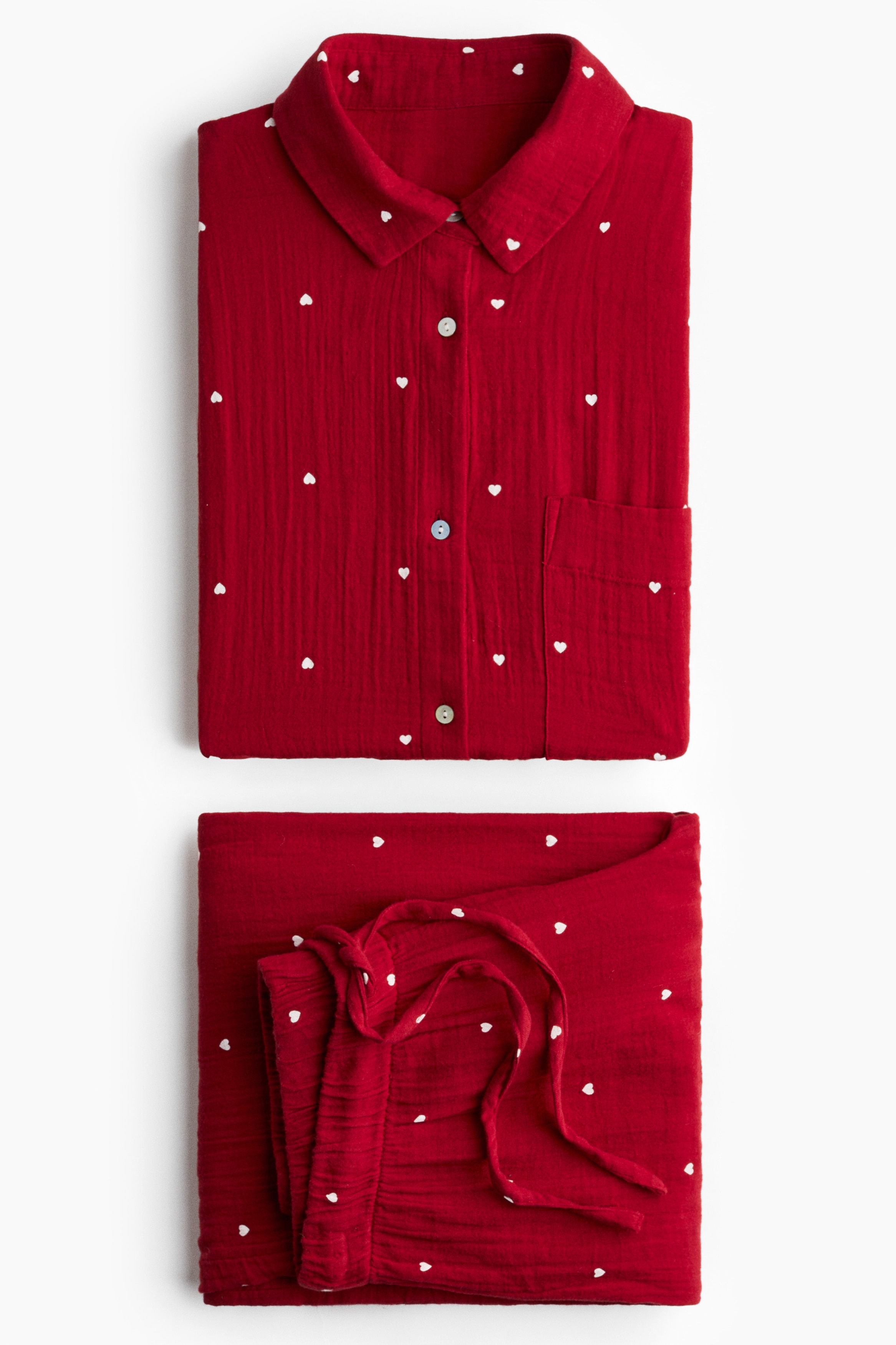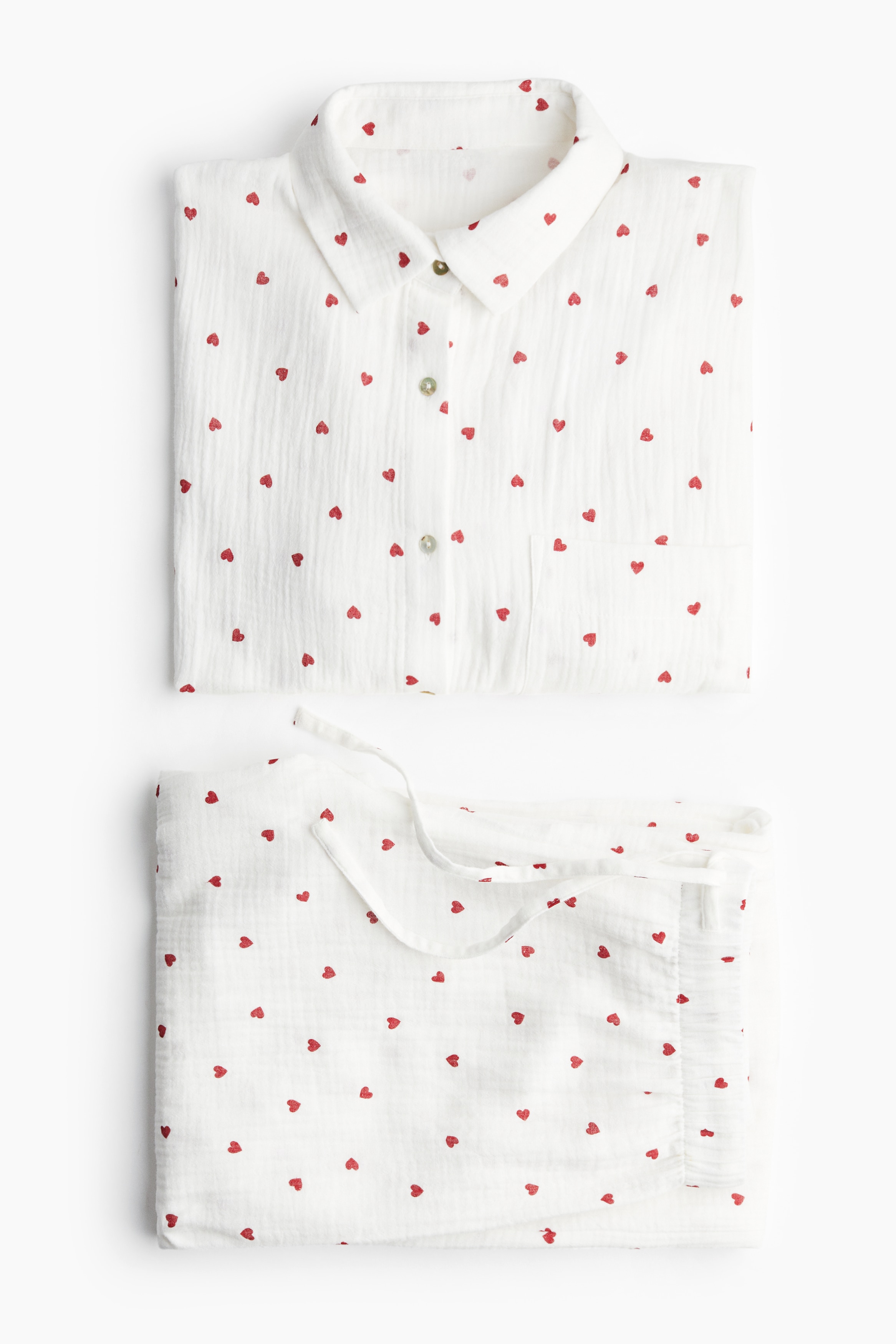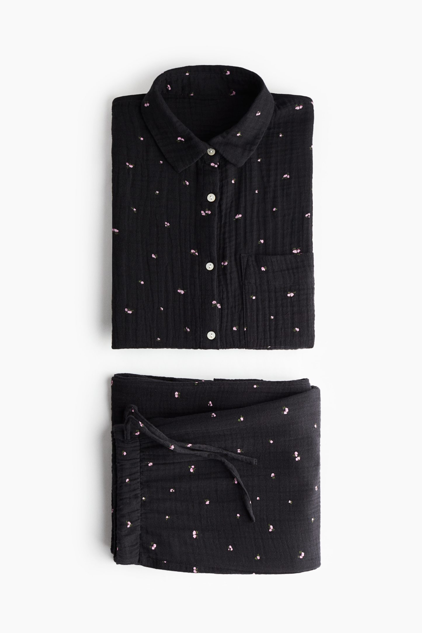 Pyjamas with a shirt and pair of bottoms in soft cotton muslin. Shirt with a collar, divs down the front, a patch chest pocket, dropped shoulders and long sleeves. Bottoms with an elasticated, drawstring waist and straight legs.