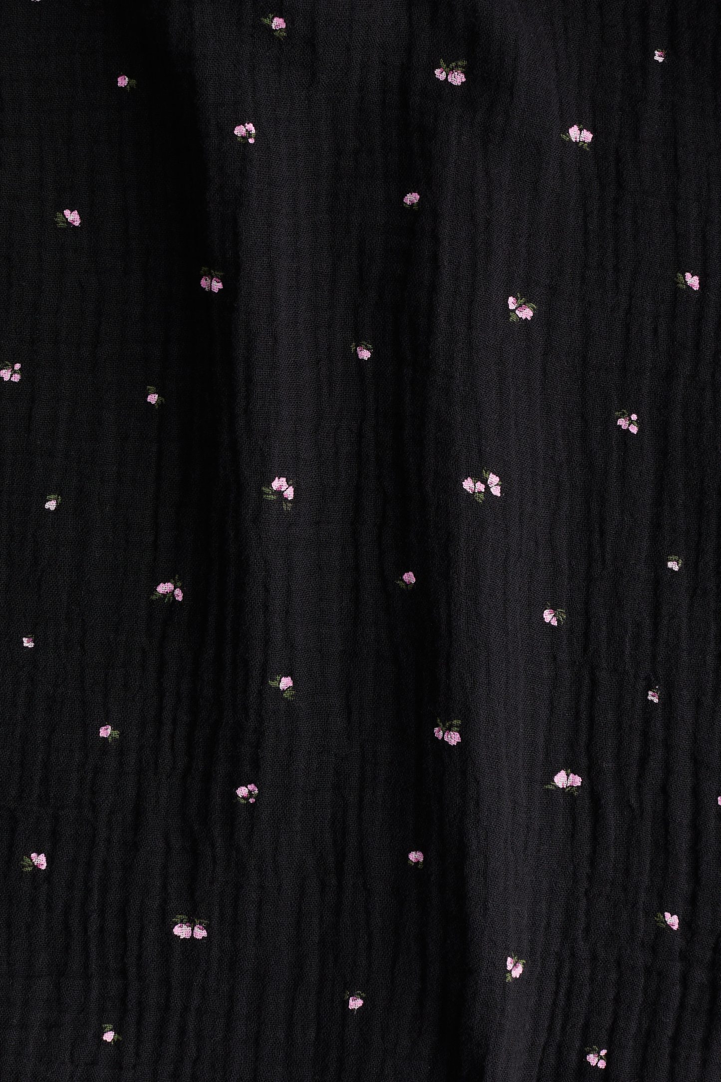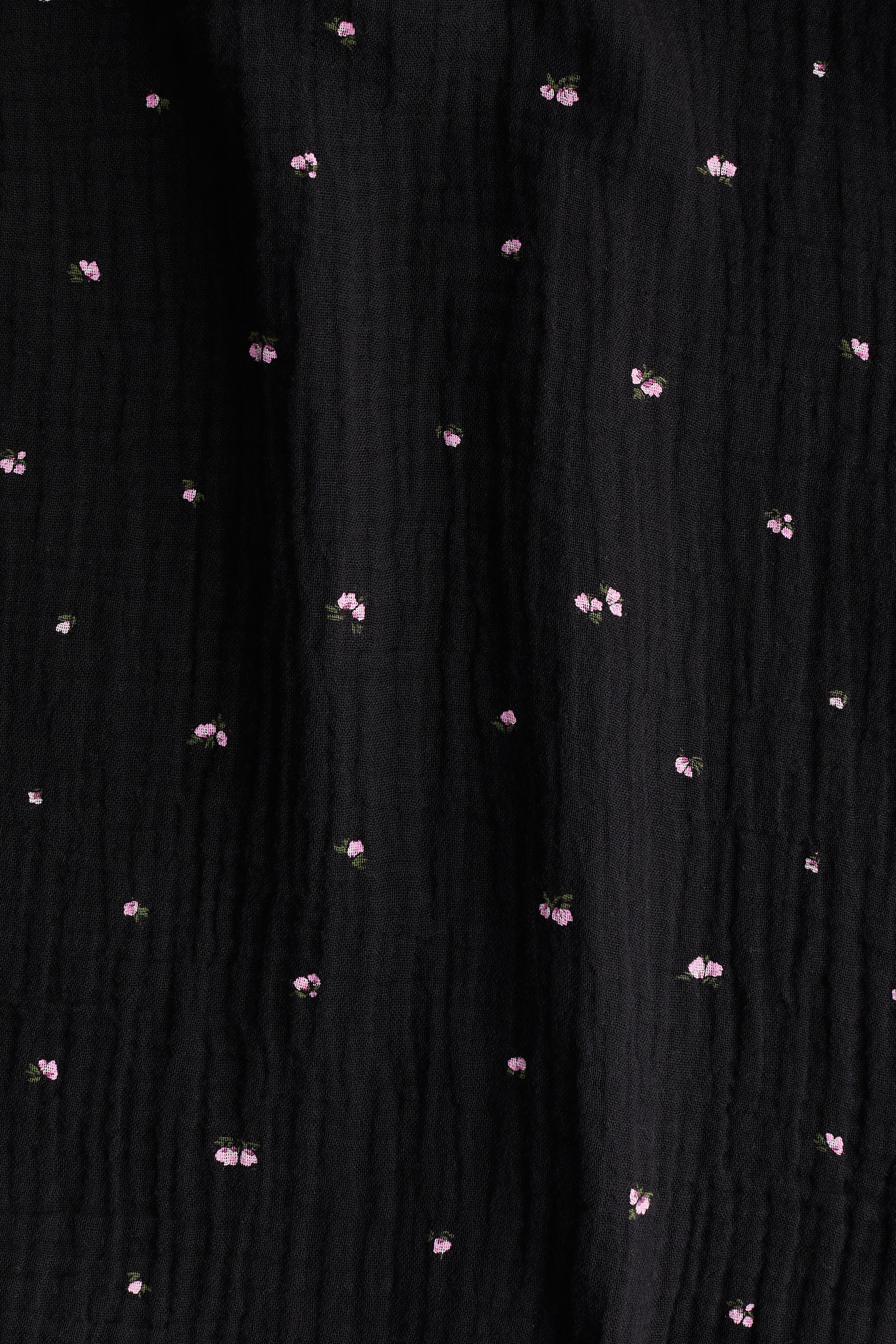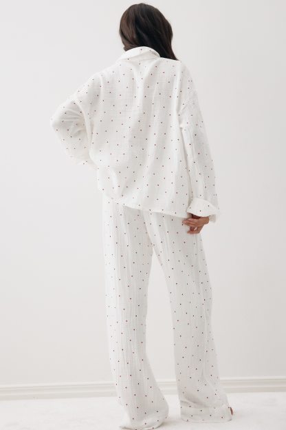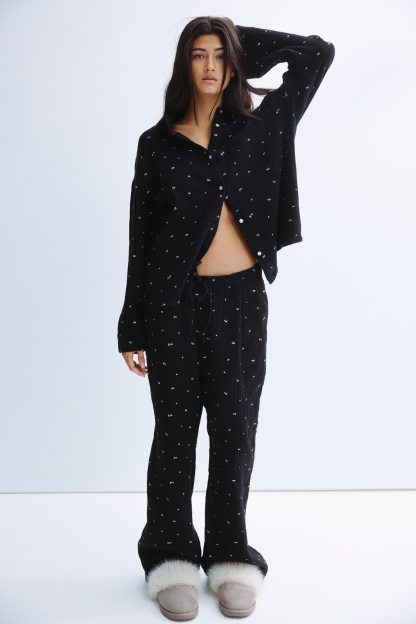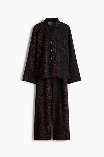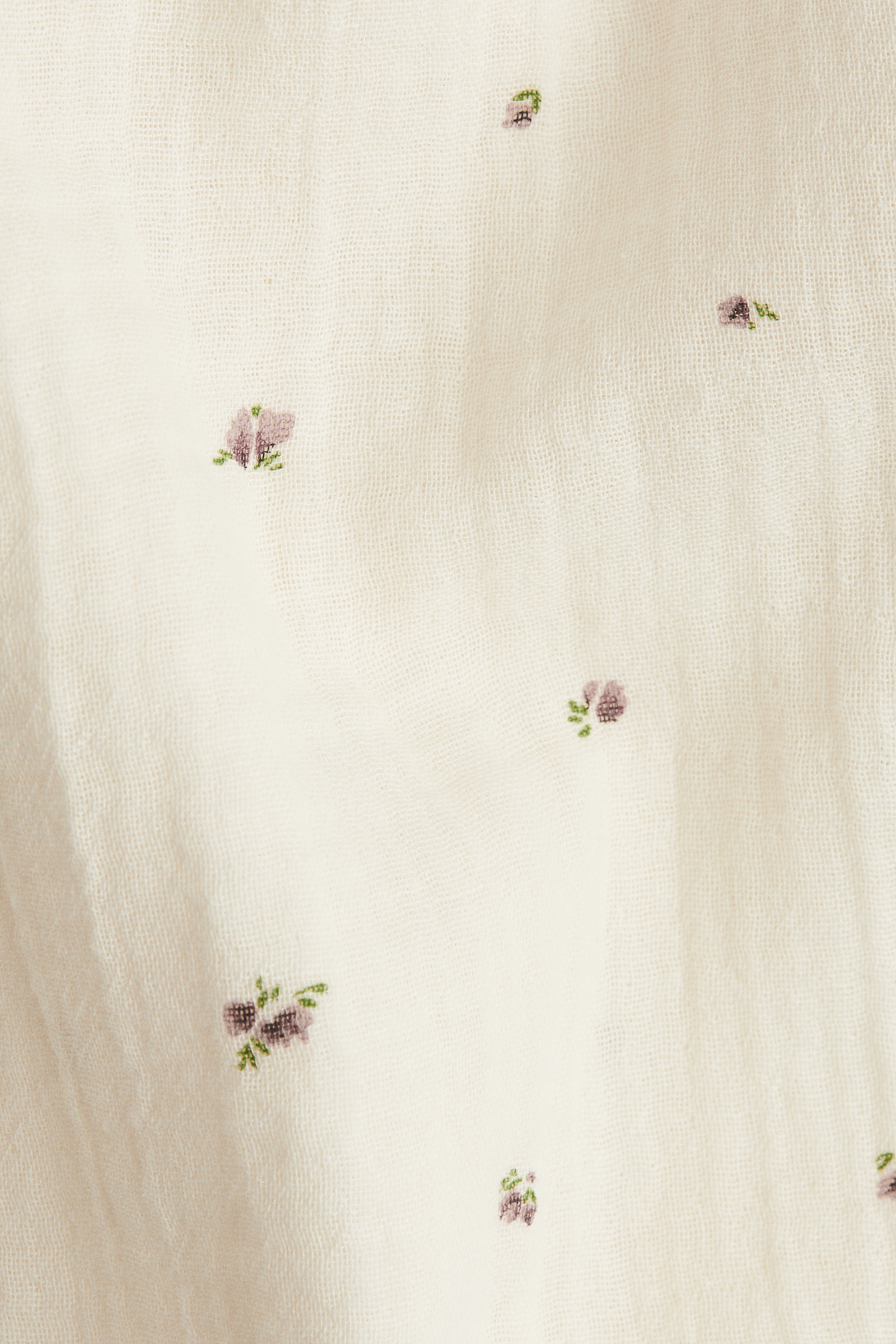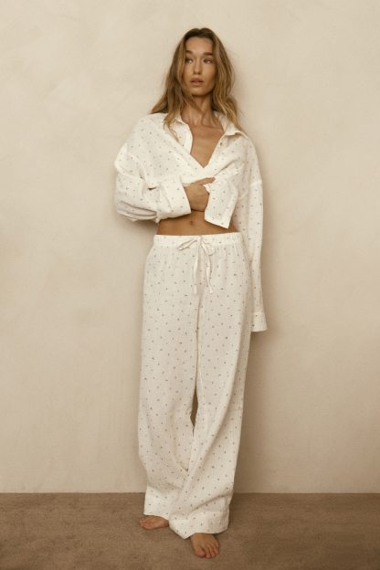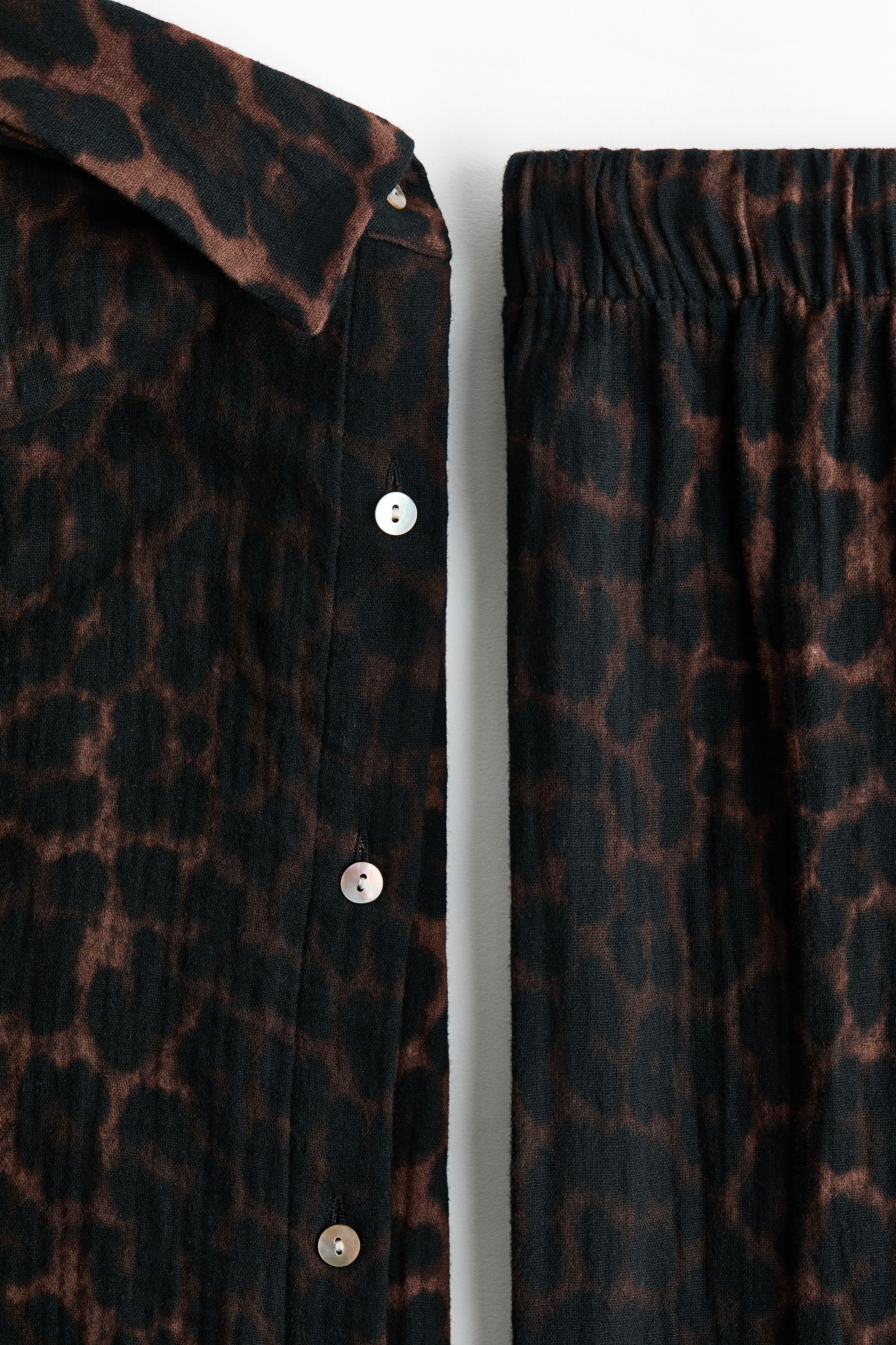 Pyjamas with a shirt and pair of bottoms in soft cotton muslin. Shirt with a collar, divs down the front, a patch chest pocket, dropped shoulders and long sleeves. Bottoms with an elasticated, drawstring waist and straight legs.