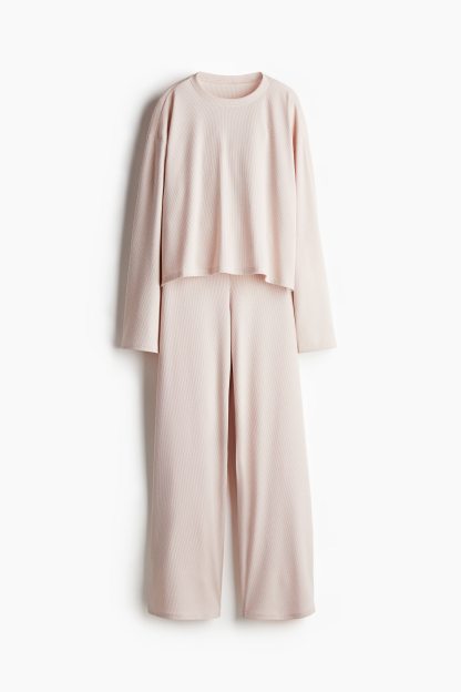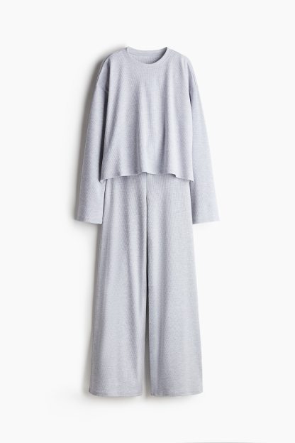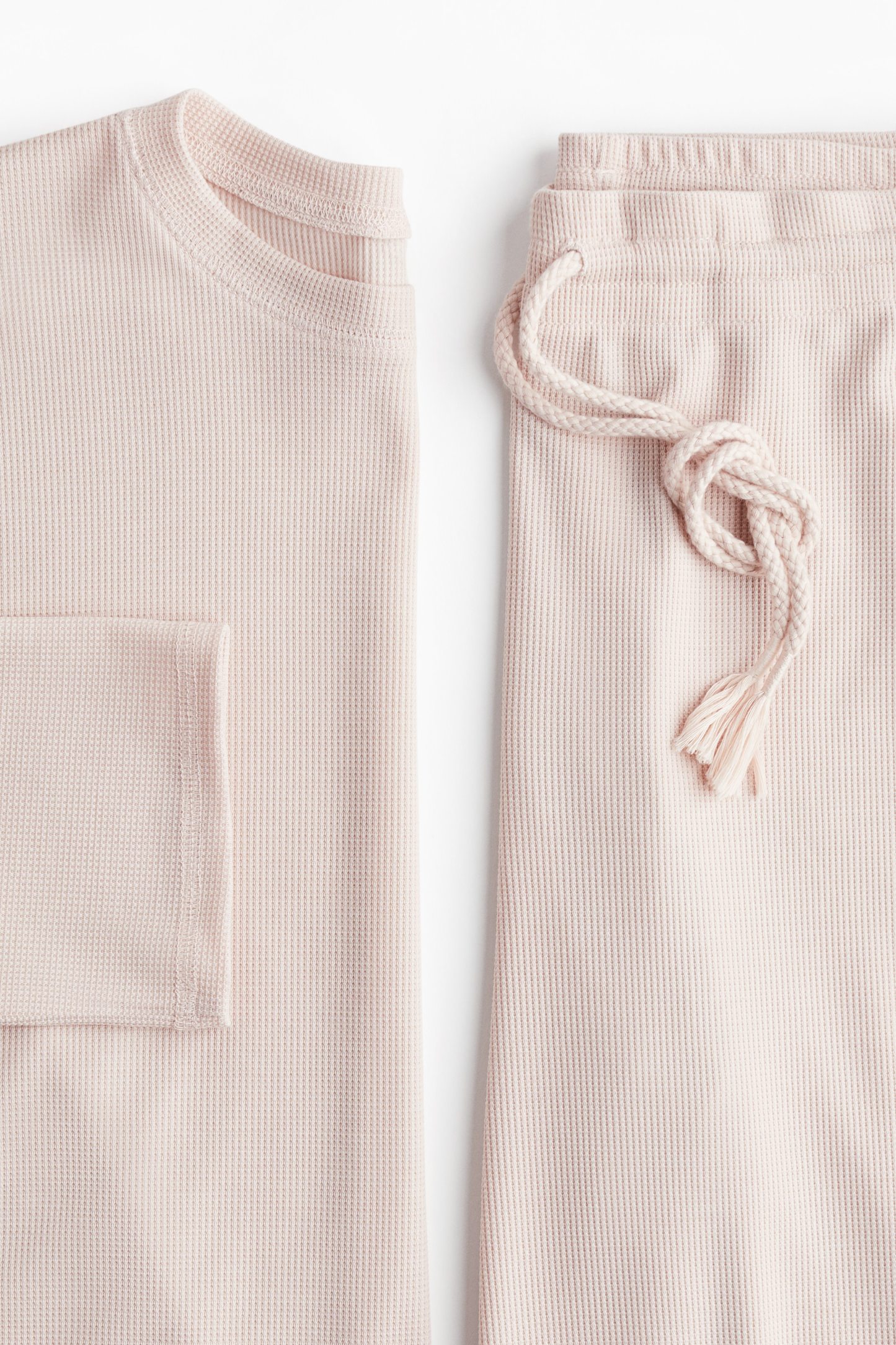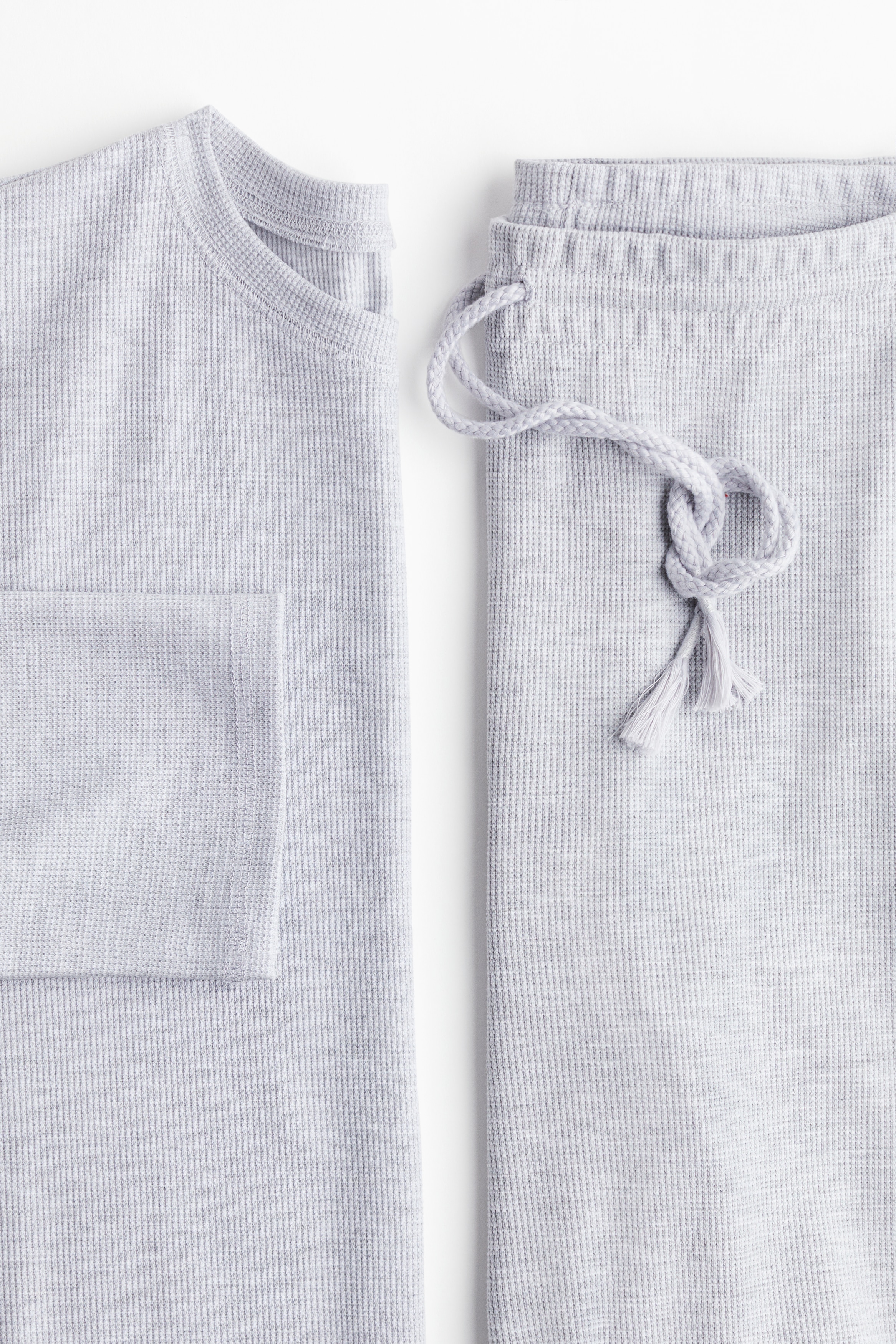 Pyjamas with a top and pair of bottoms in waffled jersey. Top with a round neckline, dropped shoulders and long sleeves. Bottoms with an elasticated, drawstring waist and straight legs.