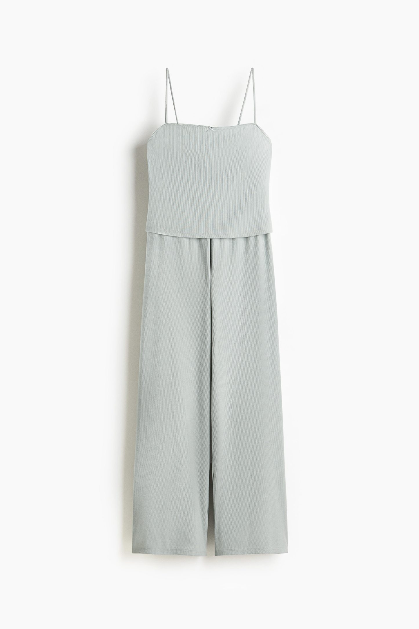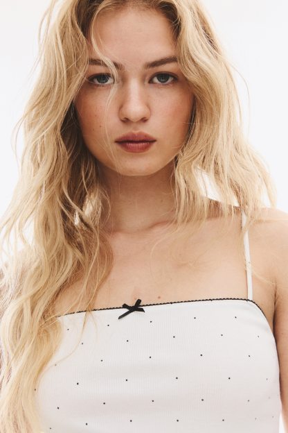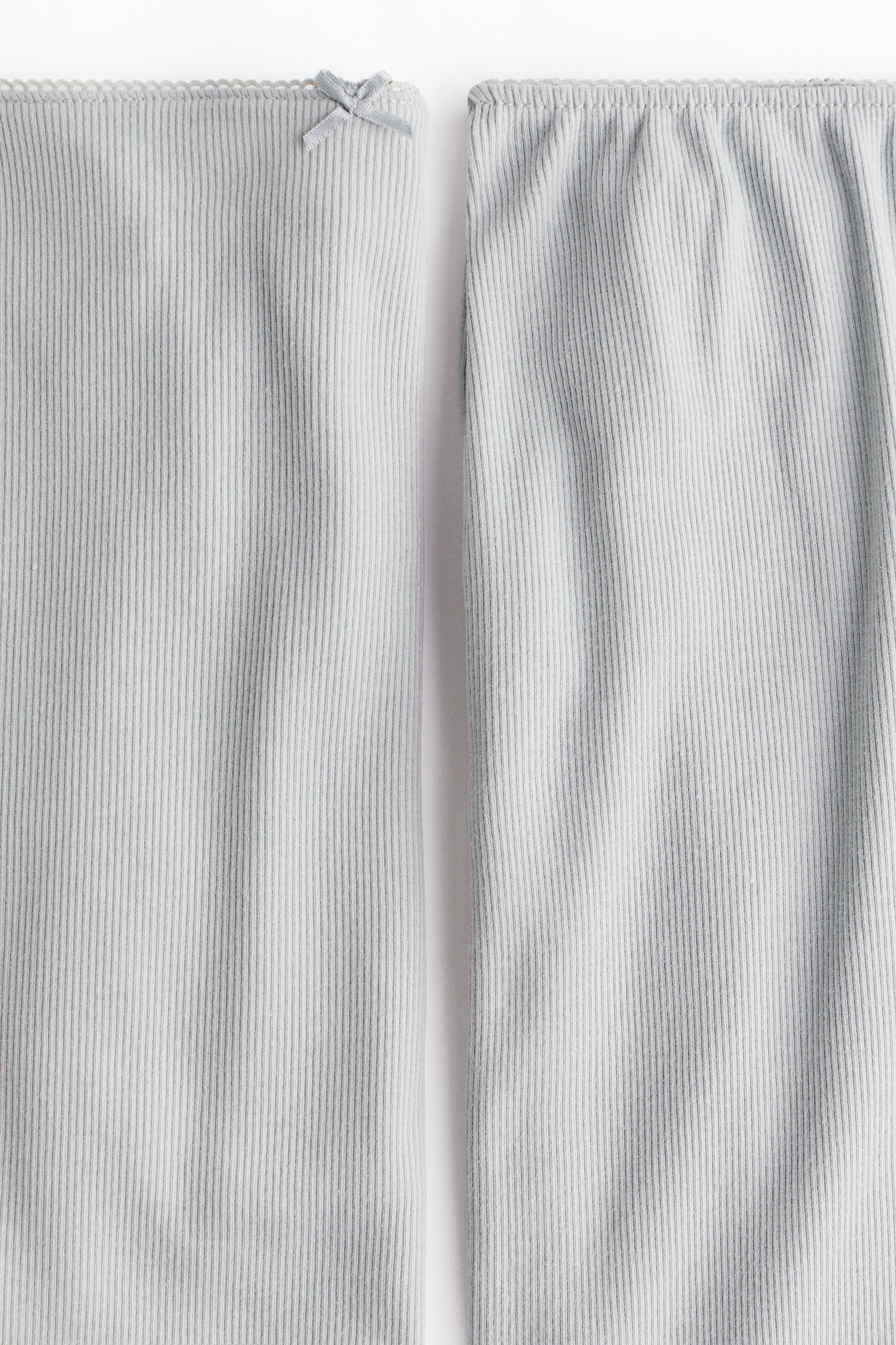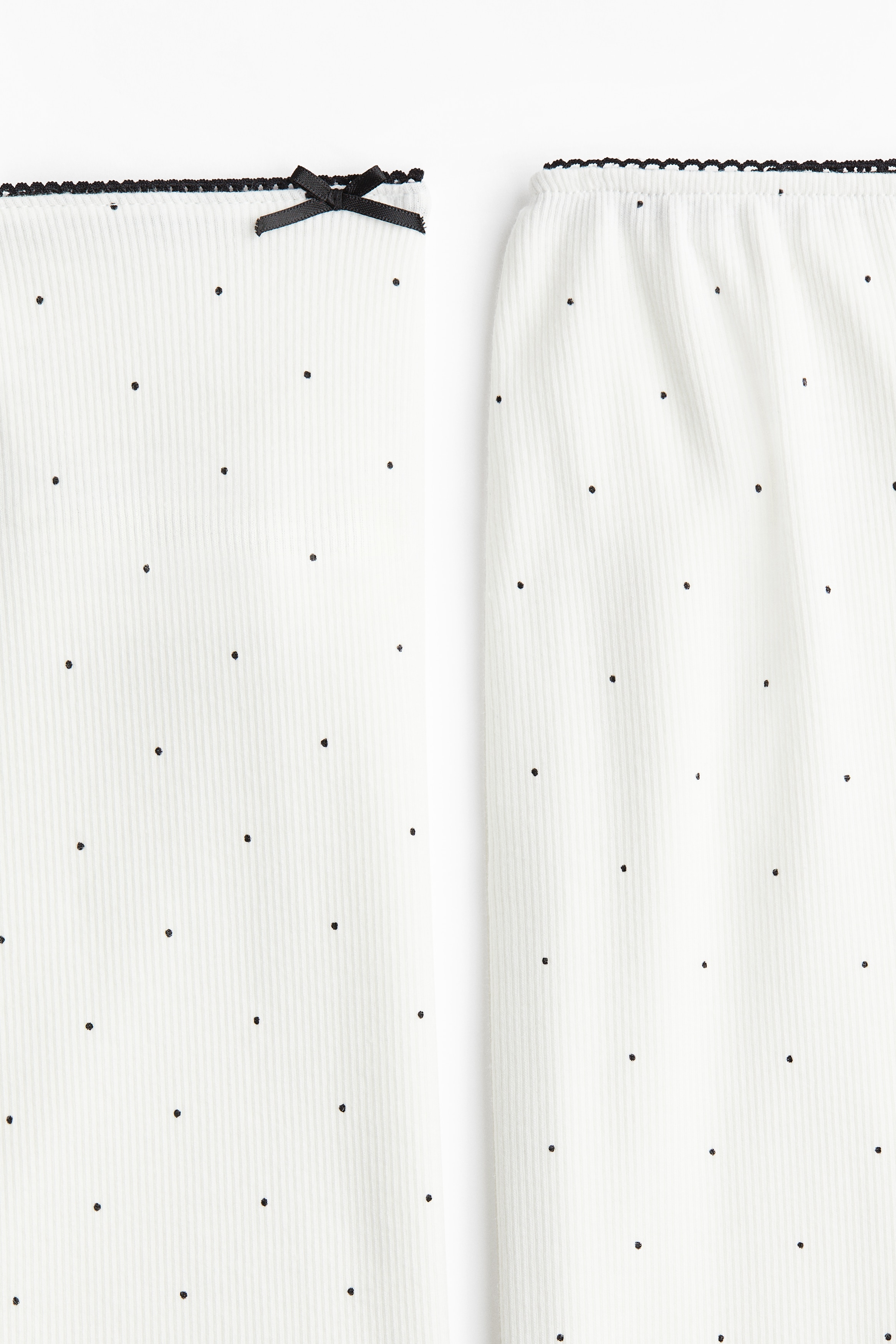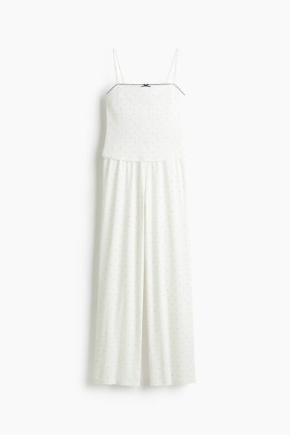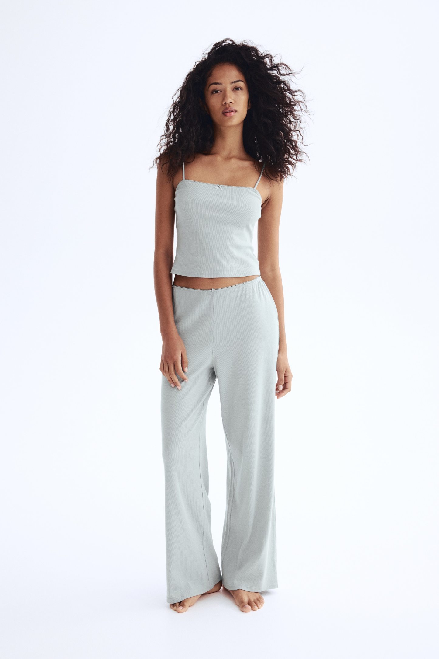 Pyjamas with a strappy top and pair of bottoms in soft, ribbed jersey. Strappy top with a straight, picot-trimmed neckline and a decorative satin bow at the front. Bottoms with covered elastication and a picot trim at the waist and straight legs.