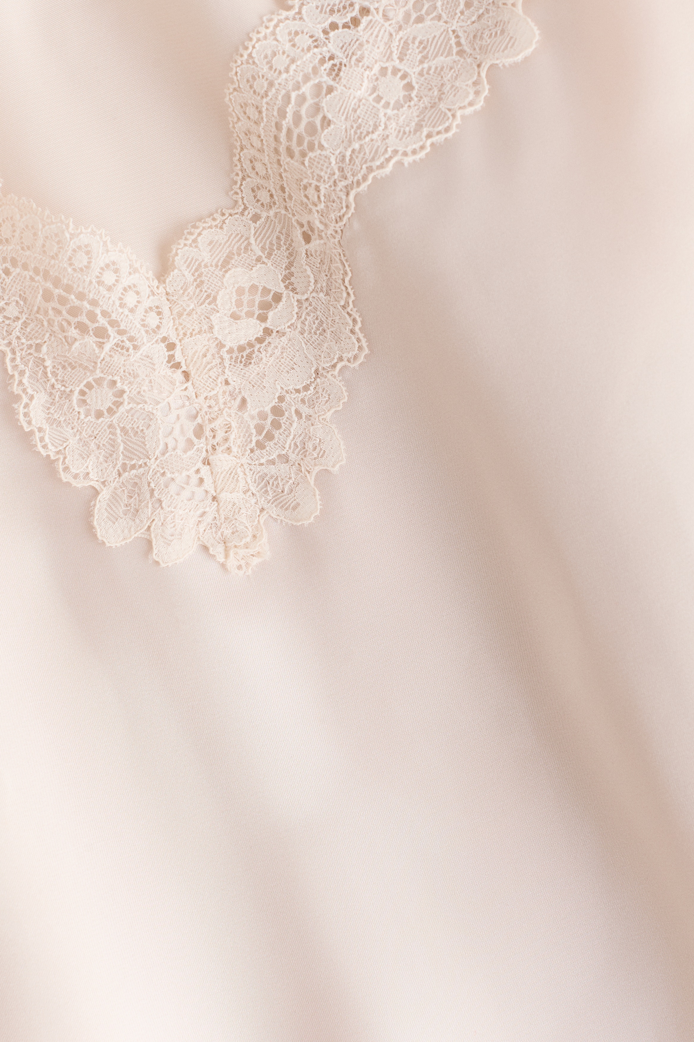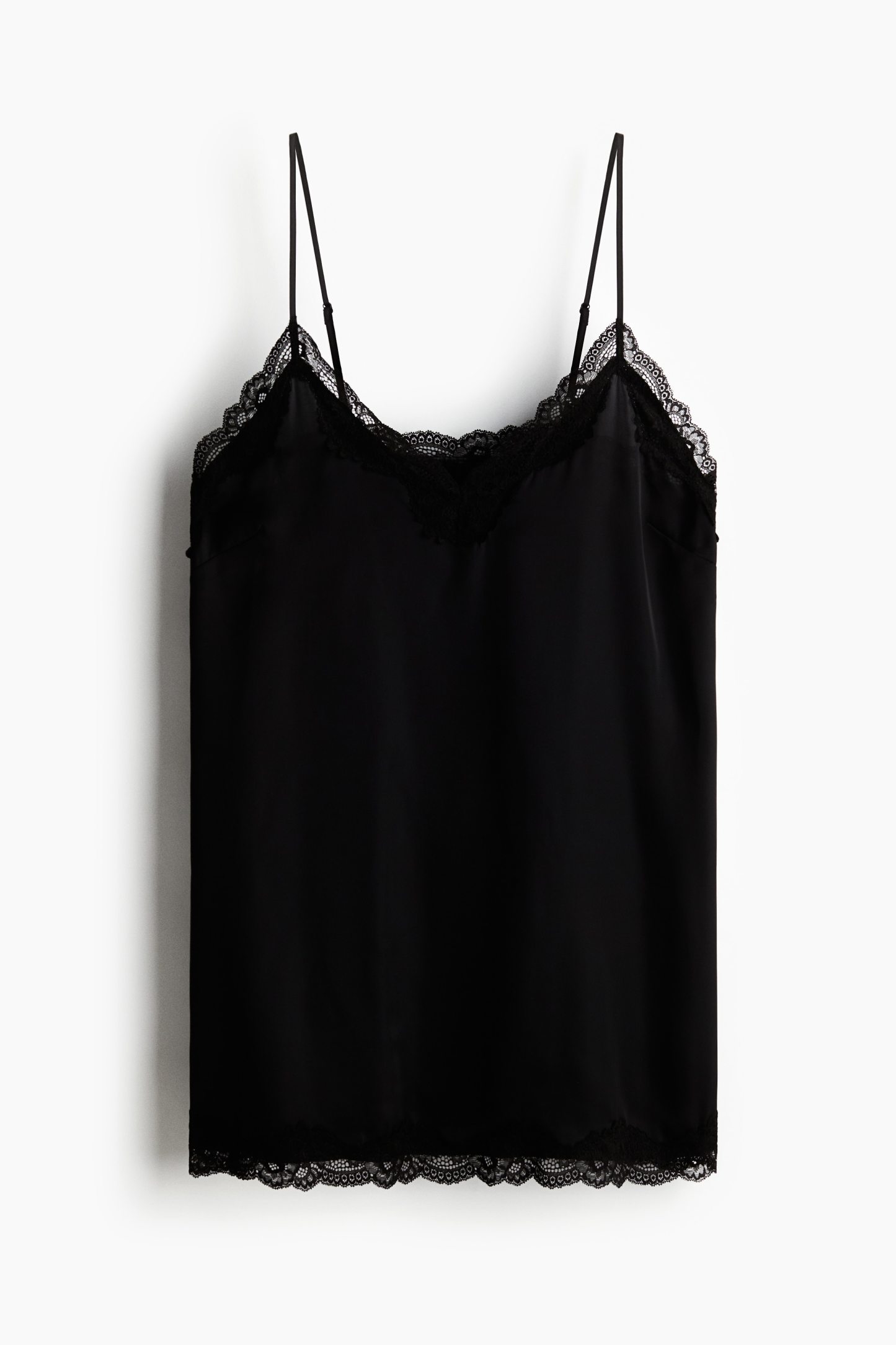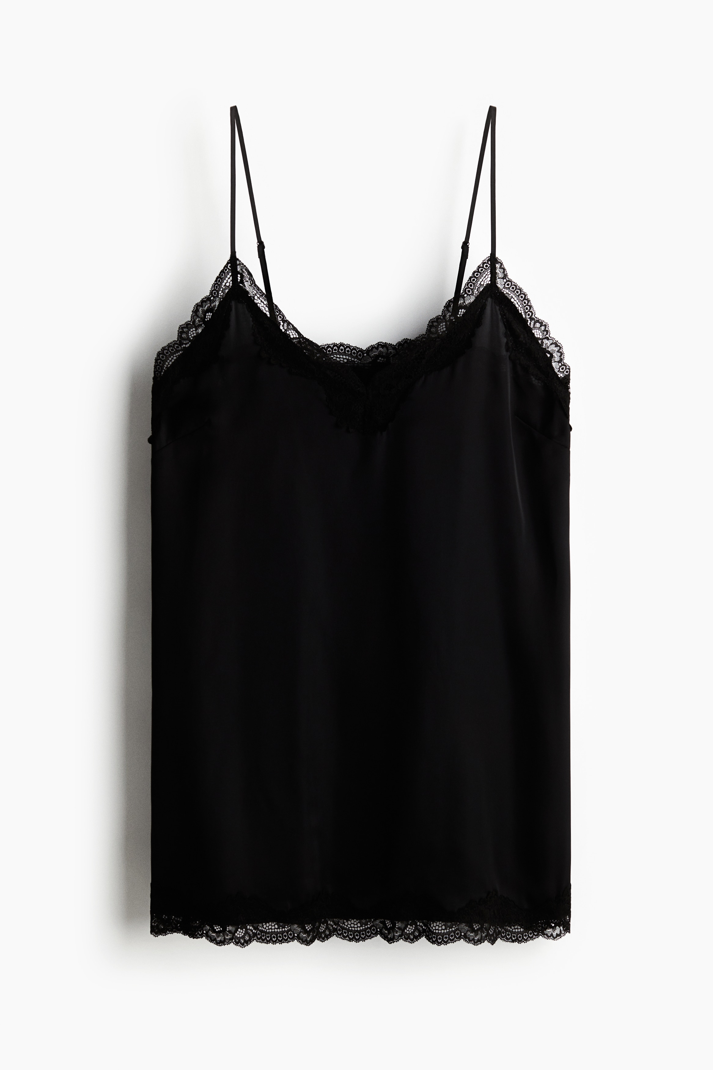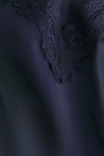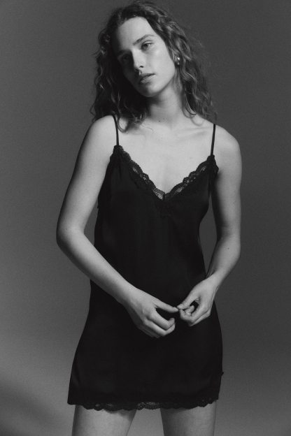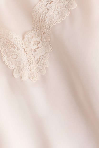 Short nightslip in softly draping satin with delicate lace trims at the top and hem. Adjustable spaghetti shoulder straps and a deep, V-shaped neckline.