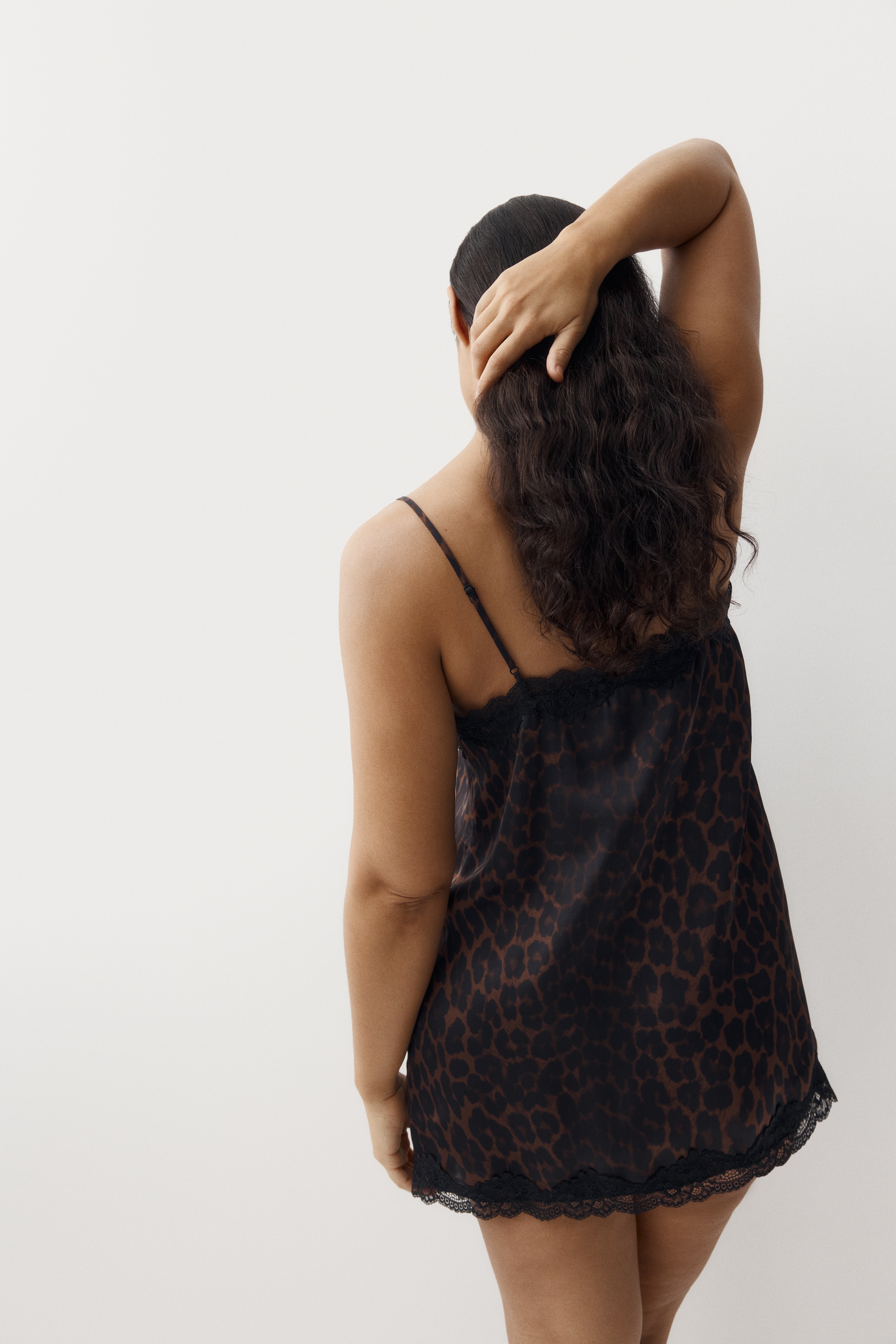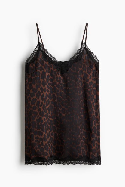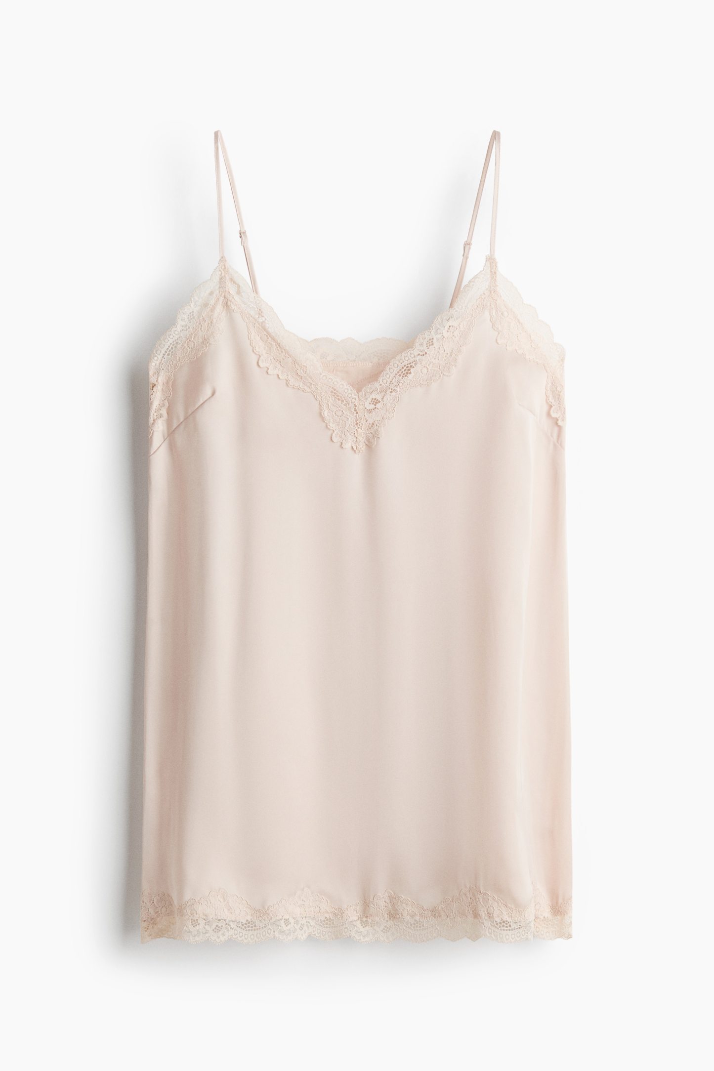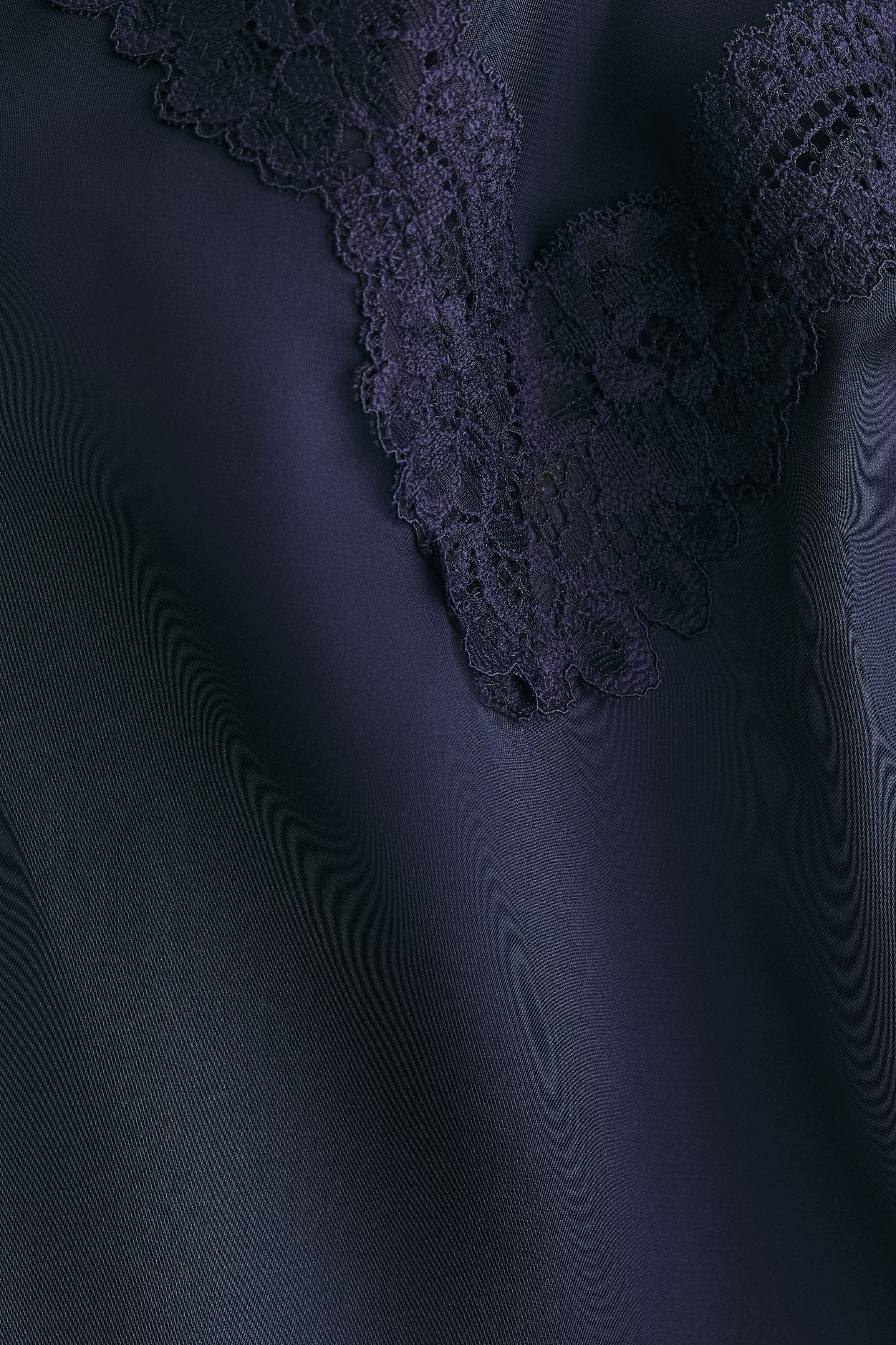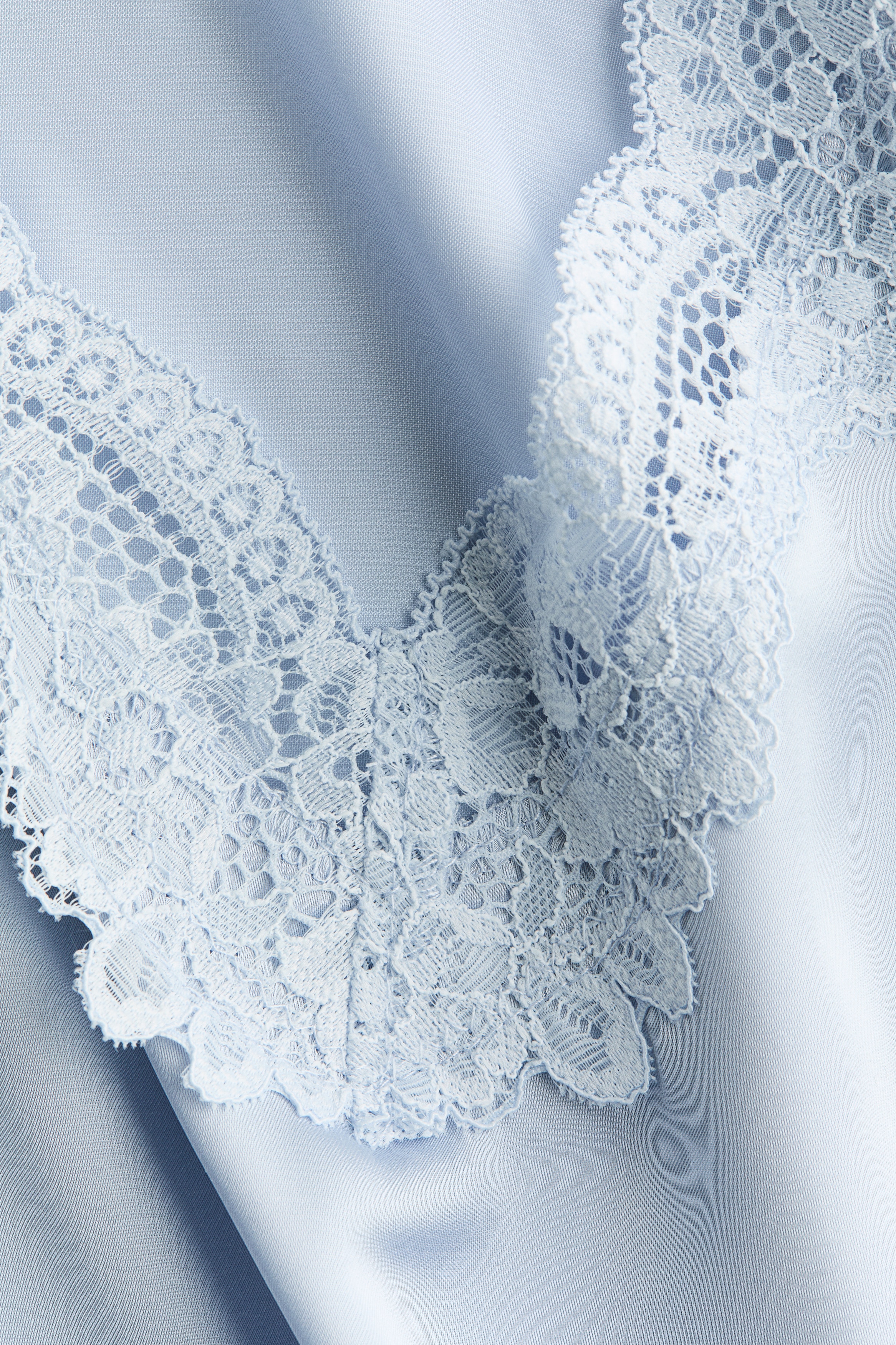 Short nightslip in softly draping satin with delicate lace trims at the top and hem. Adjustable spaghetti shoulder straps and a deep, V-shaped neckline.