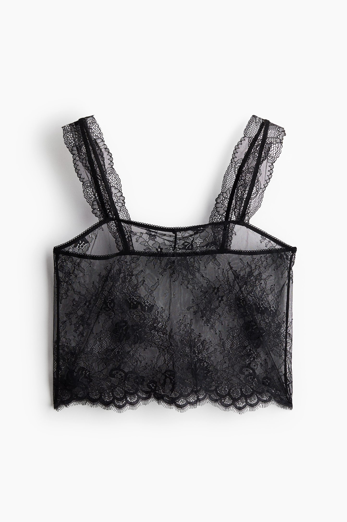 Cropped top in sheer lace with a straight neckline, wide, scalloped shoulder straps and a scalloped hem.