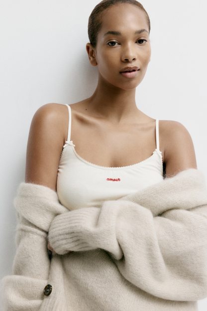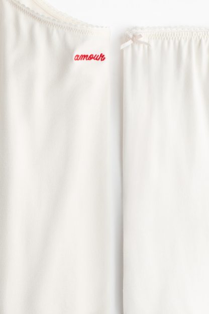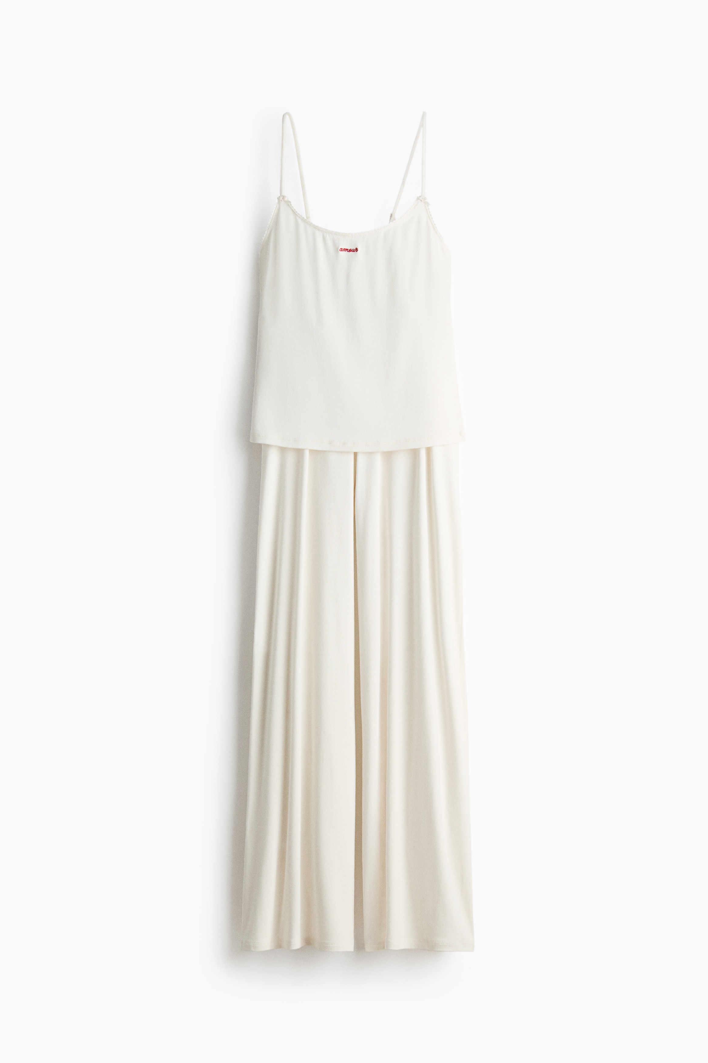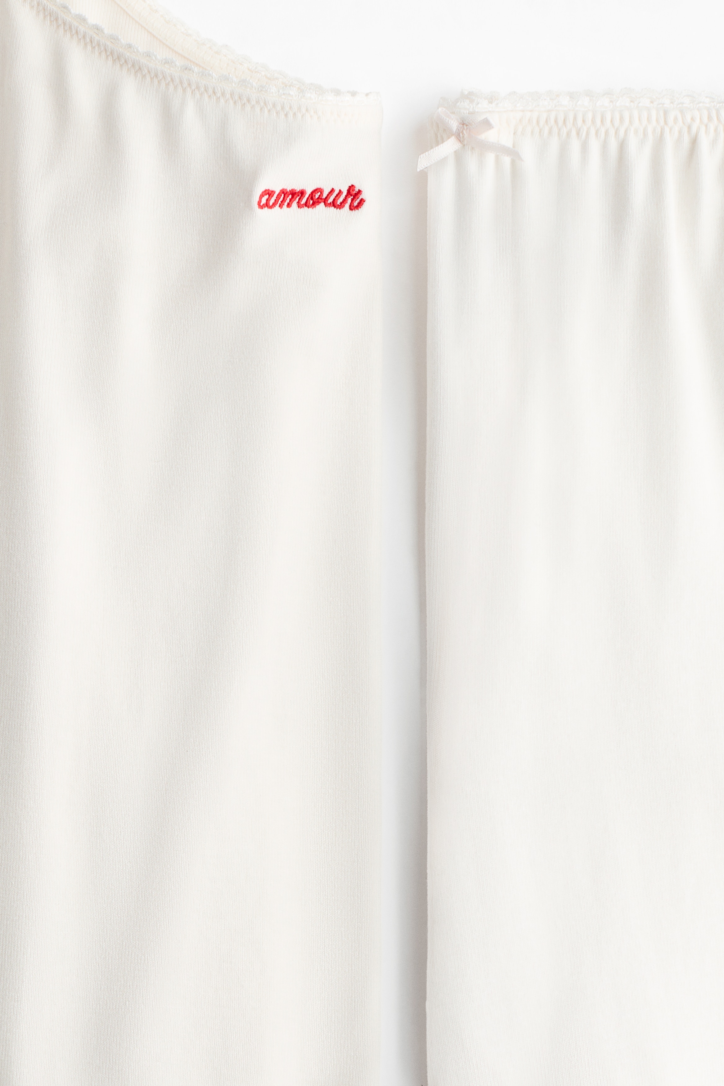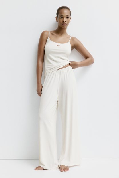 Pyjamas with a strappy top and pair of trousers in soft viscose jersey. Top featuring a deep, round neckline and narrow, adjustable shoulder straps with small satin bows at the front. Delicate picot trim around the top and a small, embroidered motif on the front. Trousers featuring a picot-trimmed, elasticated waist with a small satin bow at the front, and wide legs.
