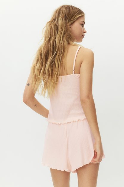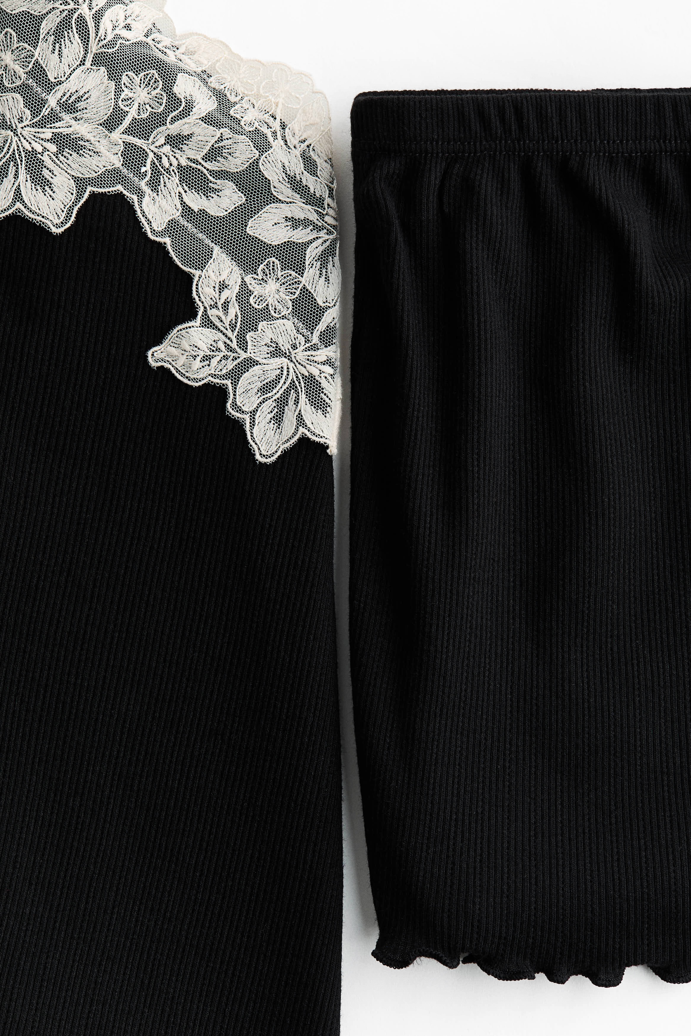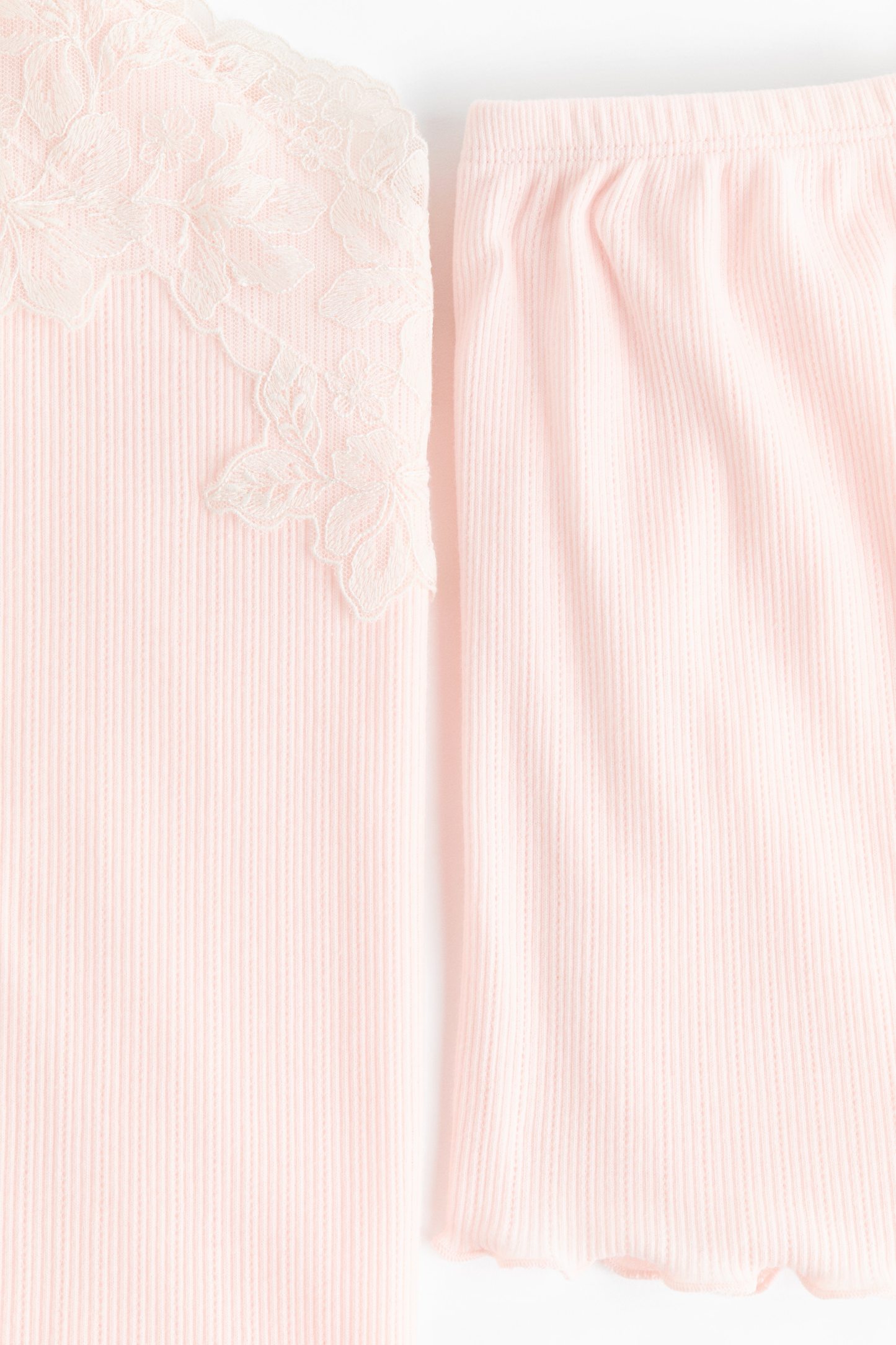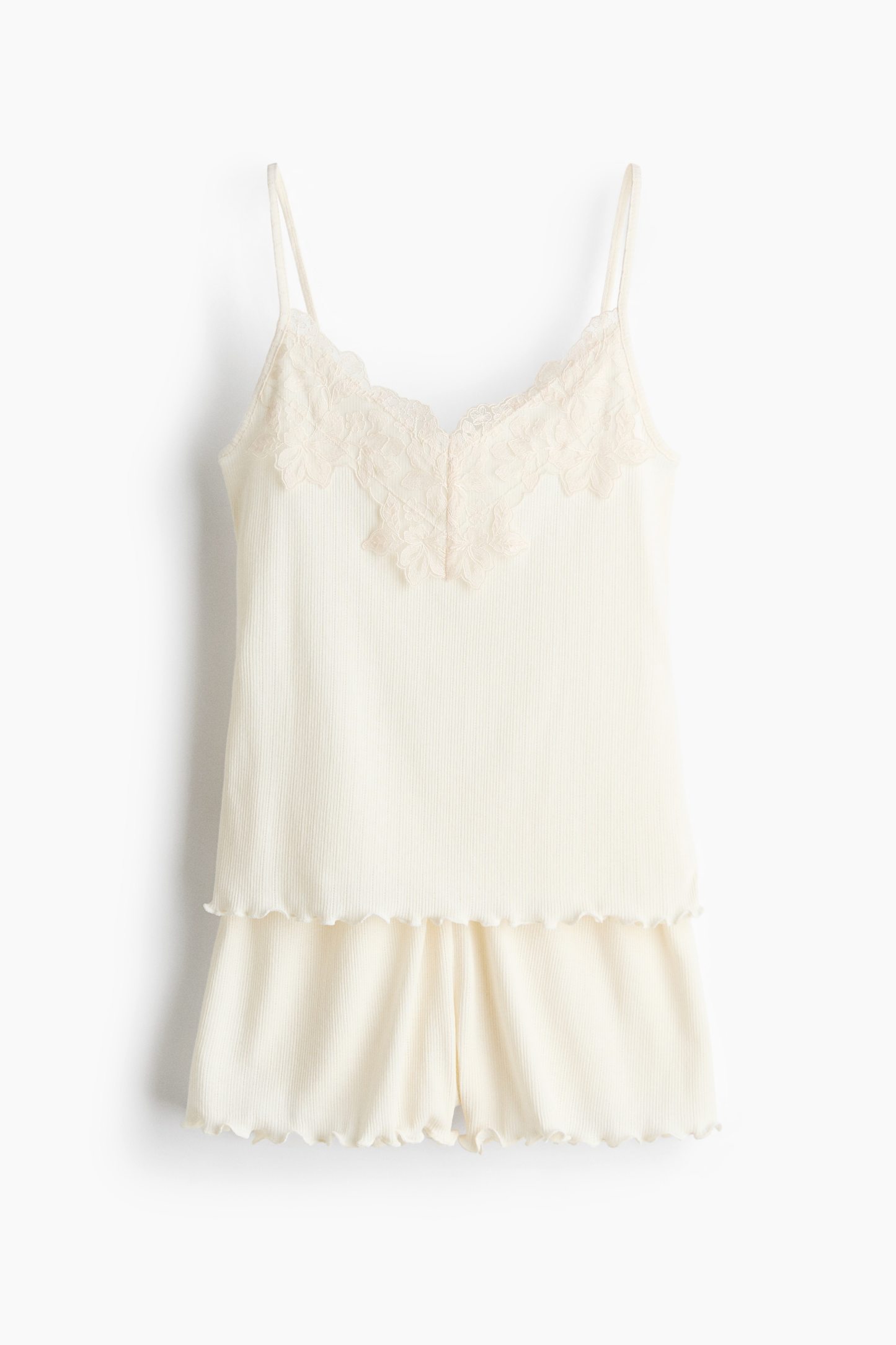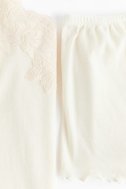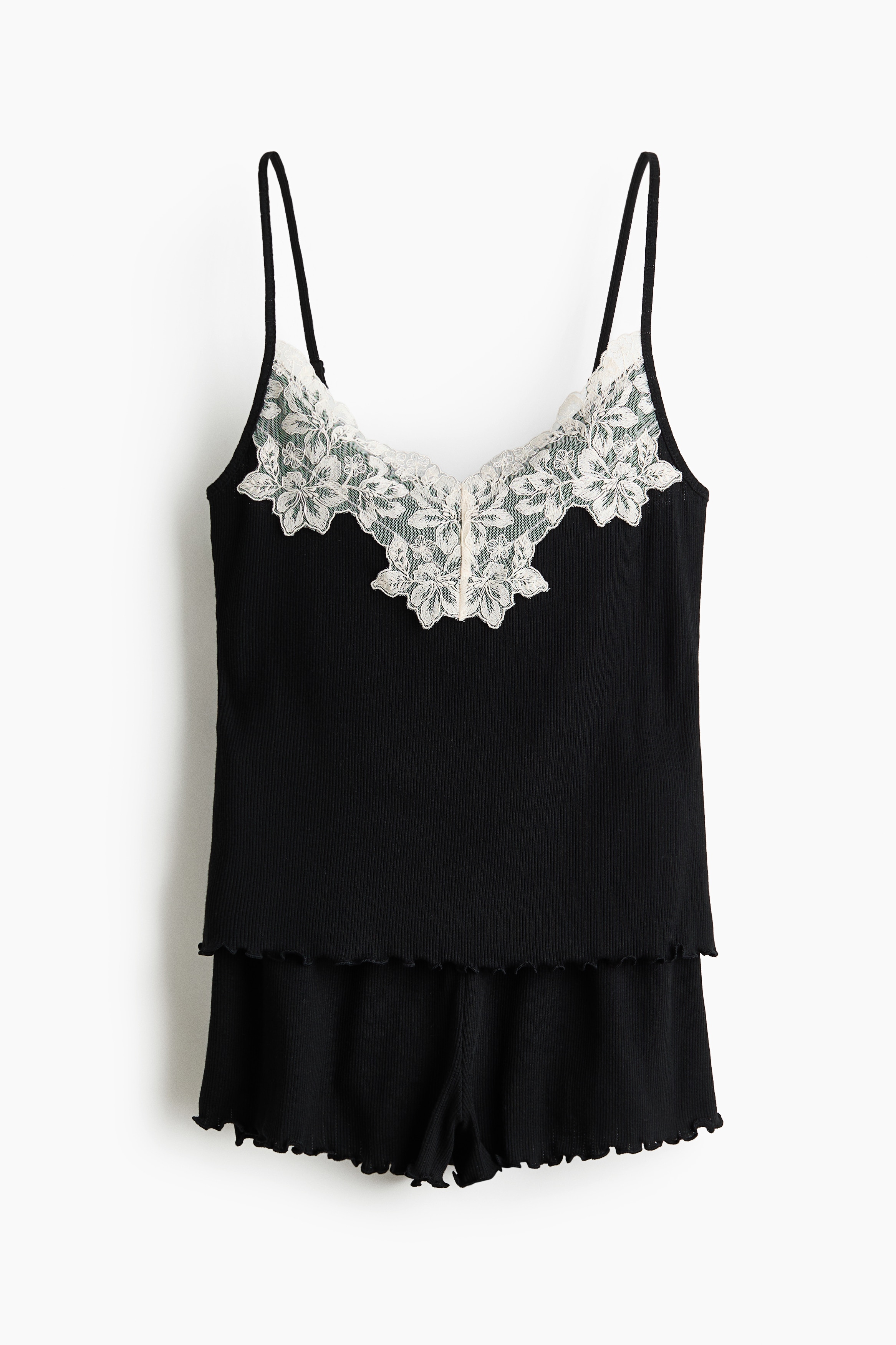 Pyjamas with a top and pair of shorts in soft, ribbed jersey. Top with a lace-trimmed V-neckline, narrow, adjustable shoulder straps and an overlocked hem. Shorts with covered elastication at the waist and overlocked hems.
