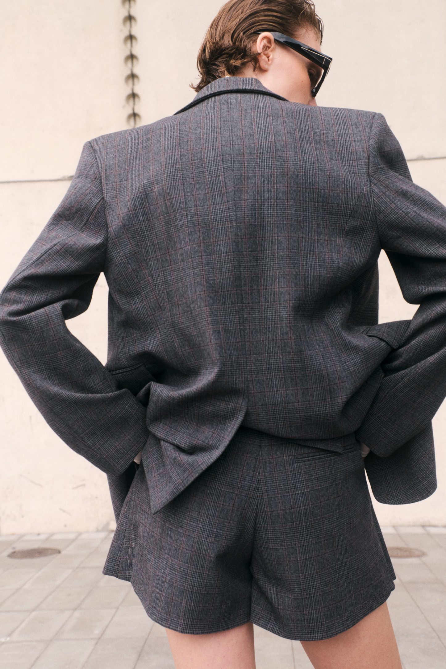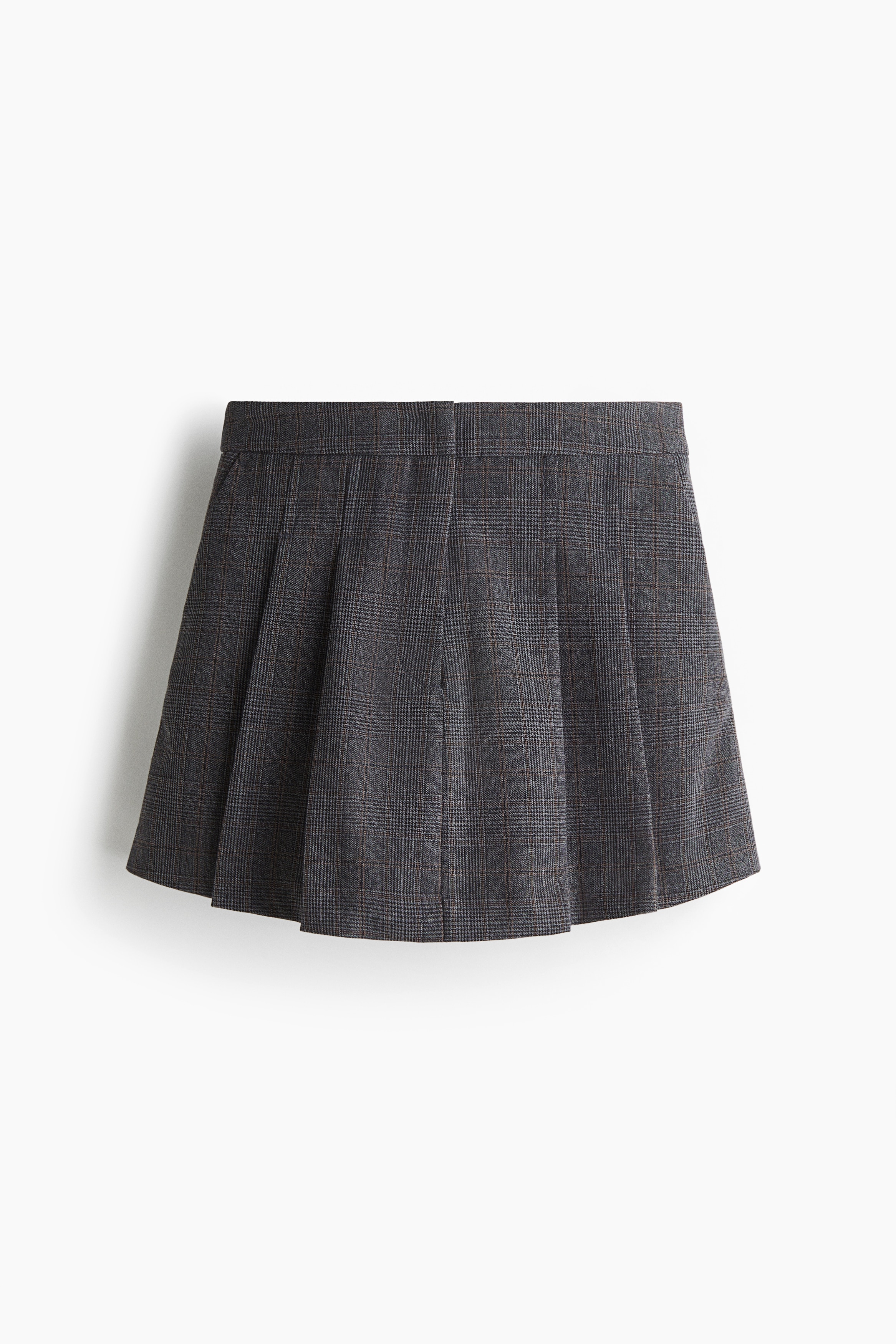 Short skort in woven fabric with a pleated front. Features a zip fly with a concealed div and hook-and-bar fastener, diagonal side pockets, jetted back pockets and creases down the back.