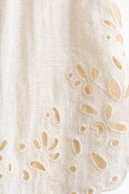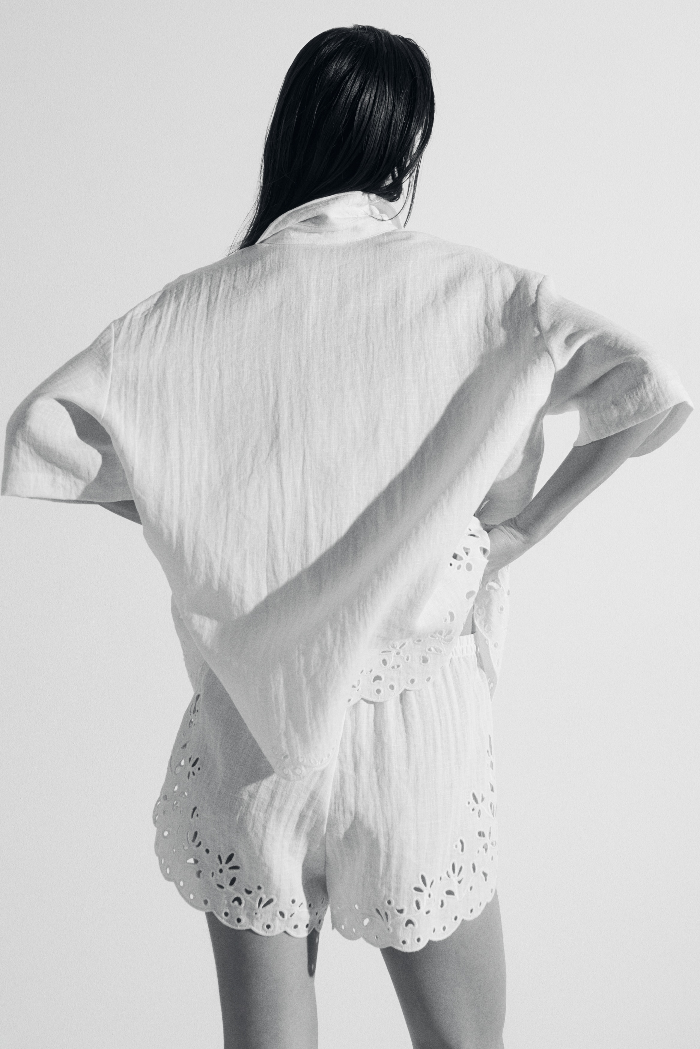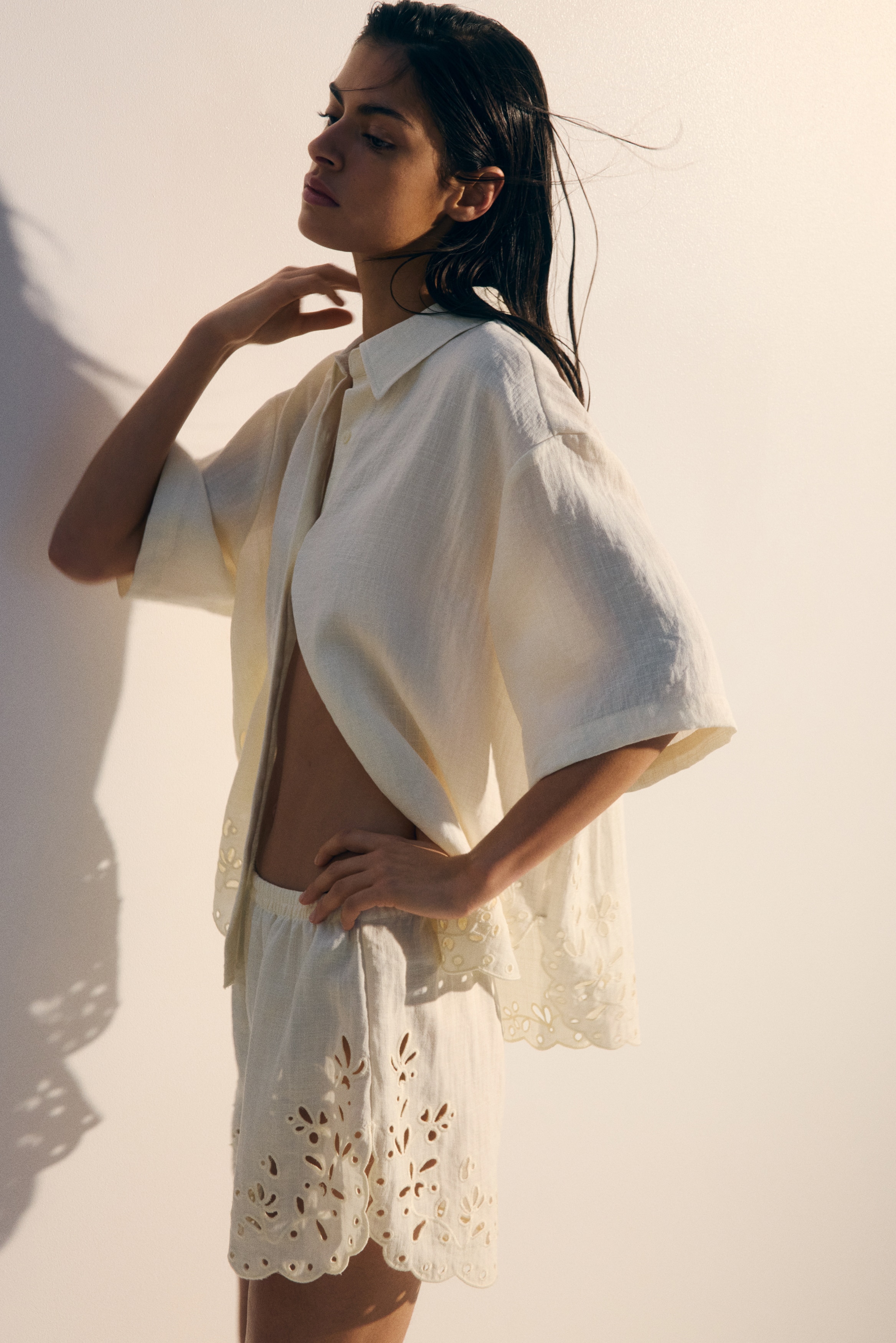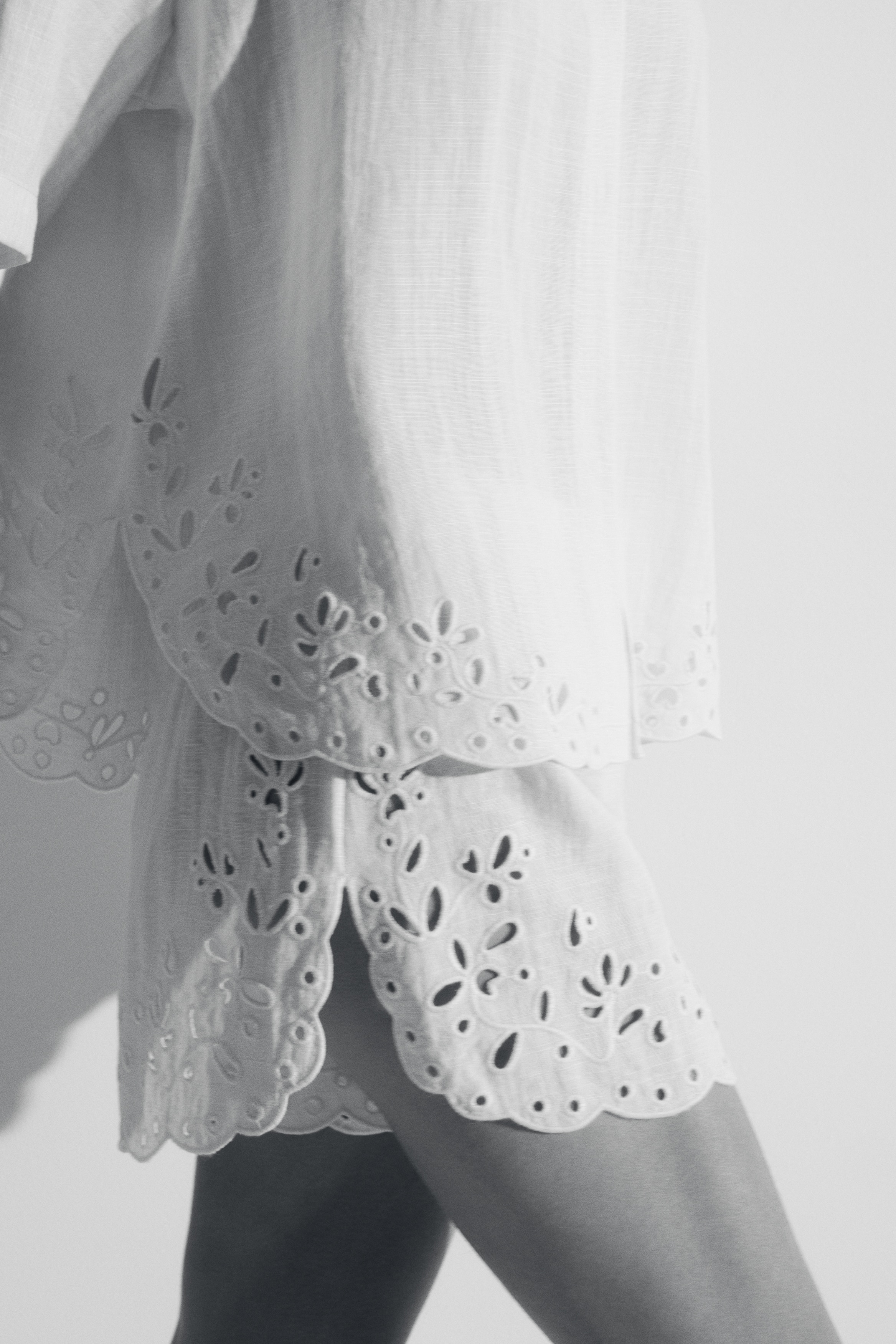Loose-fit shorts in woven fabric detailed with broderie anglaise. Smocked elastication at the waist and gently curved hems with a slit.