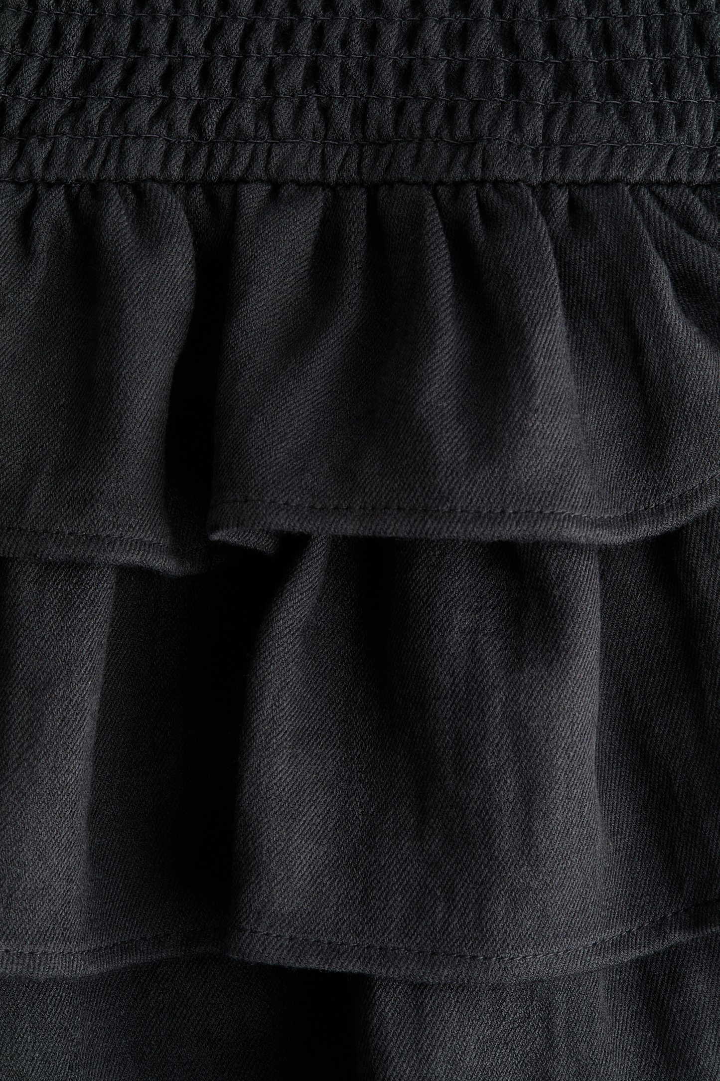 Short, loose-fit skort in twill made from a viscose blend. Features wide, elasticated smocking at the waist and flounced tiers. Jersey lining.