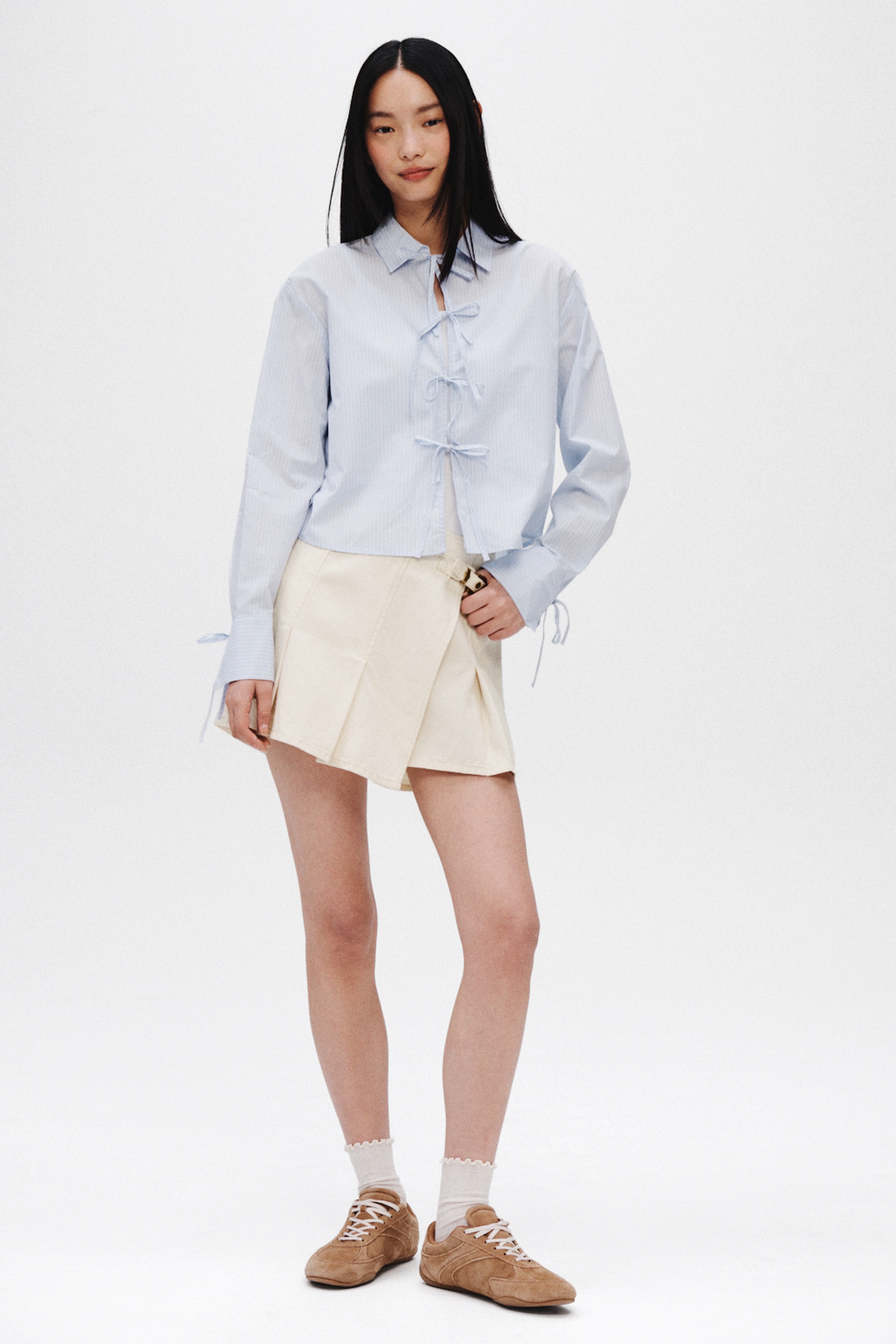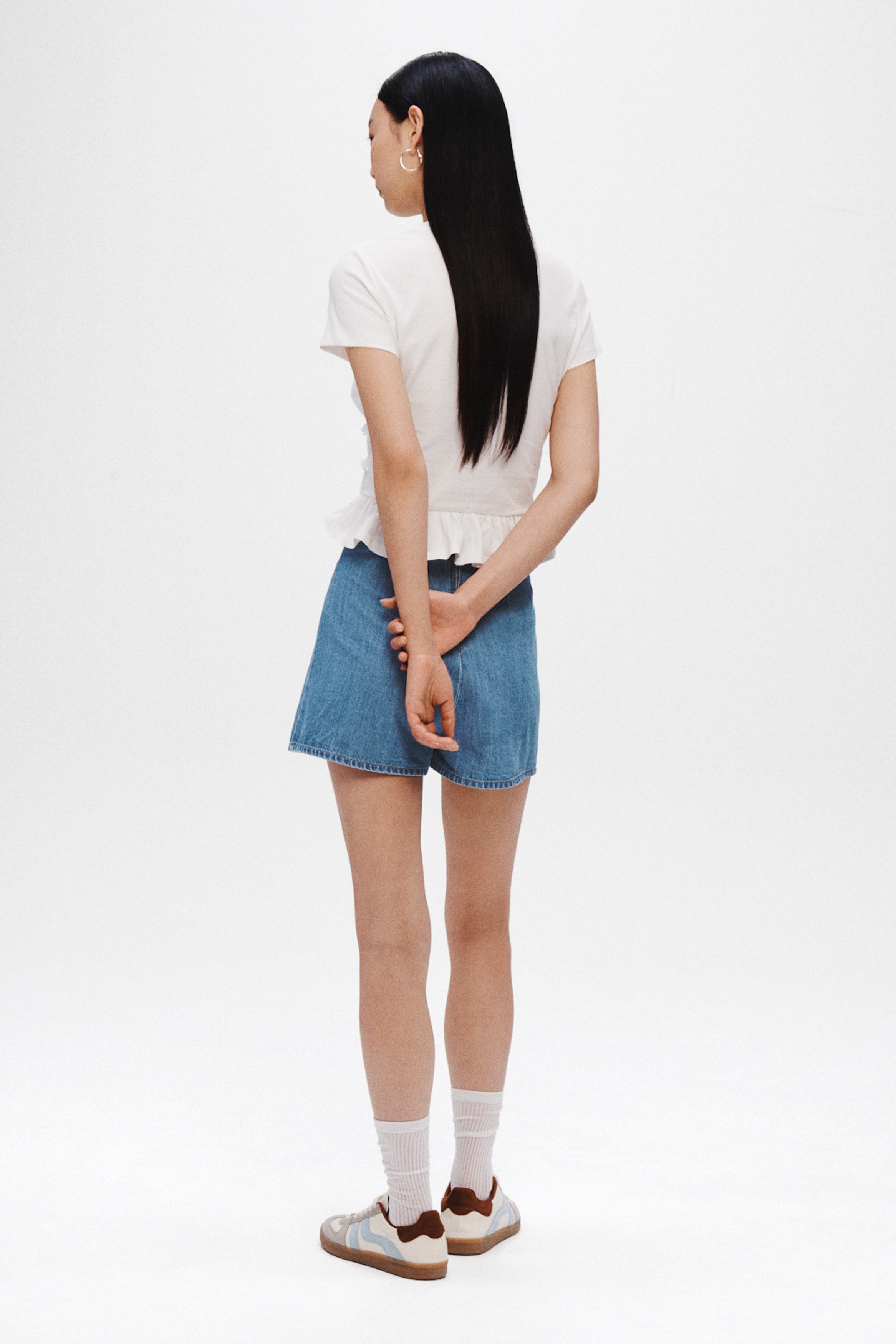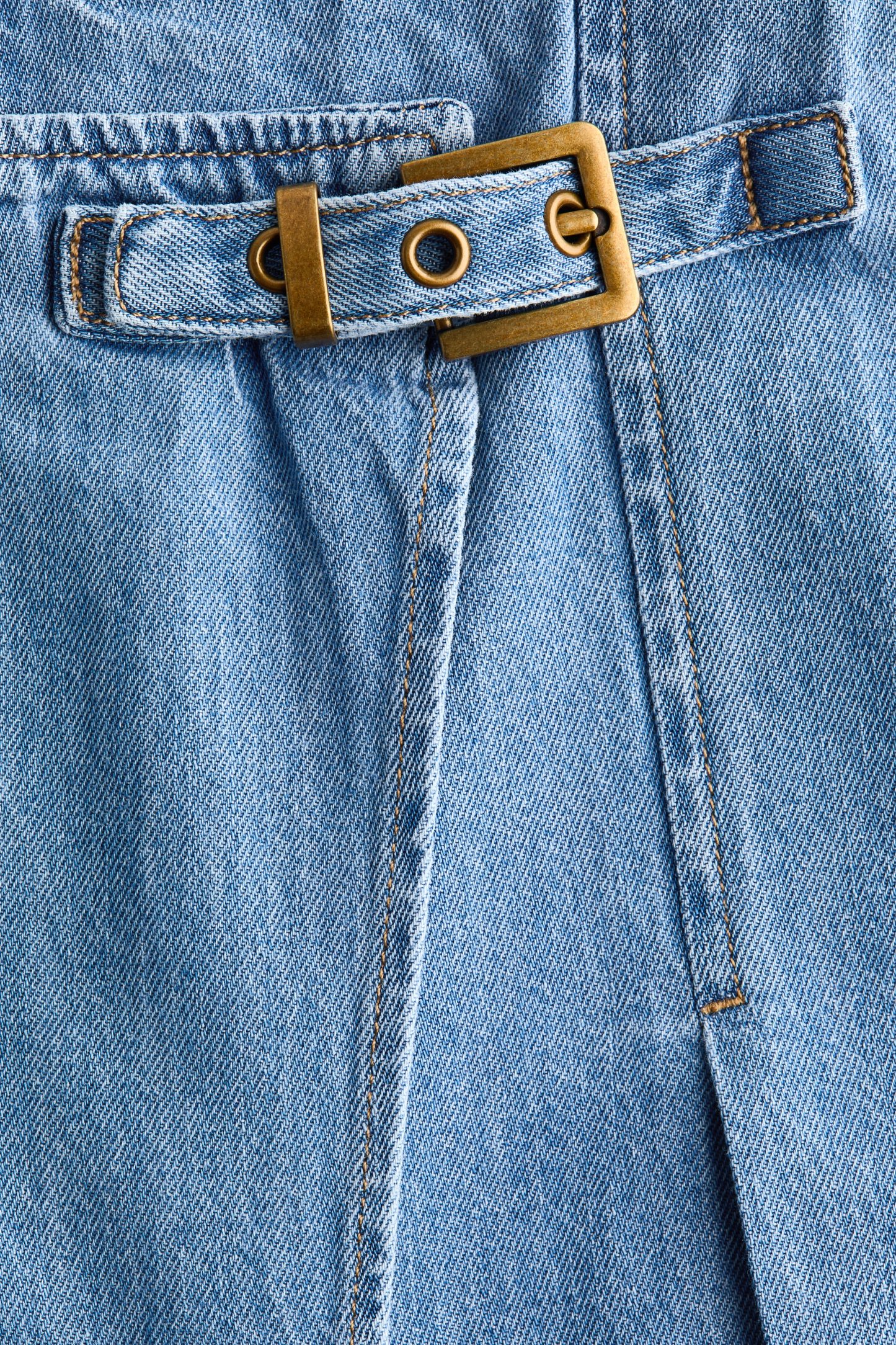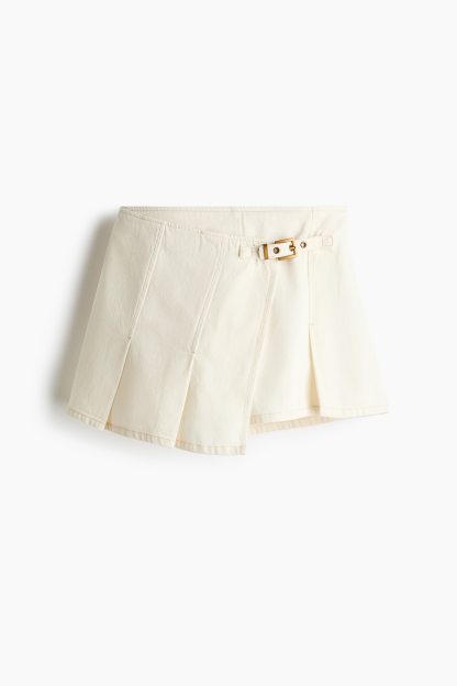 Short skort in rigid denim made from a cotton and lyocell blend. Features a zip at the back, an asymmetric wrapover front with a belt detail at one side, and pleats at the hem.