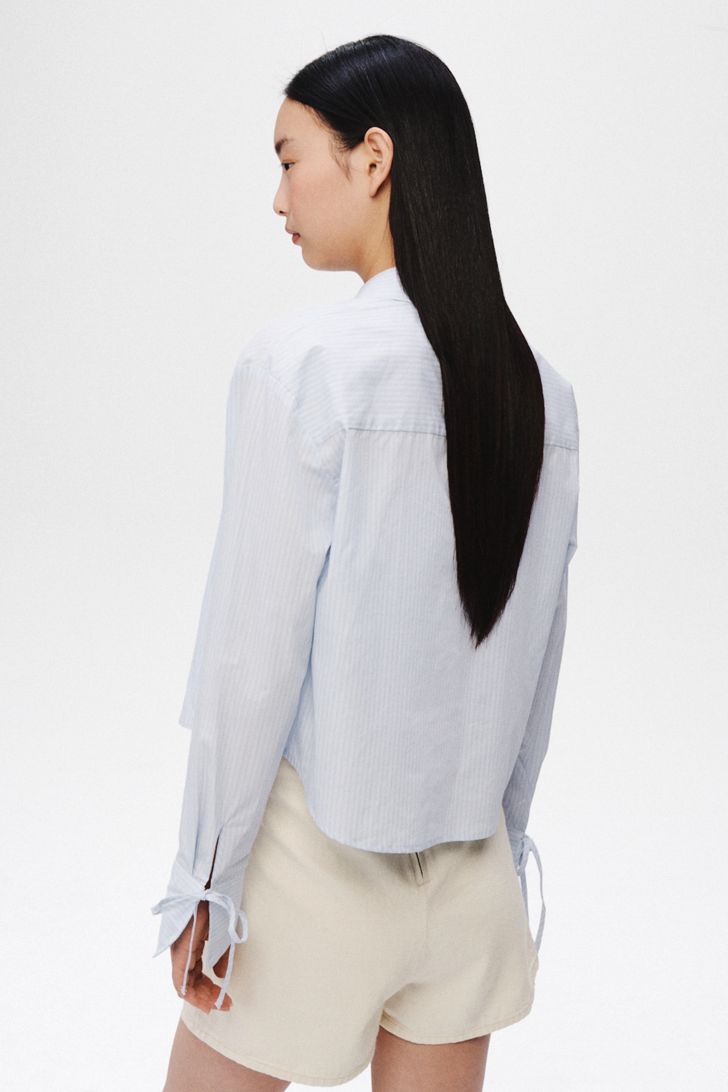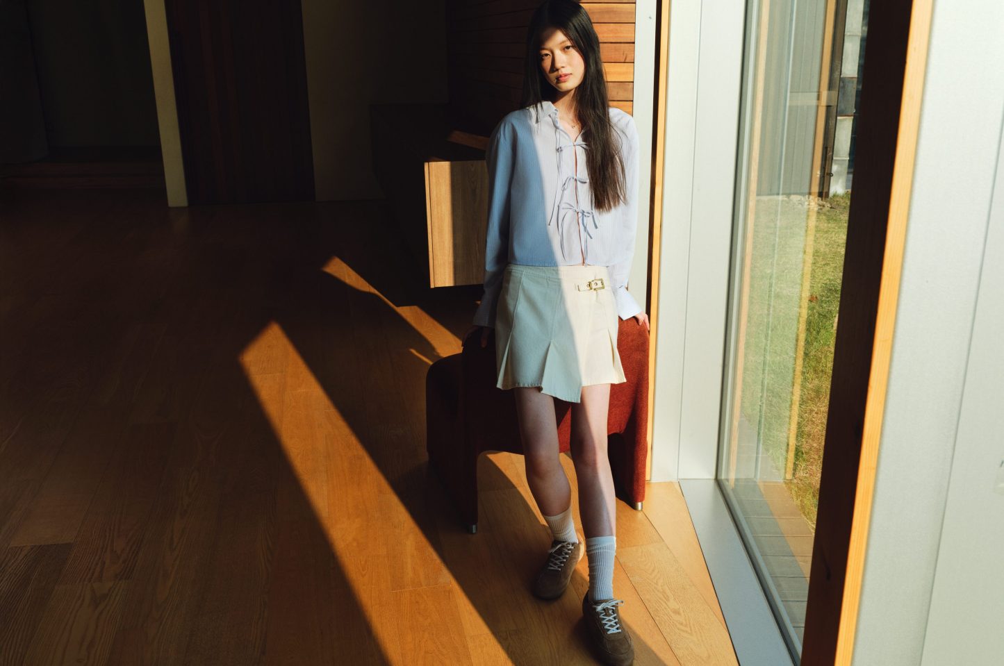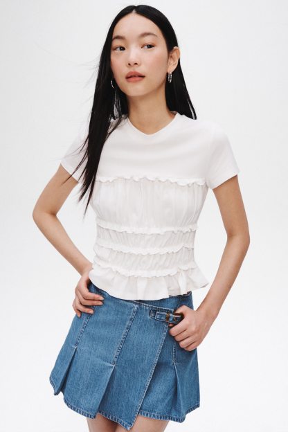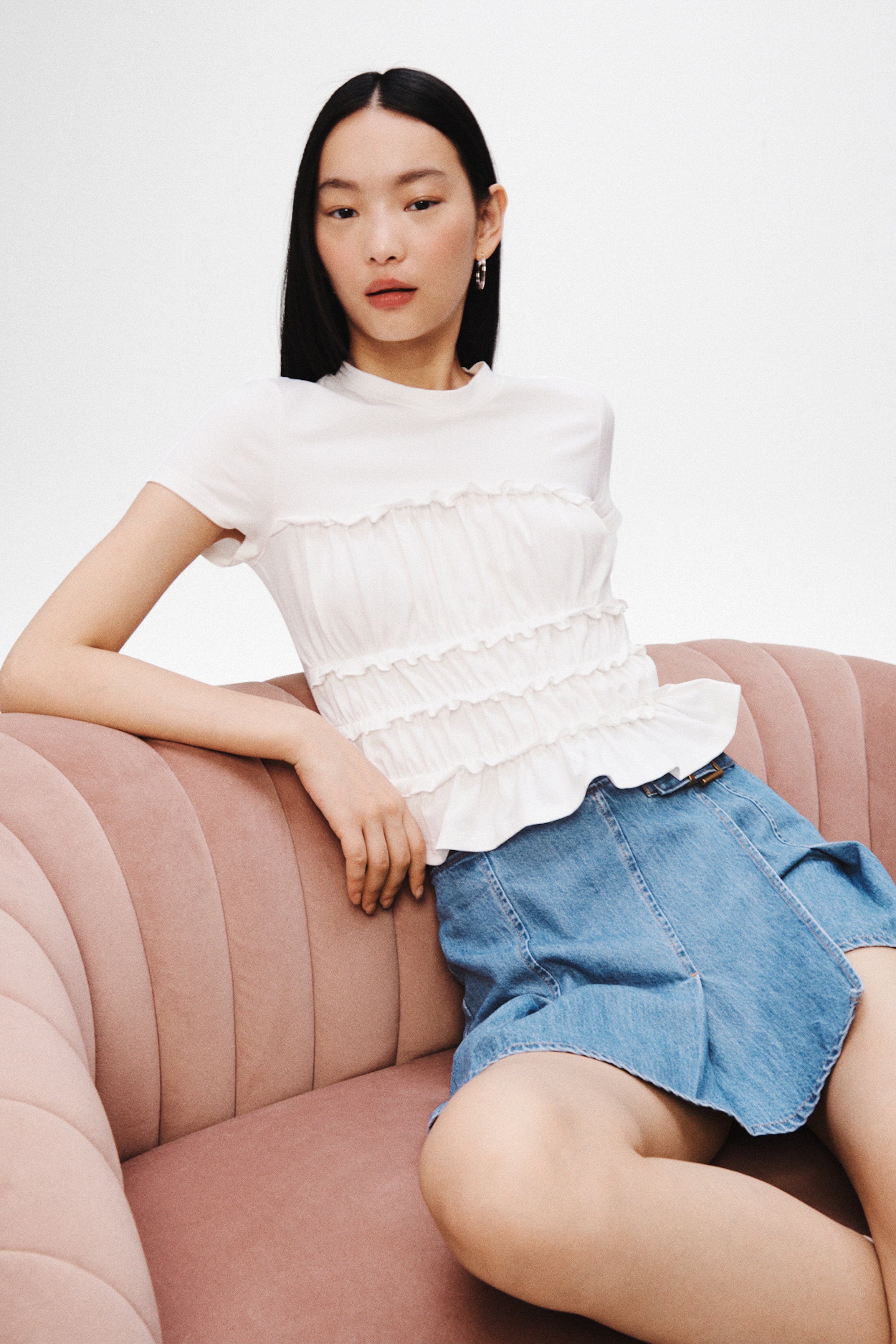 Short skort in rigid denim made from a cotton and lyocell blend. Features a zip at the back, an asymmetric wrapover front with a belt detail at one side, and pleats at the hem.