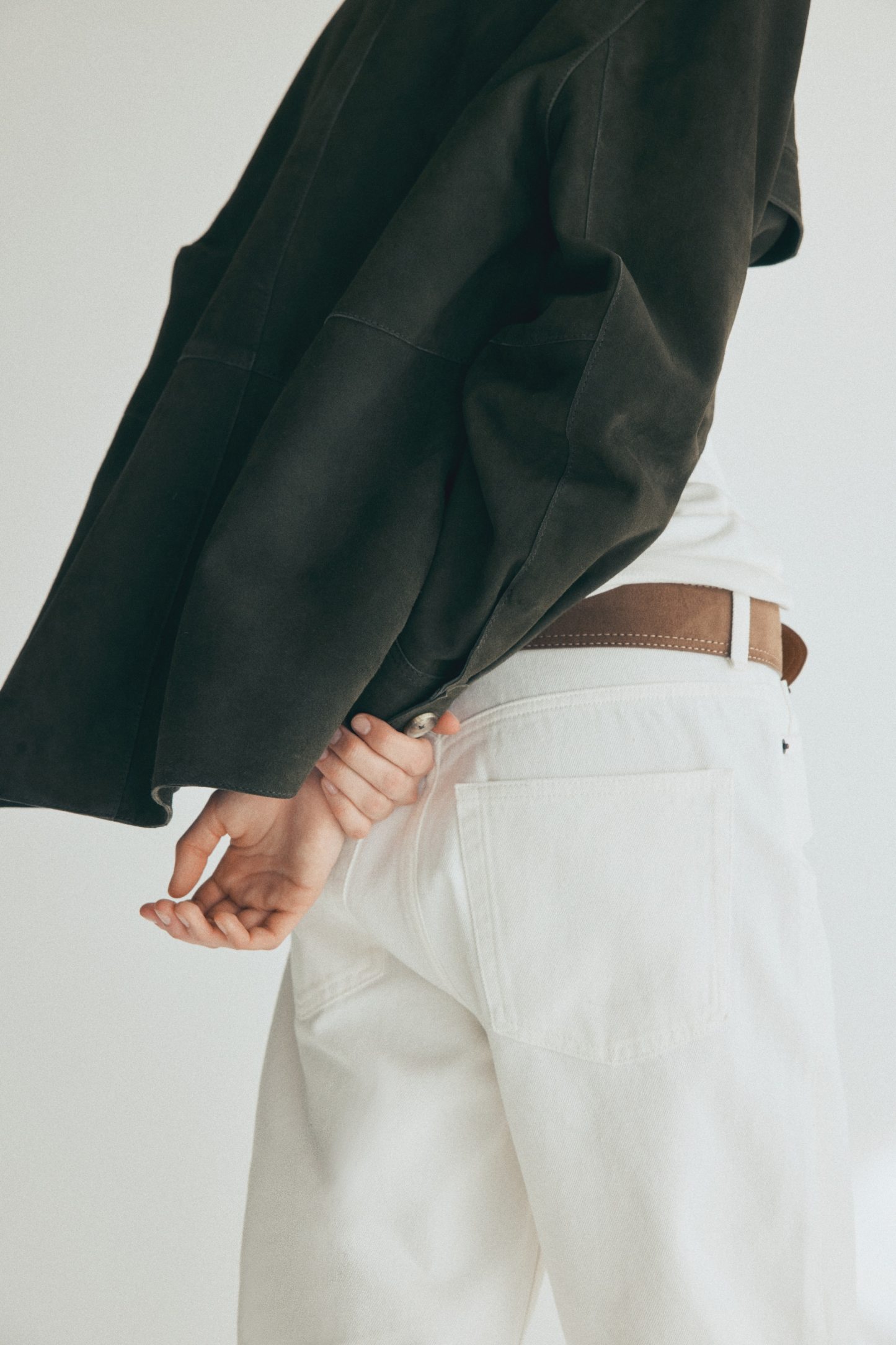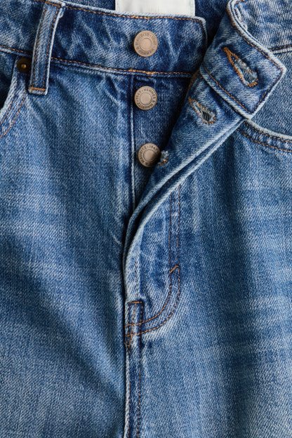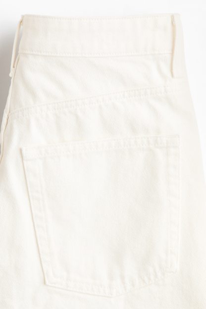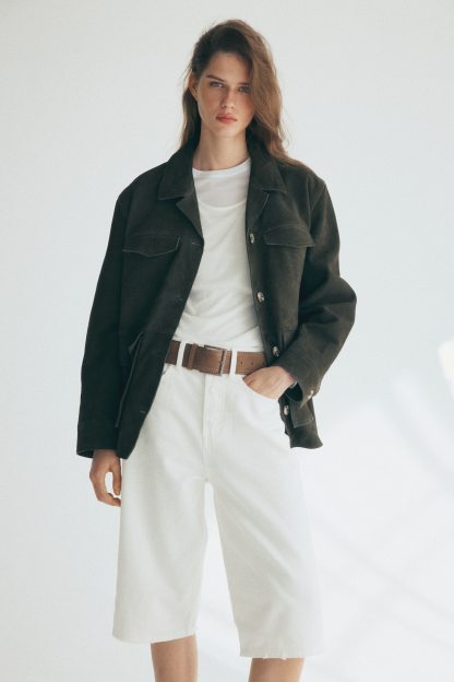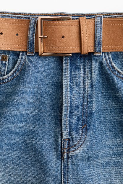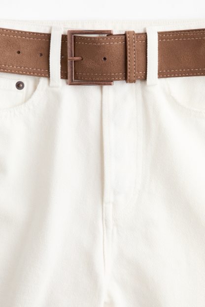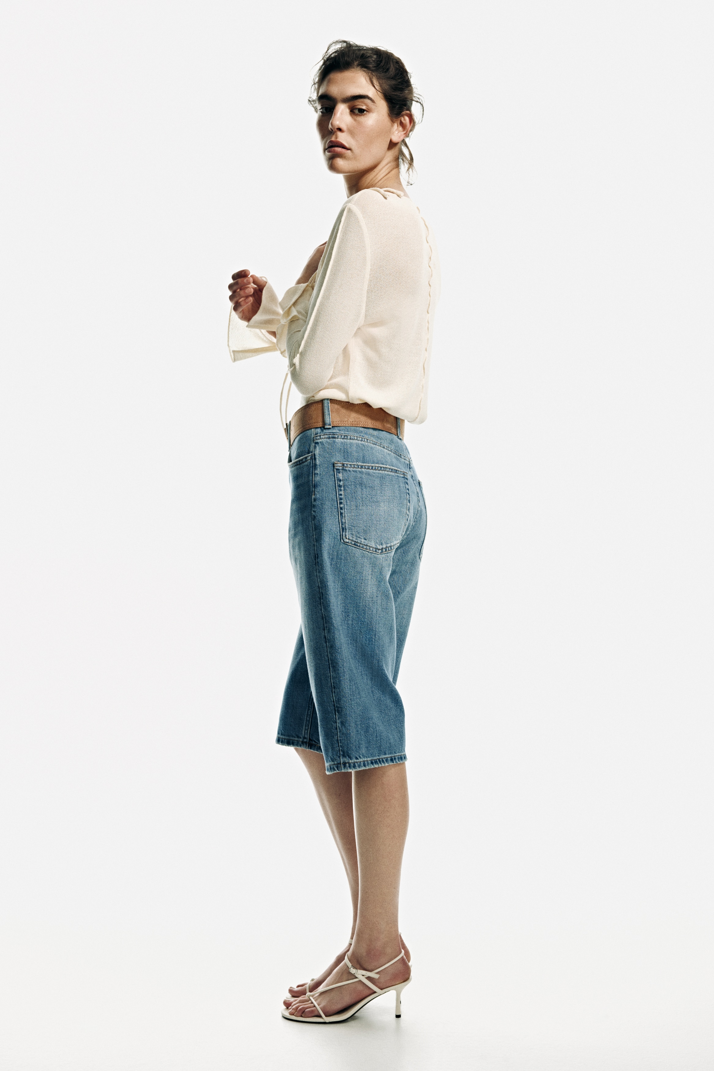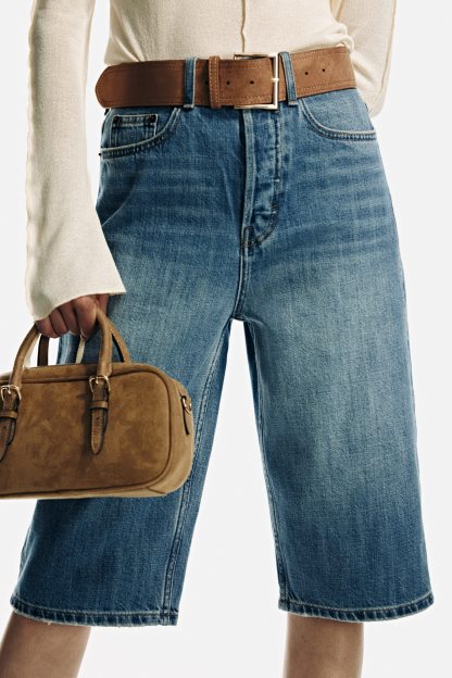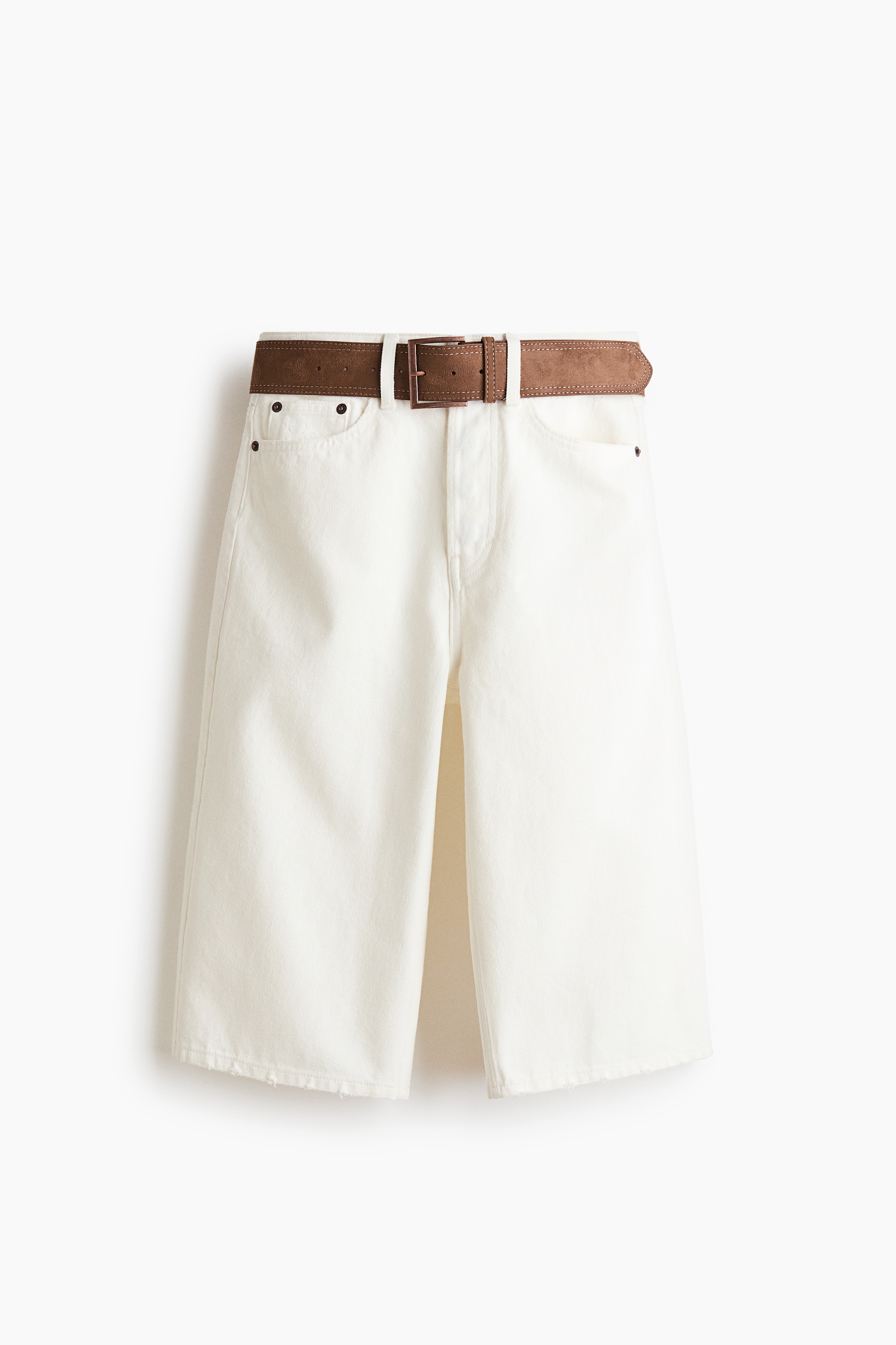 Knee-length, 5-pocket shorts in rigid cotton denim featuring a high waist with a div fly and a wide belt in napped fabric with a metal buckle.