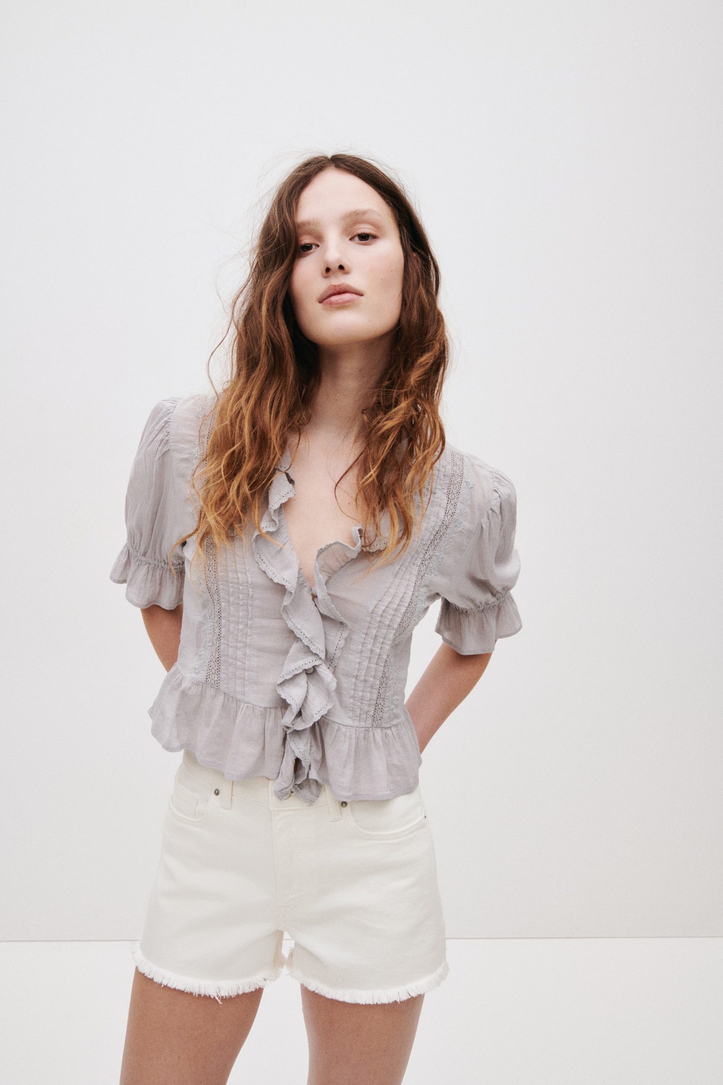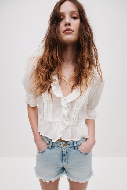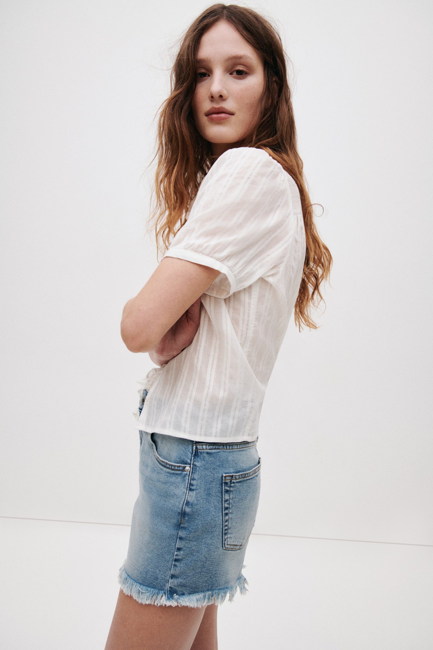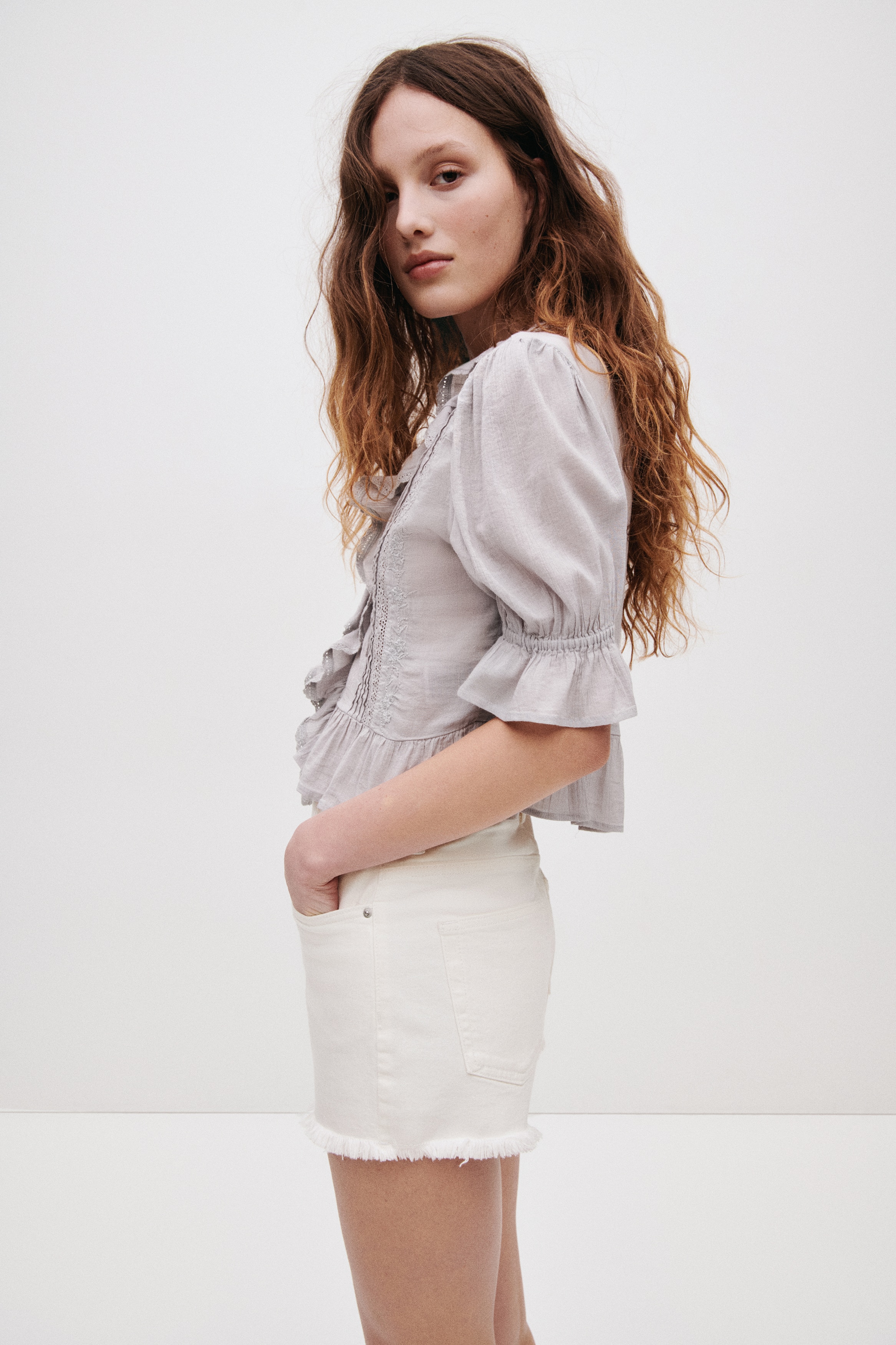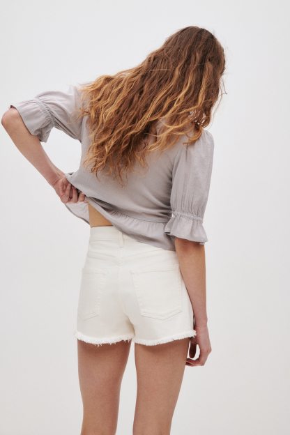 5-pocket shorts in cotton denim with a slight stretch for good comfort. High waist with a zip fly and div and a frayed edge at the hems.