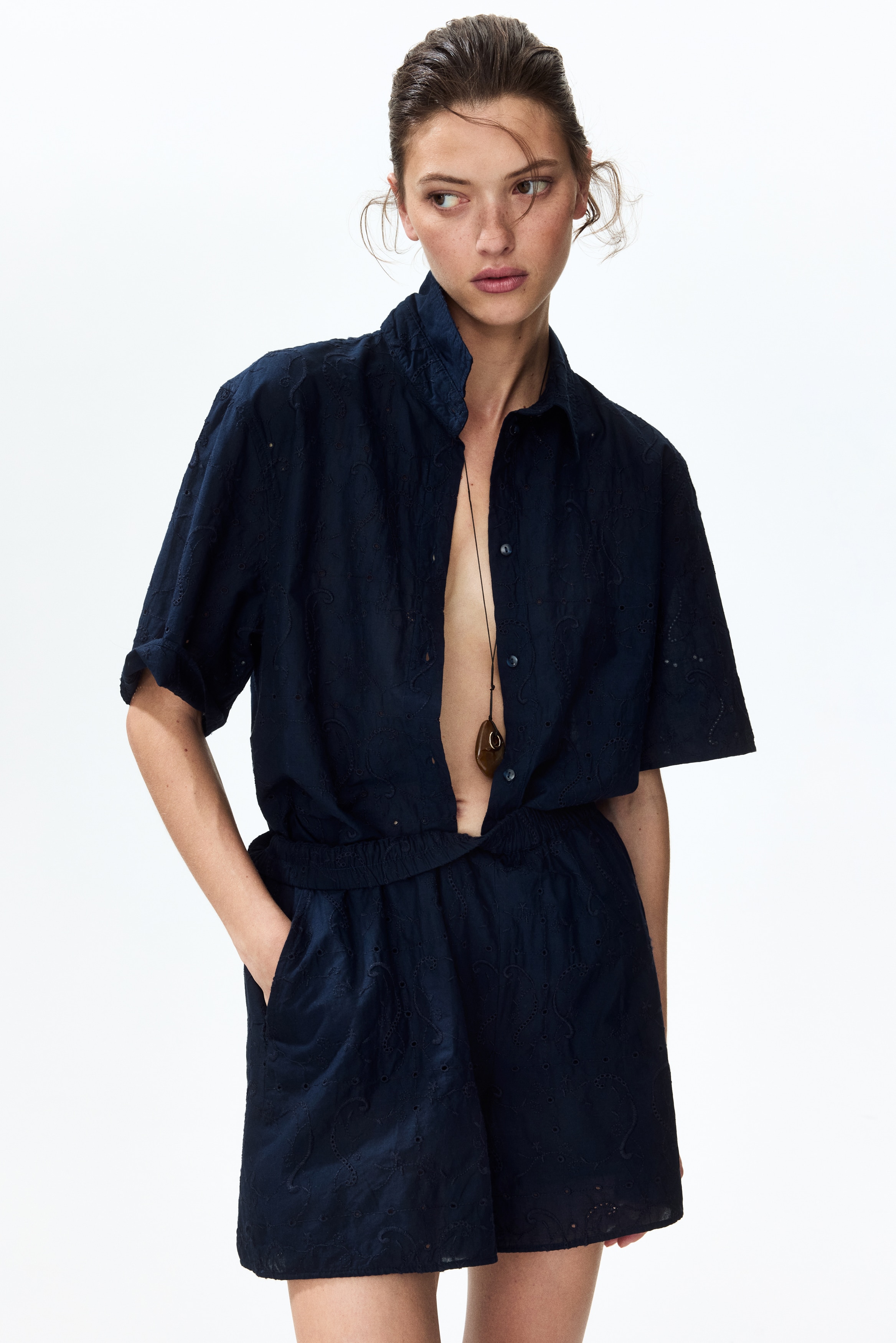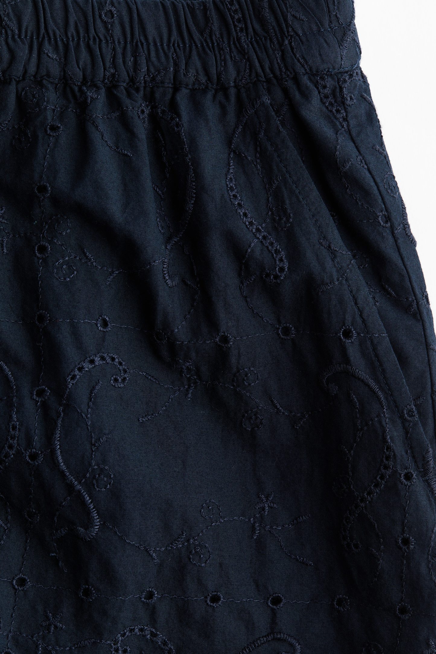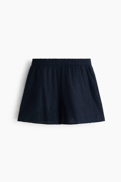 Loose-fit shorts in an airy cotton weave with broderie anglaise. High, elasticated waist and diagonal side pockets.