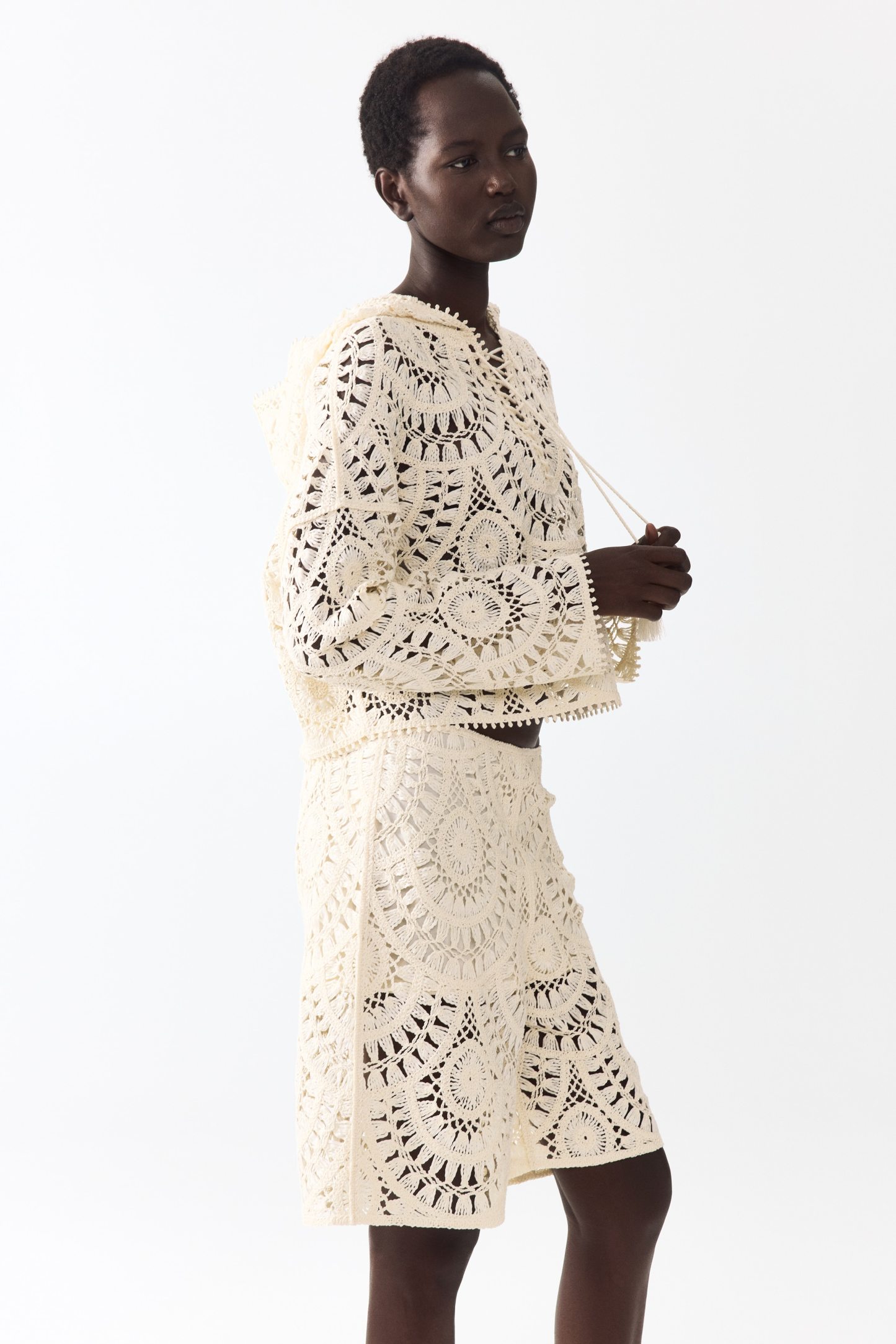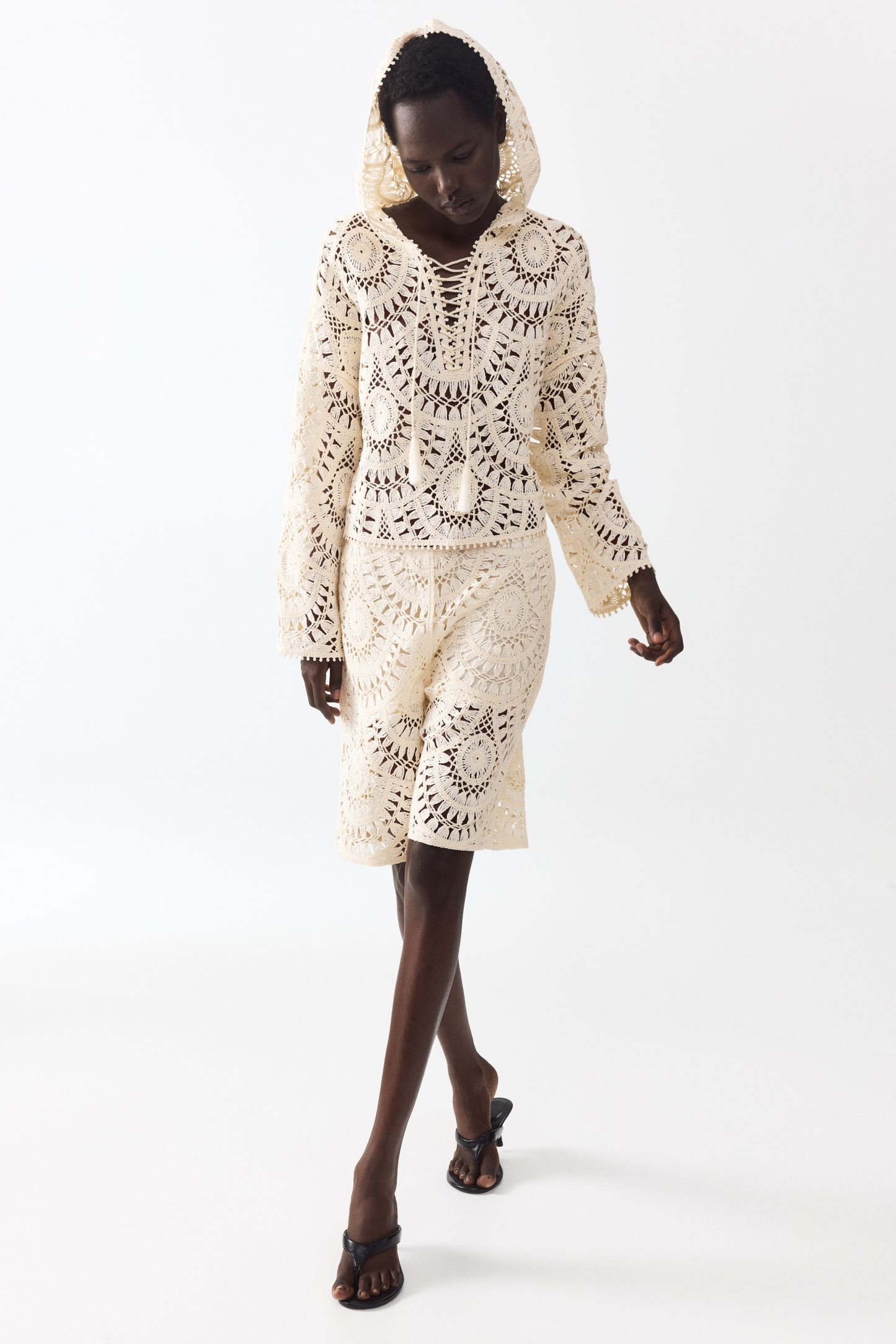 Knee-length shorts in a crochet-look knit featuring a high waist with concealed elastication and a concealed zip and hook-and-eye fastener at one side. Jersey lining.