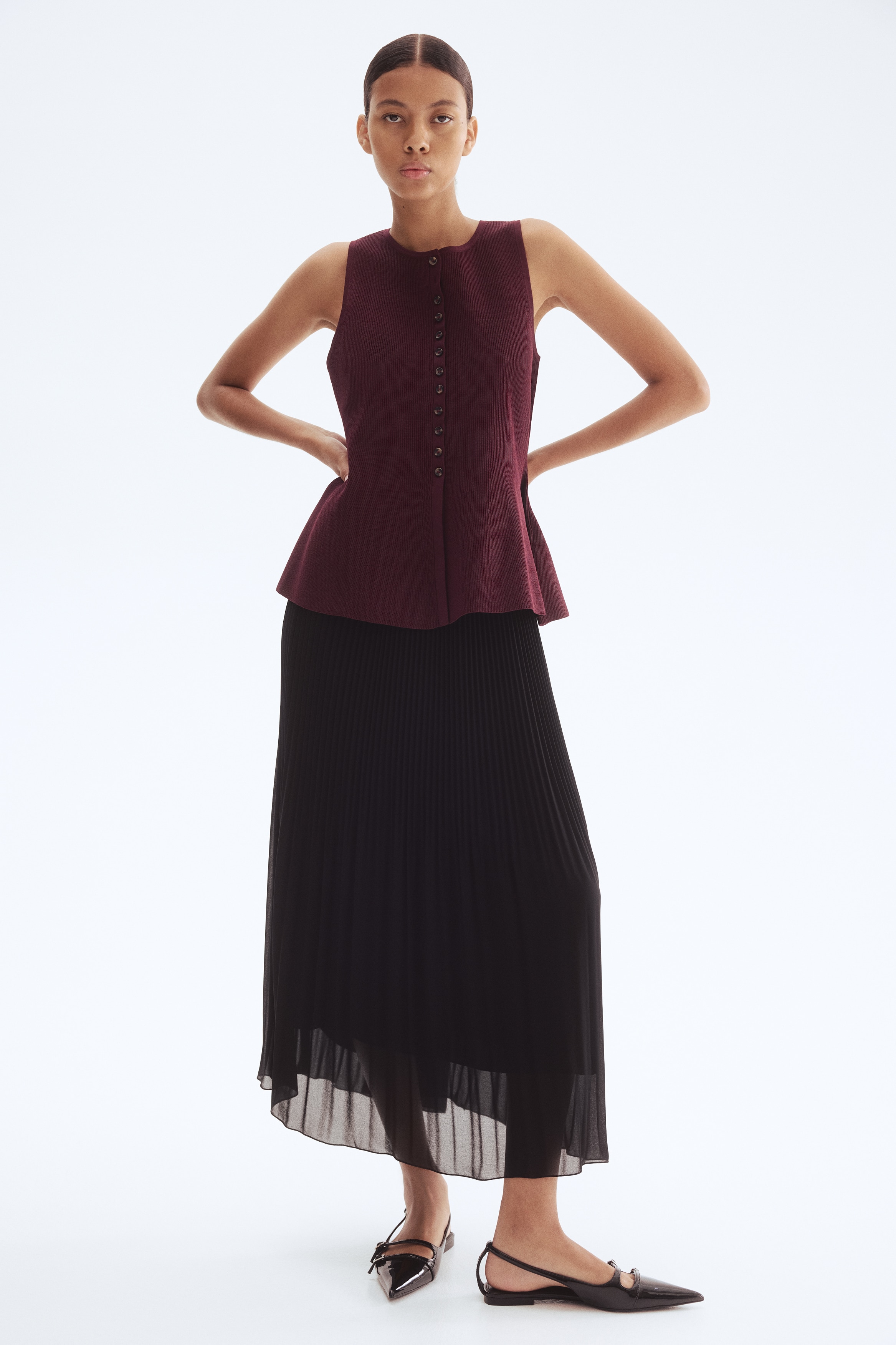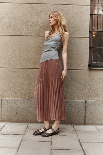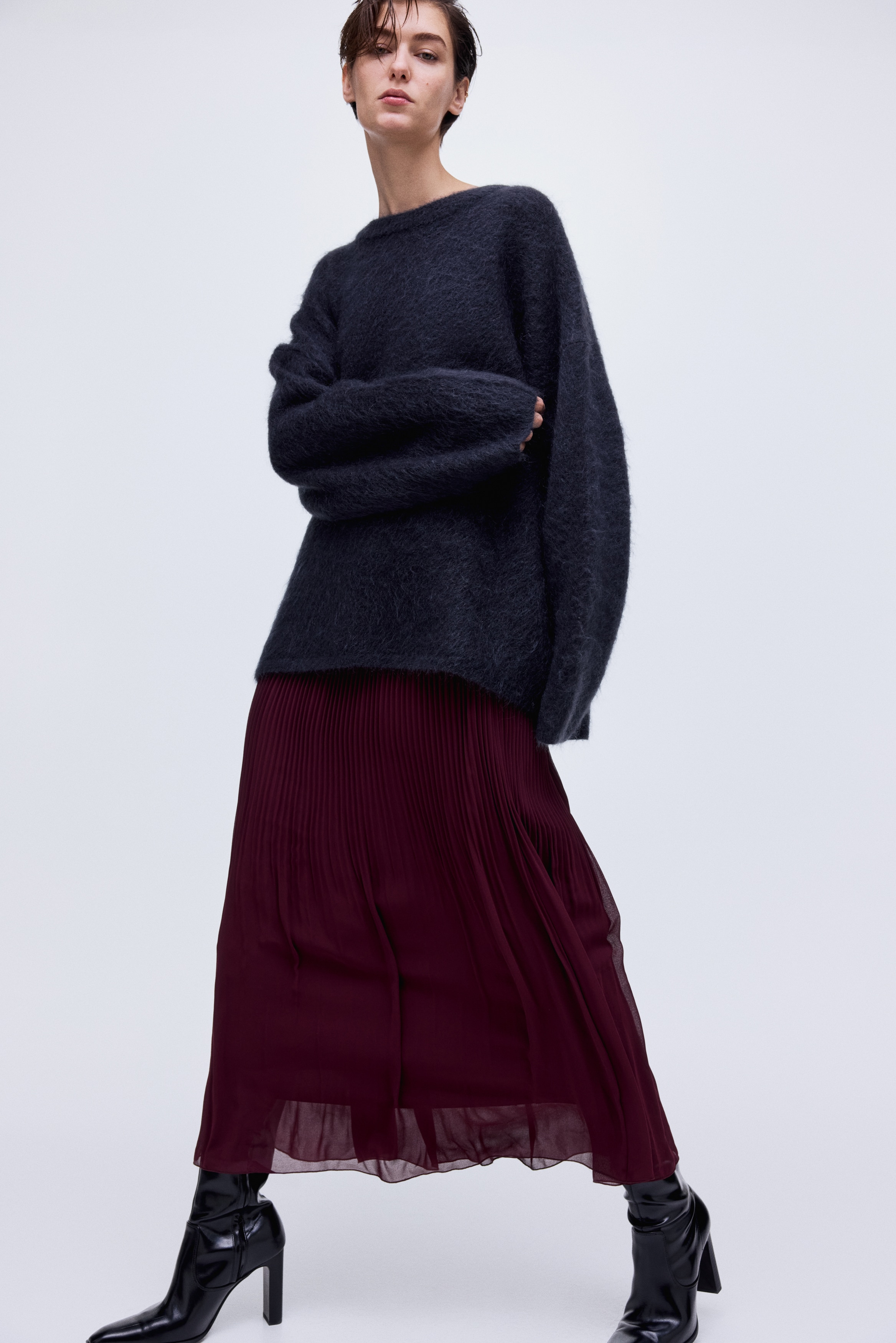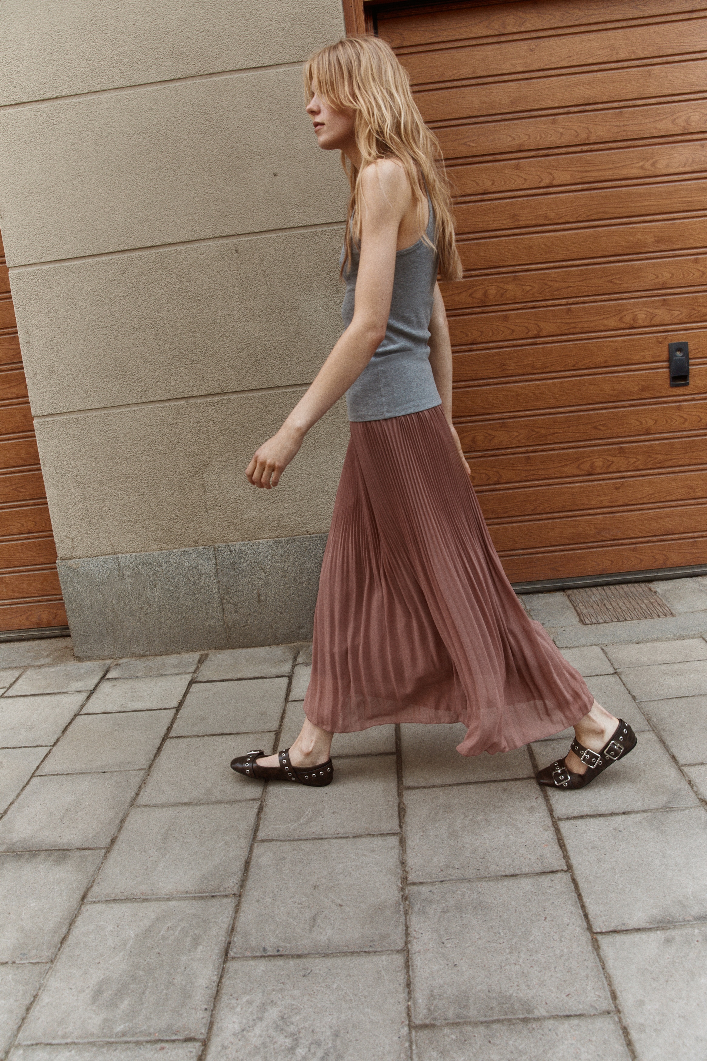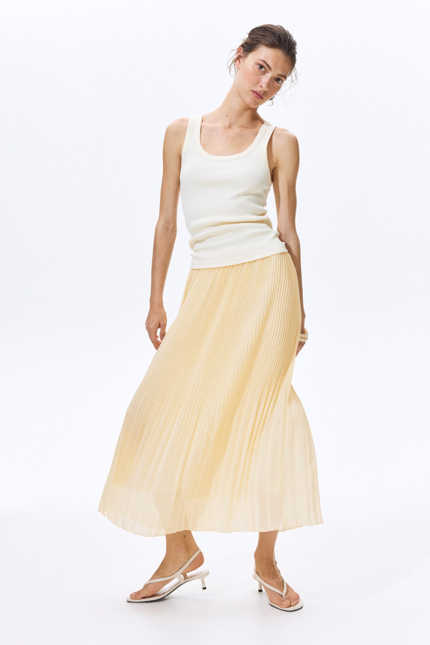 Long, flared skirt in pleated chiffon featuring a high waist with narrow elastication and an overlocked hem. Lined.