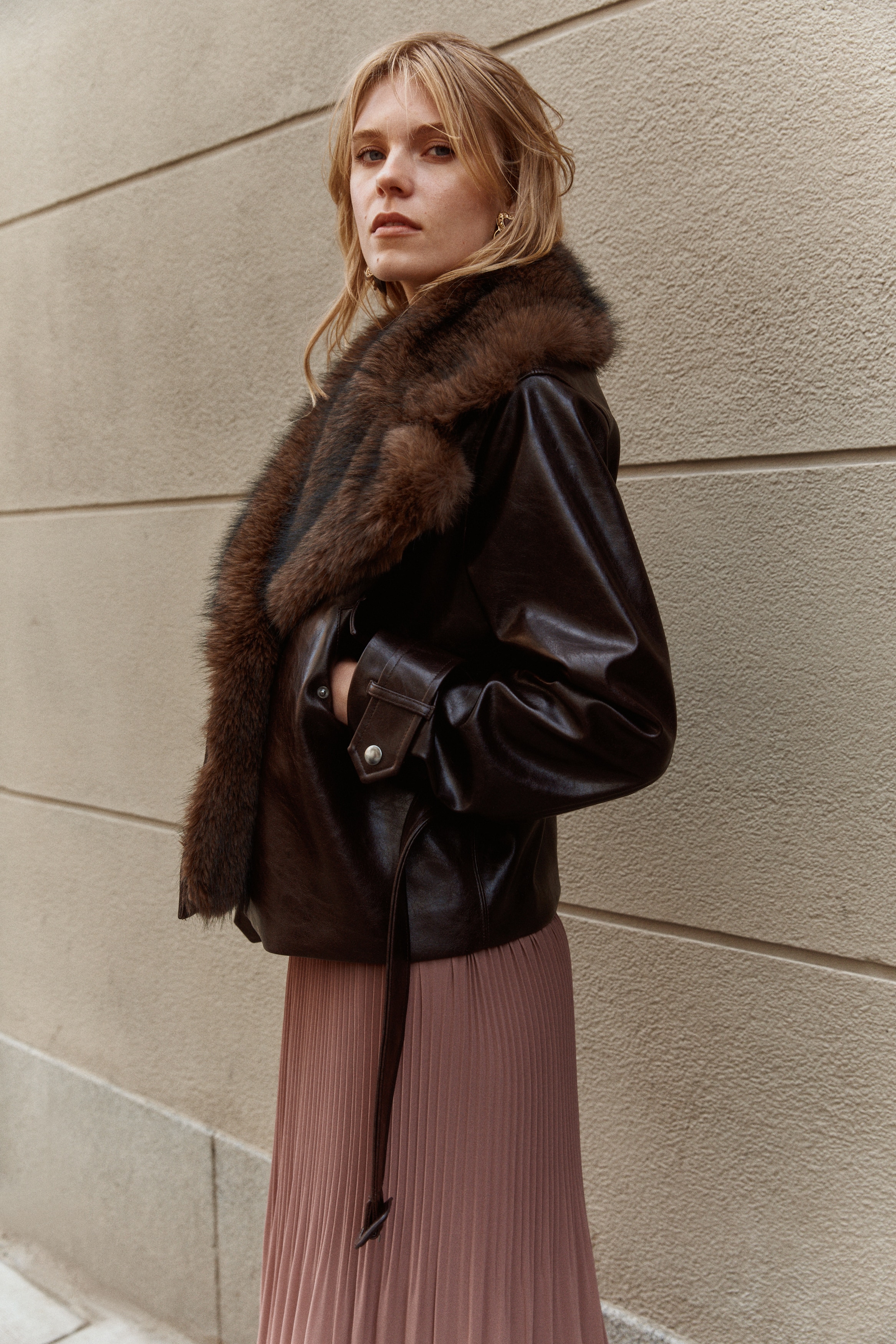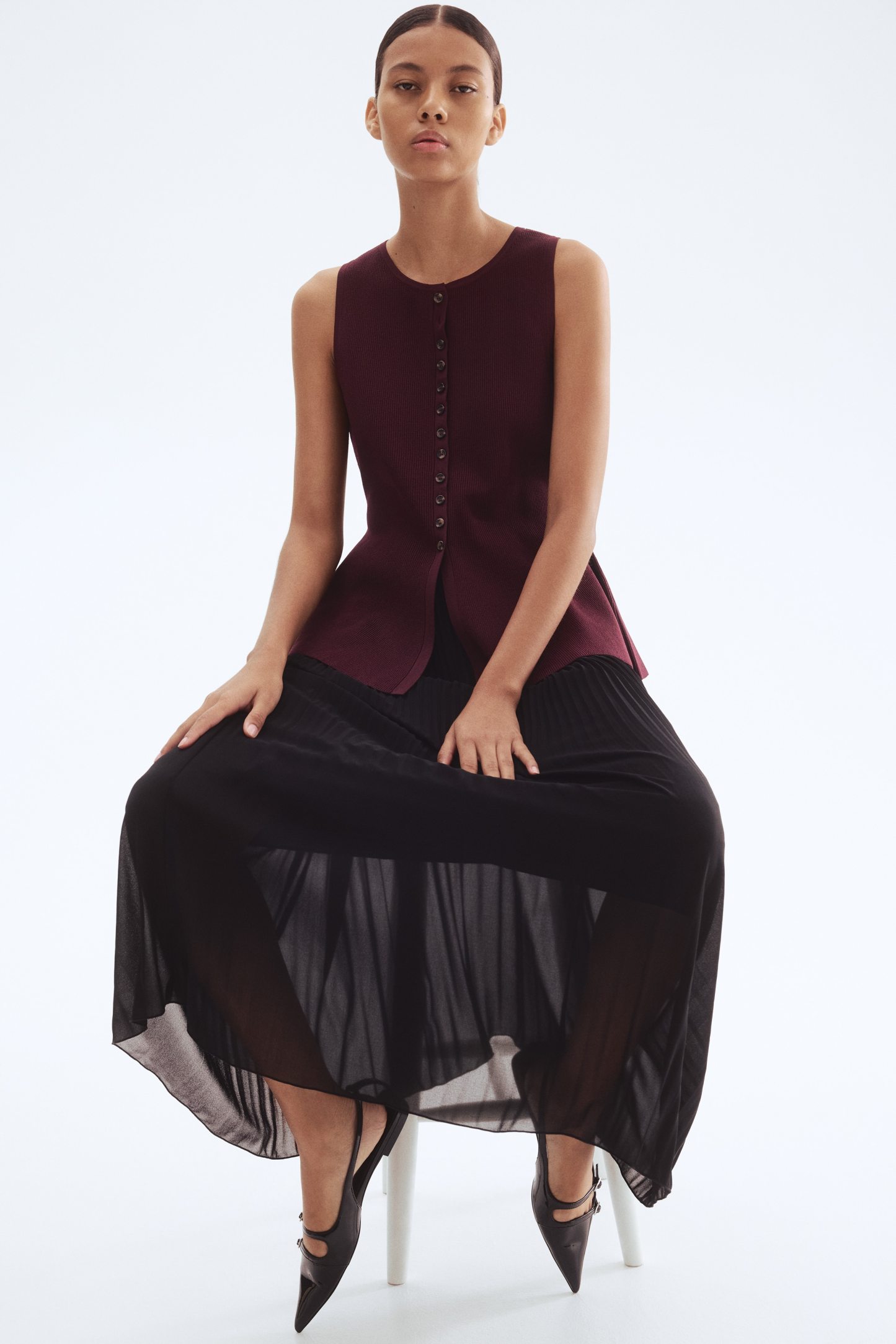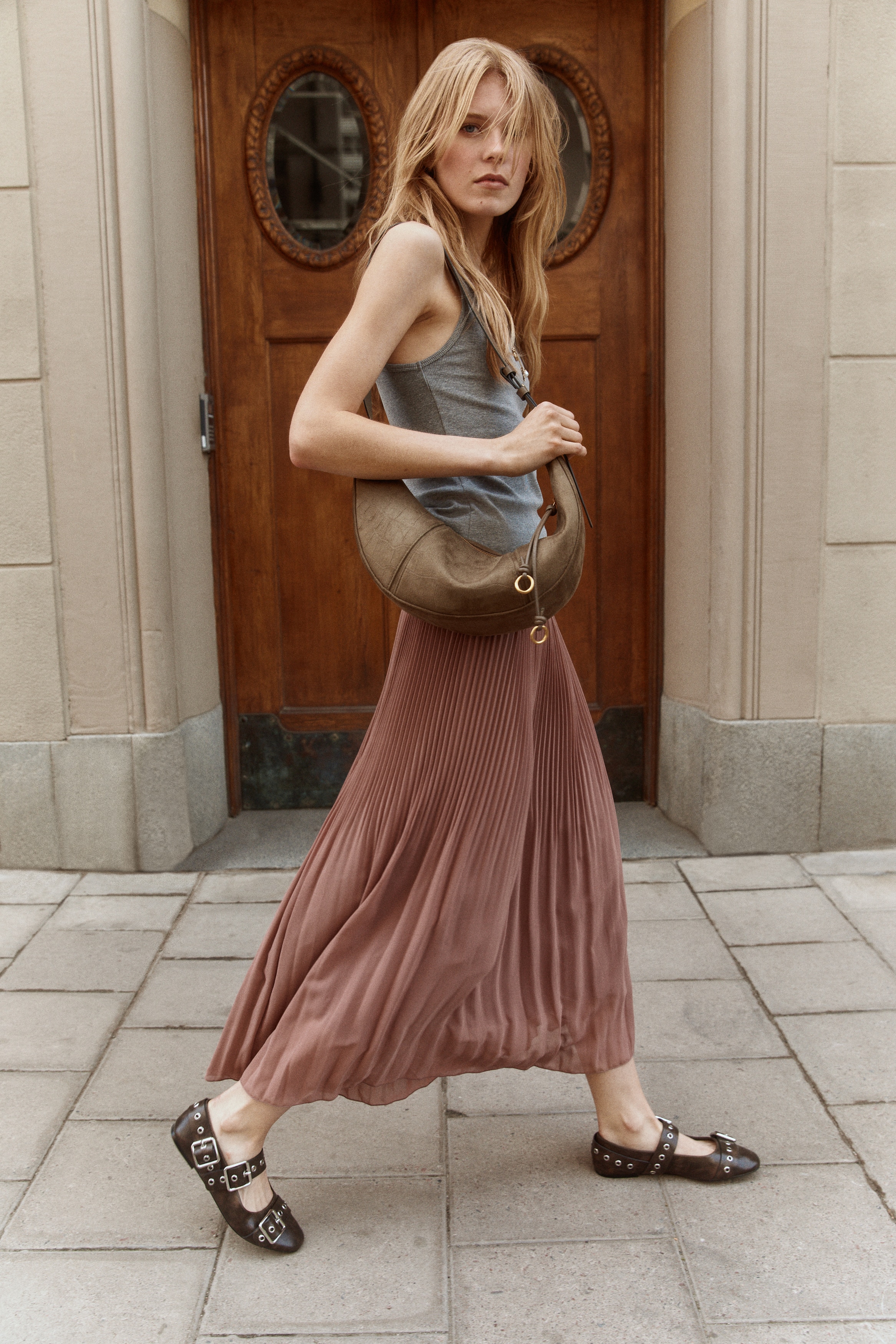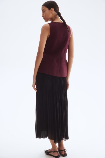 Long, flared skirt in pleated chiffon featuring a high waist with narrow elastication and an overlocked hem. Lined.