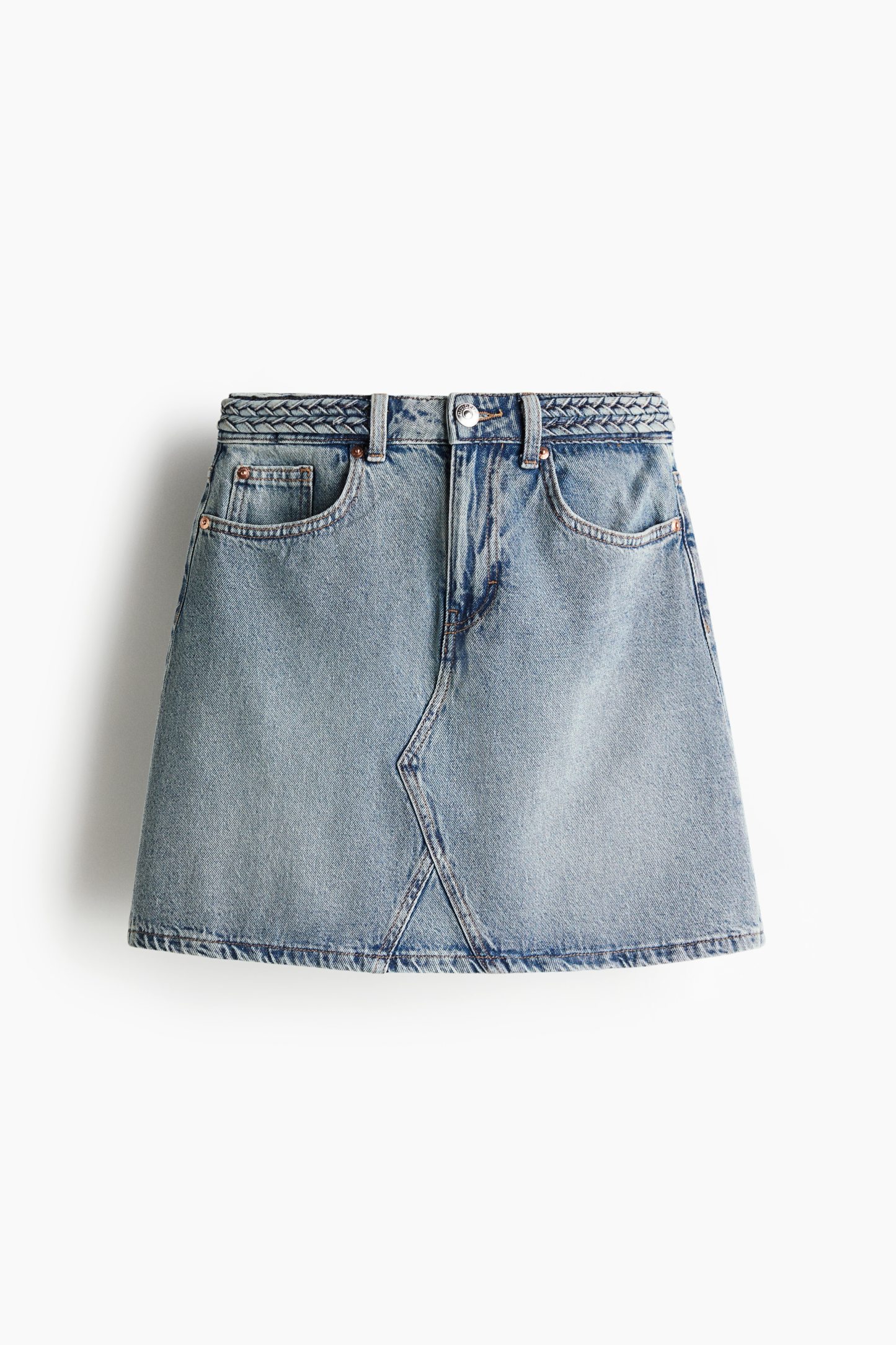 Short, 5-pocket skirt in rigid cotton denim with a zip fly and div. A-line silhouette with a braided trim at the waist.