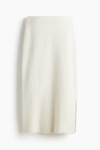 Calf-length, fitted skirt in a soft, fuzzy knit featuring a high waist with concealed elastication and a slit at one side of the hem.