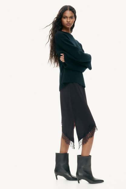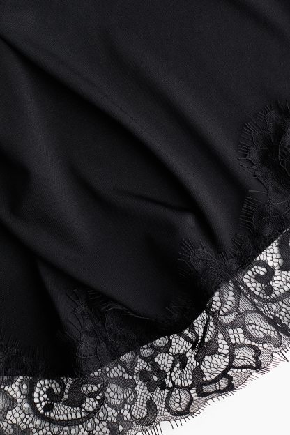 Knee-length skirt in crêpe jersey with an elasticated waist and an asymmetric, lace-trimmed hem.