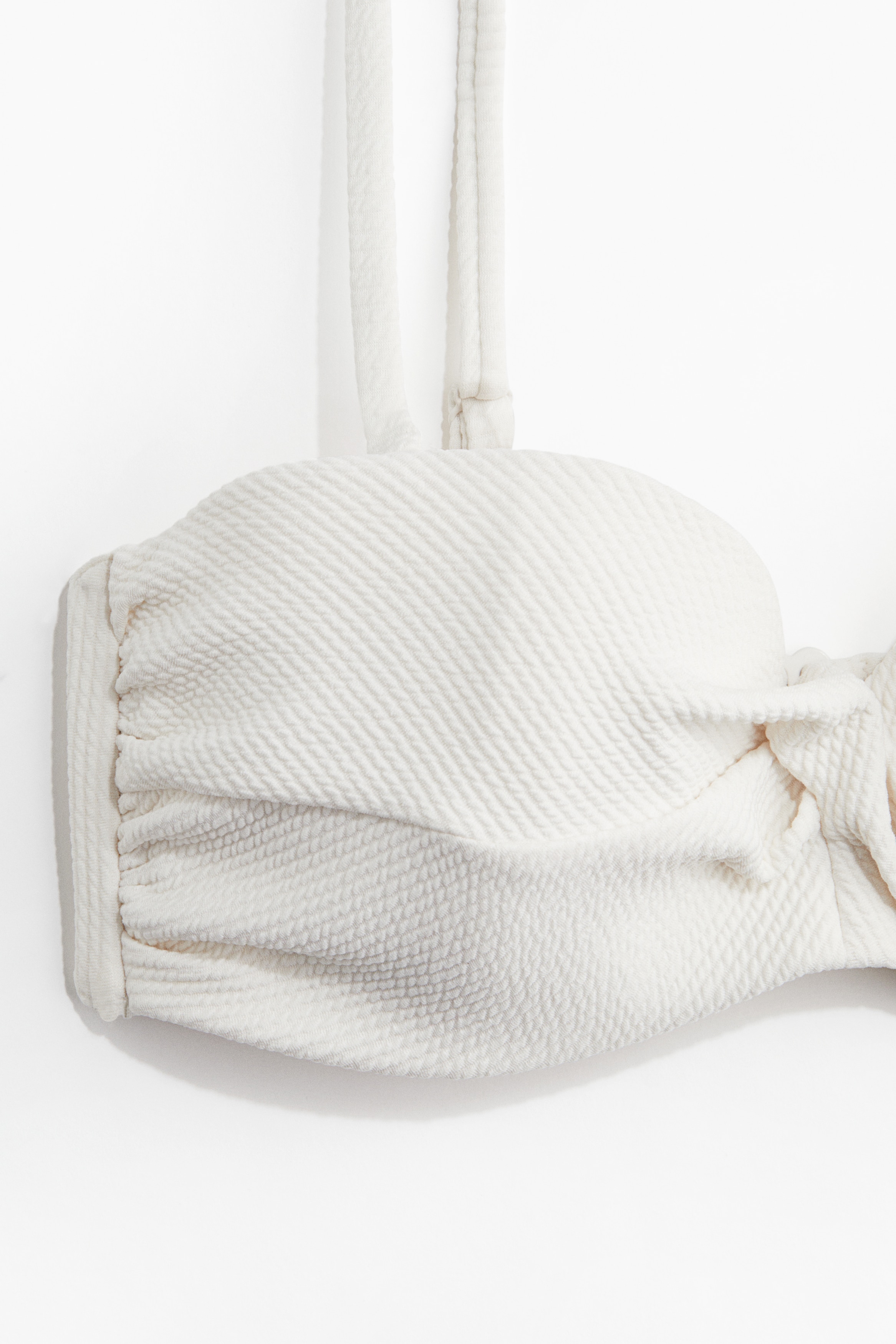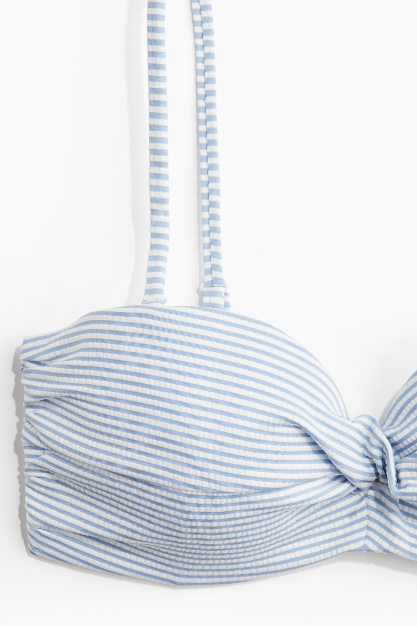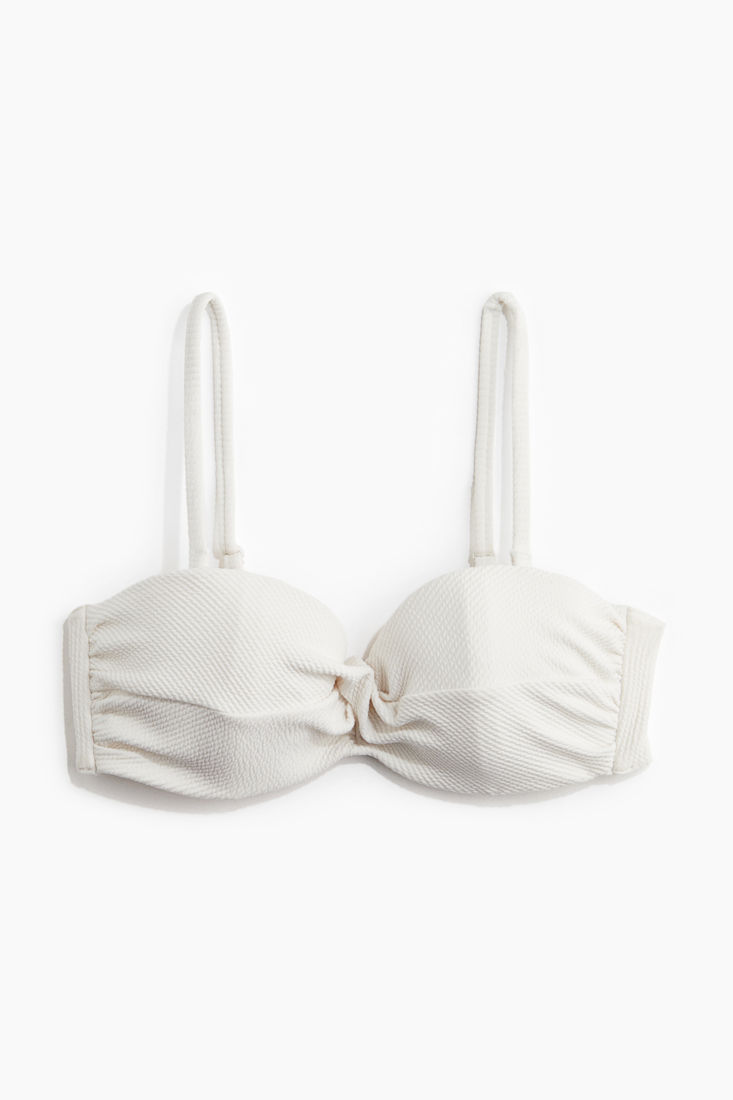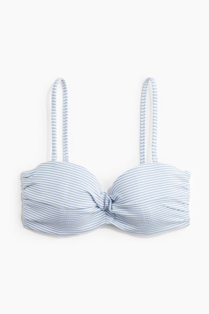 Lined balconette bikini top with underwired, padded cups that lift and shape the bust. Silicone trim at the top and boning at the sides. Detachable, adjustable shoulder straps and an adjustable hook fastening at the back.