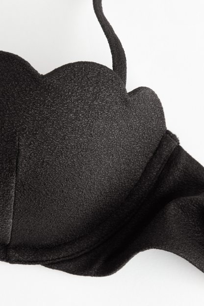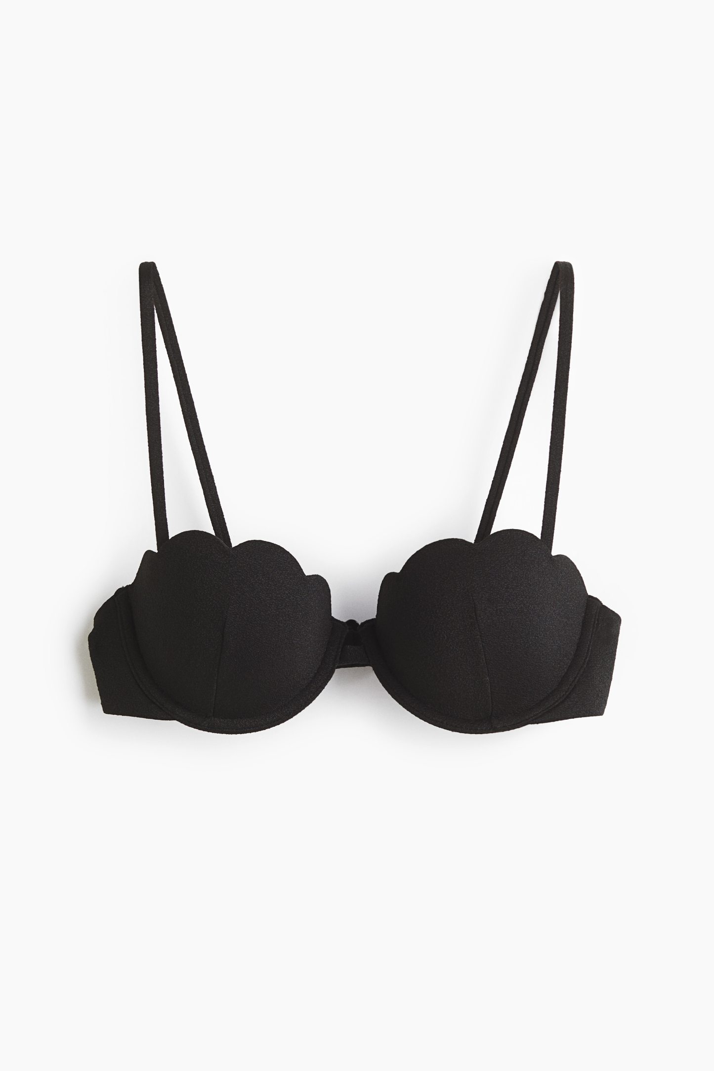 Lined balconette bikini top with underwired, padded cups that lift and shape the bust. Scalloped edge at the top and adjustable shoulder straps. Adjustable hook fastening at the back.