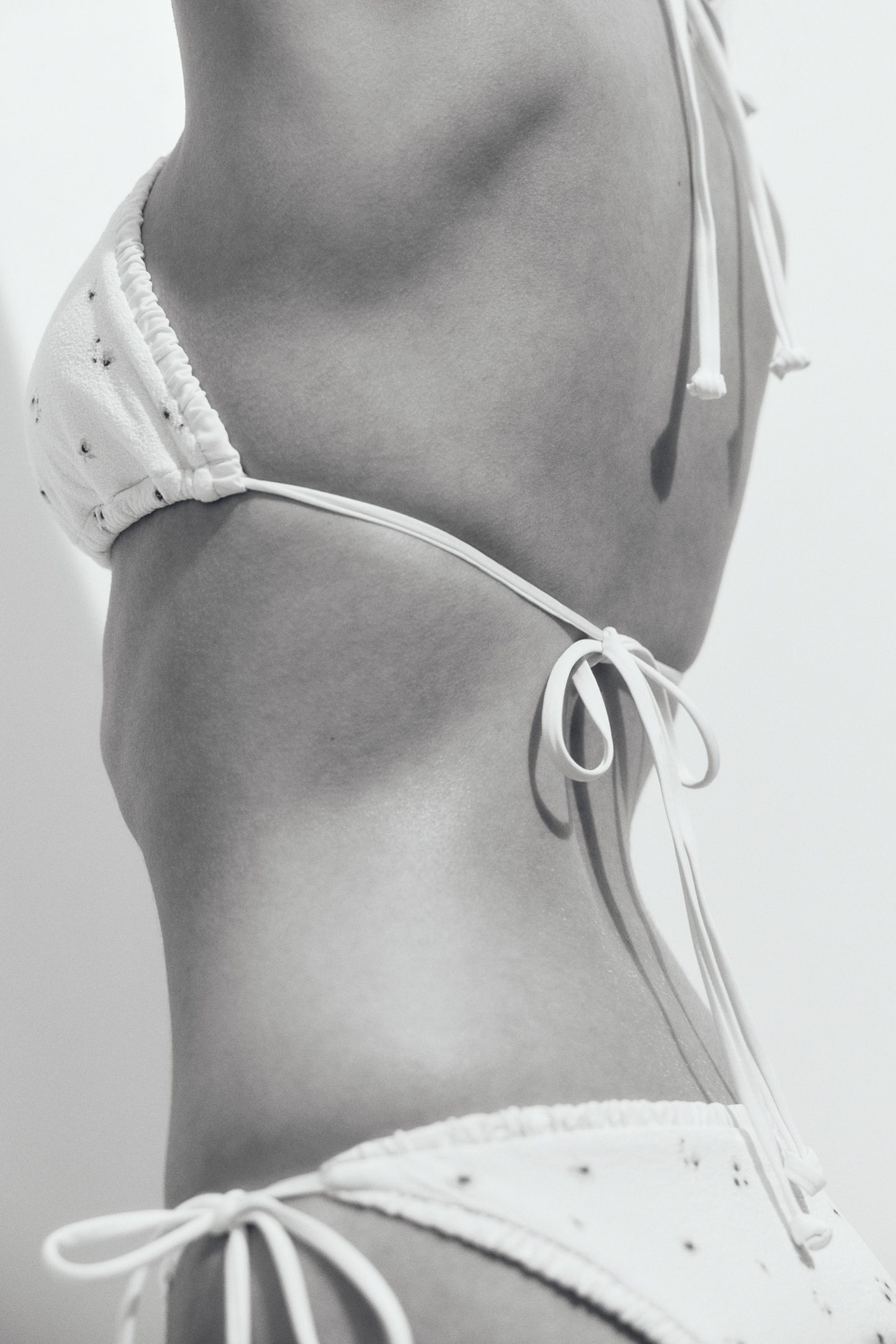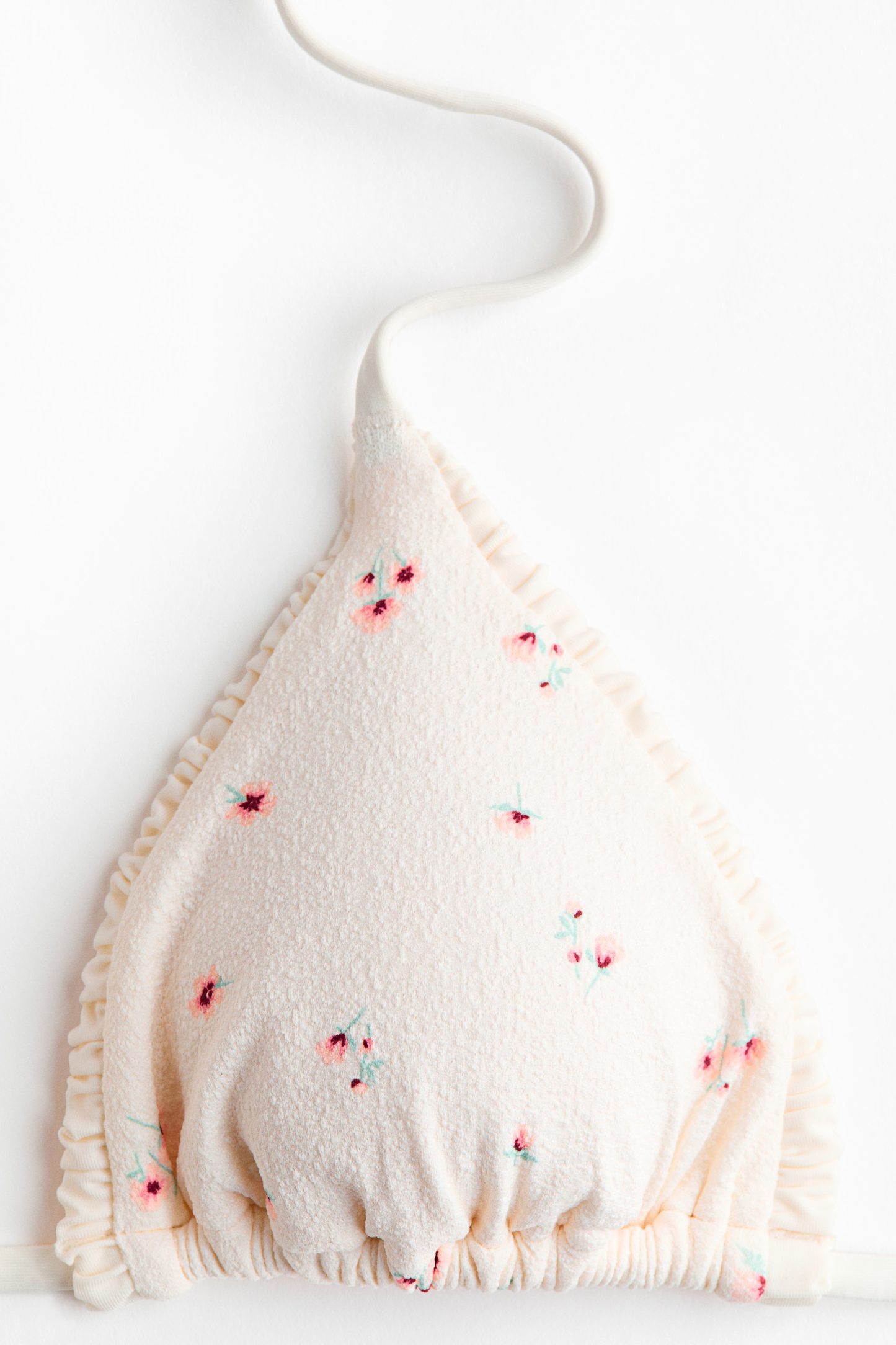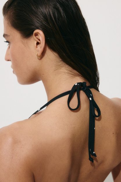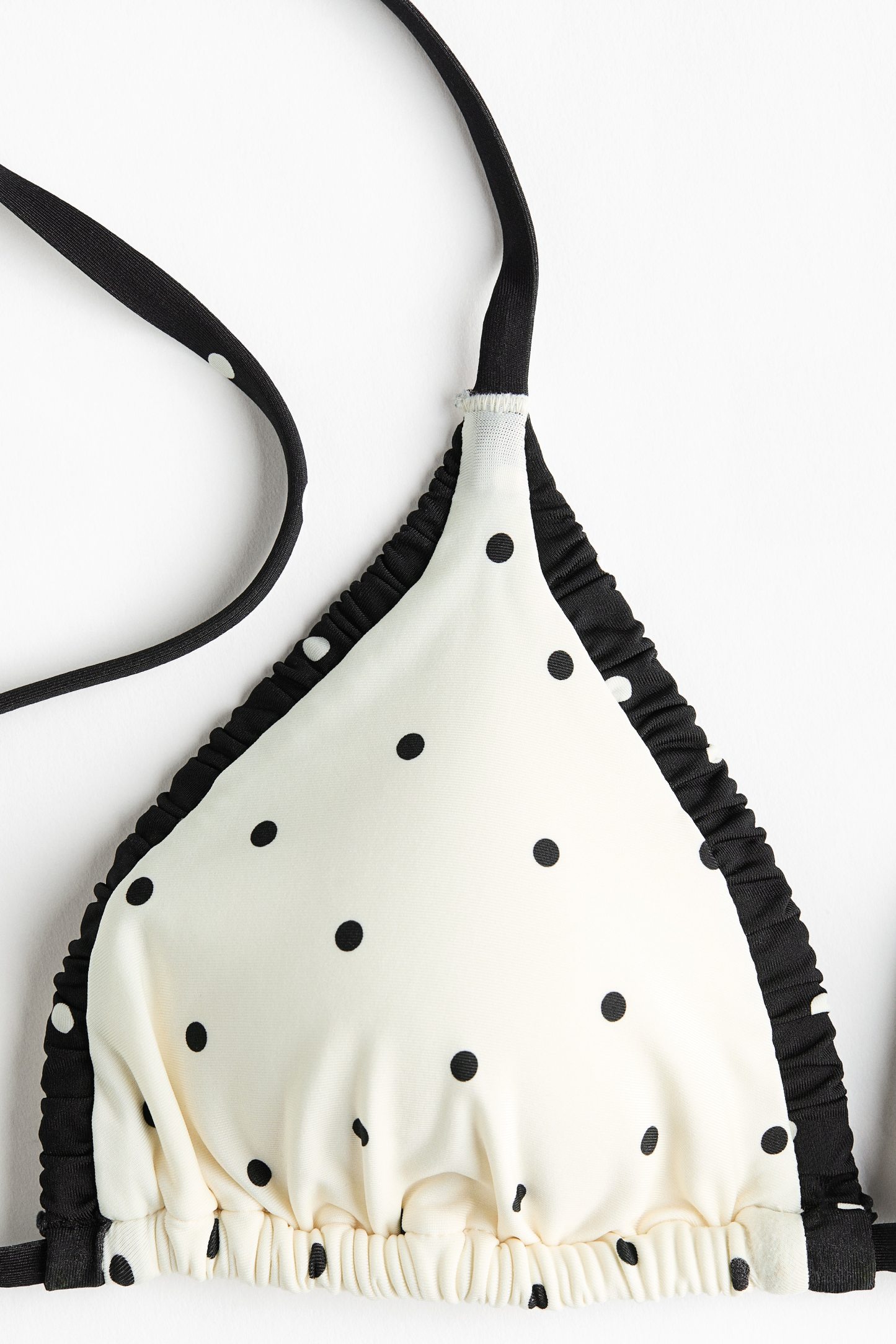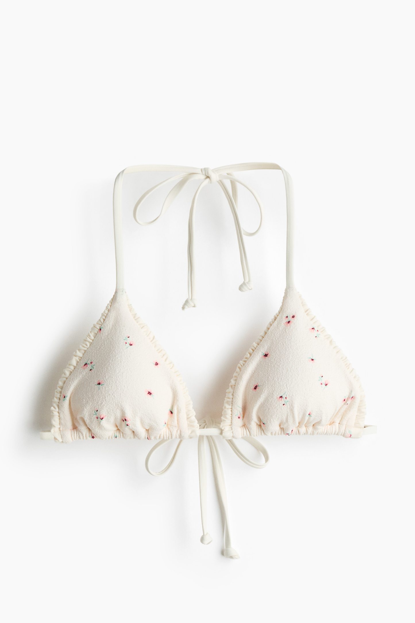 Lined triangle bikini top with a ruched, elasticated trim along the top. Cups with removable inserts that shape the bust and provide good support. Ties at the back and back of the neck.