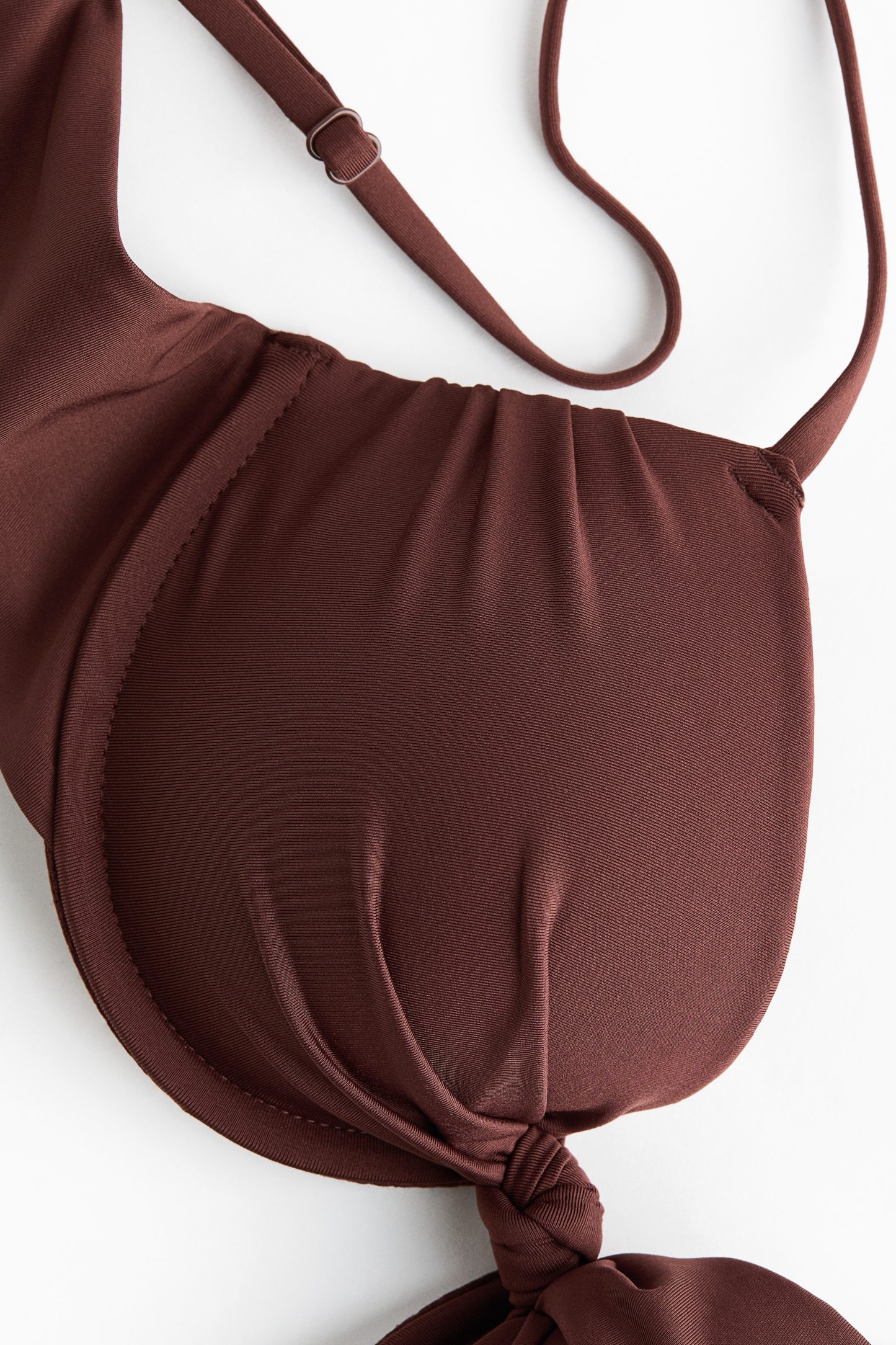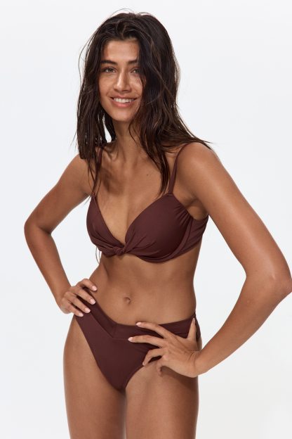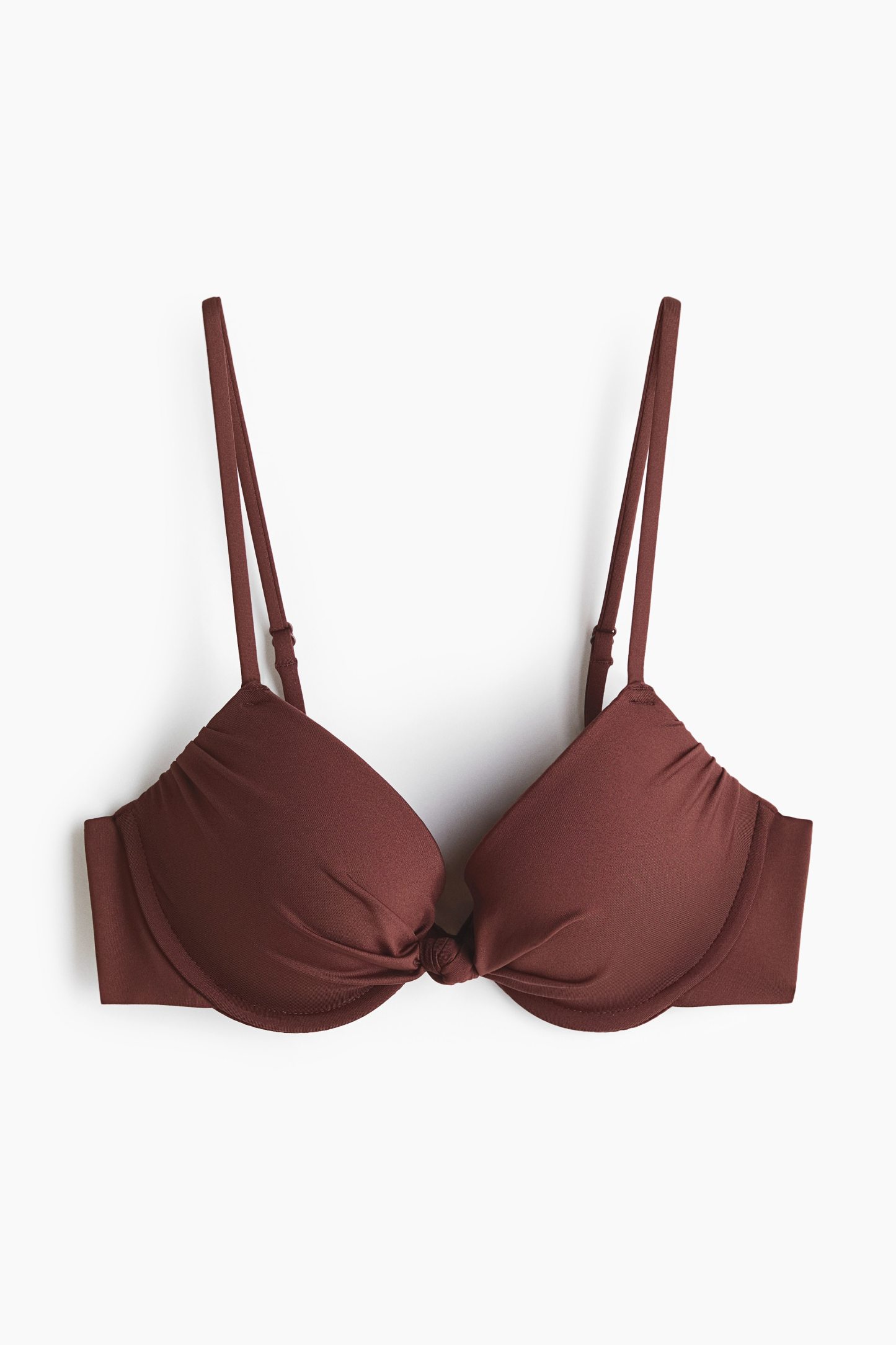 Lined bikini top with a knotted detail at the centre of the bust and underwired, padded cups for a larger bust and fuller cleavage. Adjustable shoulder straps and a hook fastening at the back.
