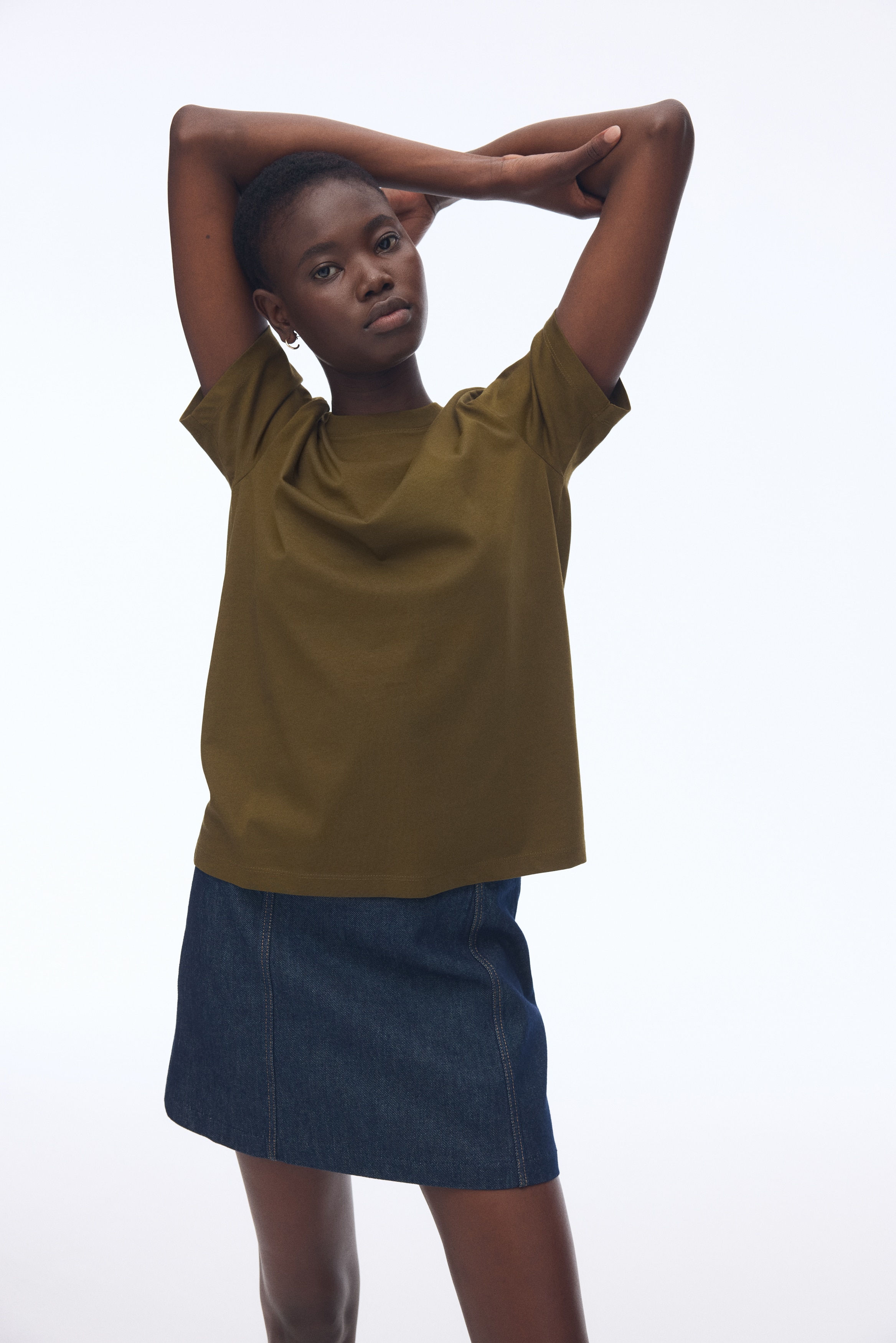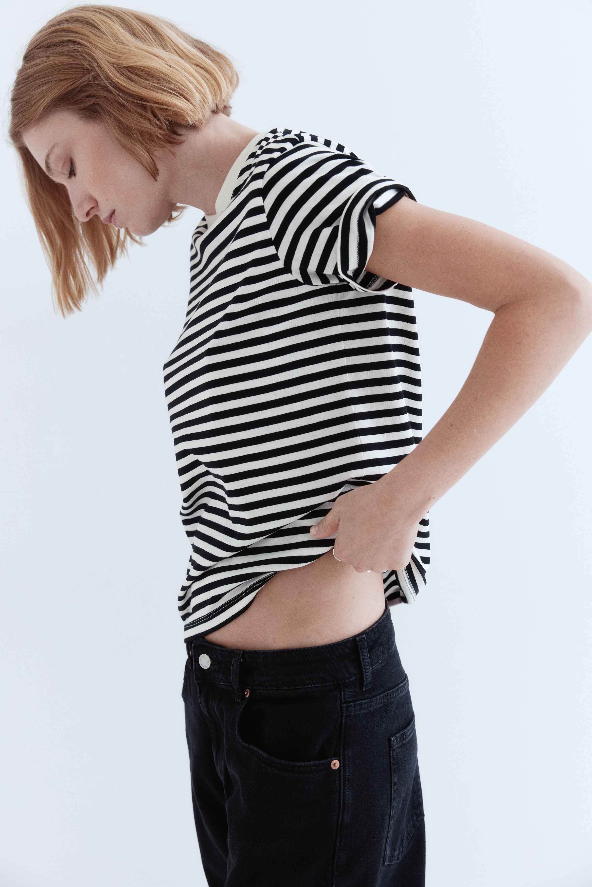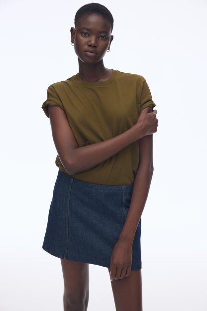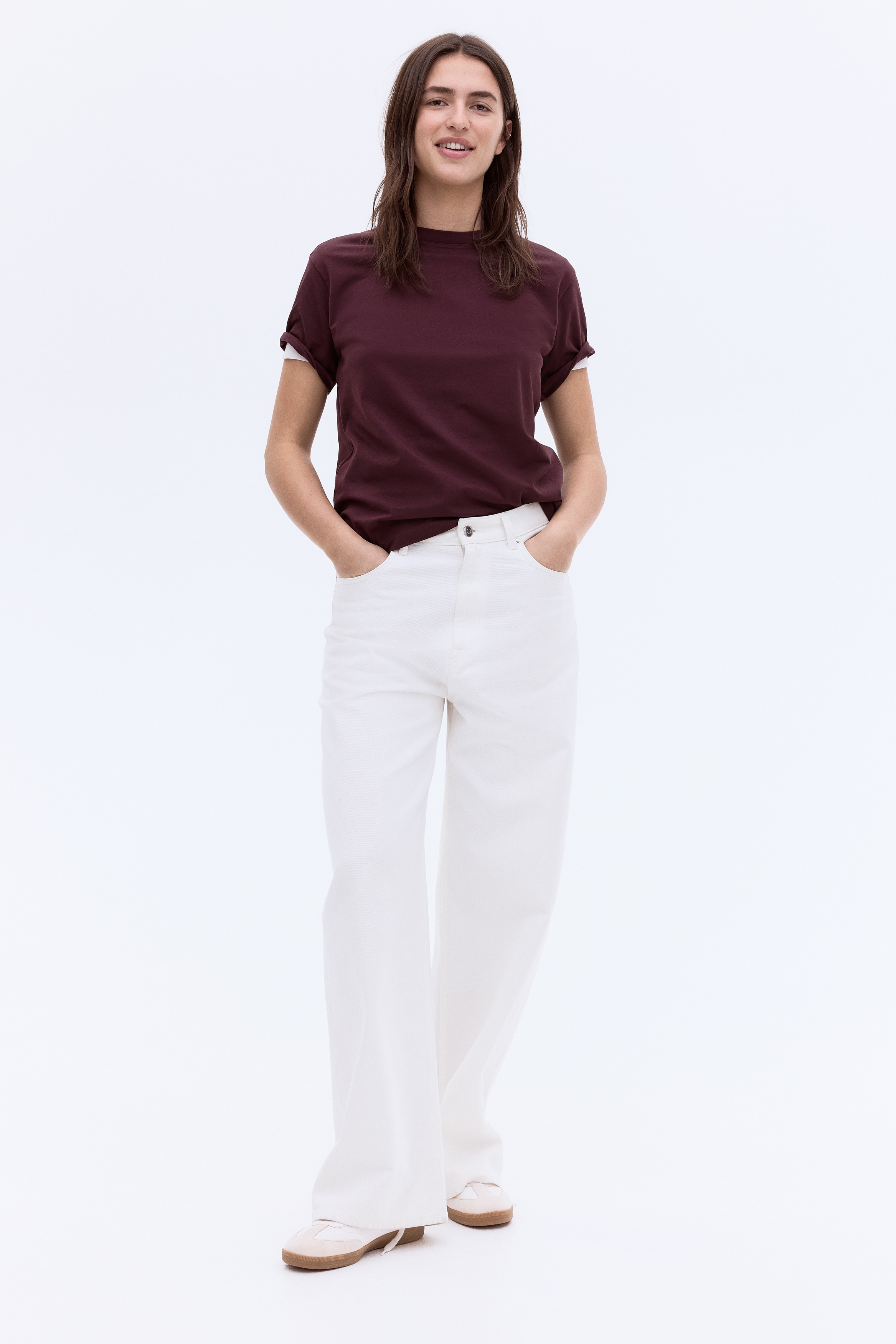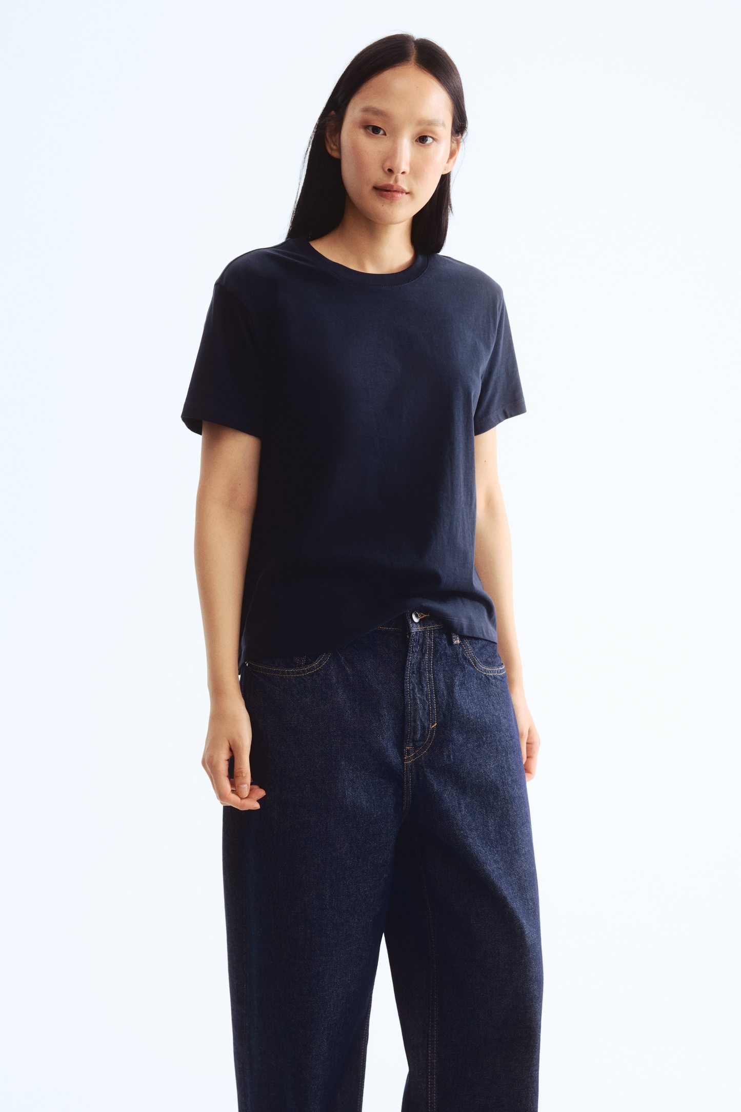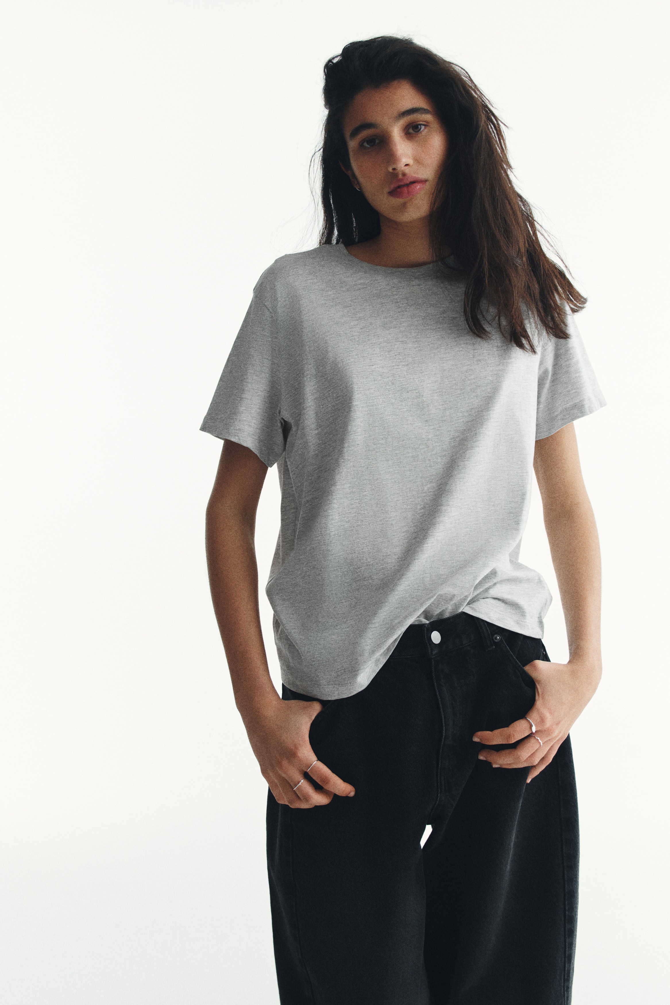 Straight-cut T-shirt in soft cotton jersey with a round, rib-trimmed neckline and gently dropped shoulders.