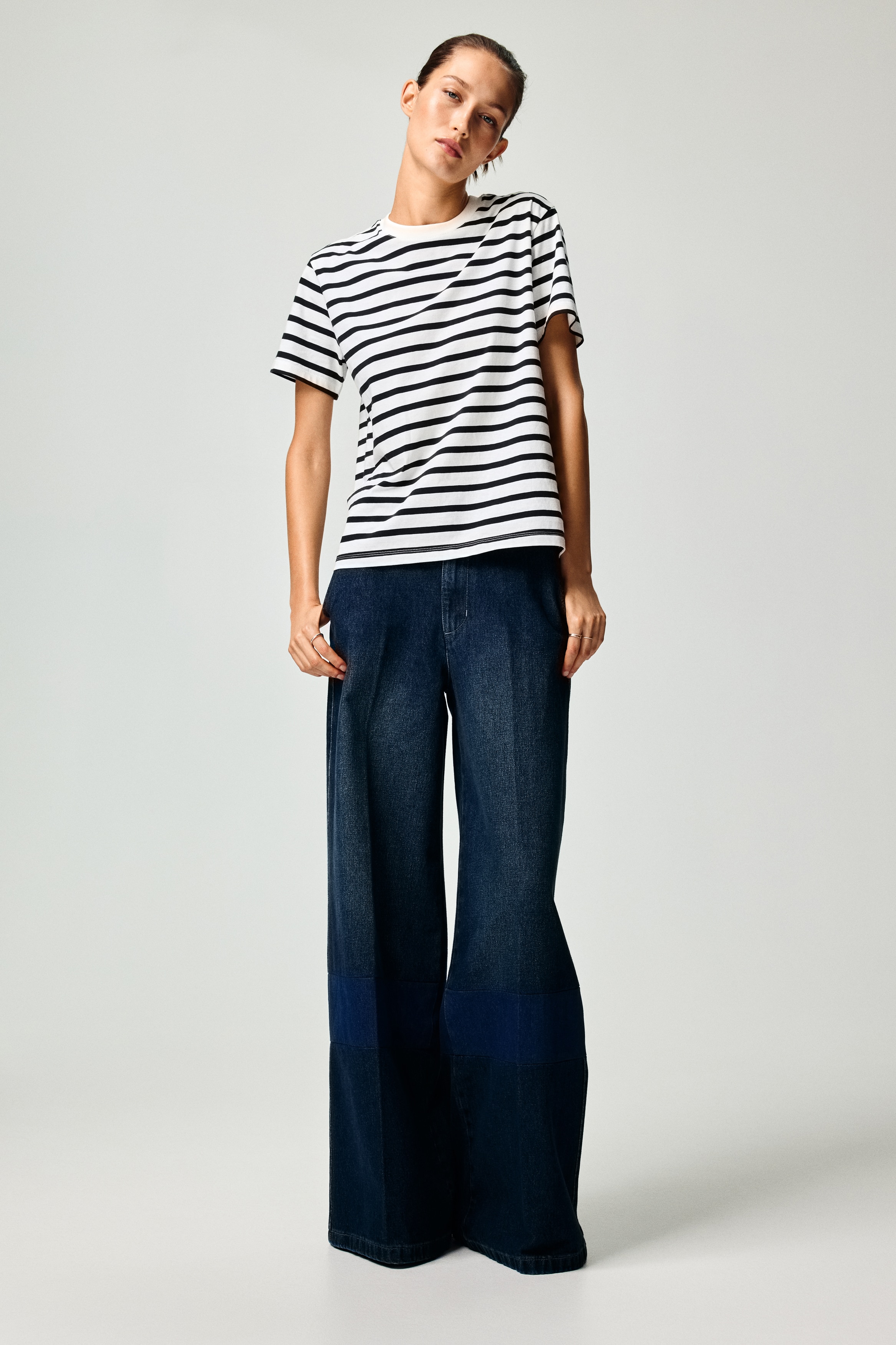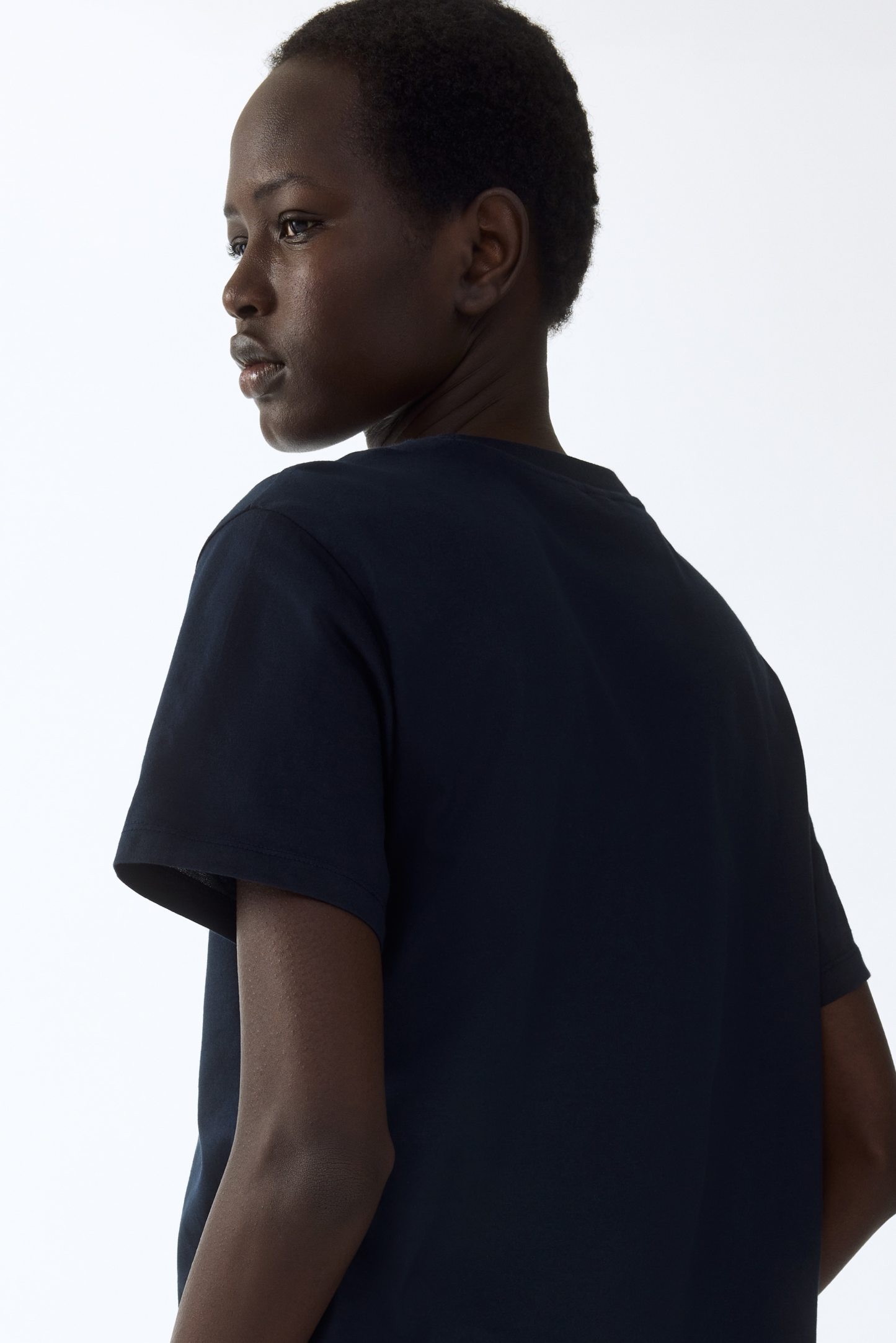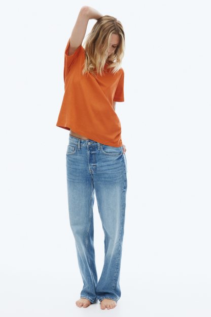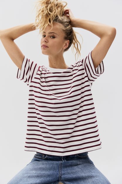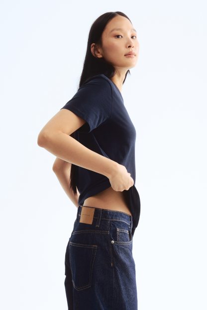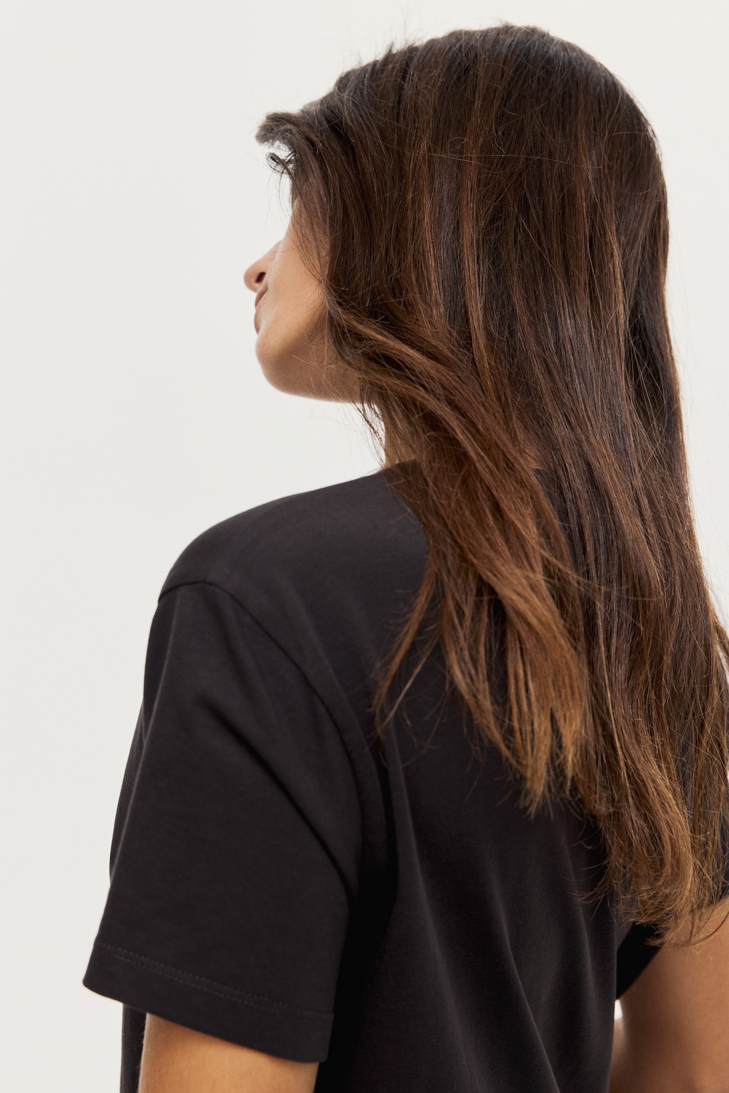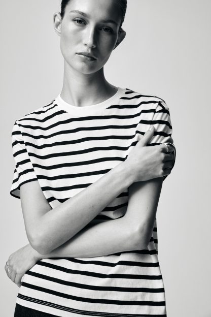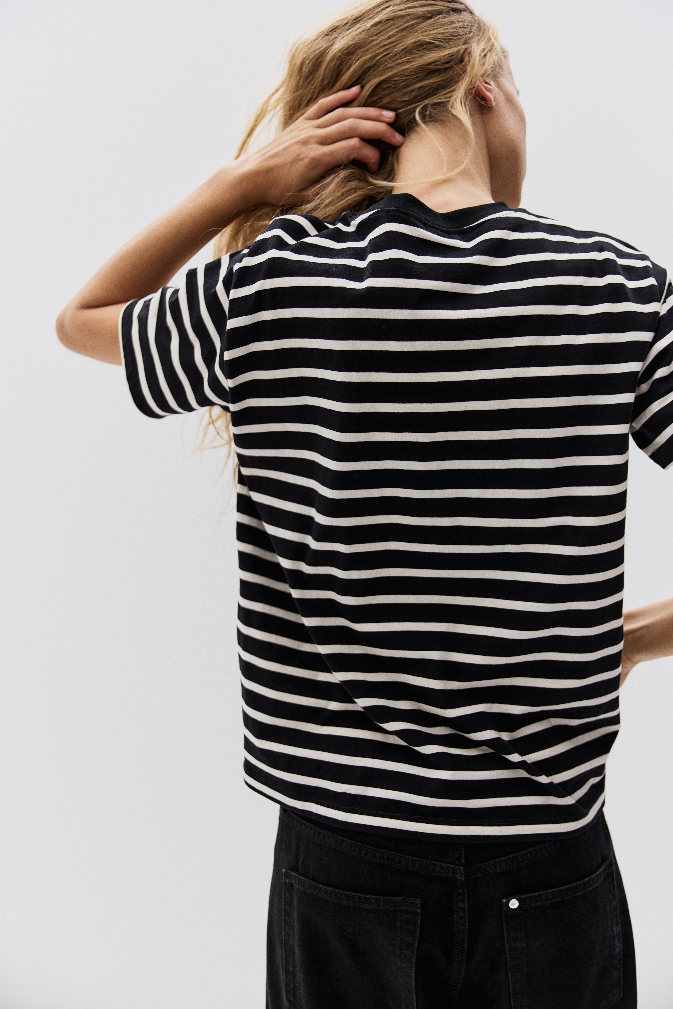 Straight-cut T-shirt in soft cotton jersey with a round, rib-trimmed neckline and gently dropped shoulders.