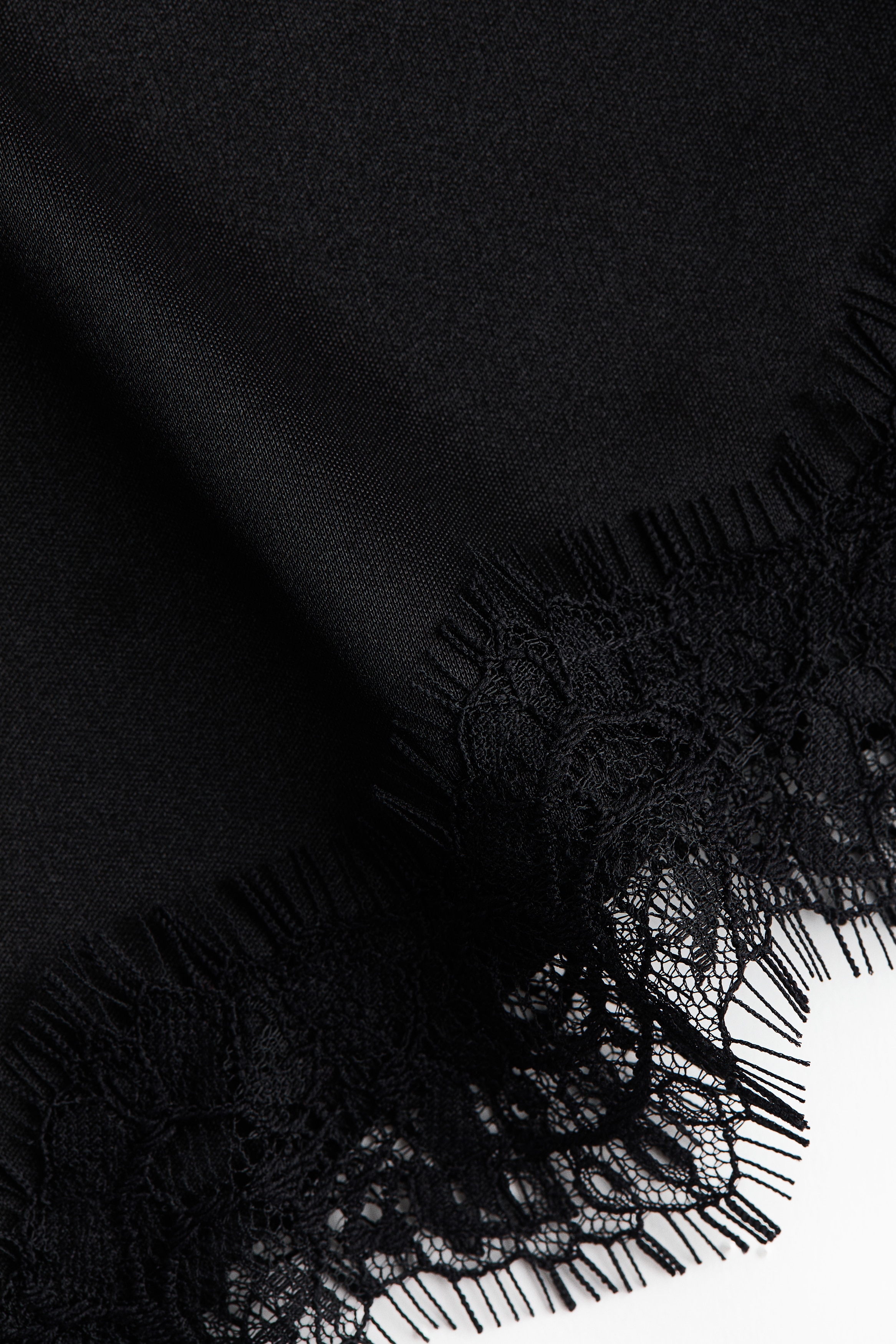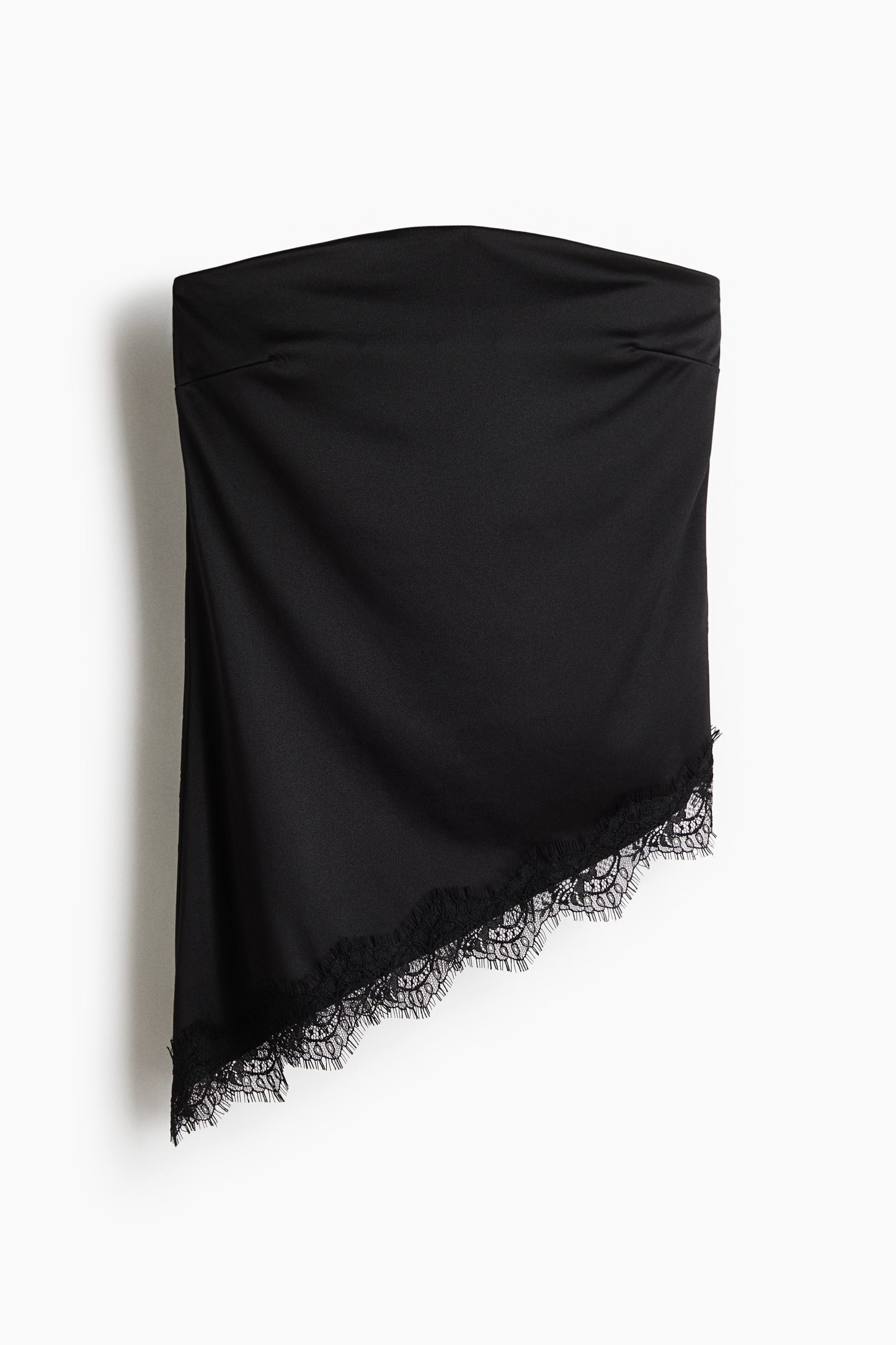 Fitted tube top in interlock jersey with a concealed silicone trim at the top and an asymmetric, lace-trimmed hem.