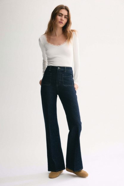 Fitted, long-sleeved top in ribbed jersey made from a cotton and modal blend. Features a deep sweetheart neckline with a lace trim.