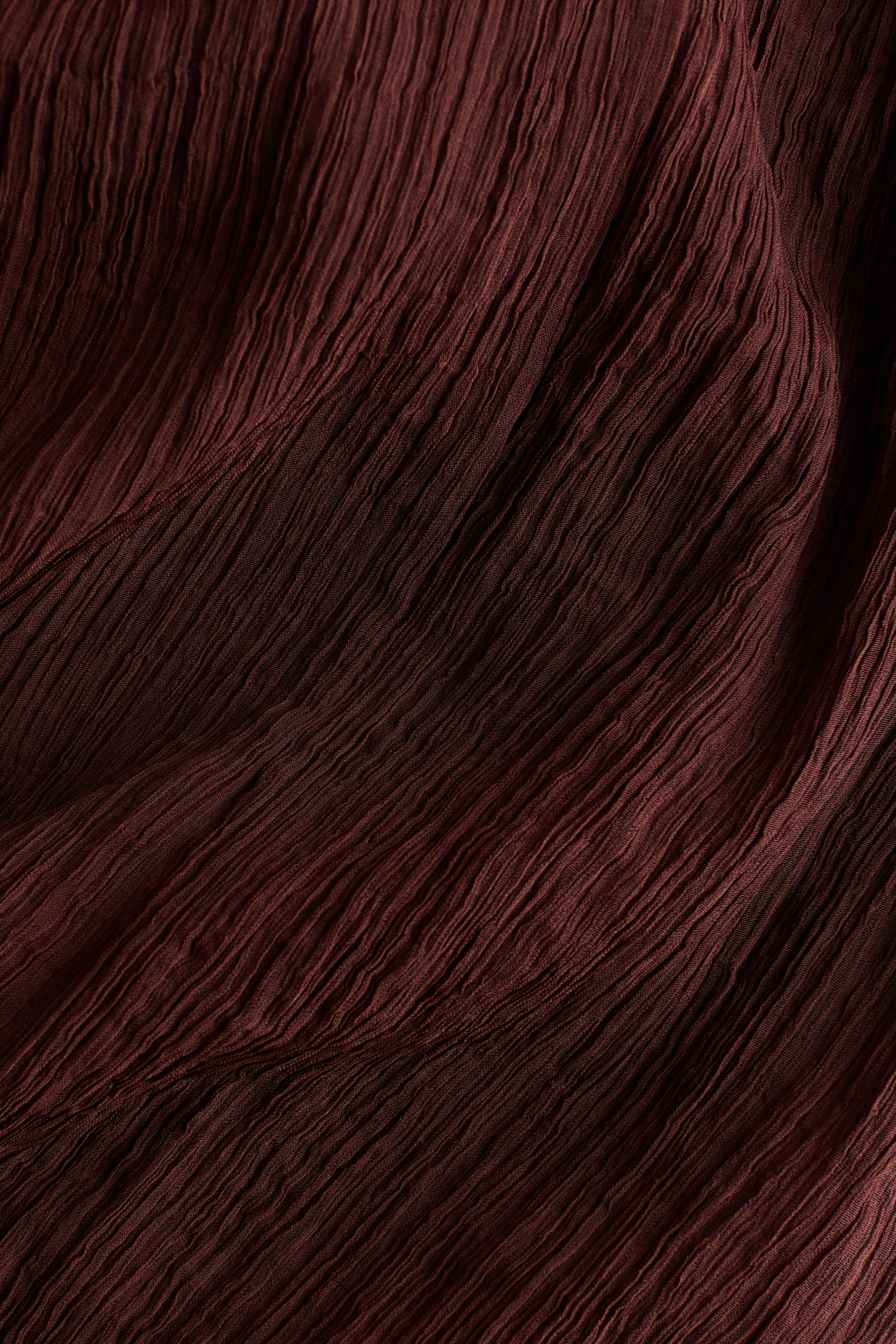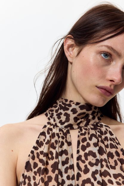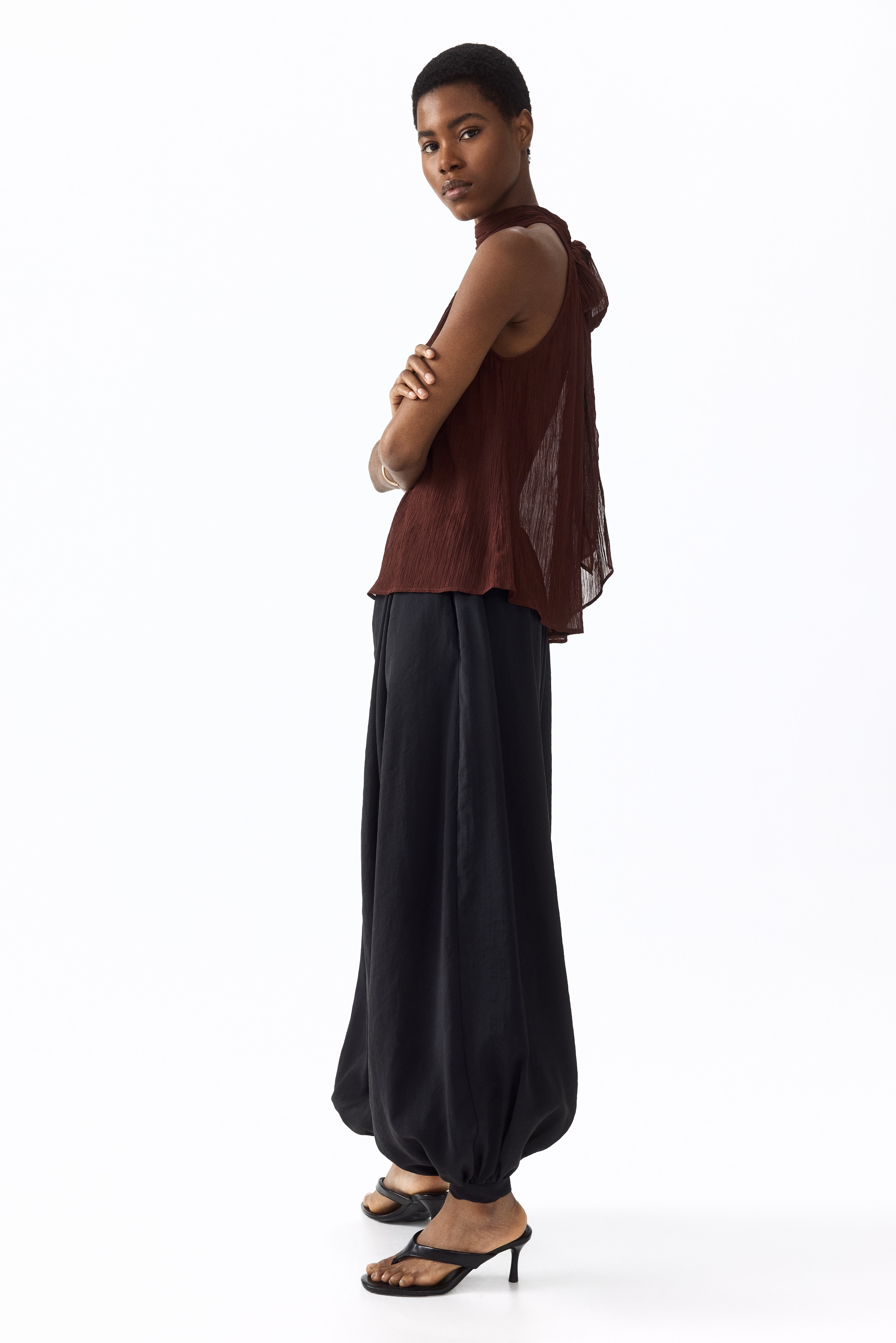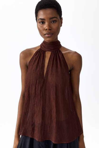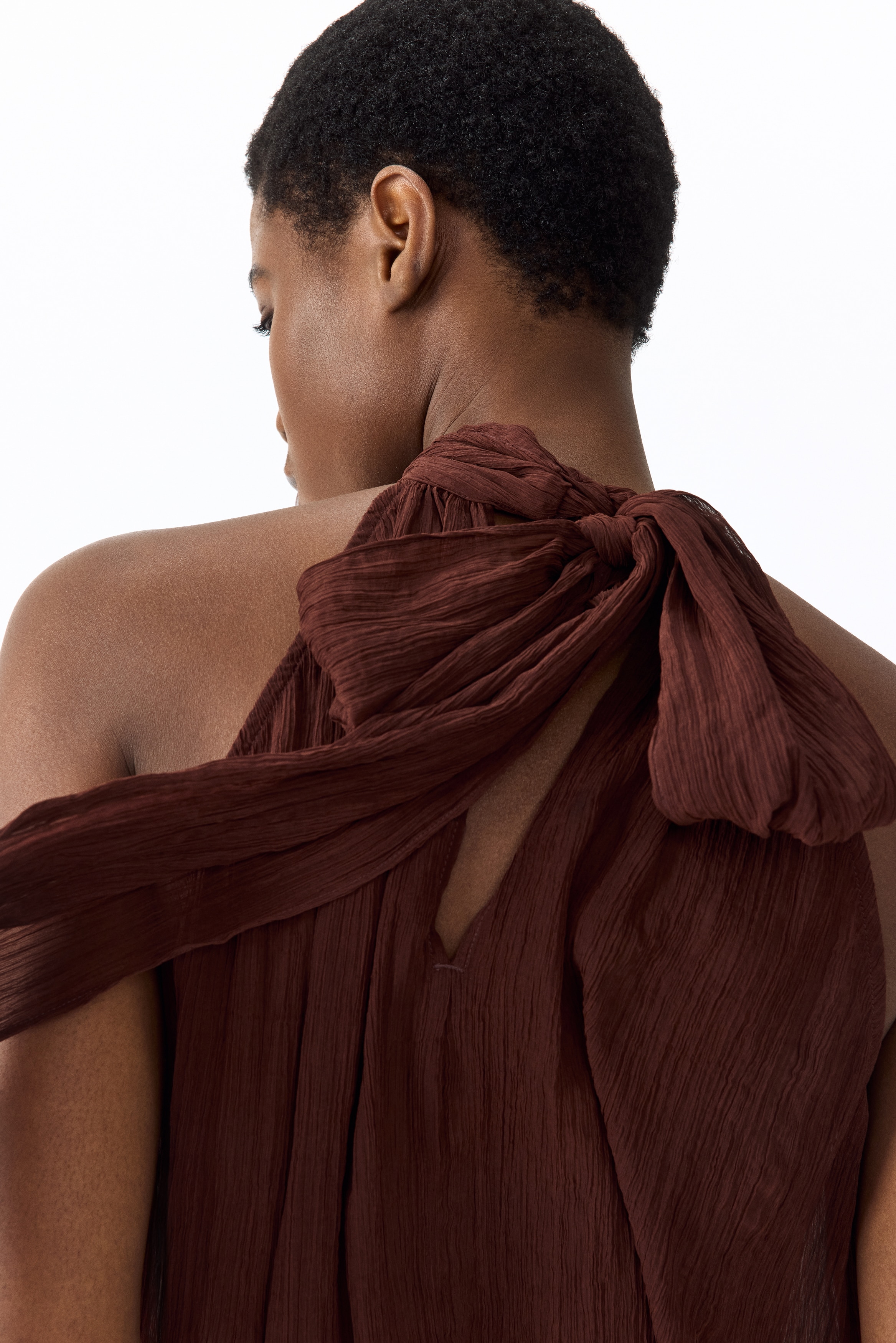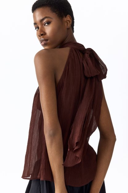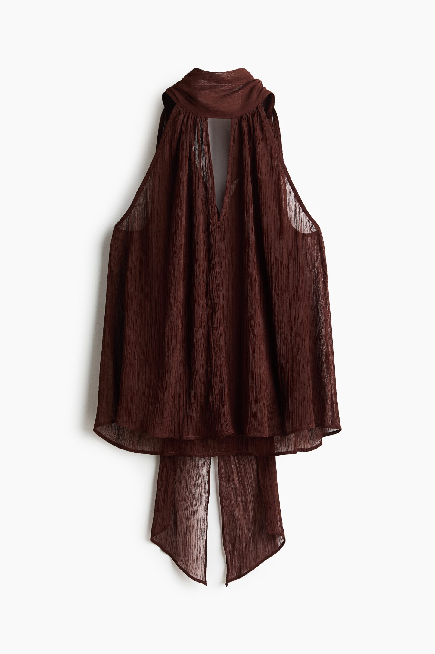 Loose-fit top in sheer, crinkled chiffon featuring a narrow cut at the top, a gathered scarf collar and V-shaped openings at the front and back. Unlined.