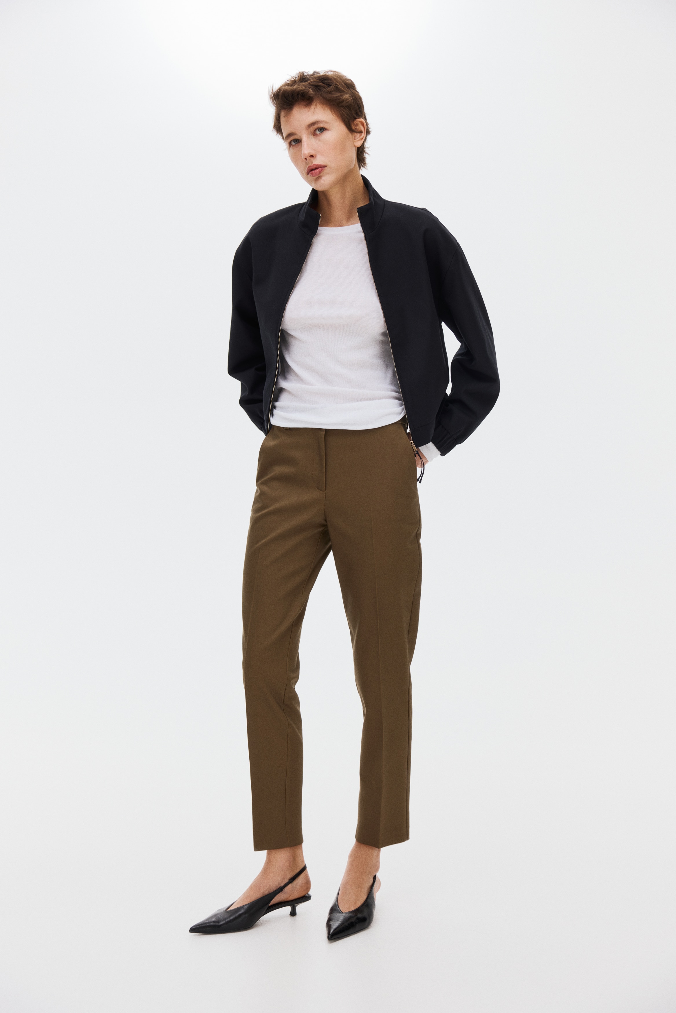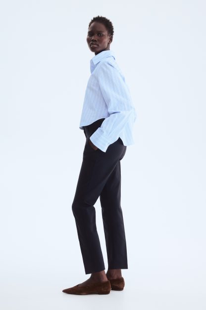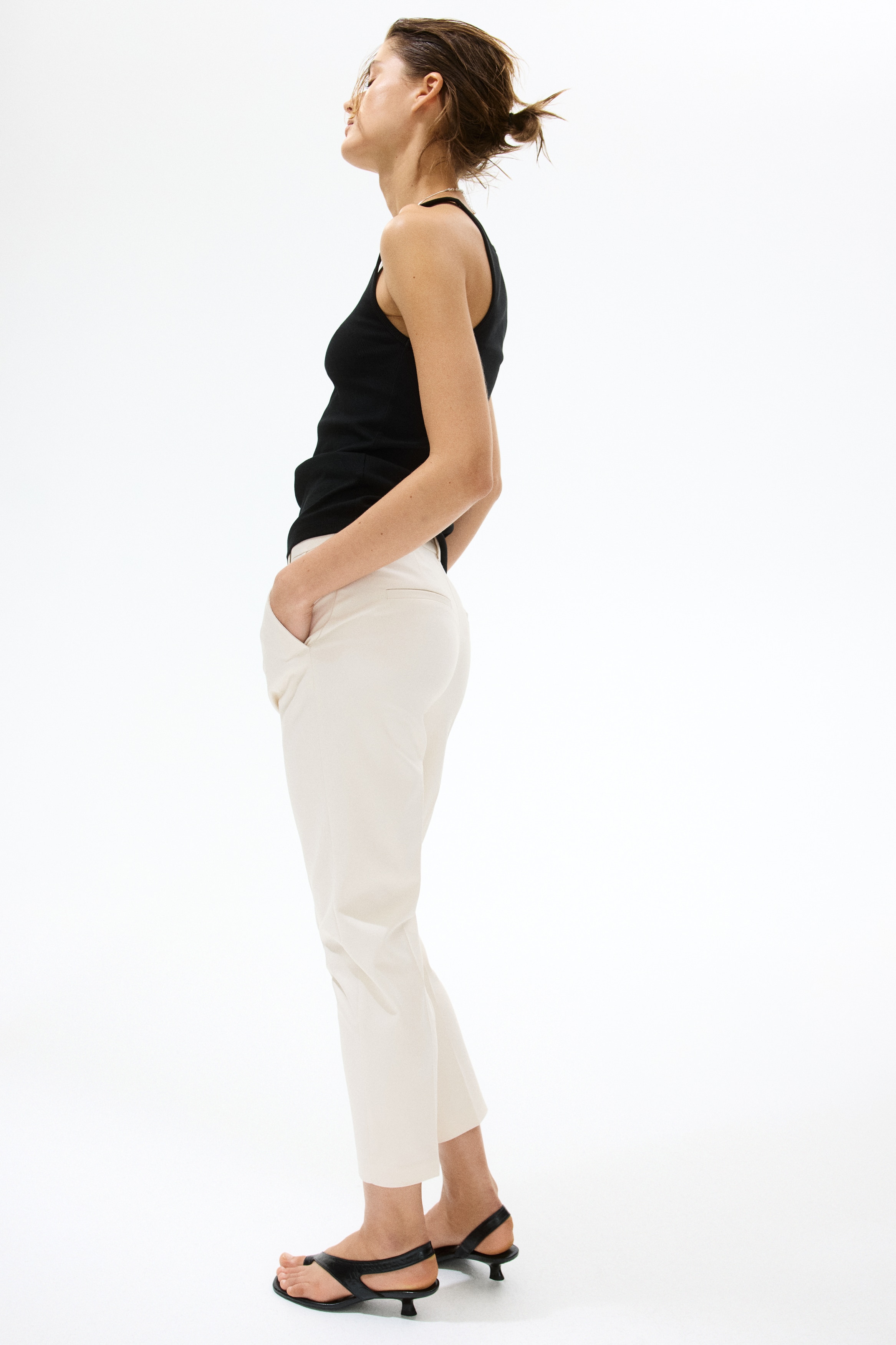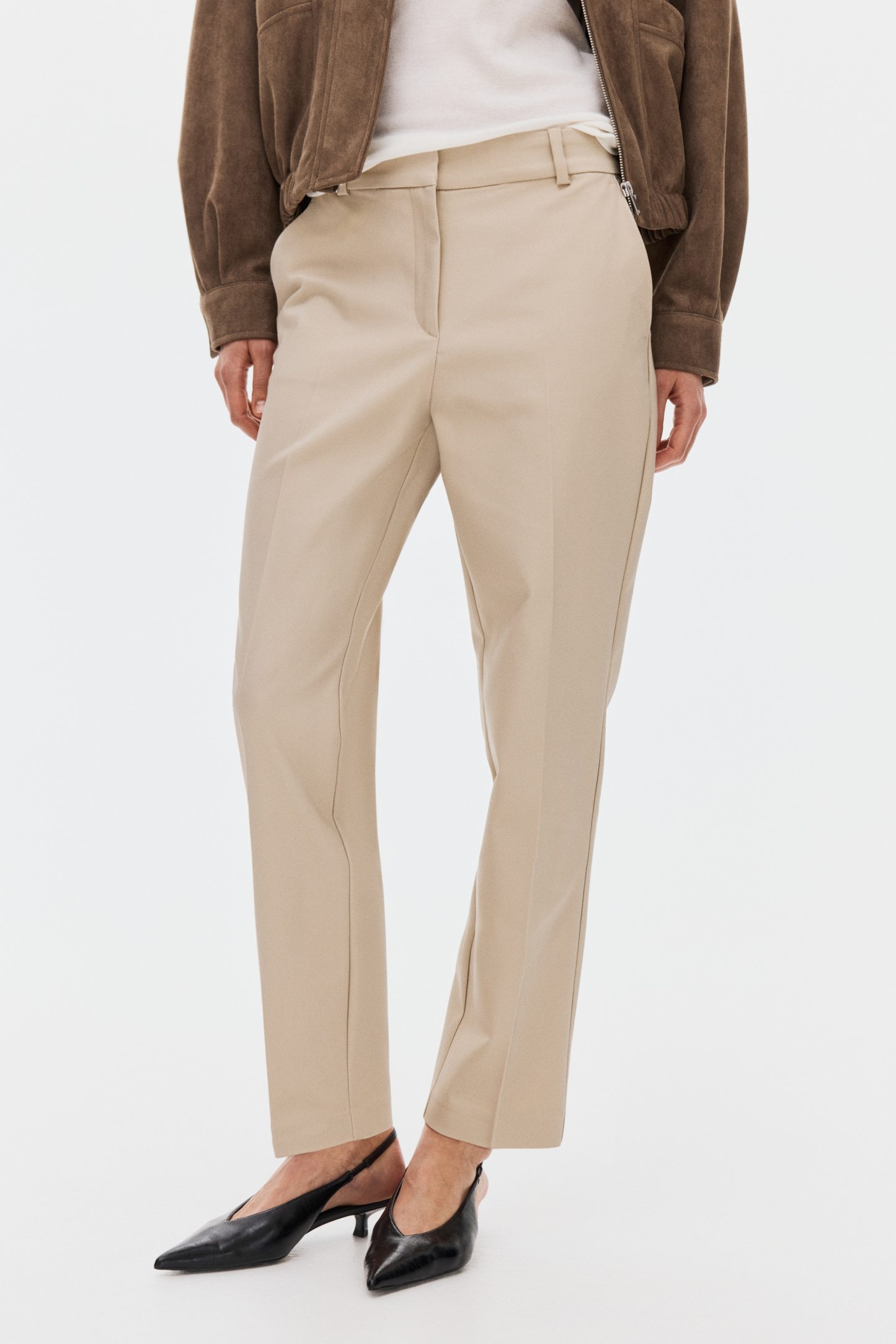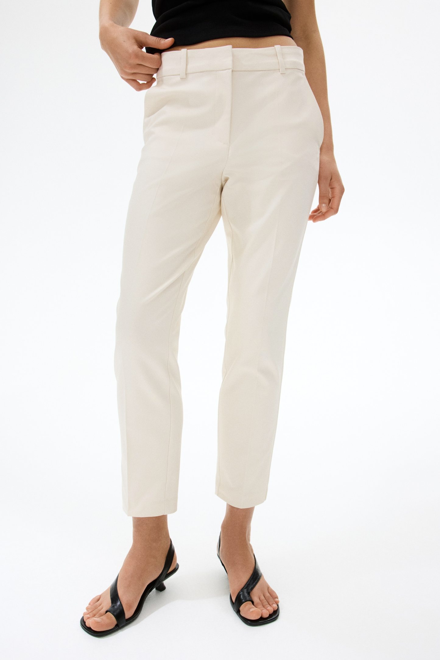 Ankle-length cigarette trousers in a stretch weave. Regular waist with concealed elastication, zip fly with a concealed hook-and-eye fastening, side pockets, fake back pockets and tapered legs.