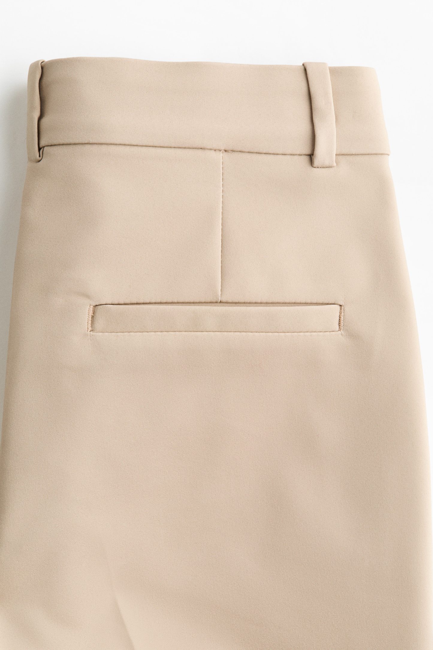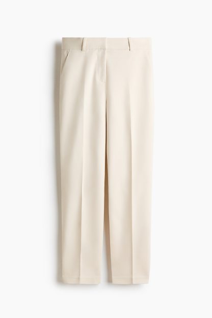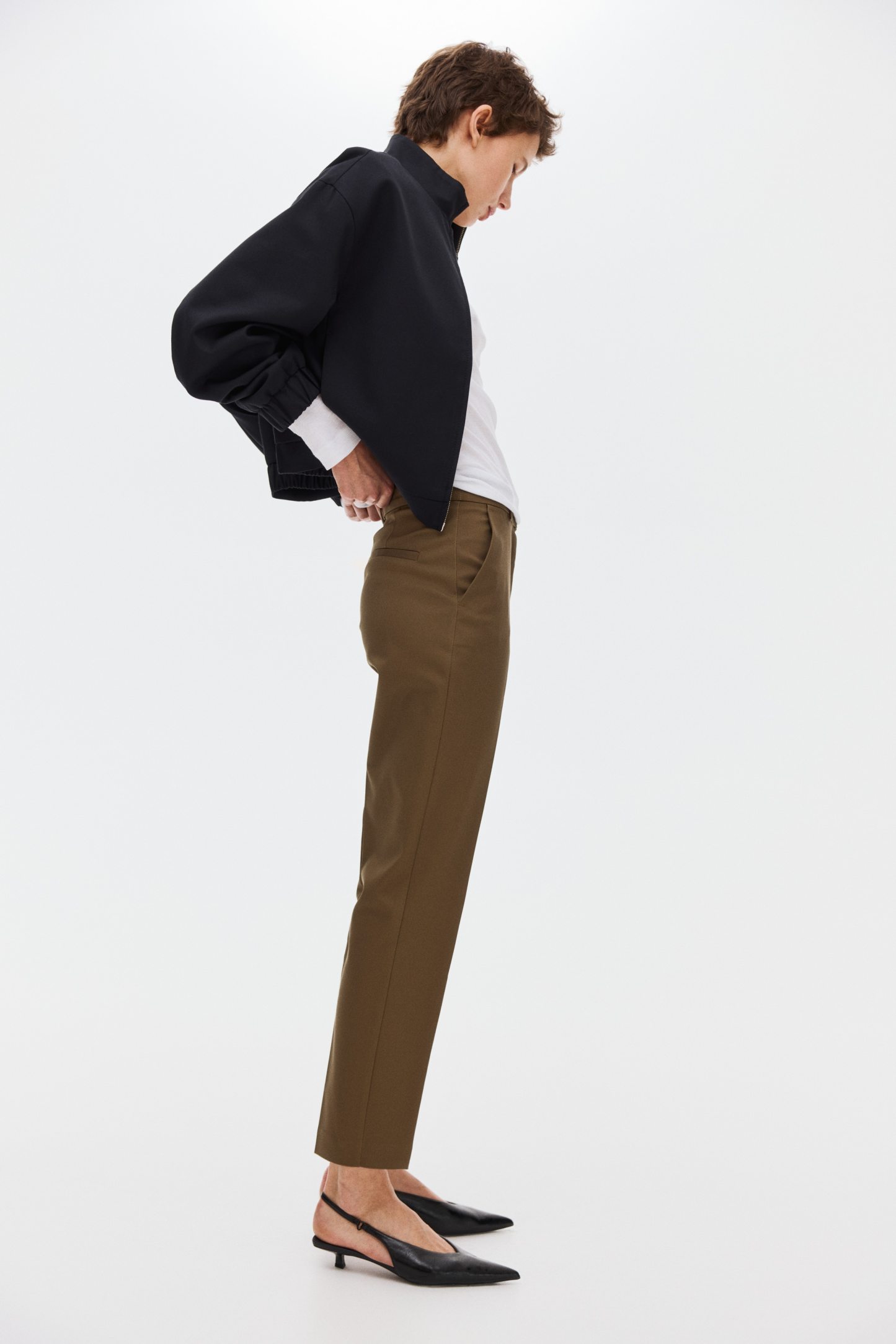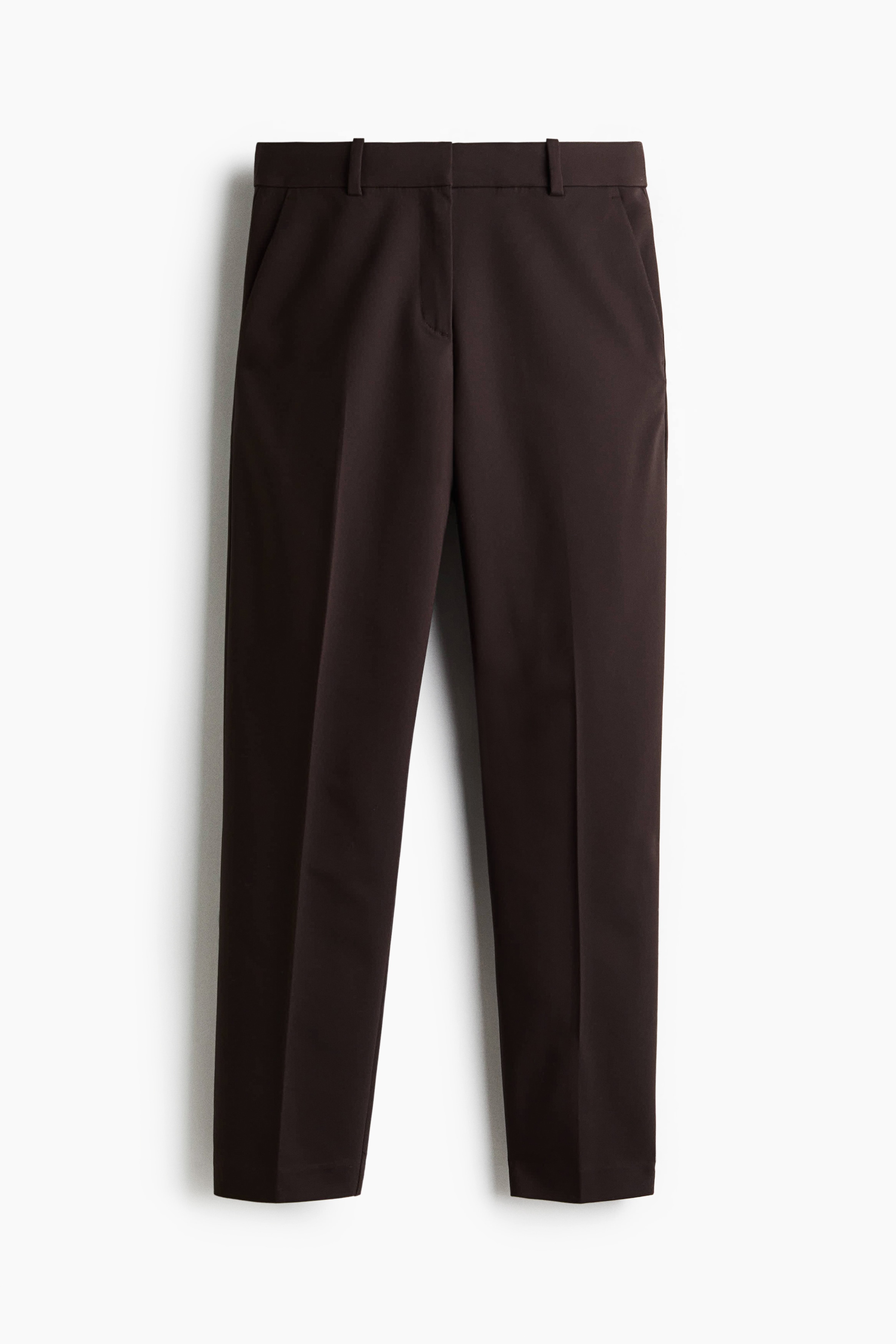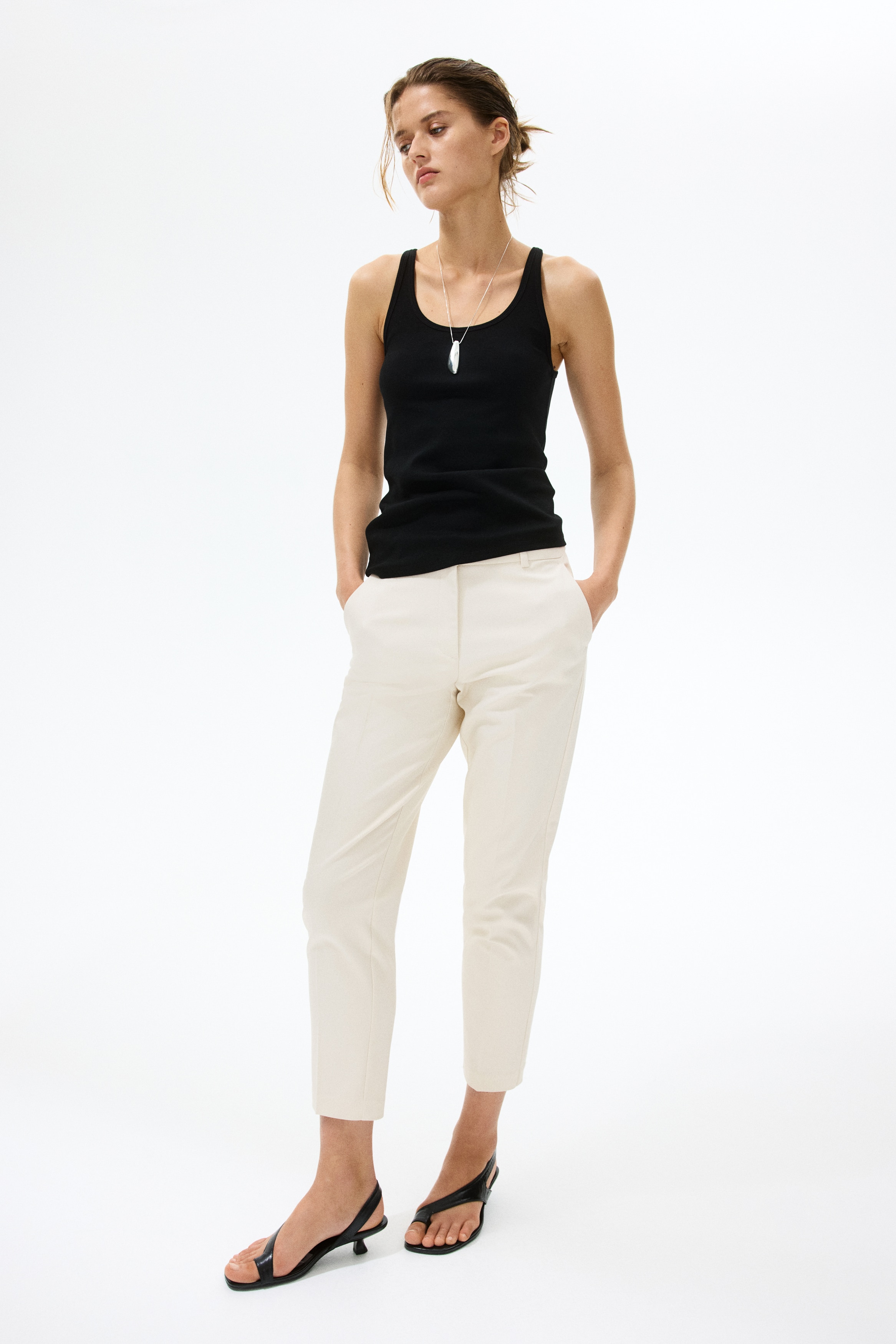 Ankle-length cigarette trousers in a stretch weave. Regular waist with concealed elastication, zip fly with a concealed hook-and-eye fastening, side pockets, fake back pockets and tapered legs.