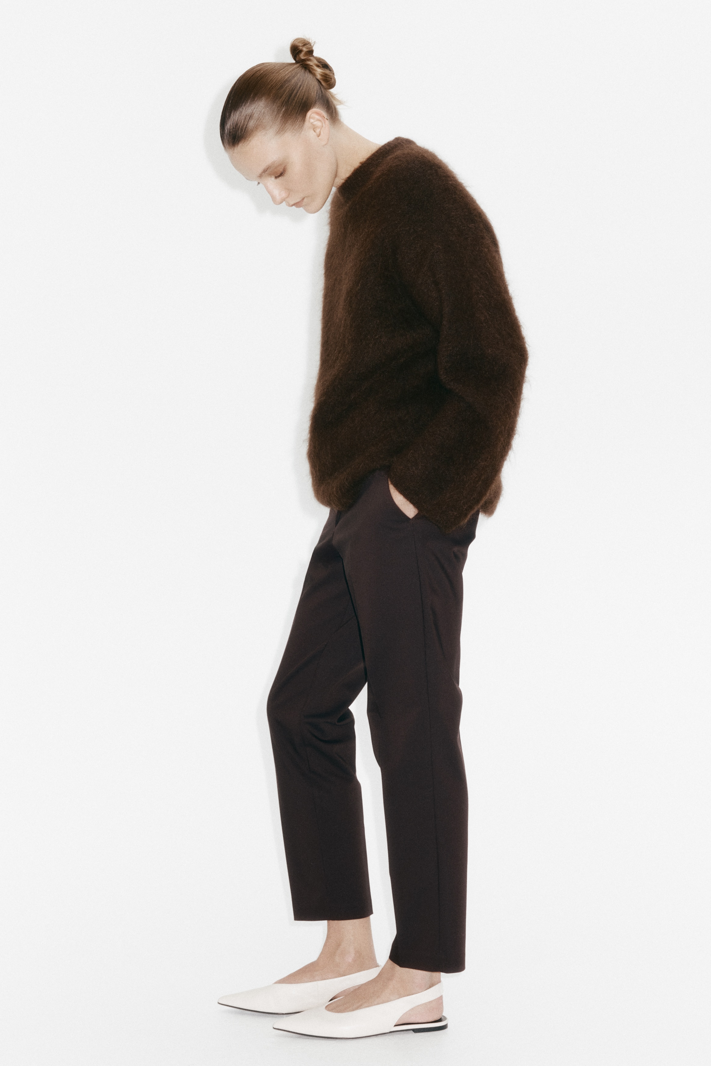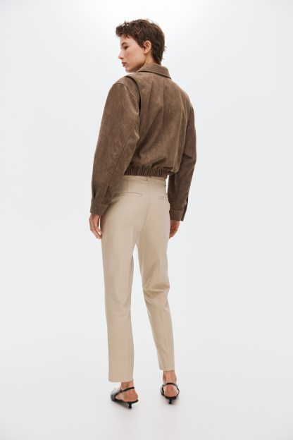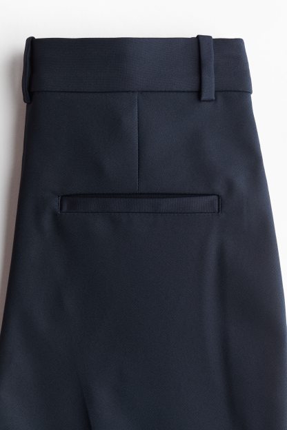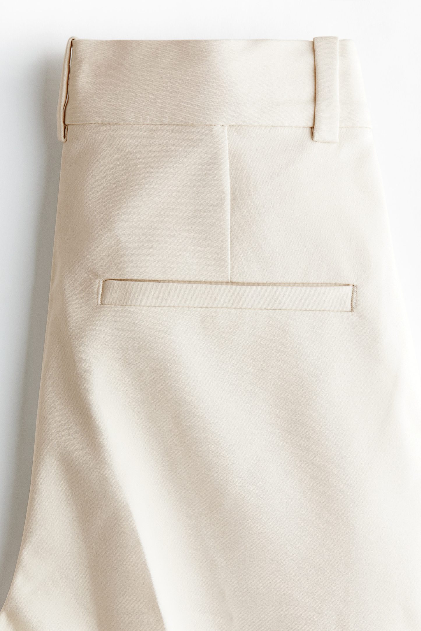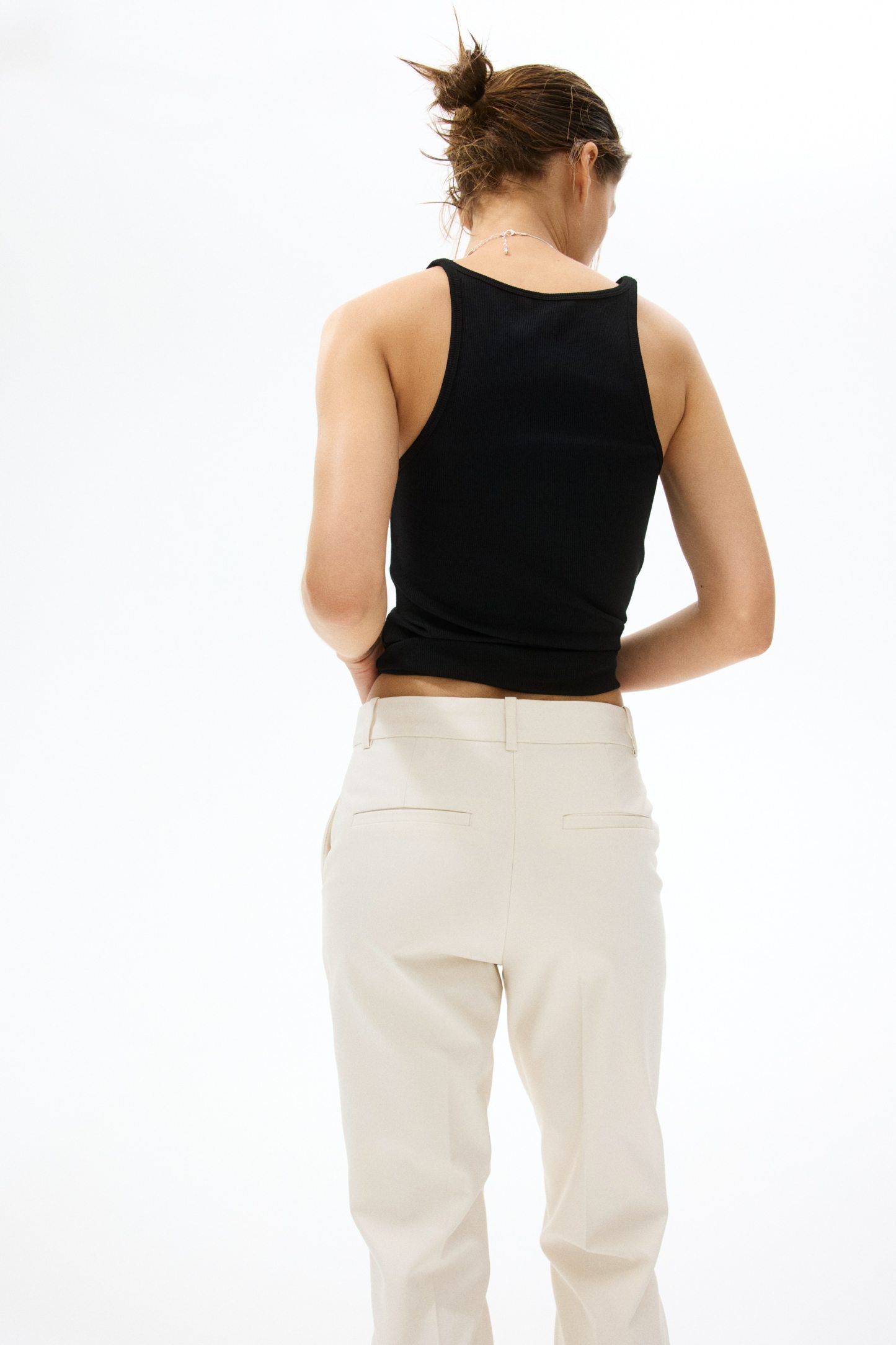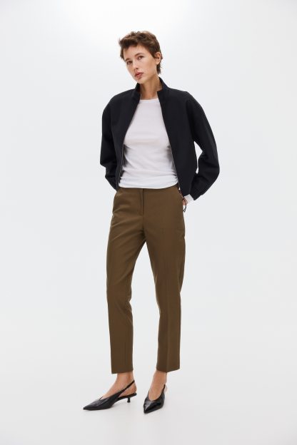 Ankle-length cigarette trousers in a stretch weave. Regular waist with concealed elastication, zip fly with a concealed hook-and-eye fastening, side pockets, fake back pockets and tapered legs.