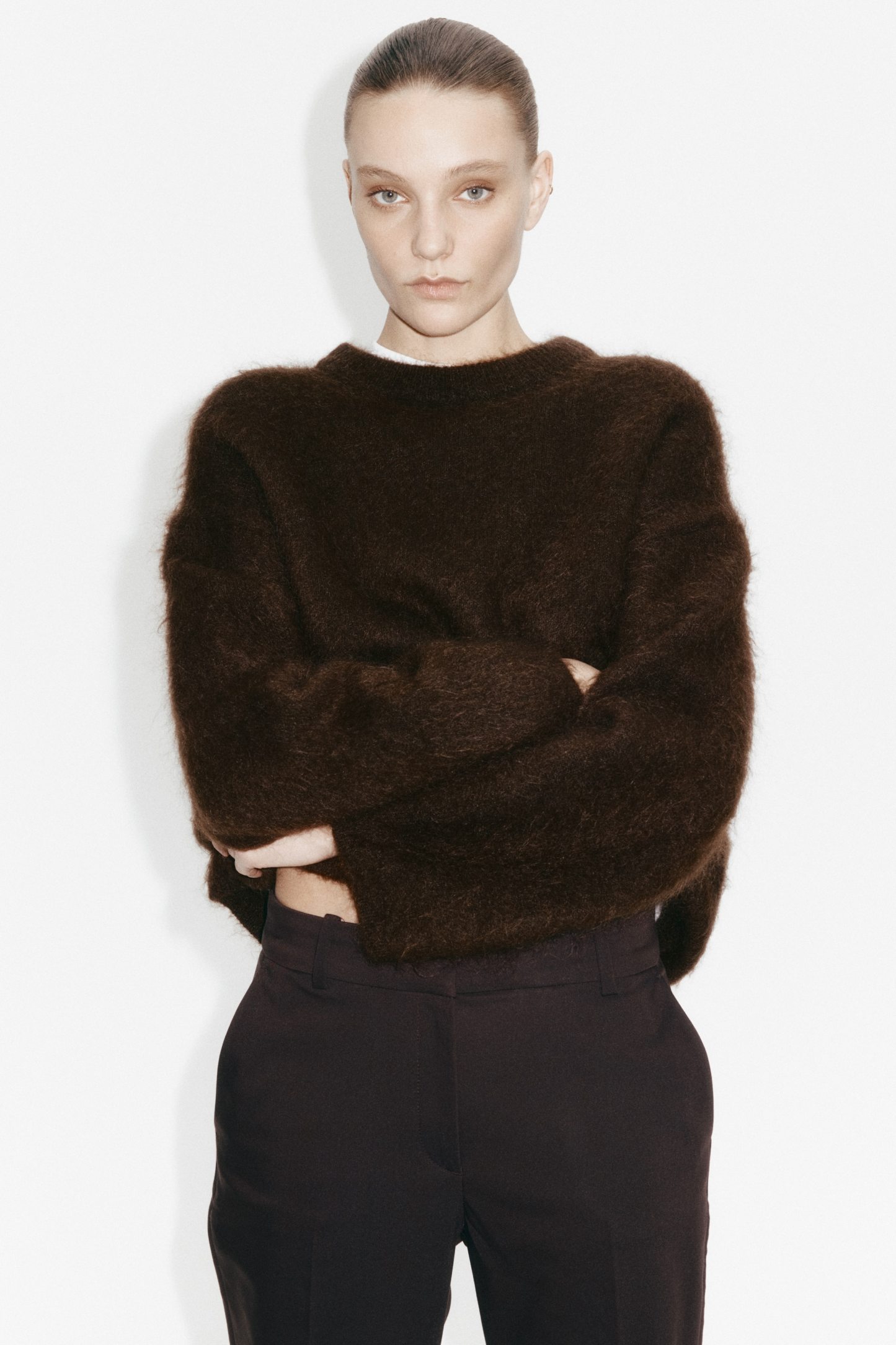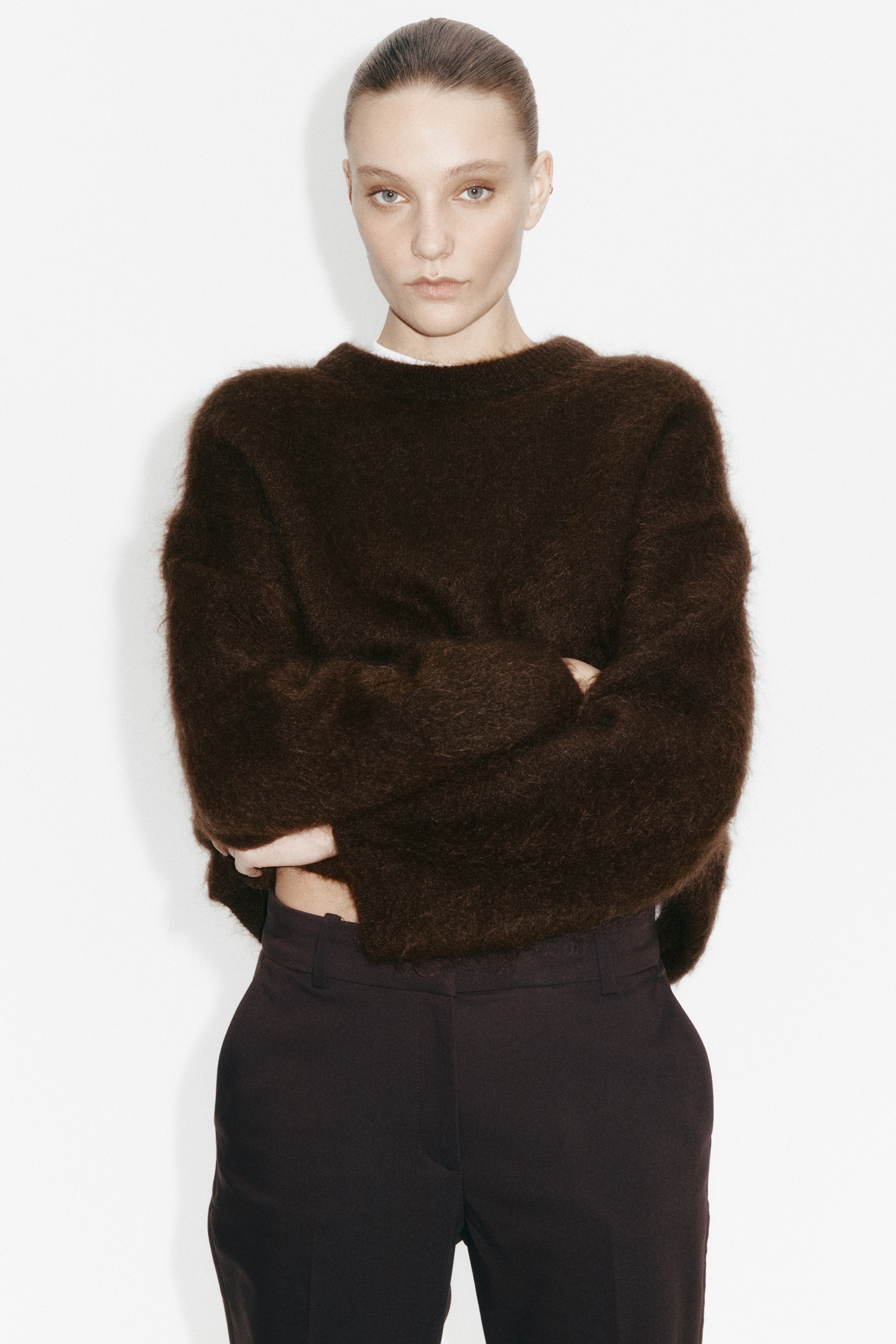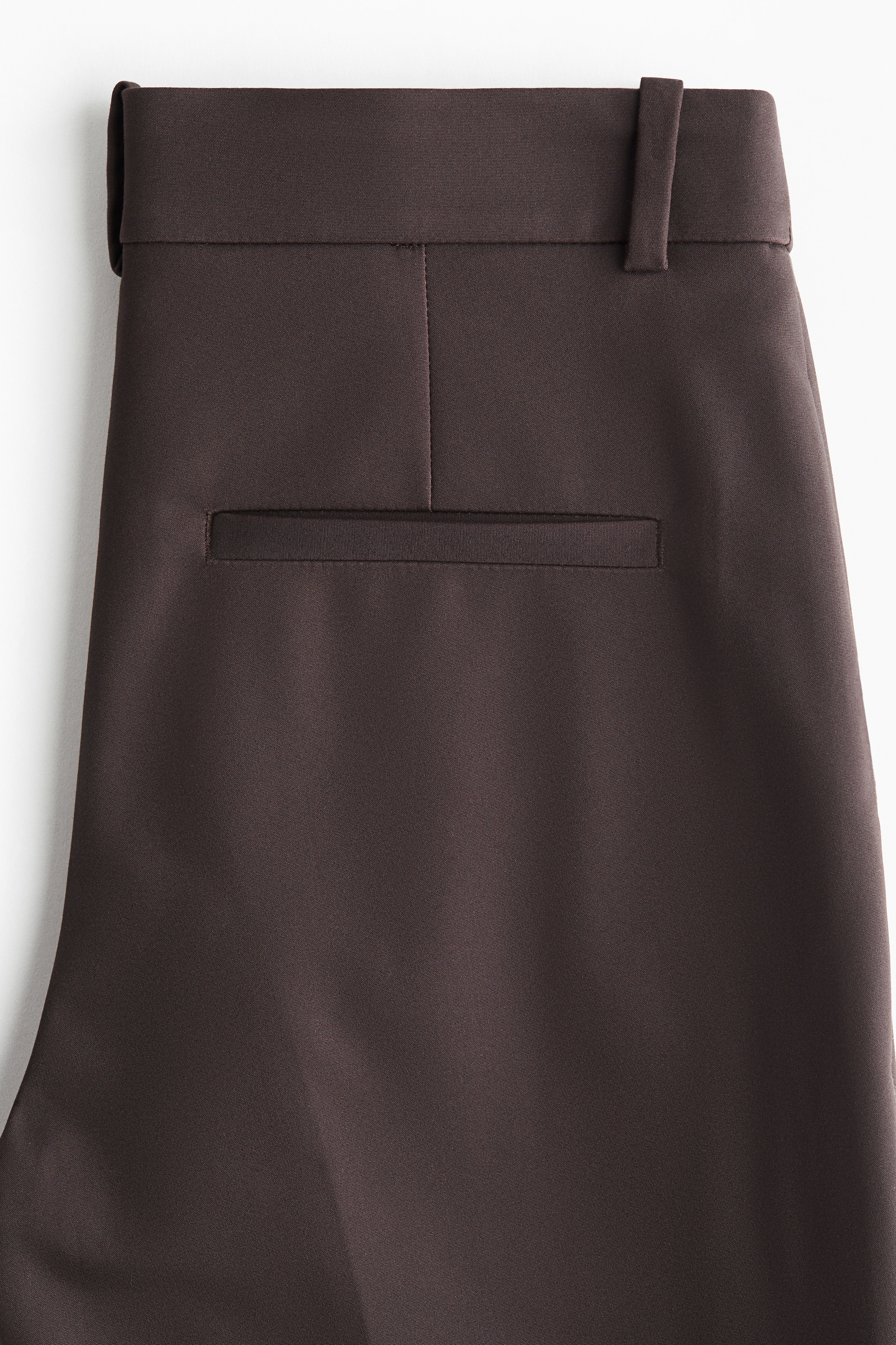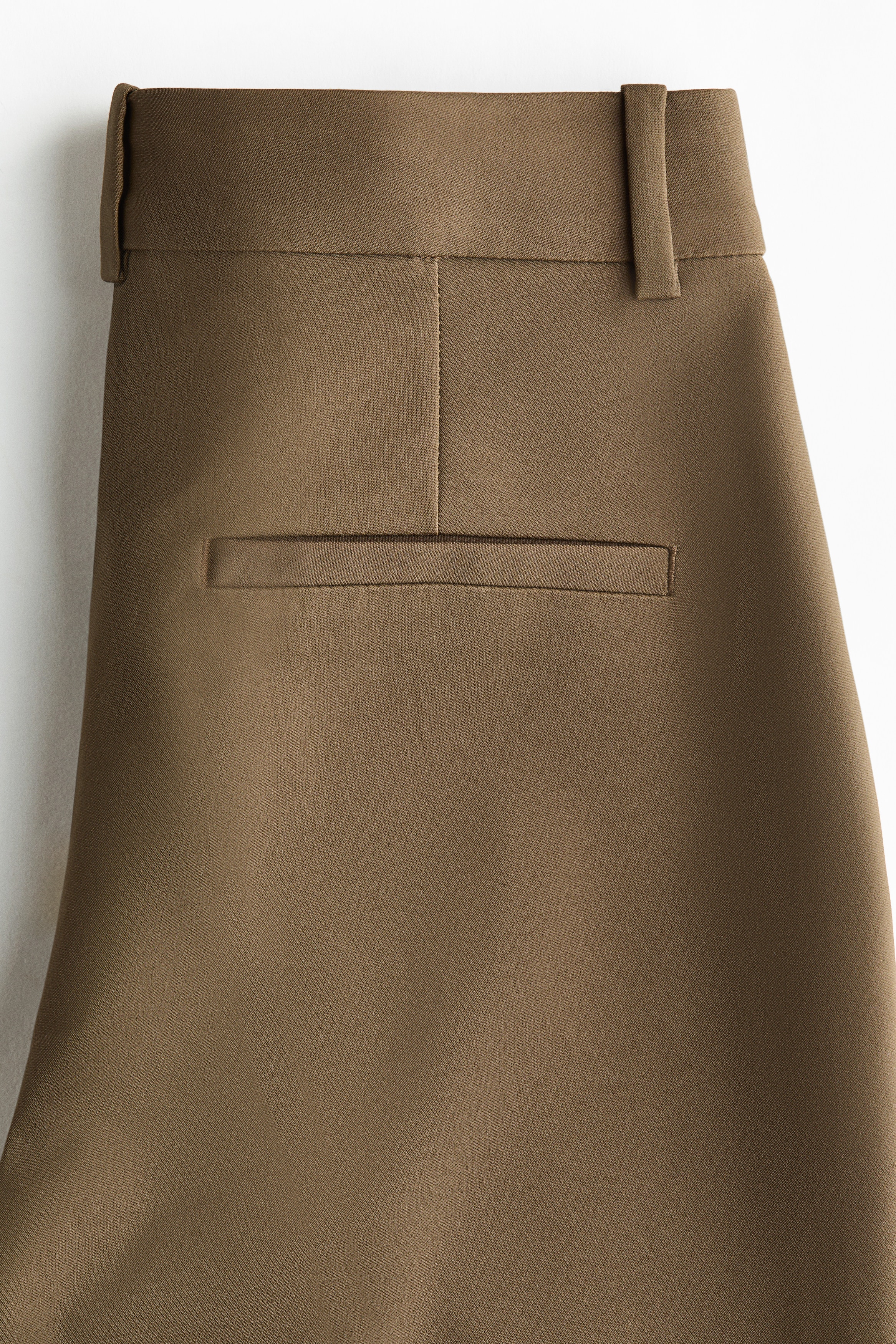Ankle-length cigarette trousers in a stretch weave. Regular waist with concealed elastication, zip fly with a concealed hook-and-eye fastening, side pockets, fake back pockets and tapered legs.