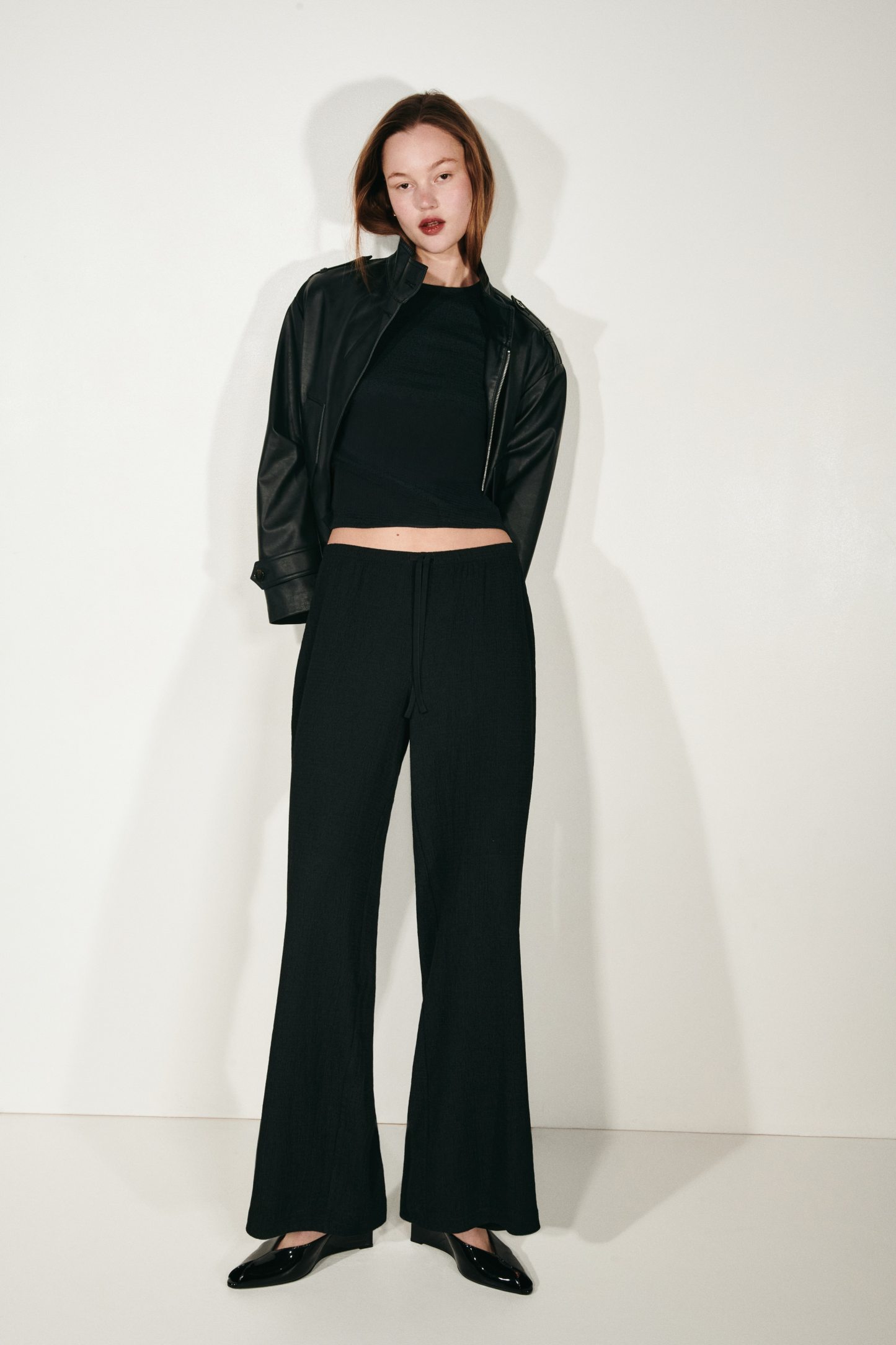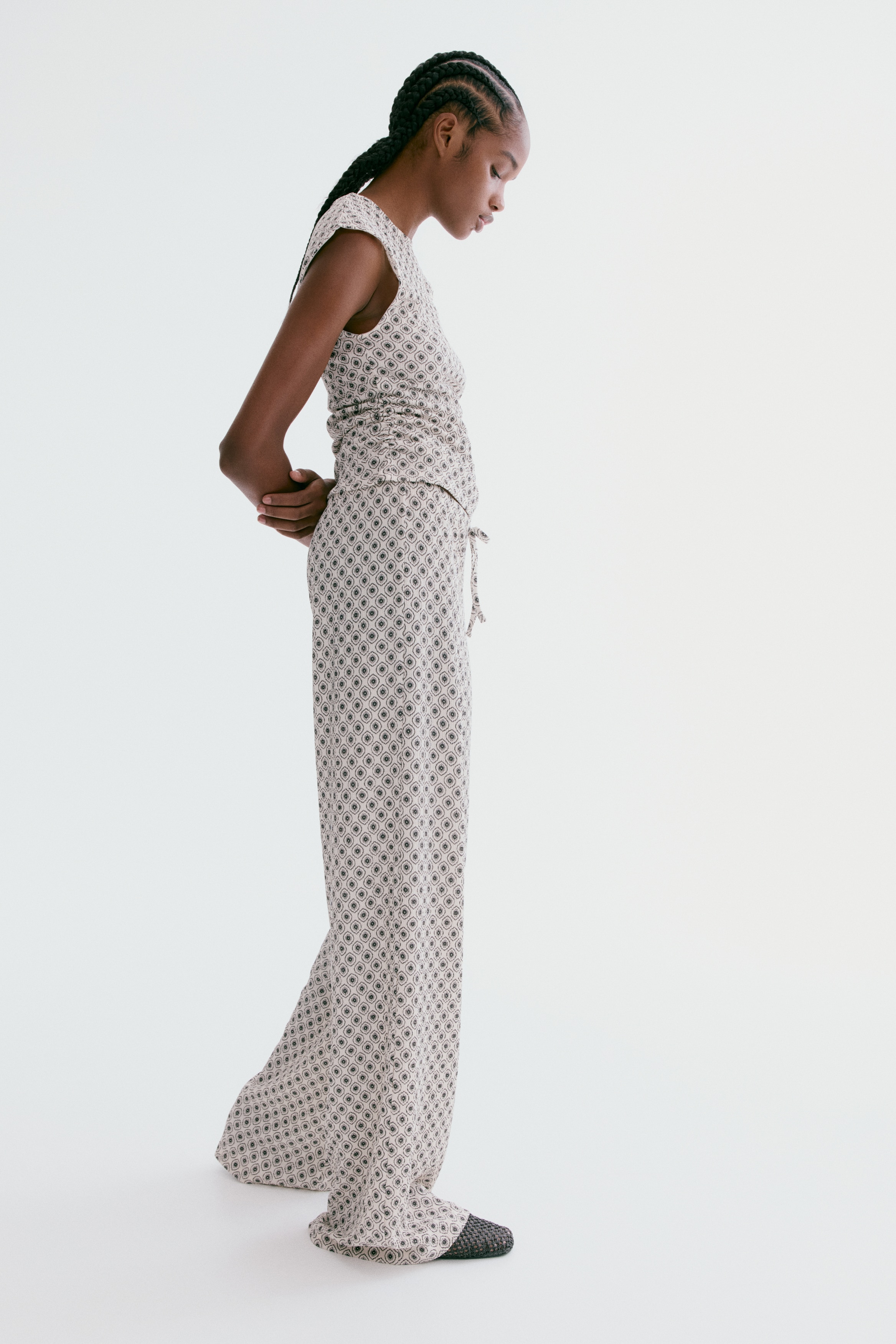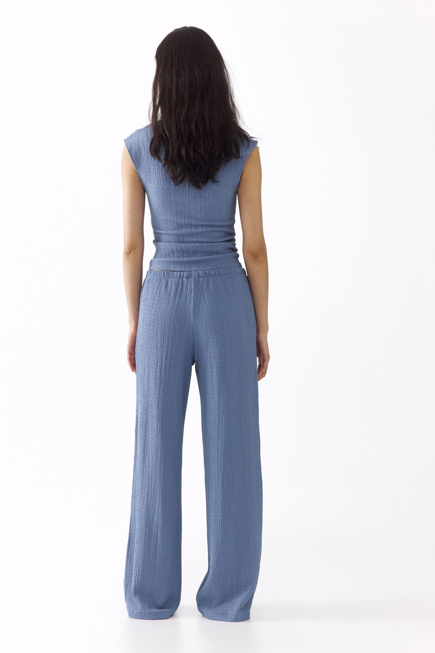 Trousers in textured jersey with an elasticated, drawstring waist and straight legs.