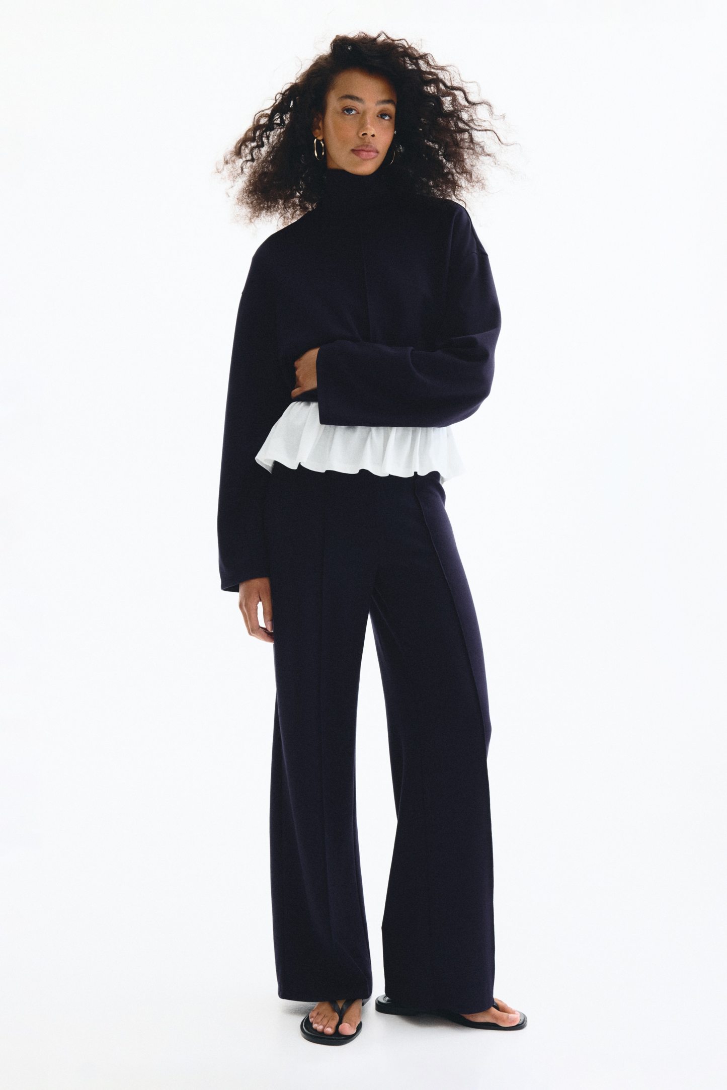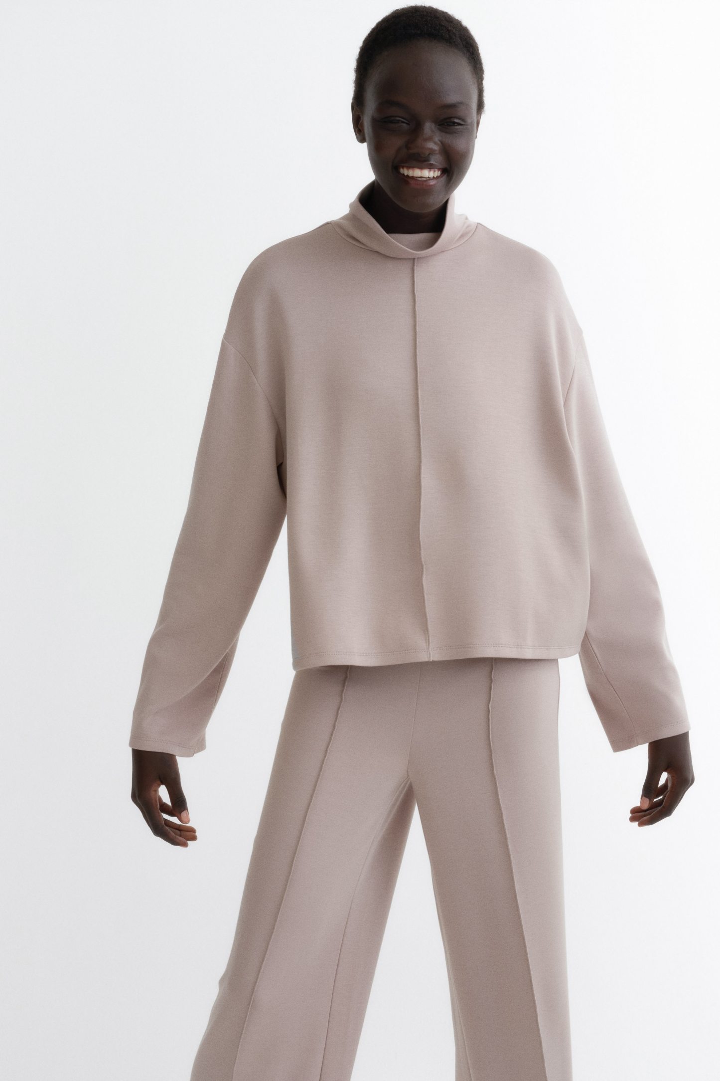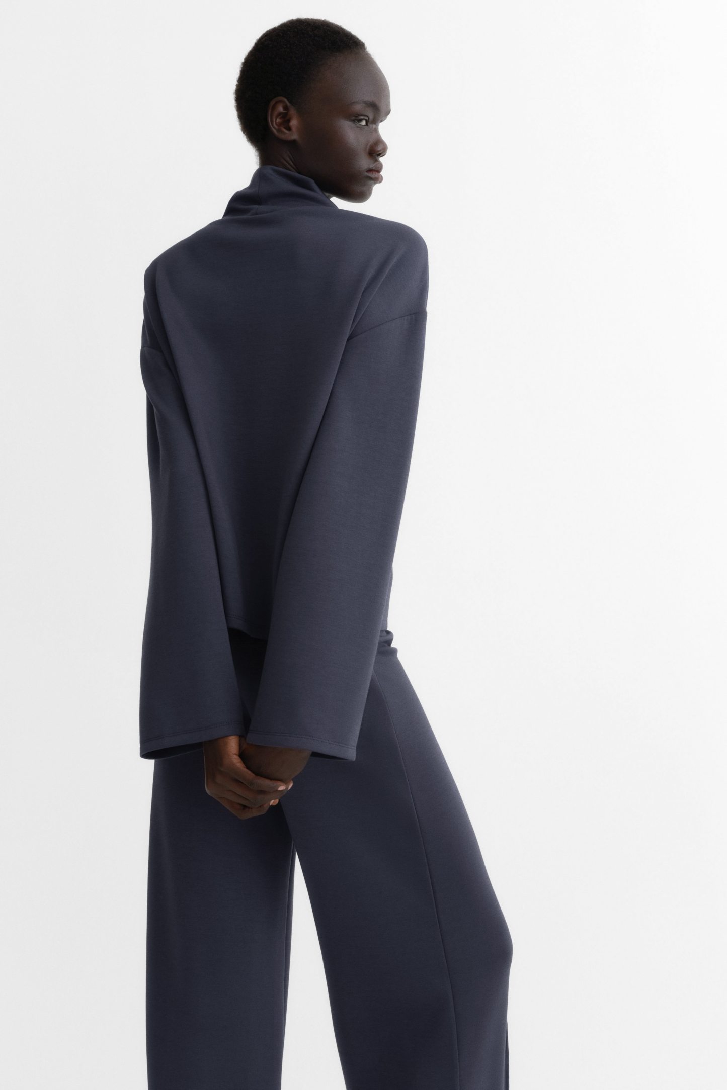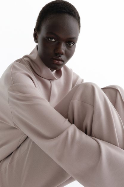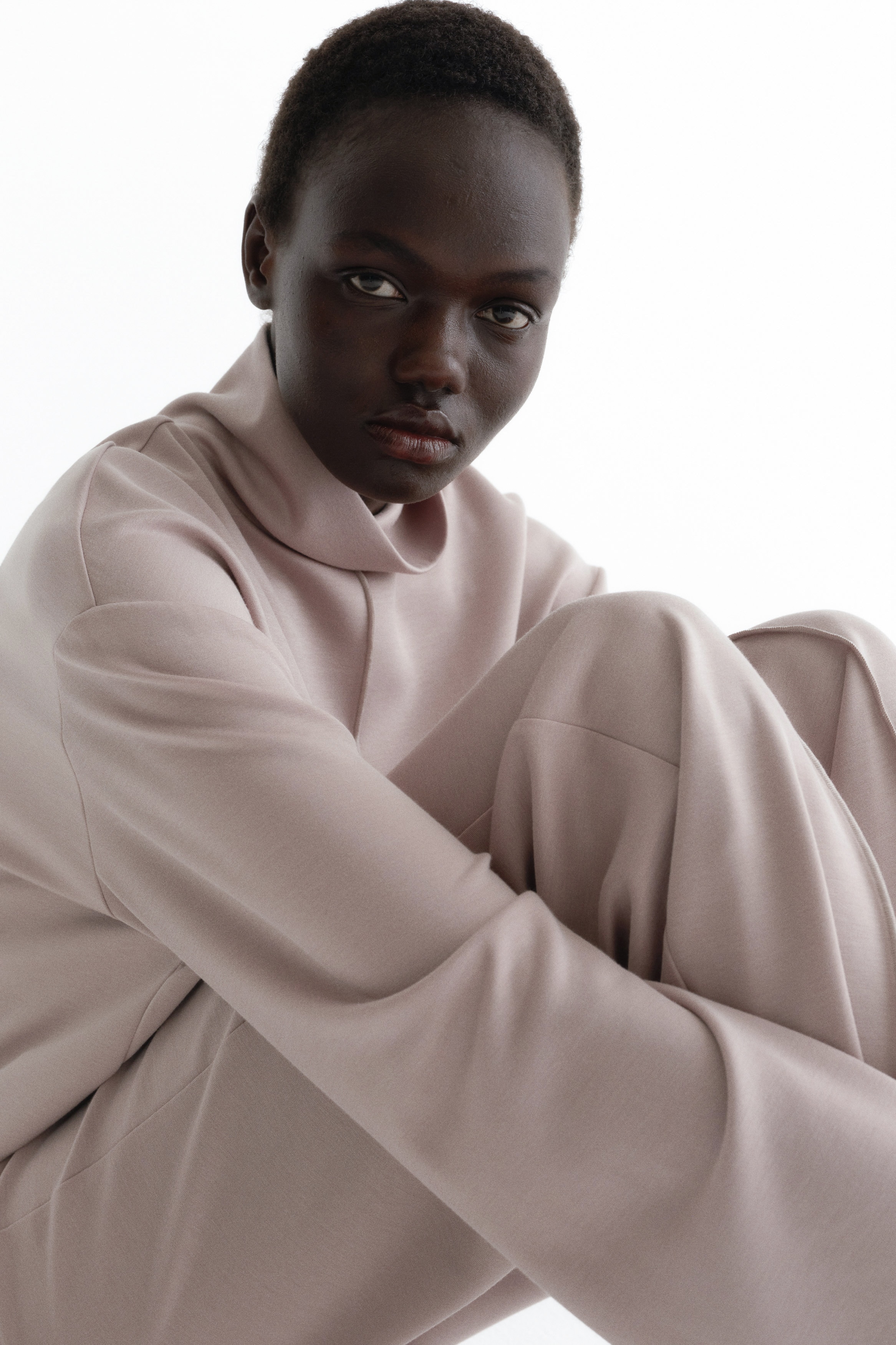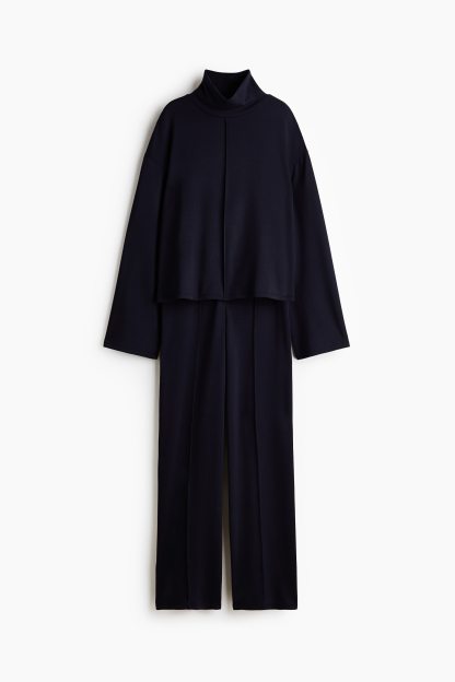 Set with a top and pair of trousers in heavy jersey. Top with a double-layered turtle neck, exposed seam down the front, dropped shoulders and long sleeves. Trousers with an elasticated waist and straight legs with sewn-in creases down the front.