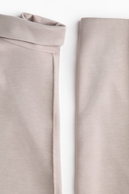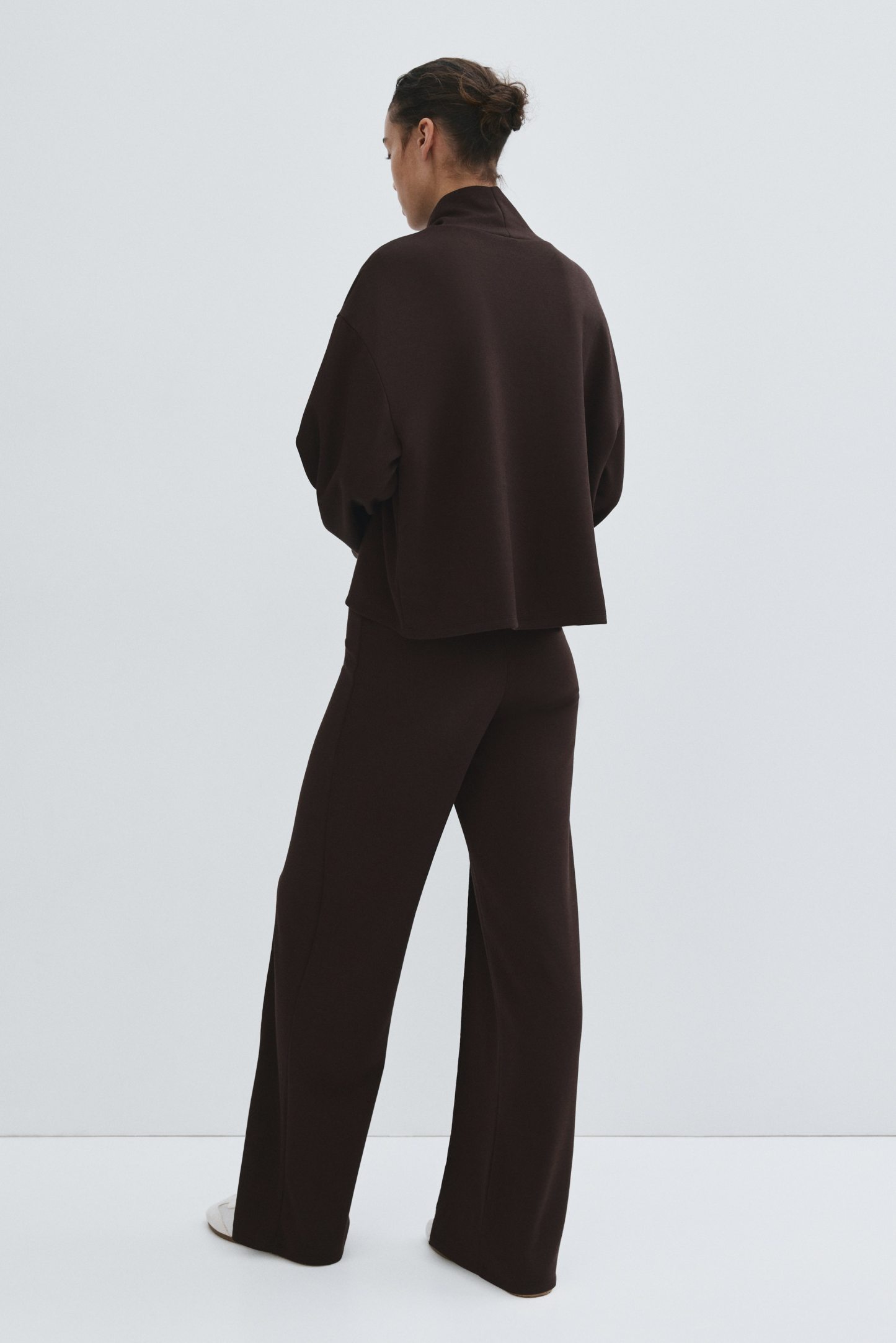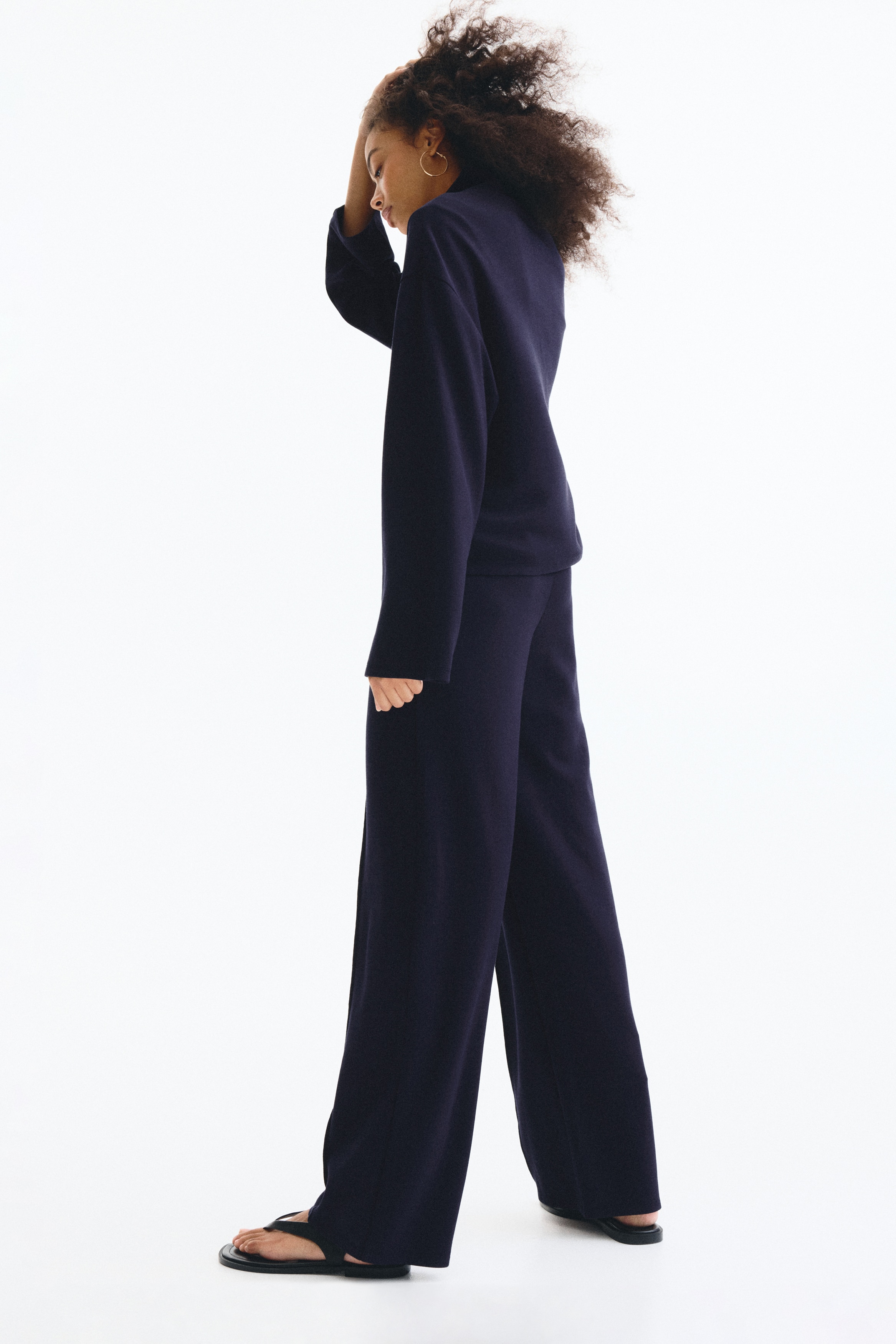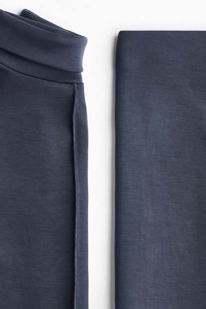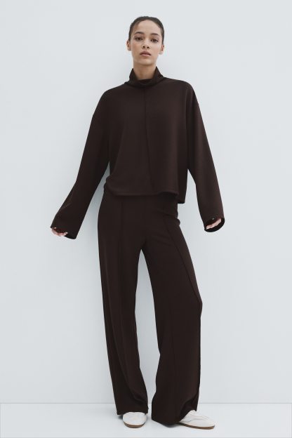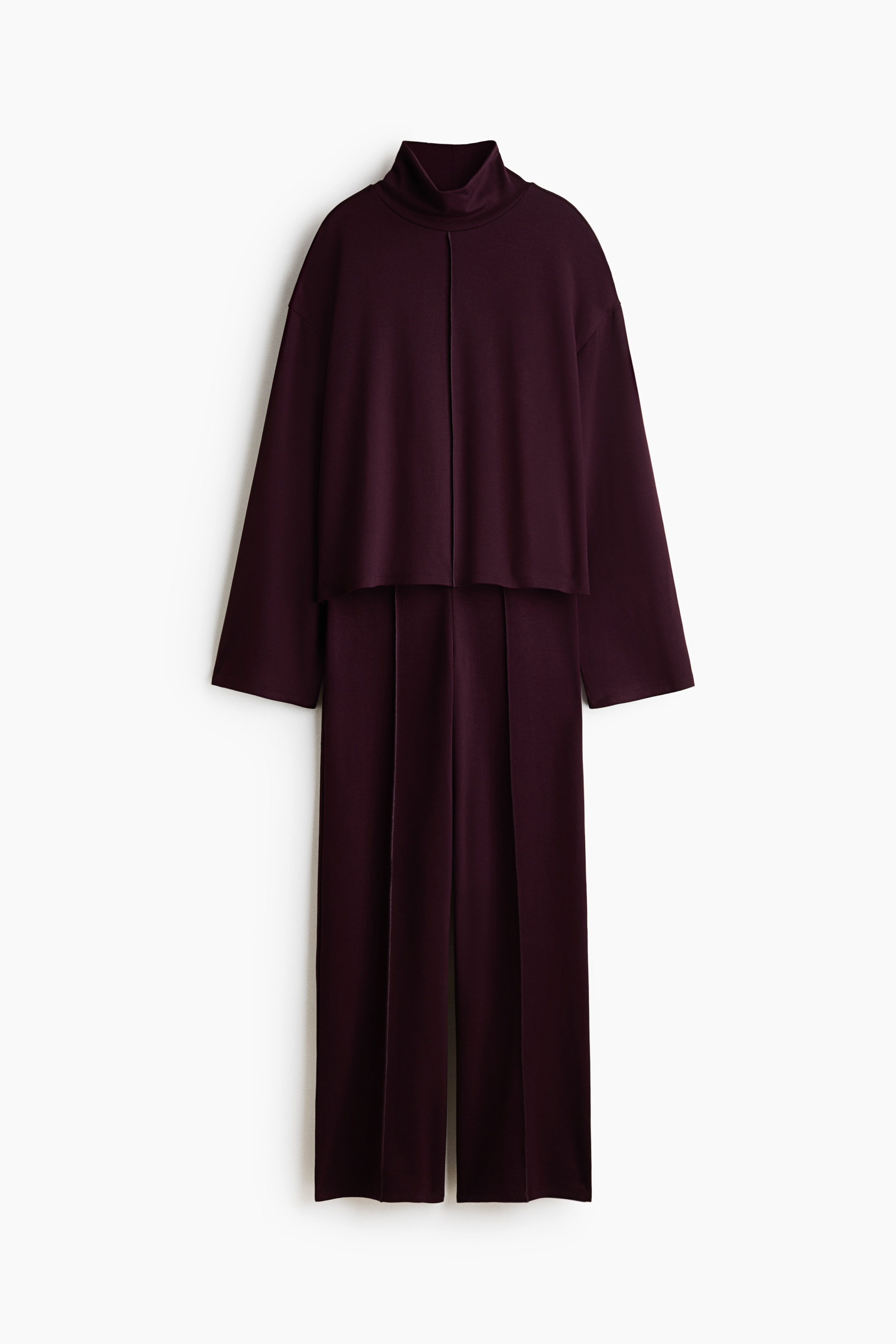 Set with a top and pair of trousers in heavy jersey. Top with a double-layered turtle neck, exposed seam down the front, dropped shoulders and long sleeves. Trousers with an elasticated waist and straight legs with sewn-in creases down the front.