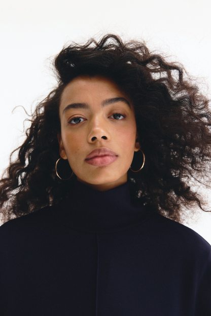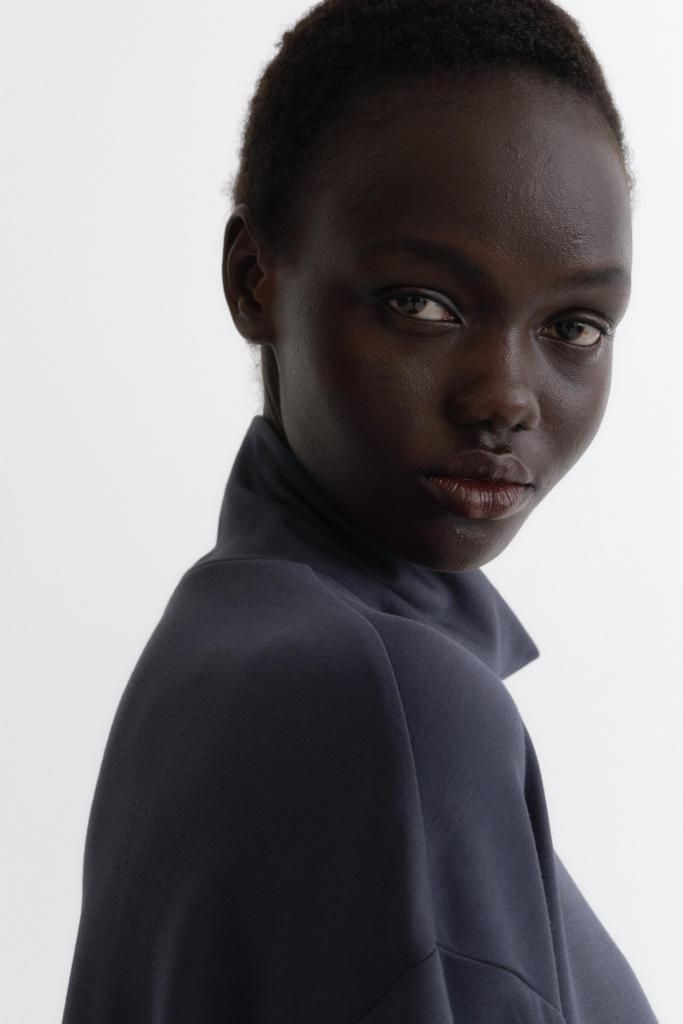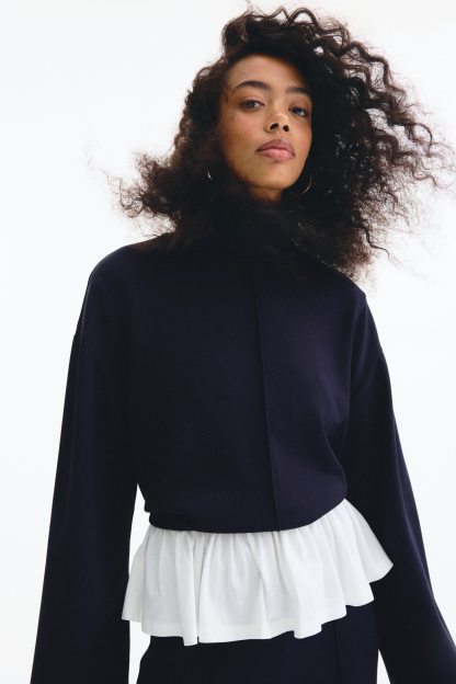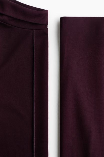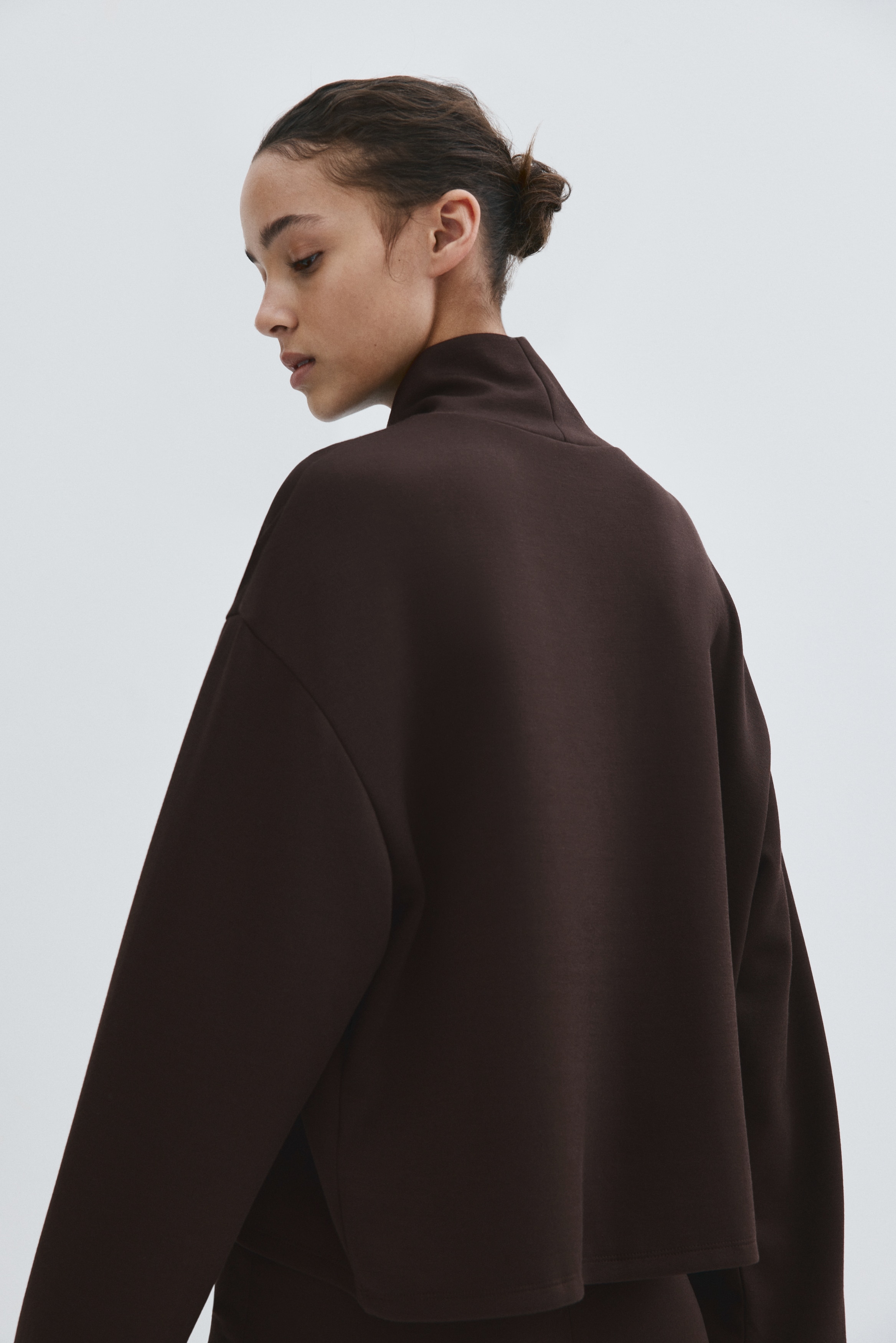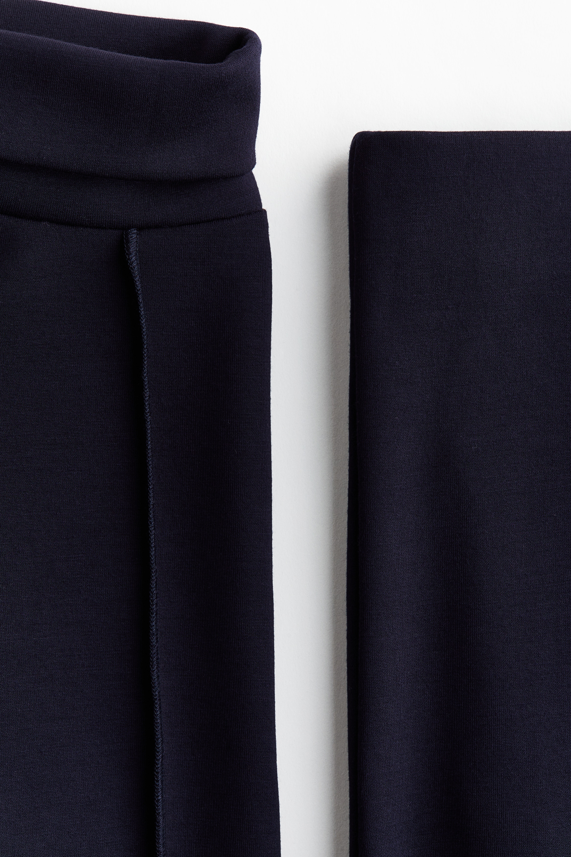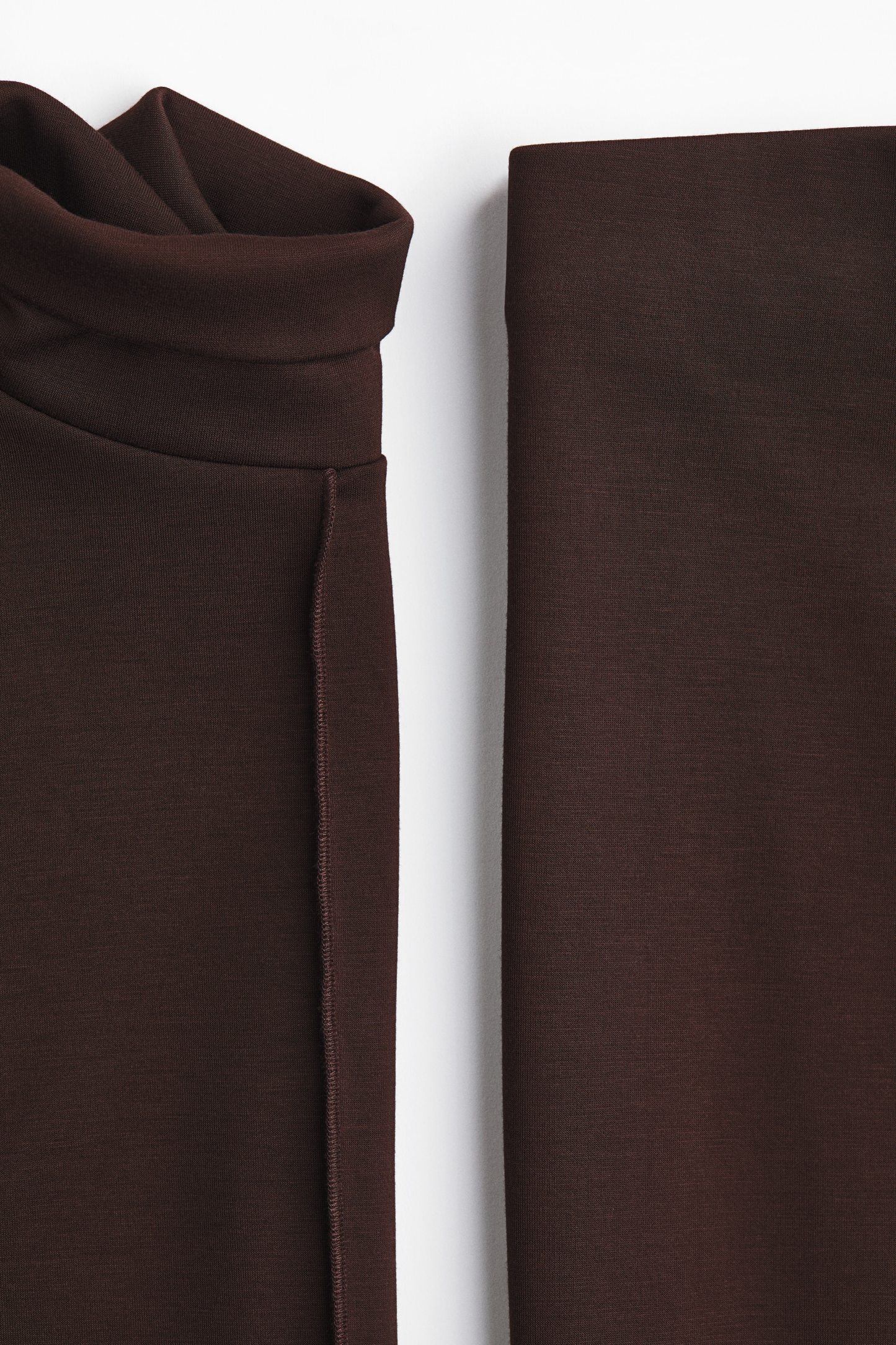 Set with a top and pair of trousers in heavy jersey. Top with a double-layered turtle neck, exposed seam down the front, dropped shoulders and long sleeves. Trousers with an elasticated waist and straight legs with sewn-in creases down the front.